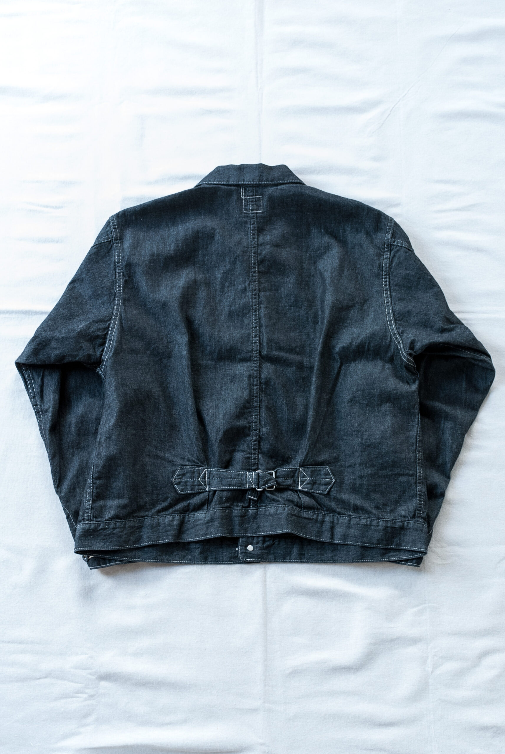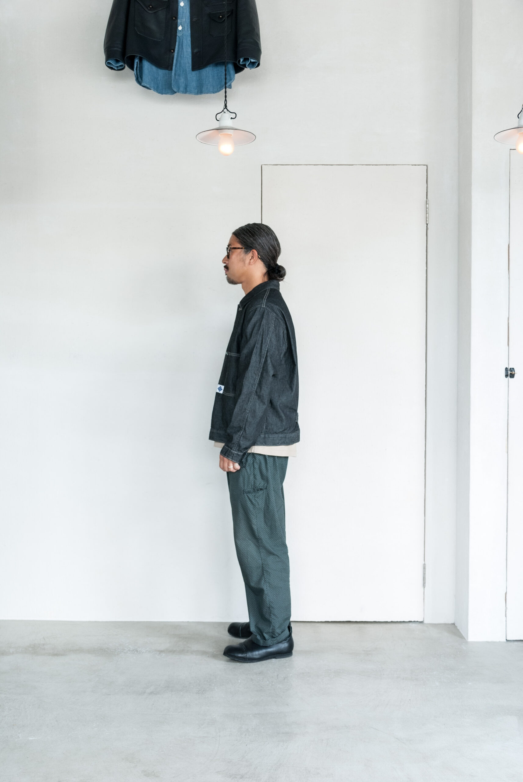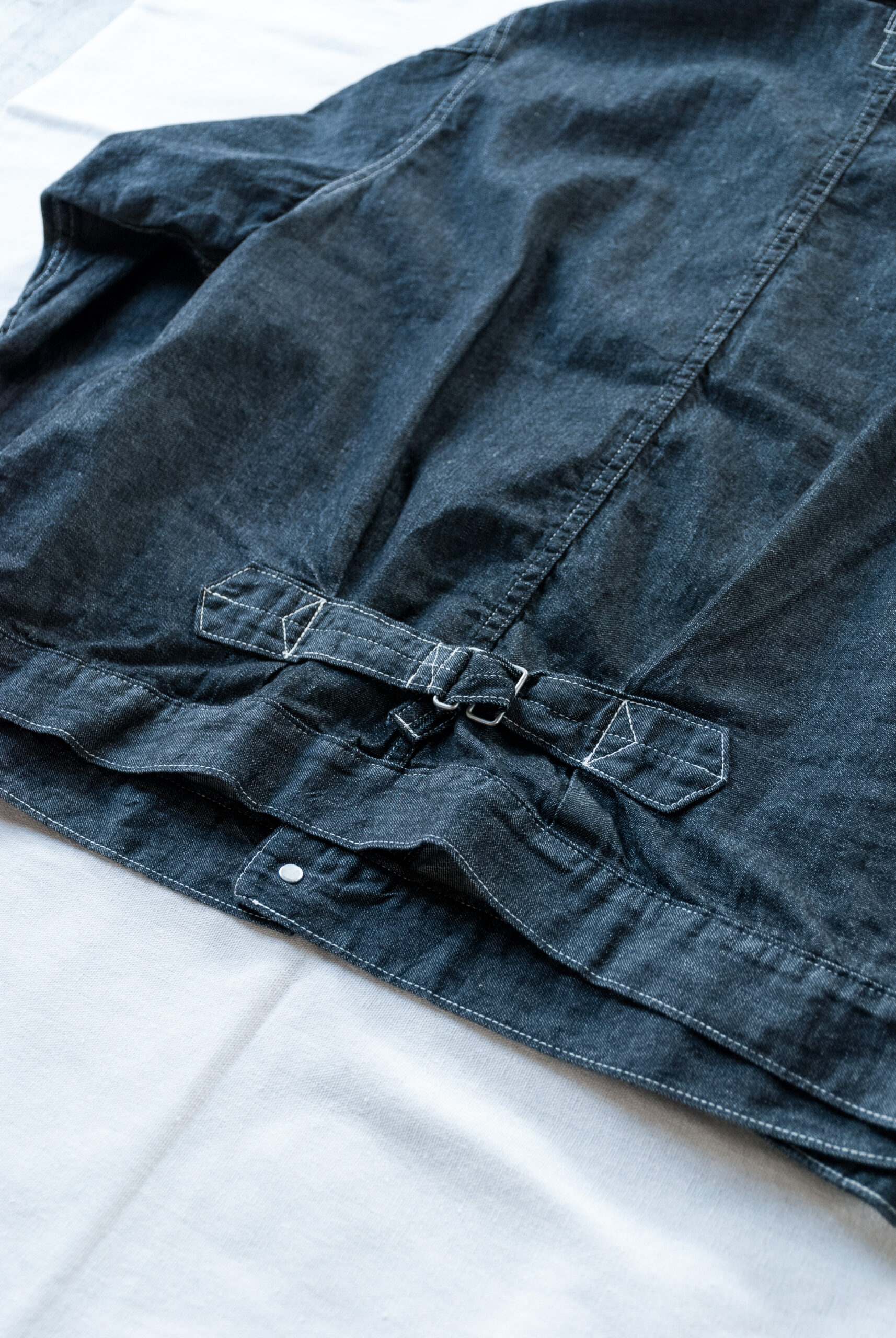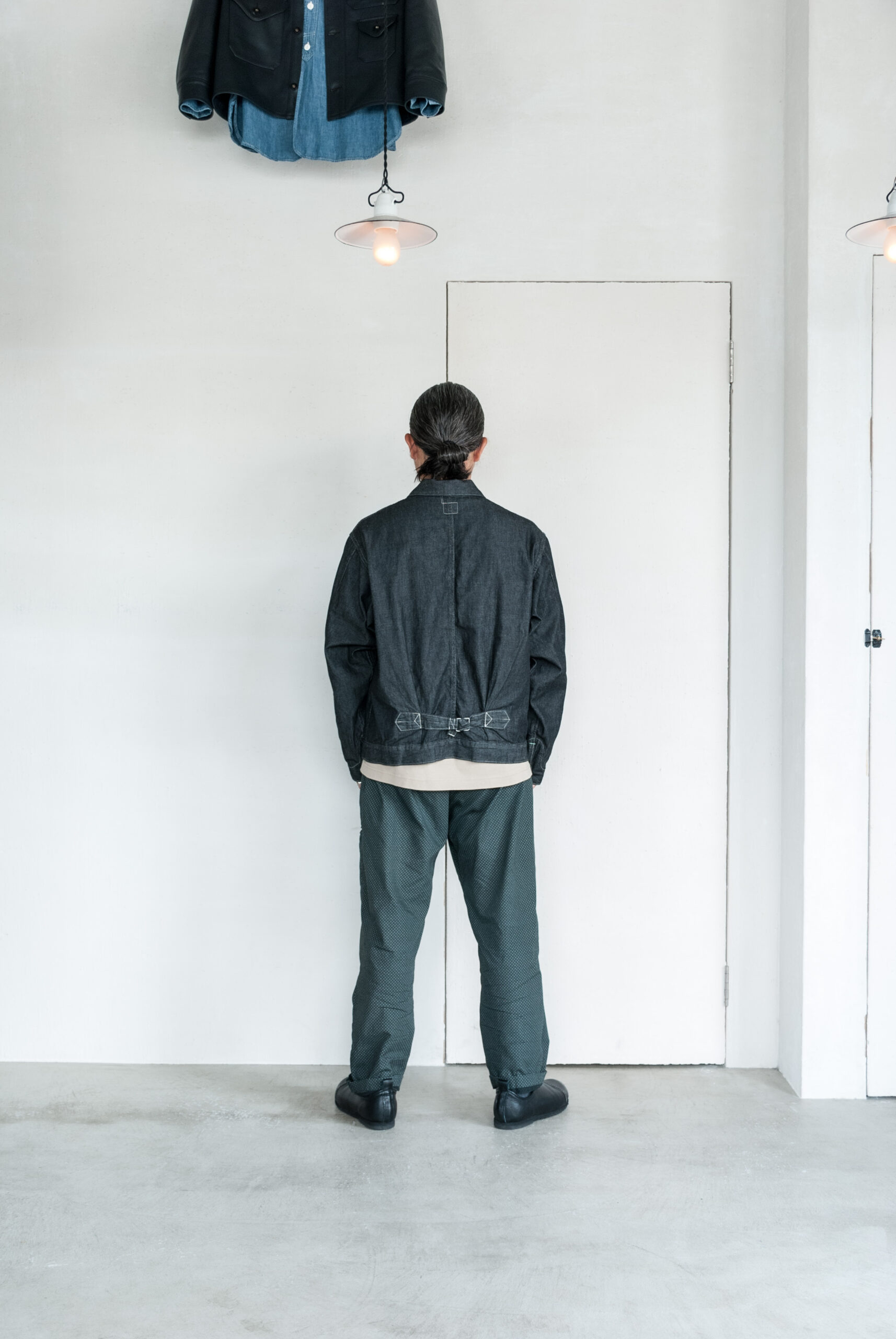とても印象的な斜め対角線上に付けられたポケット、短めの着丈とすっきりした襟元、背面はゆとりを持たせながらも、バックベルトによってできるギャザーが独特のムードを放っております。