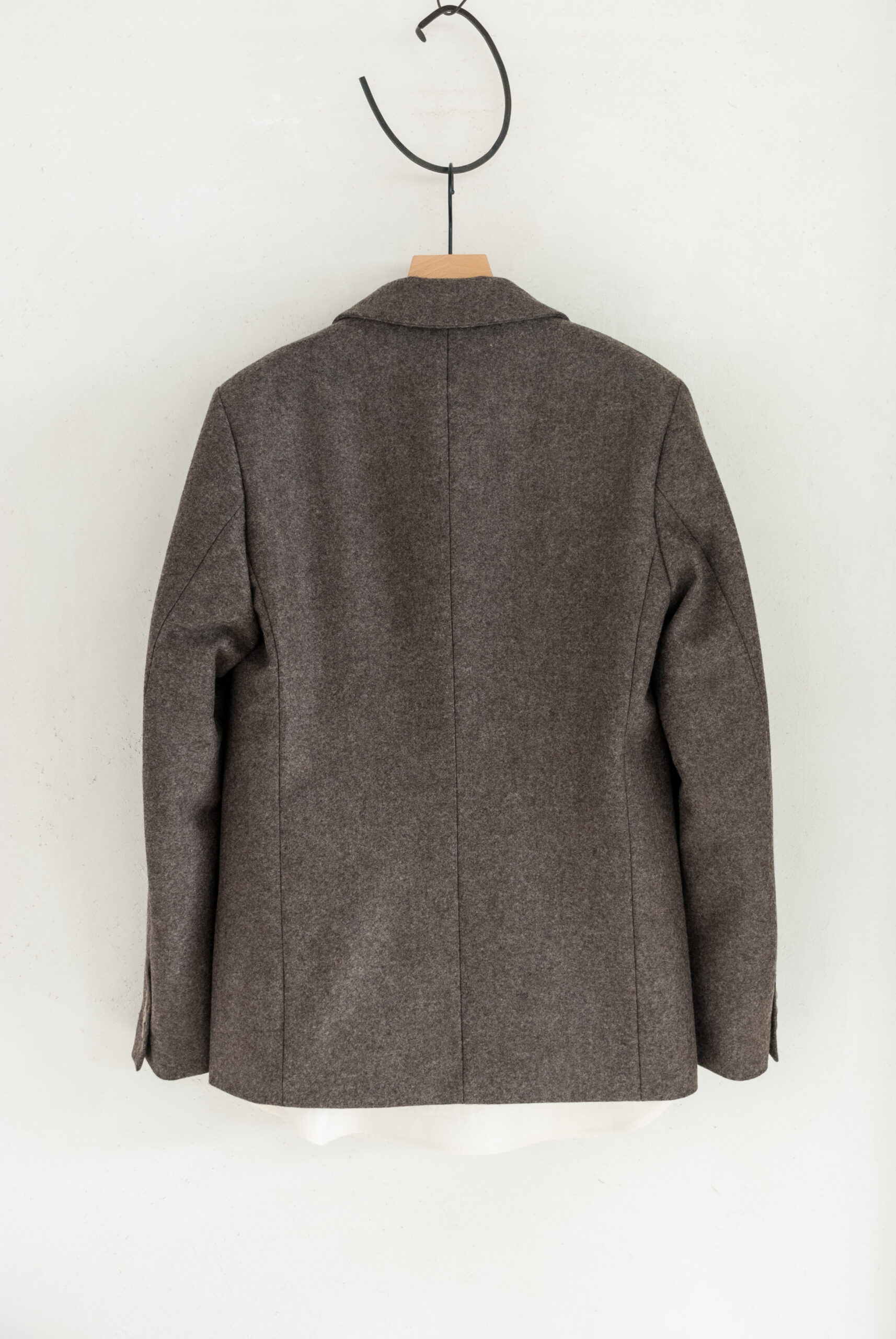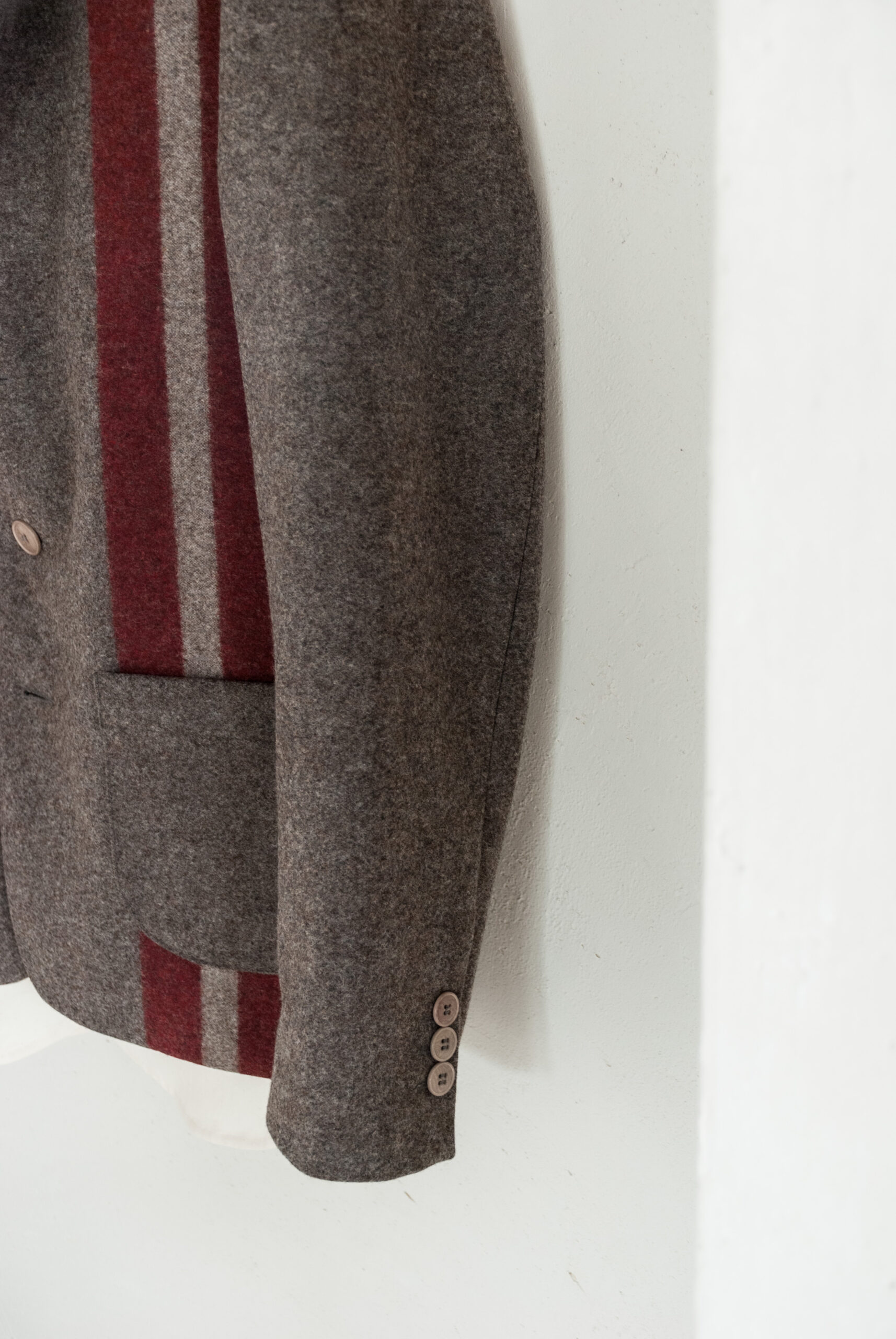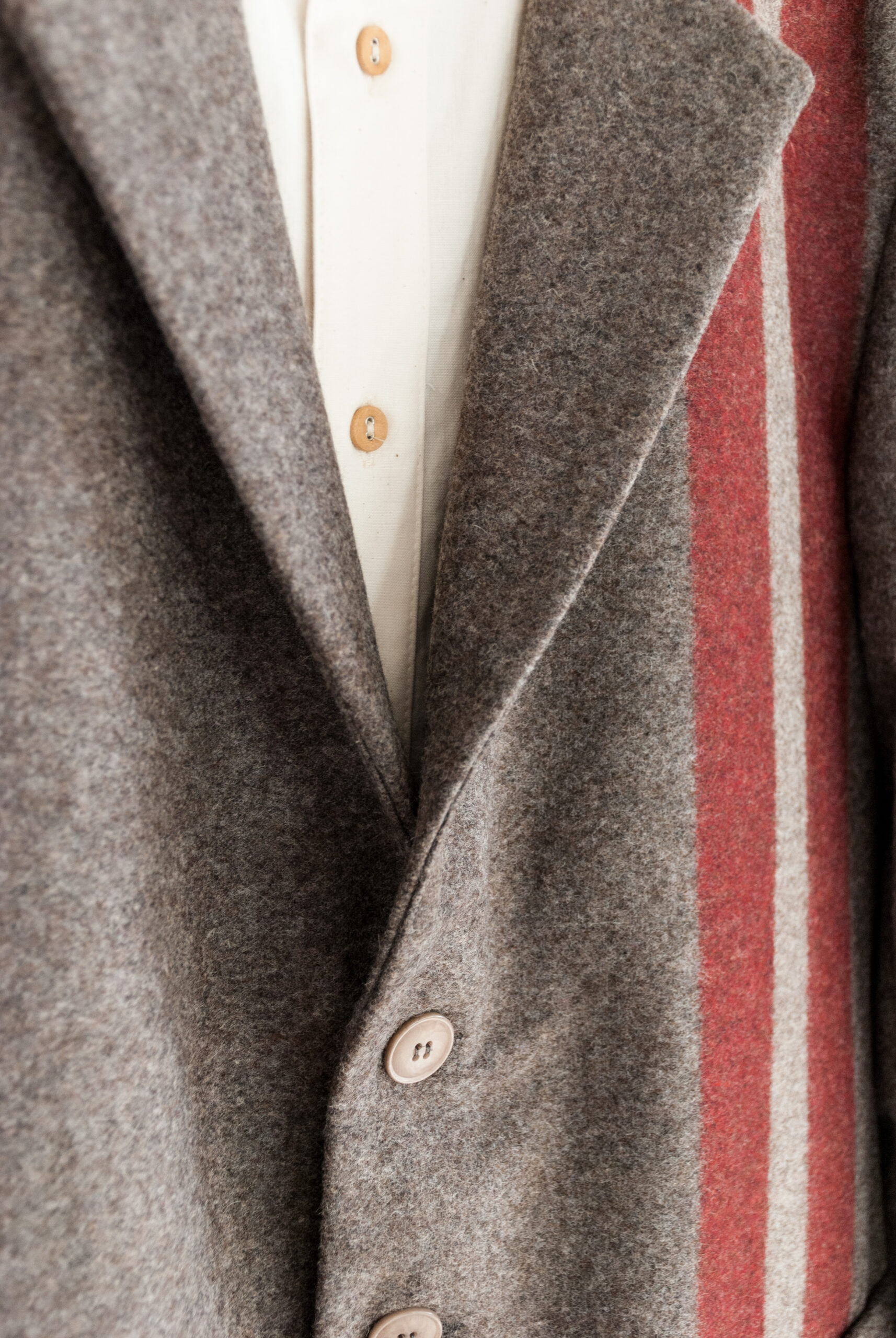 しっかりとしたテーラード技術に裏打ちされたジャケットは、ベーシックなスタイルながら、赤いストライプがアクセントとして効いており、何色かの糸が混ざり合って構成される縮絨されたウールの生地は、ベージュとグレーの間のような、品のある味わい深い色です。