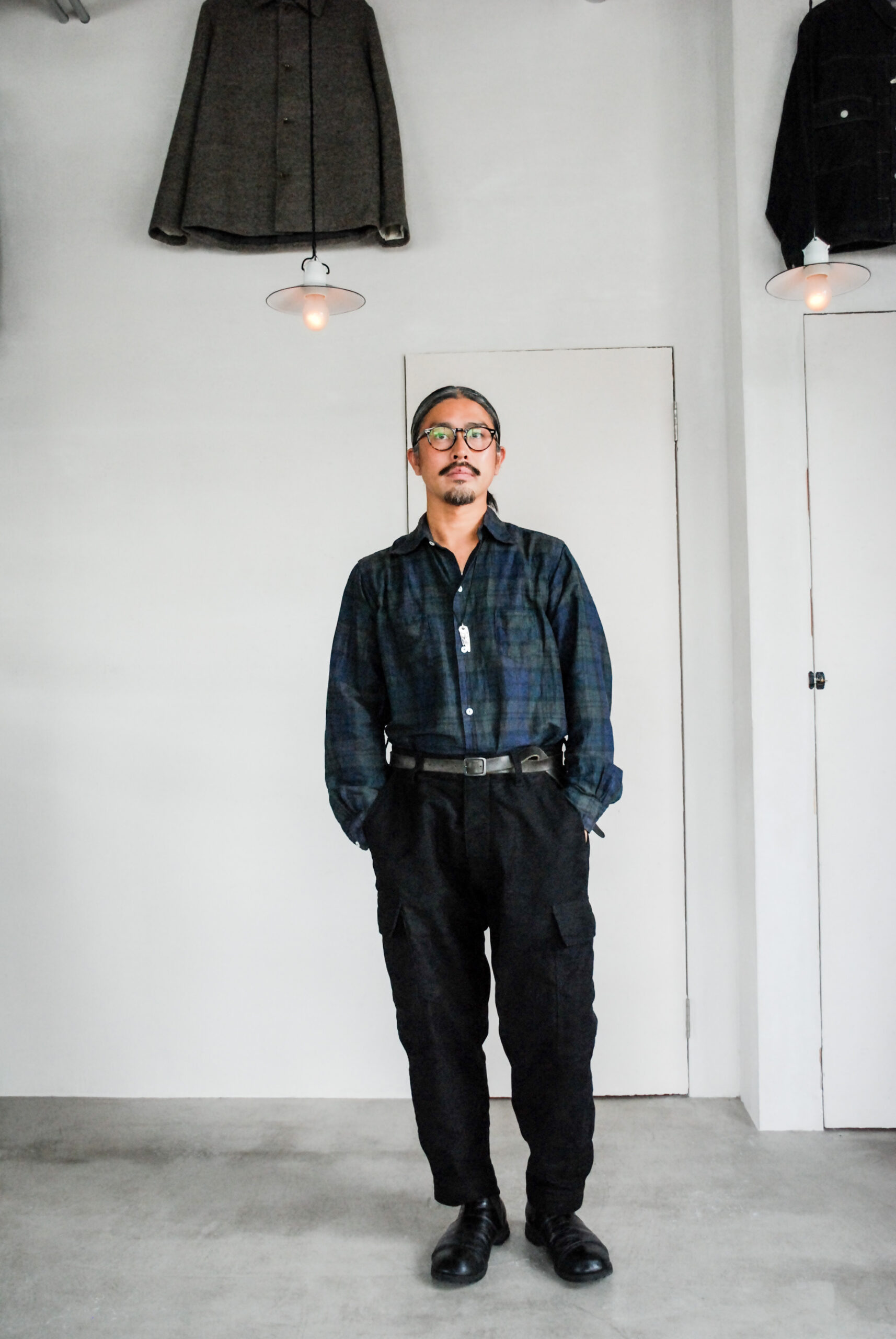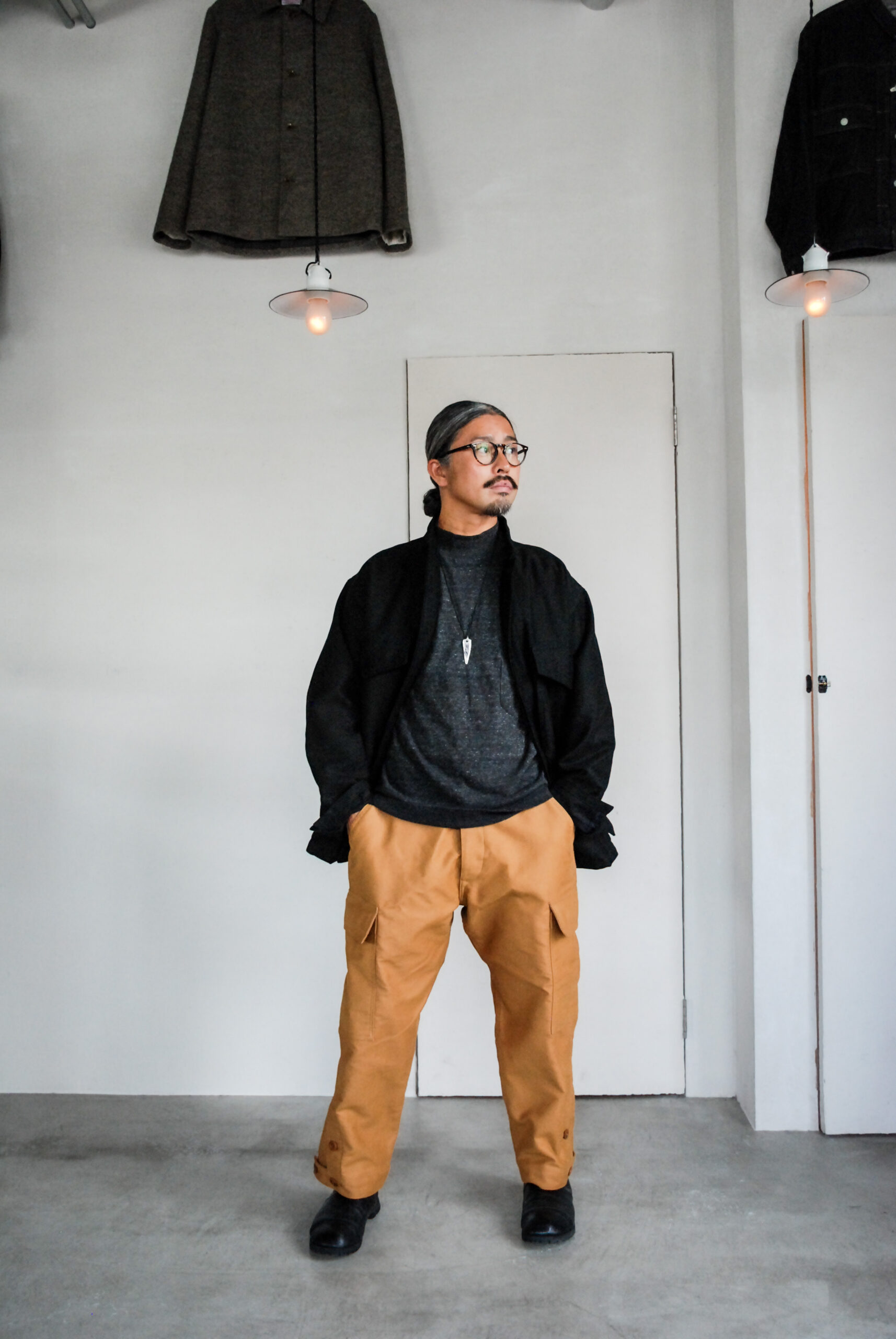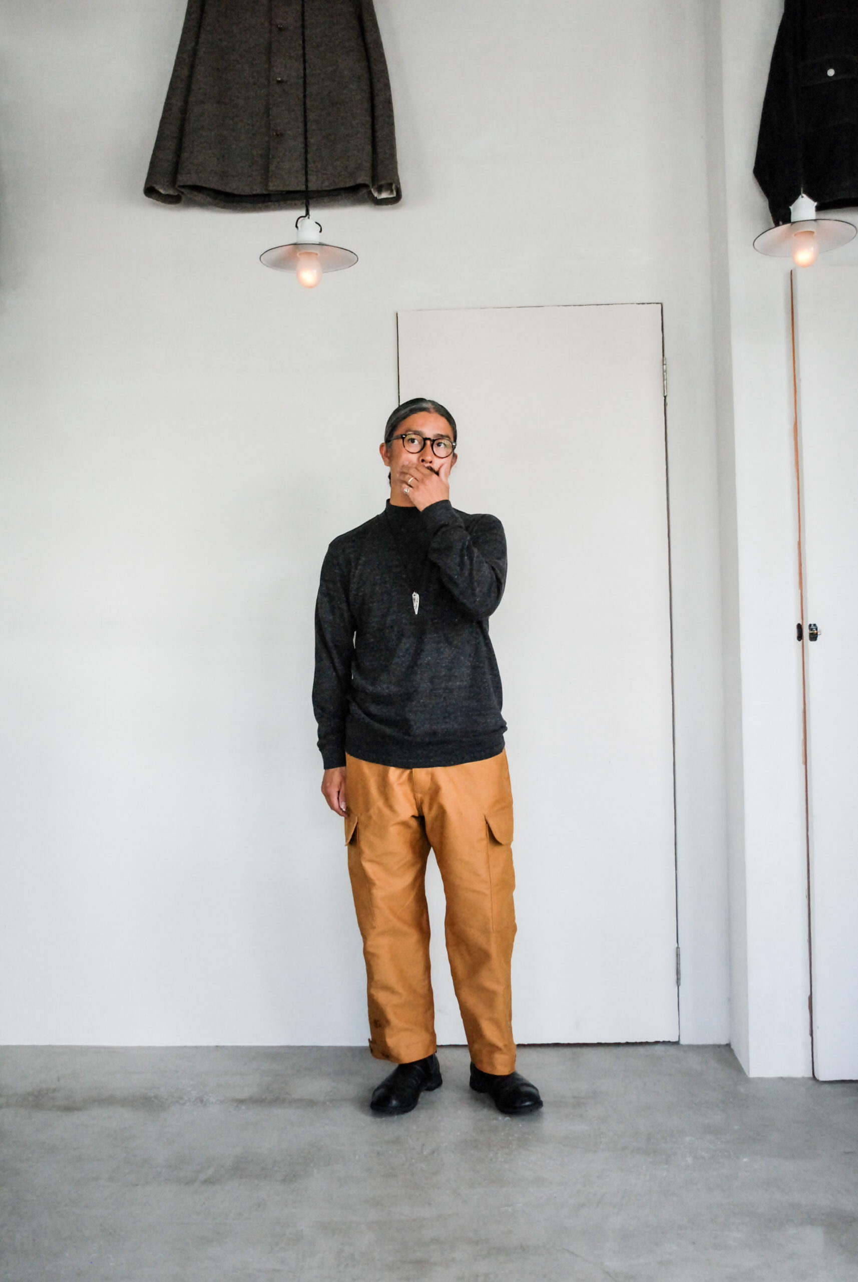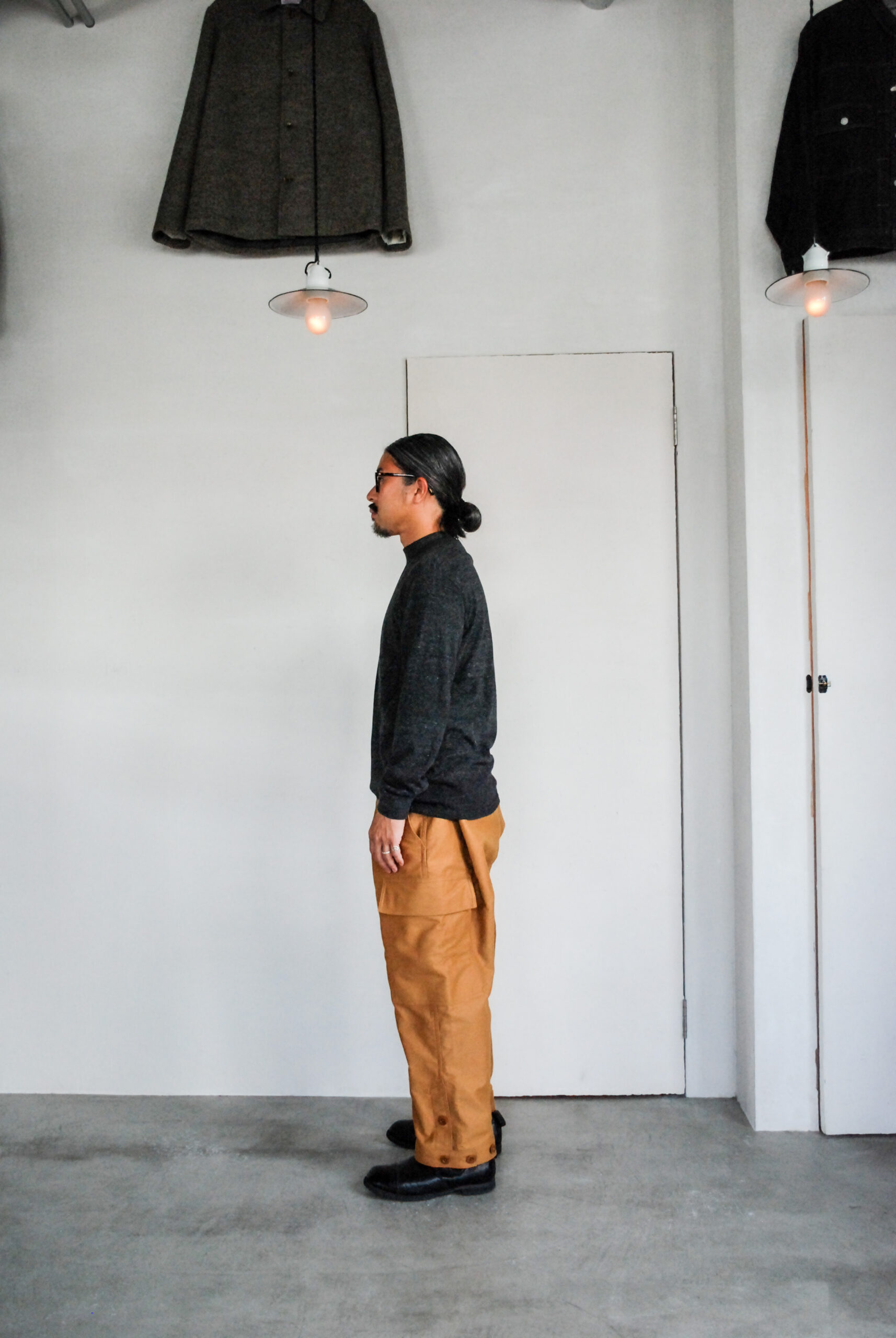 元々中村さんの靴(SG-02)に合わせて穿きたいなと思っていたので、少し高さのある靴との相性も抜群で、明るめのウールソックスとかで味付けしても良さそうです。