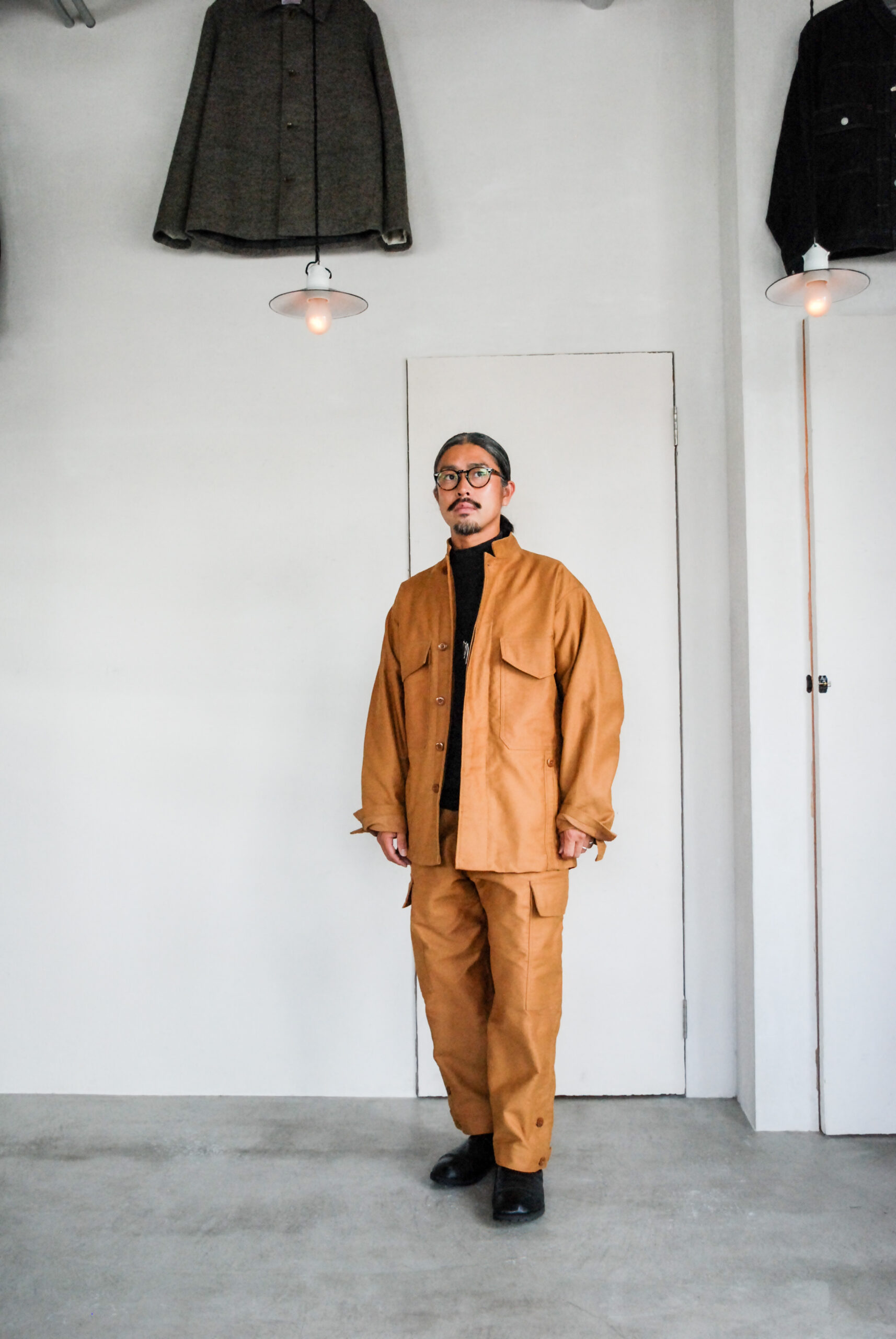 Moleskinを使ったジャケットとパンツなのですが、どちらもドイツ軍のヴィンテージウエアをモディファイしたもので、オリジナルのものよりも、とっても着やすく、気の利いたデザインになってます。