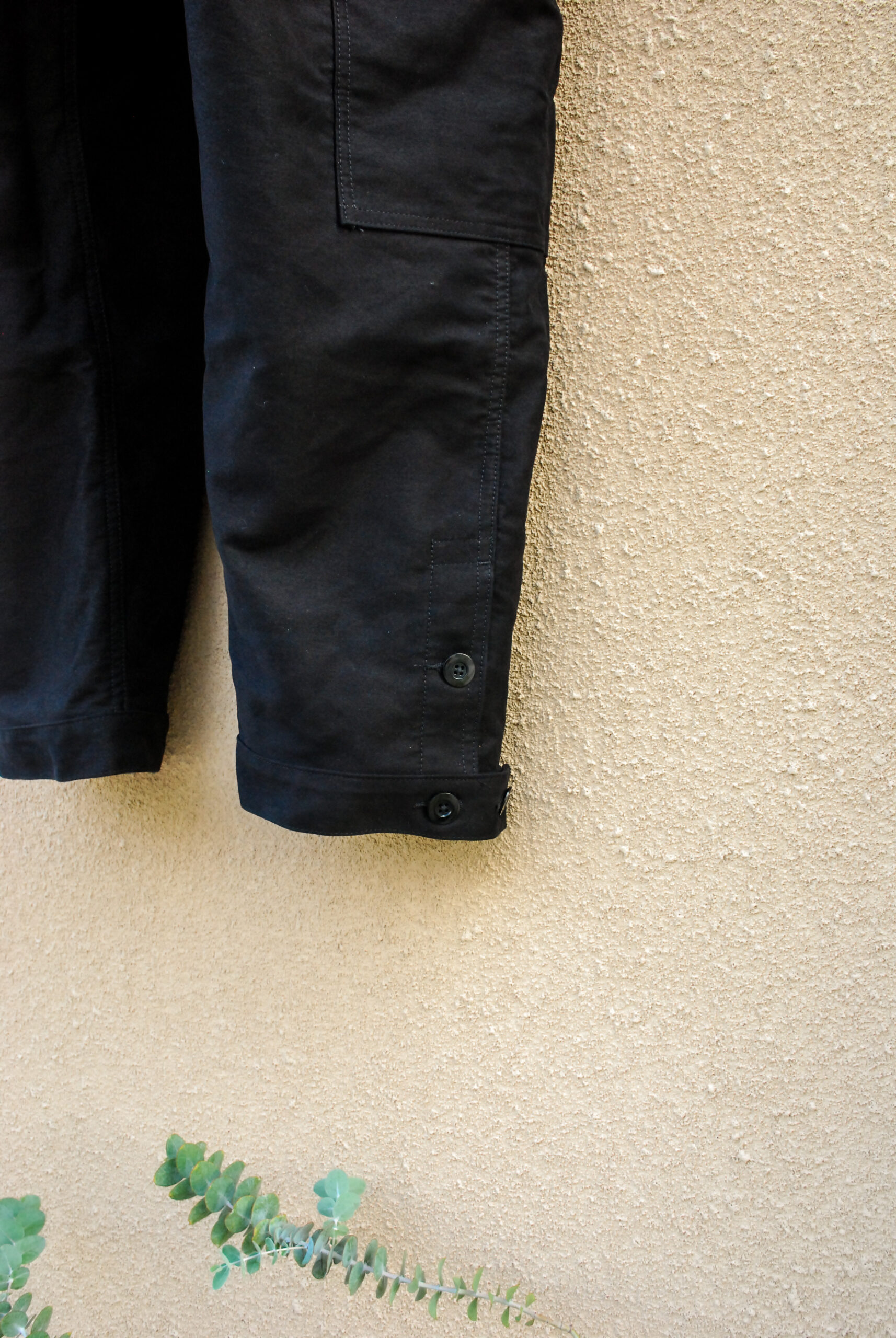 裾はボタンで幅を調整できるようになっていて、上の写真のブラックは裾を細くして穿いていて、下のブラウンは全開放してストンと落としています。