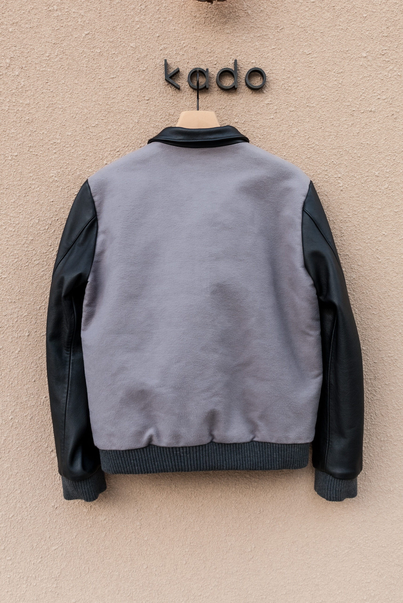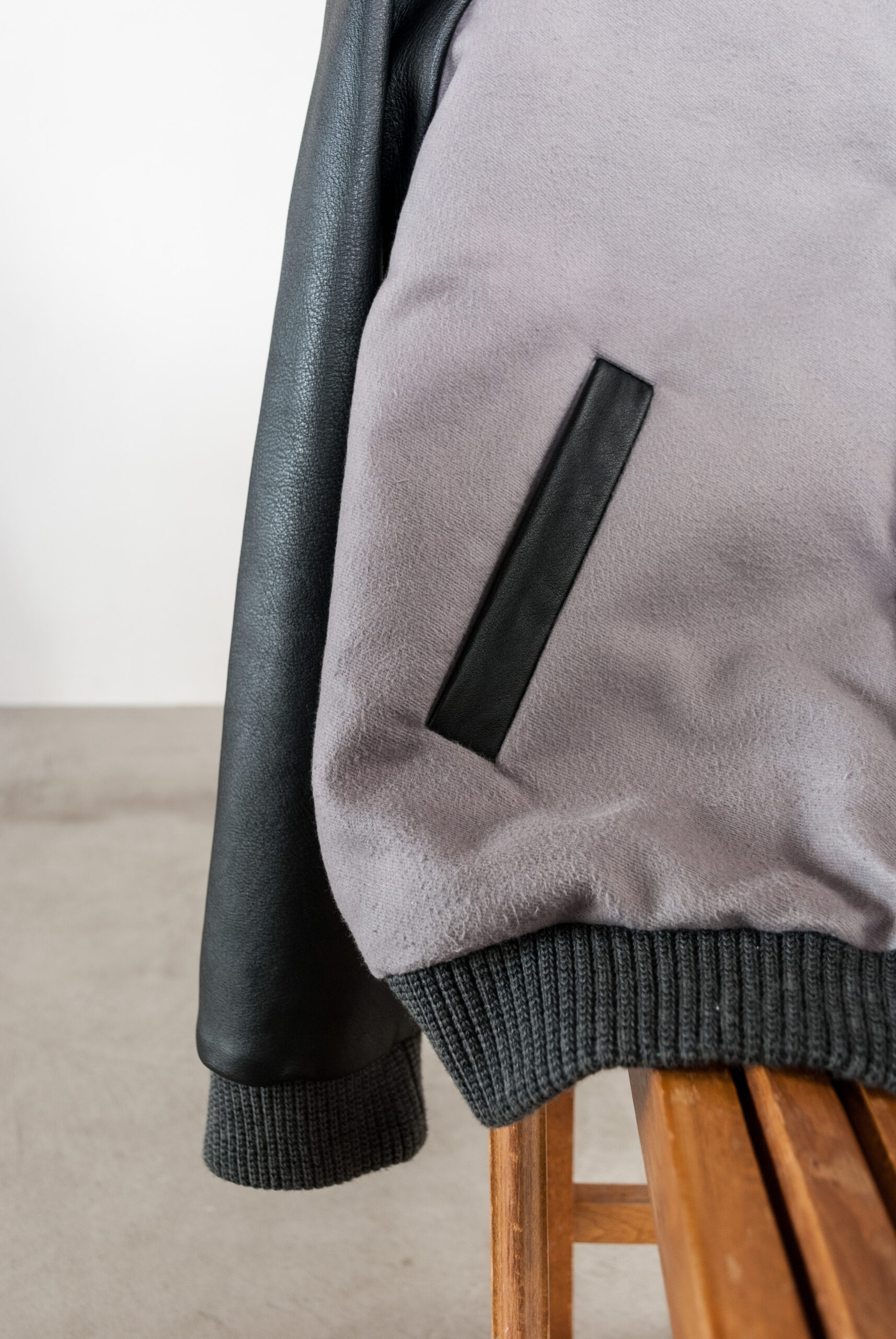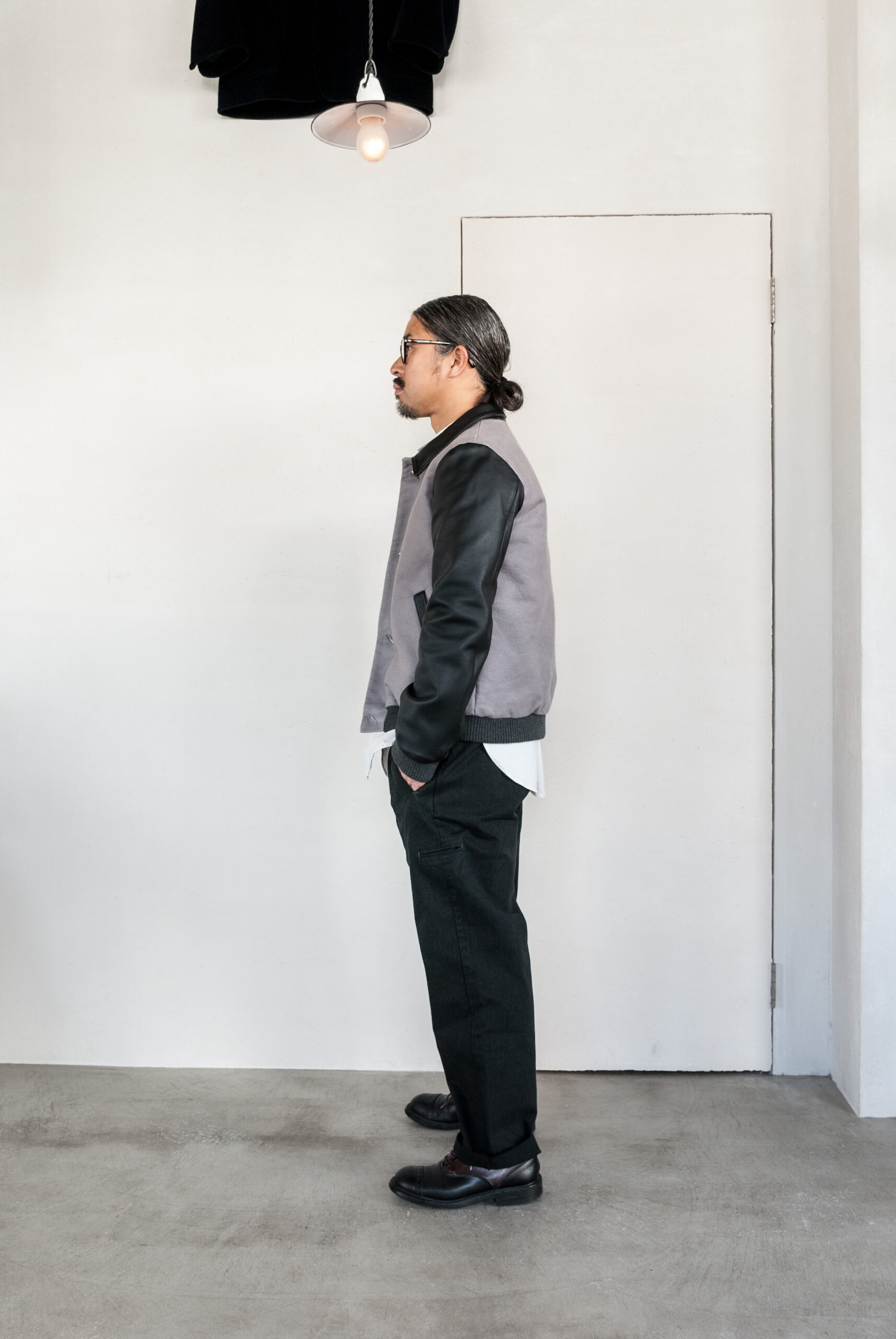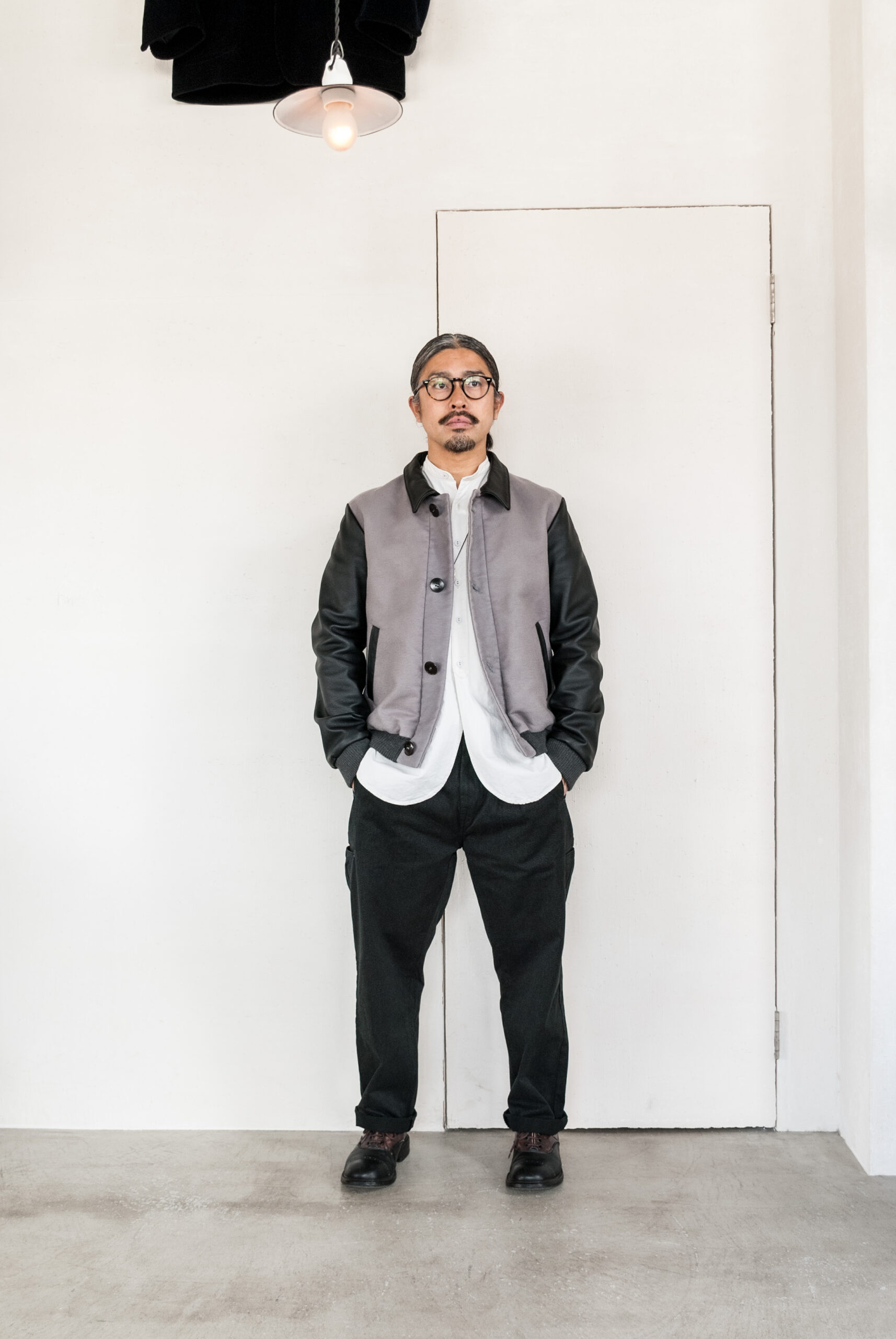 存在感のある独特なグレーのボディーは、レザーのブラックとリブのチャコールグレーと調和が取れていて意外とコーディネートしやすいですし、大きめのビンテージのフロントボタンは生地に負けてません。
