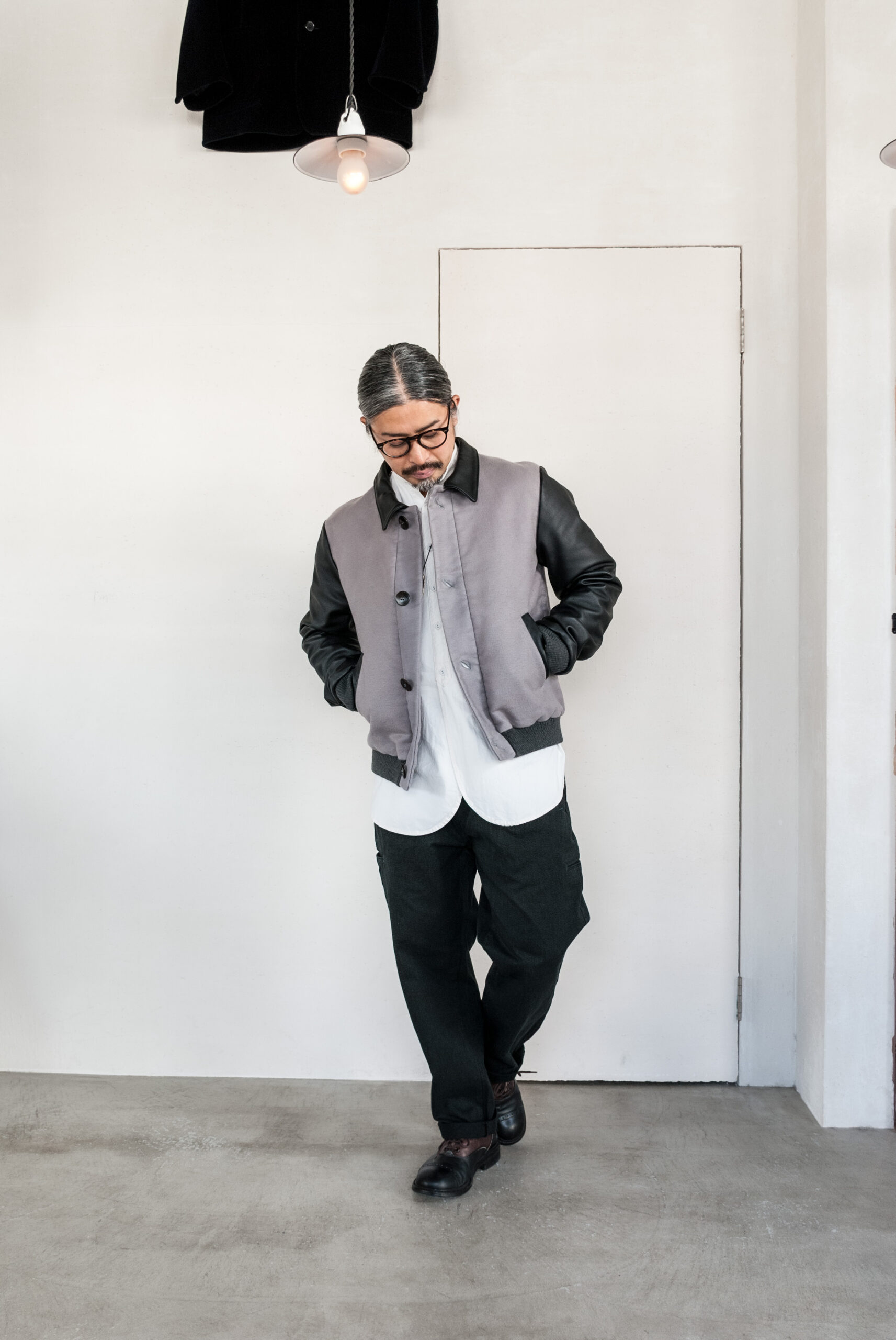 どことなくアワードジャケットのような雰囲気もあるし、レザーの襟を立てるとまた違った表情も見せてくれます。