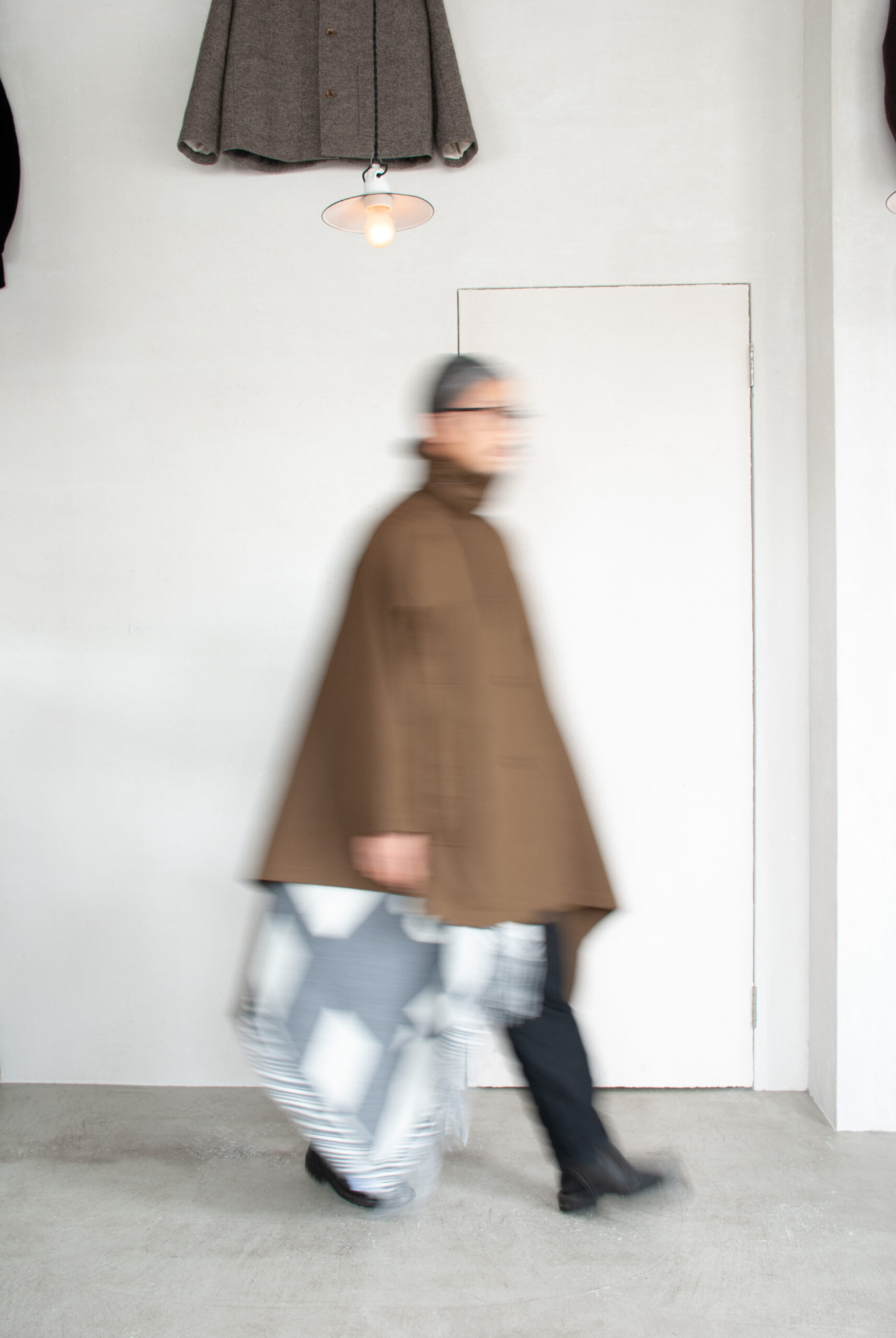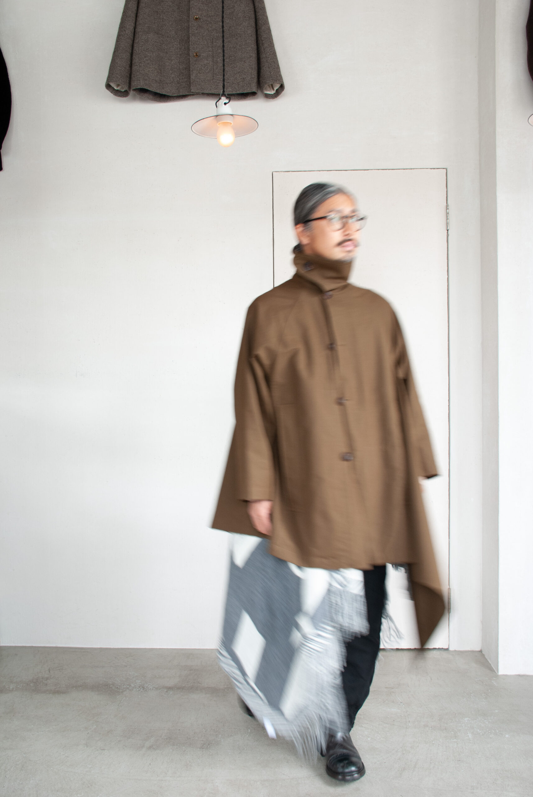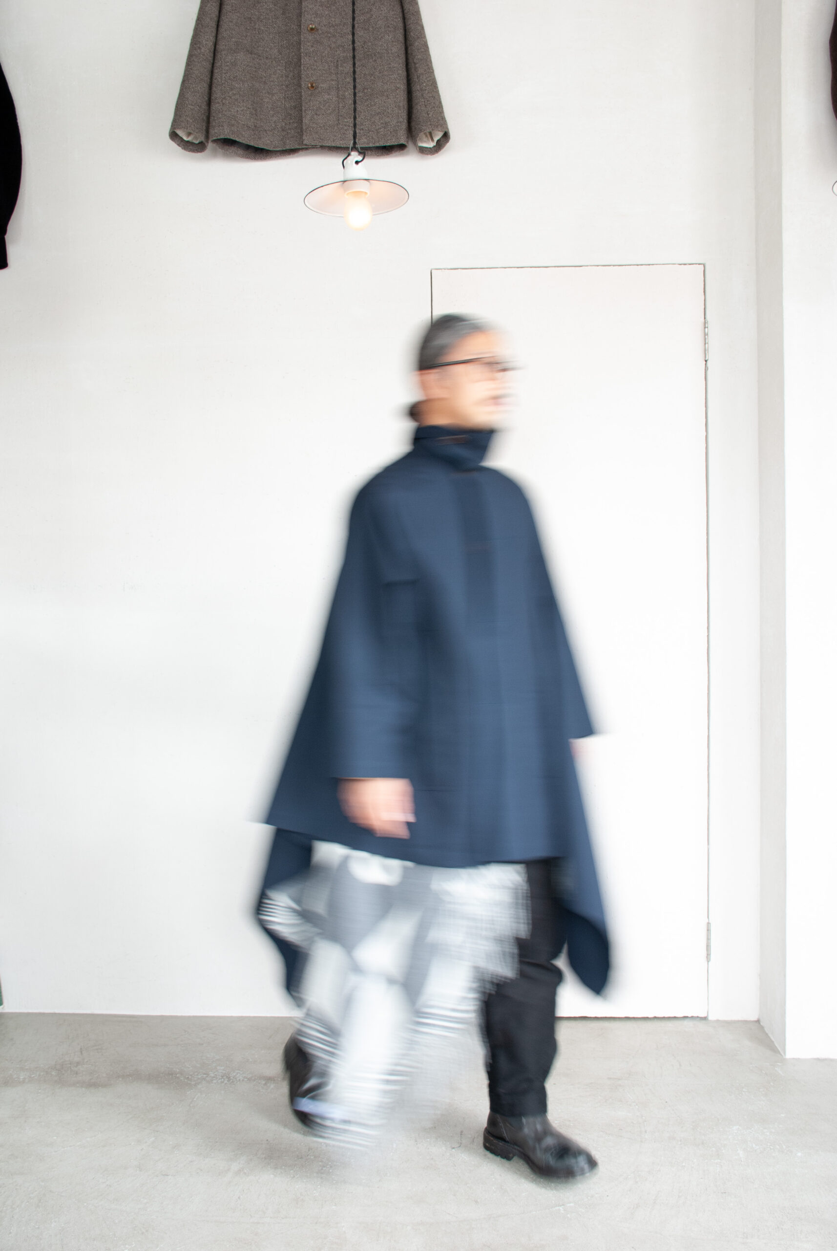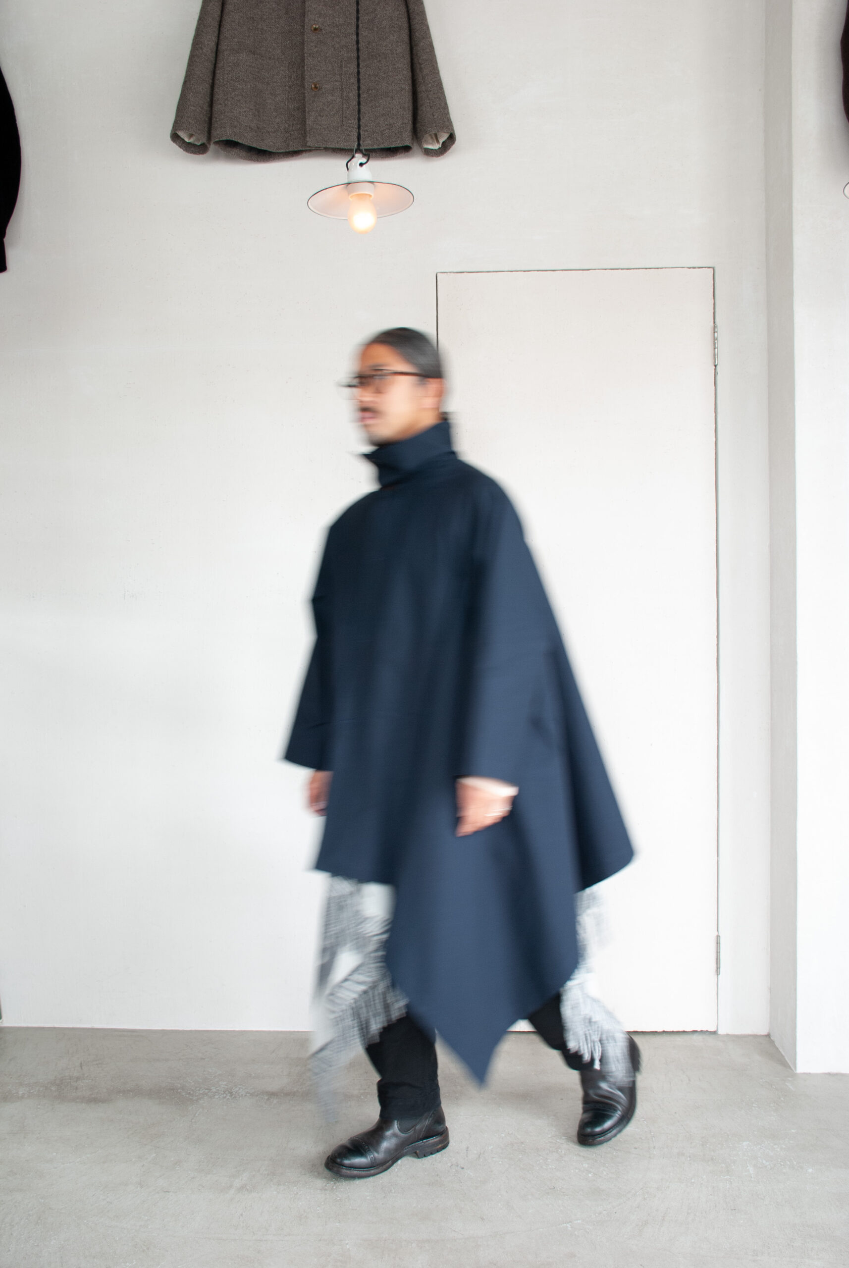 歩いてる時の生地の揺らぎやふくらみ、前からだけでなく、全方向から見てもらいたい。
