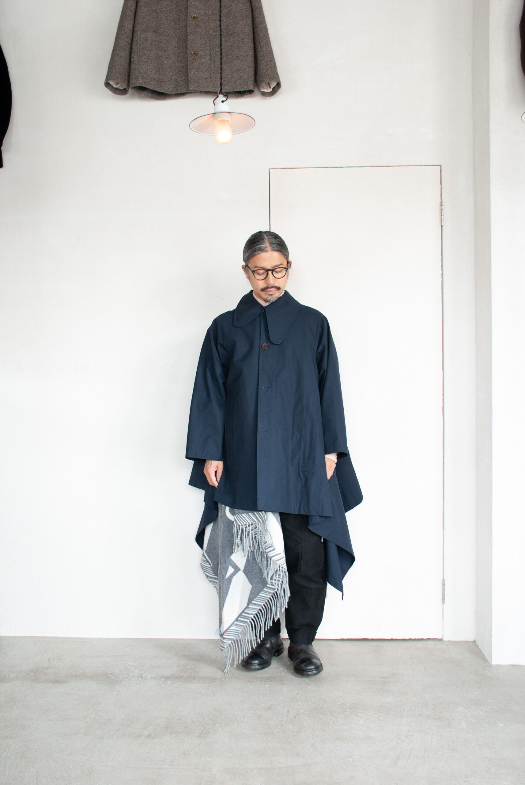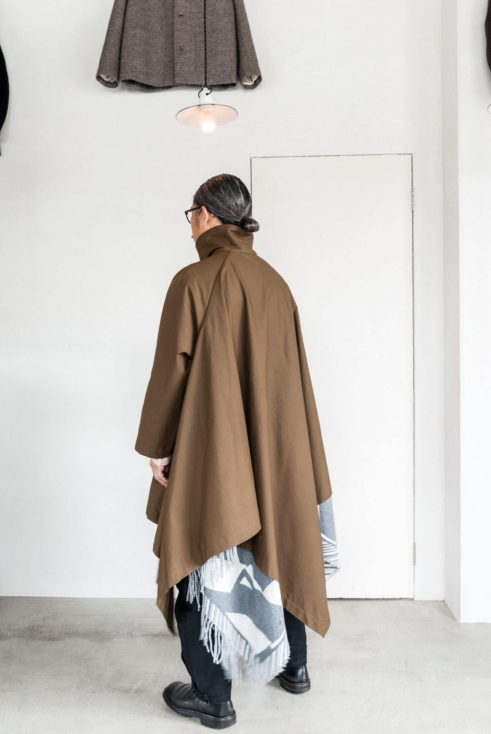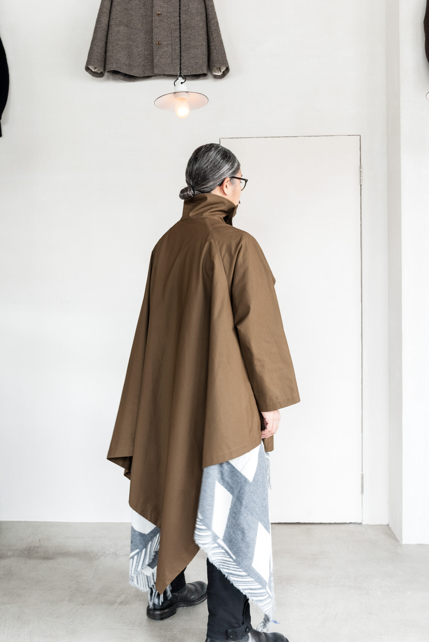 オイルドコットンが有名ですが、今回は高密度でしなやかな、ハリのある生地を採用しているので、ポンチョらしいたっぷりとしたシルエットに美しい余白が映えます。