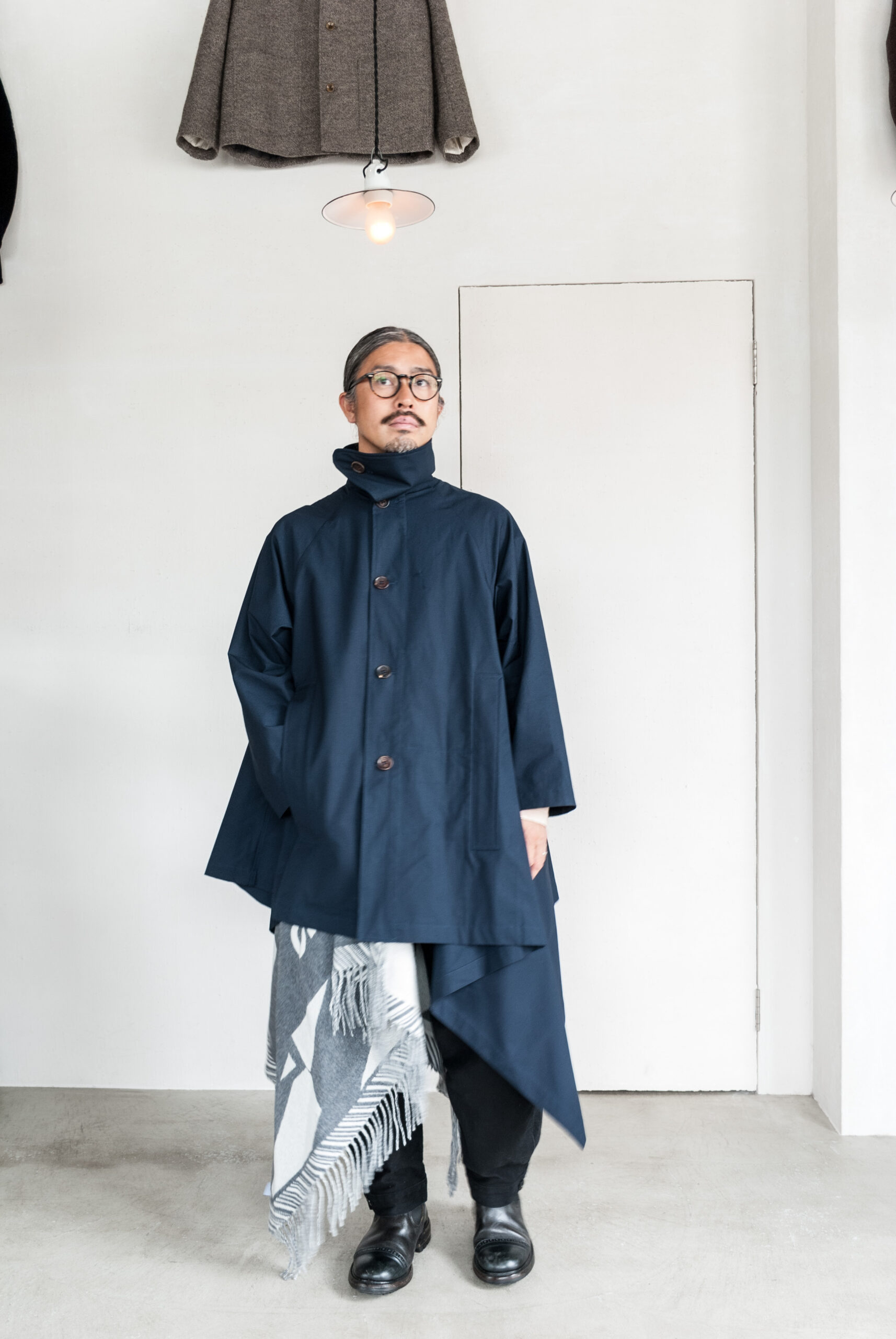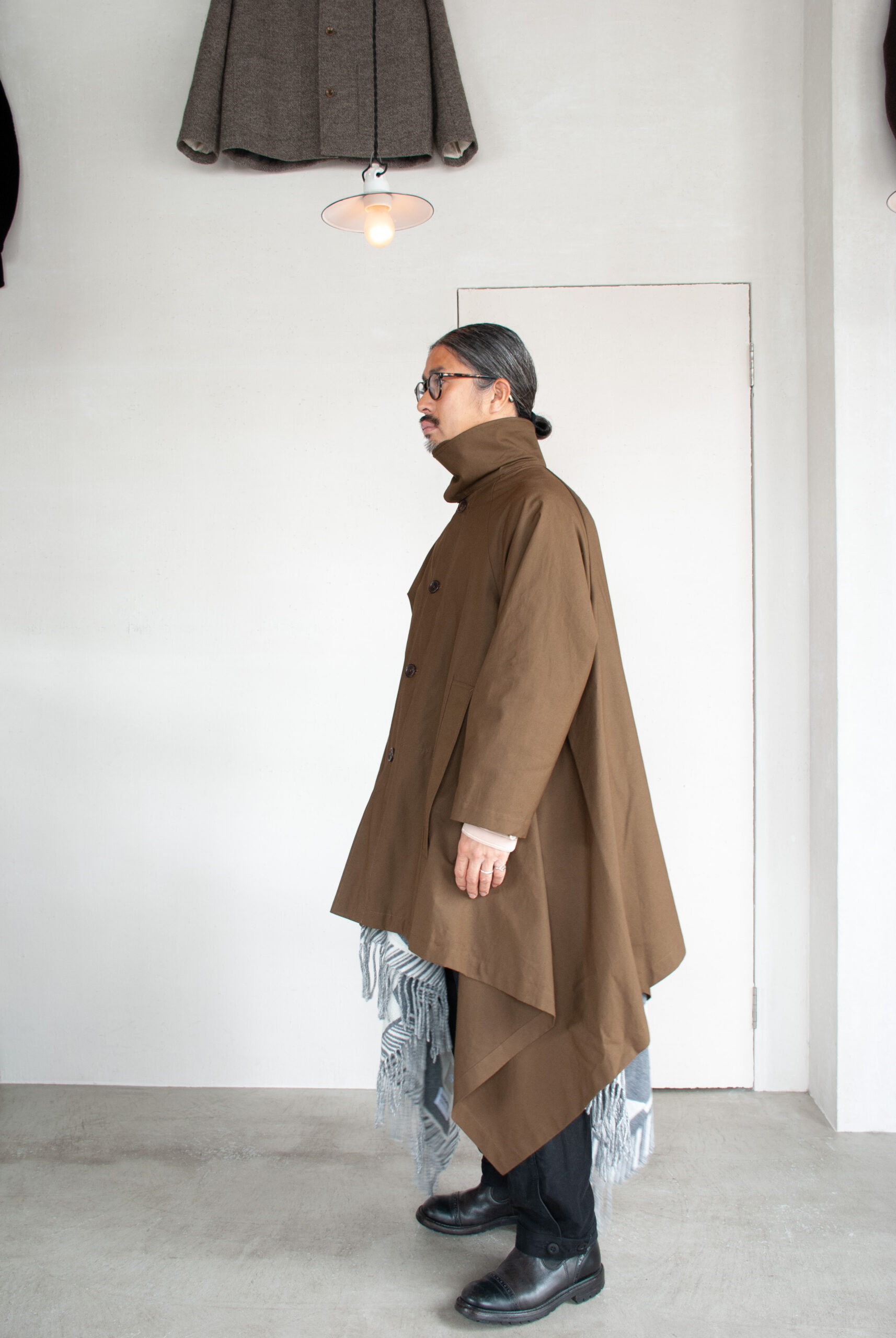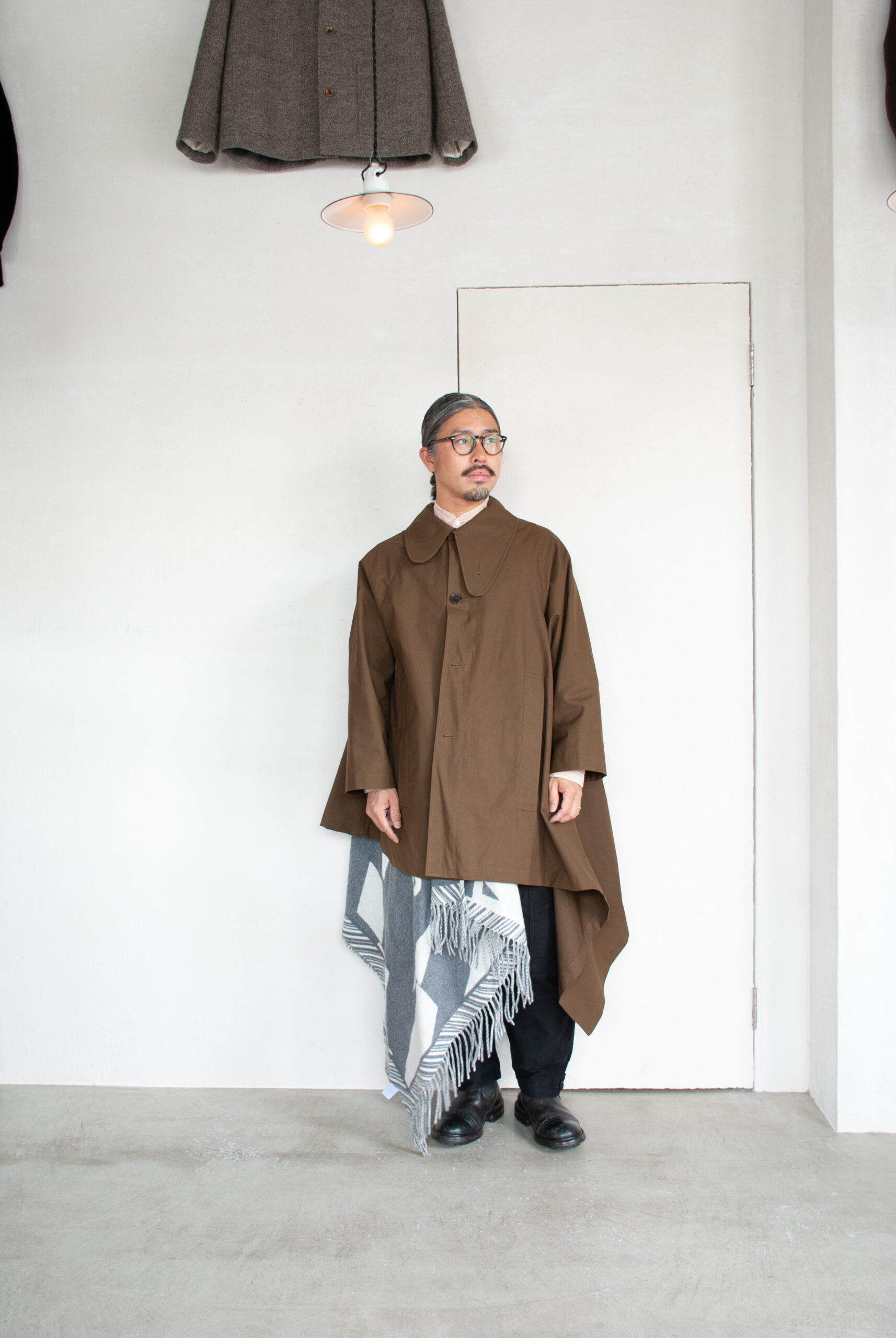 オイルドコットンが有名ですが、今回は高密度でしなやかな、ハリのある生地を採用しているので、ポンチョらしいたっぷりとしたシルエットに美しい余白が映えます。