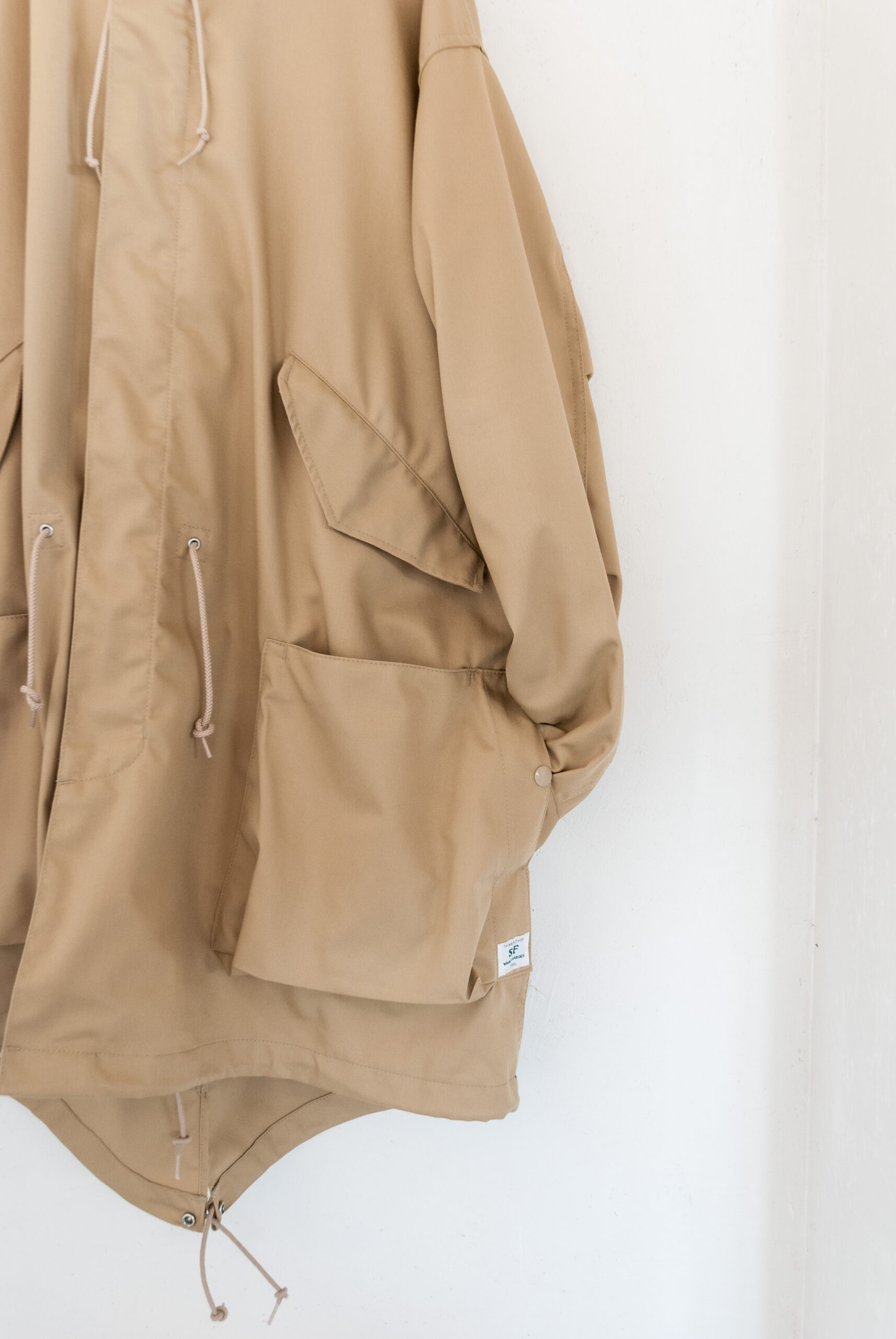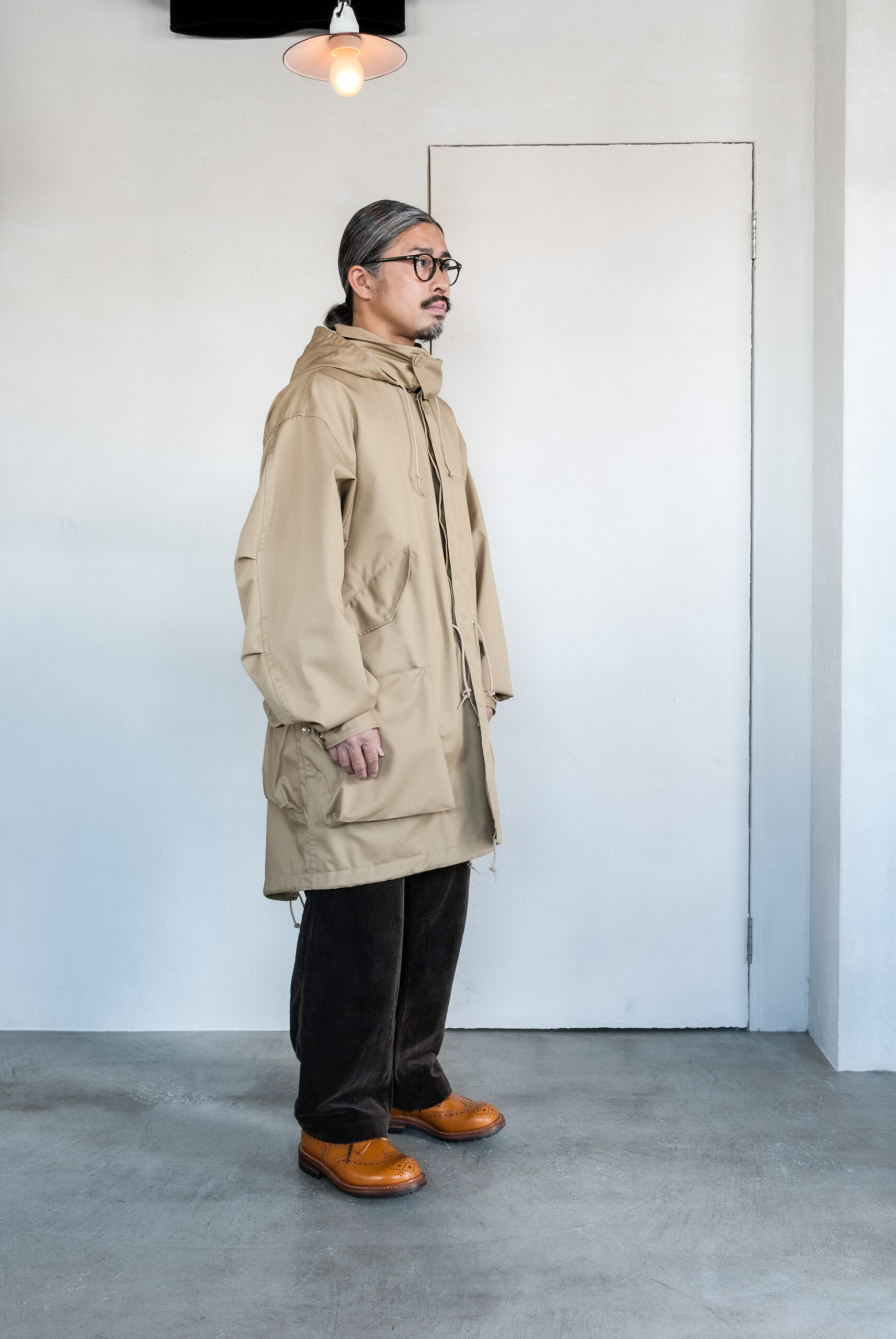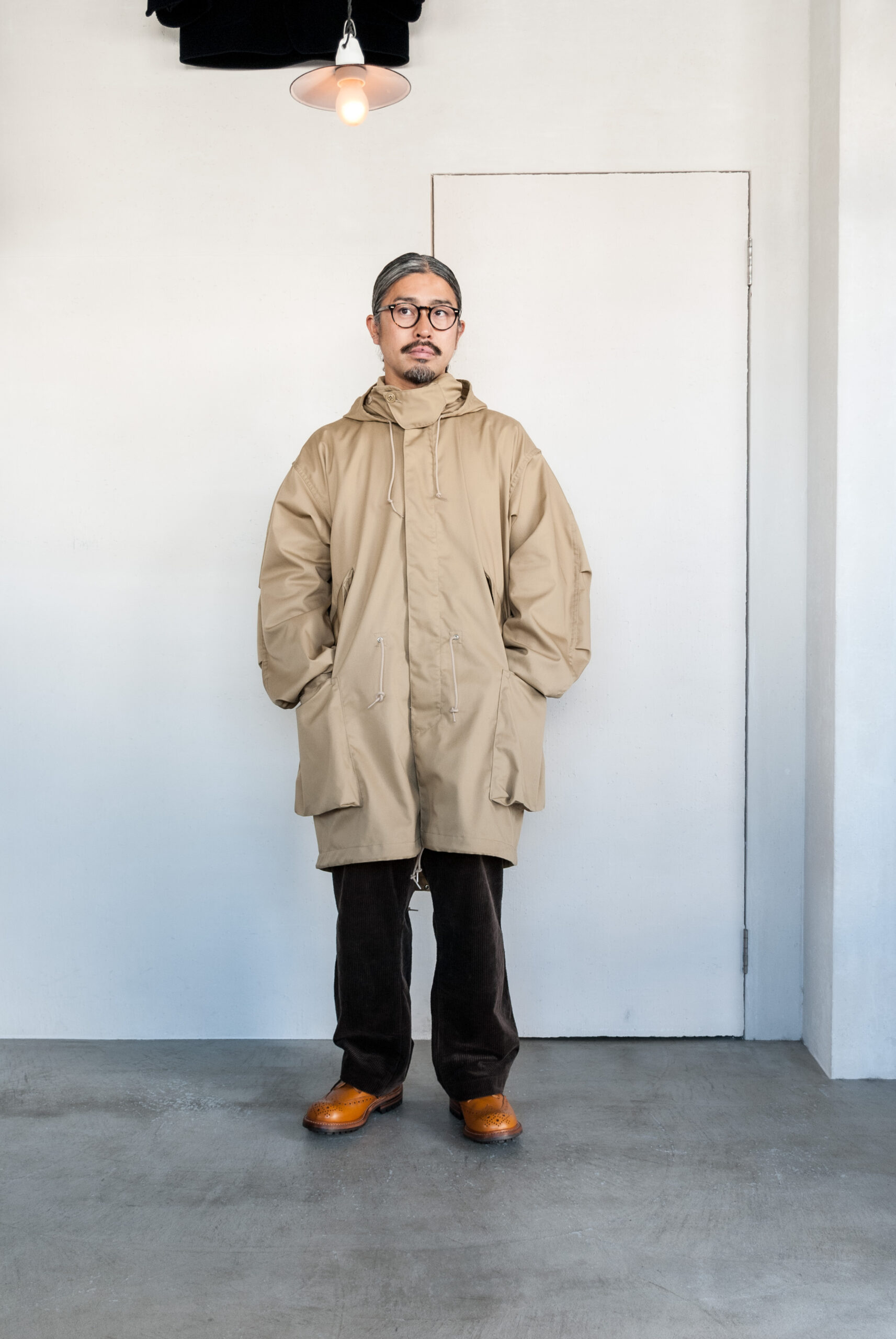 米軍が寒冷地向けに開発したコート「M-65フィッシュテールパーカ」をベースに、「M-65フィールドジャケット」のフード収納可能な首元のディテールなど、ササフラス流のアレンジを加えて製作したコートです。