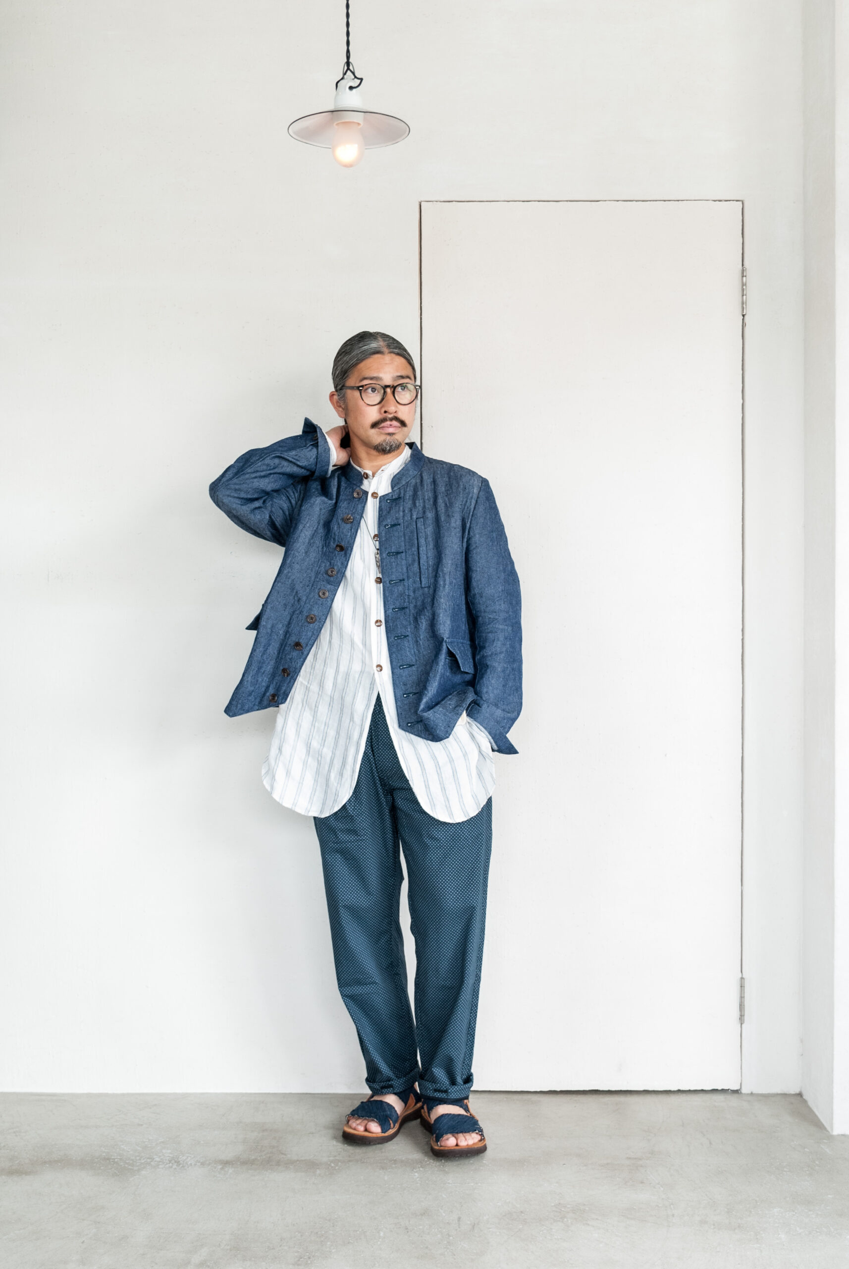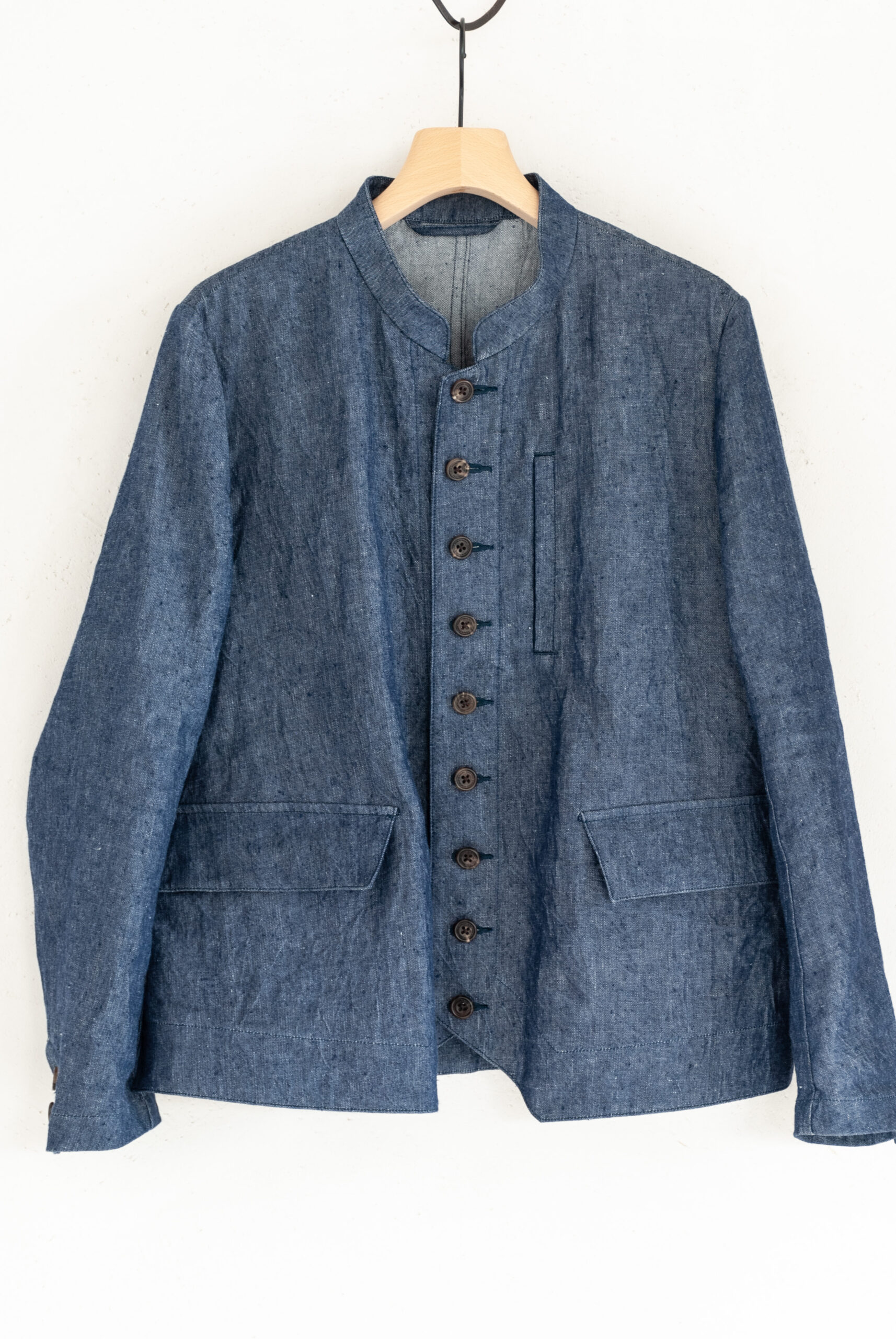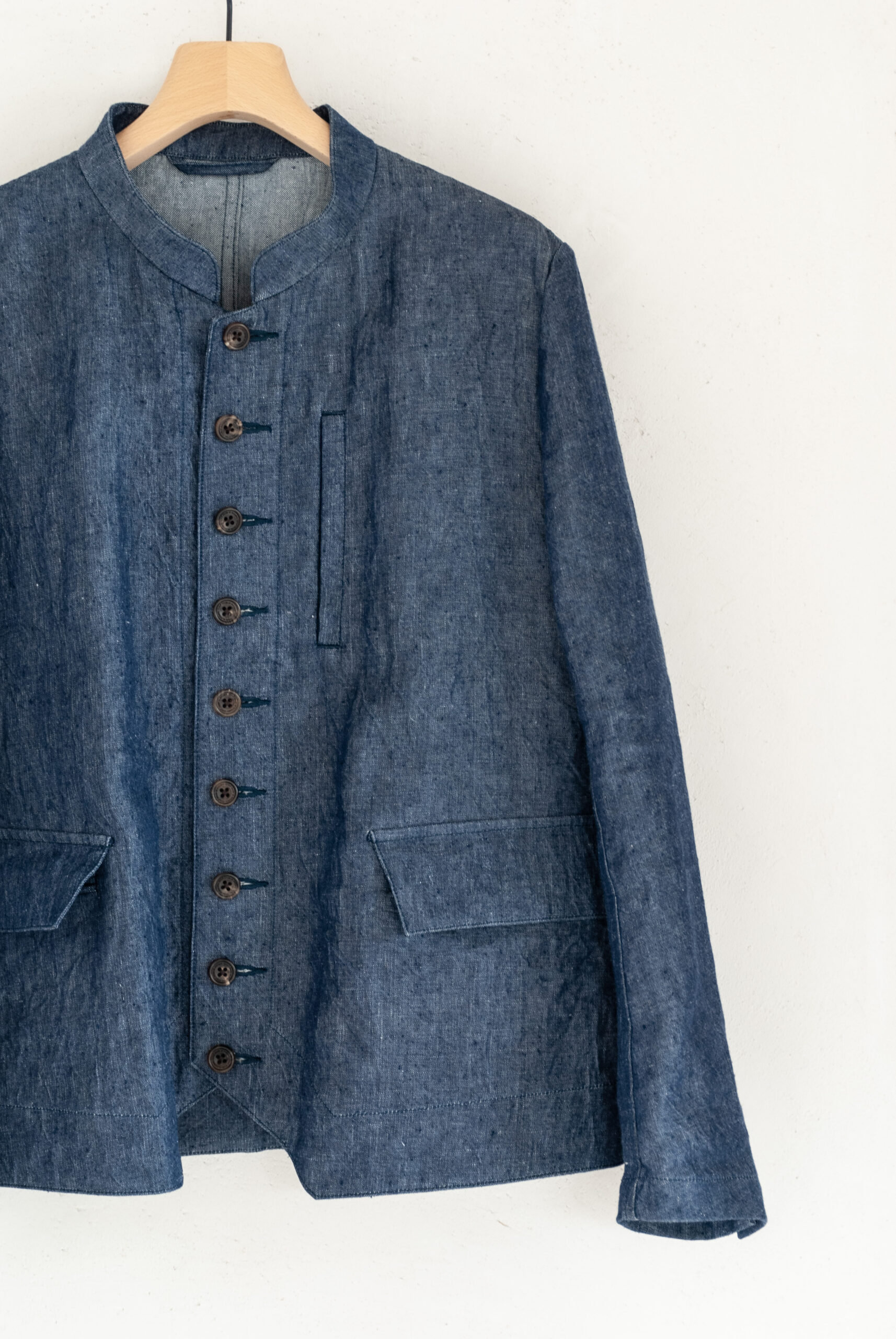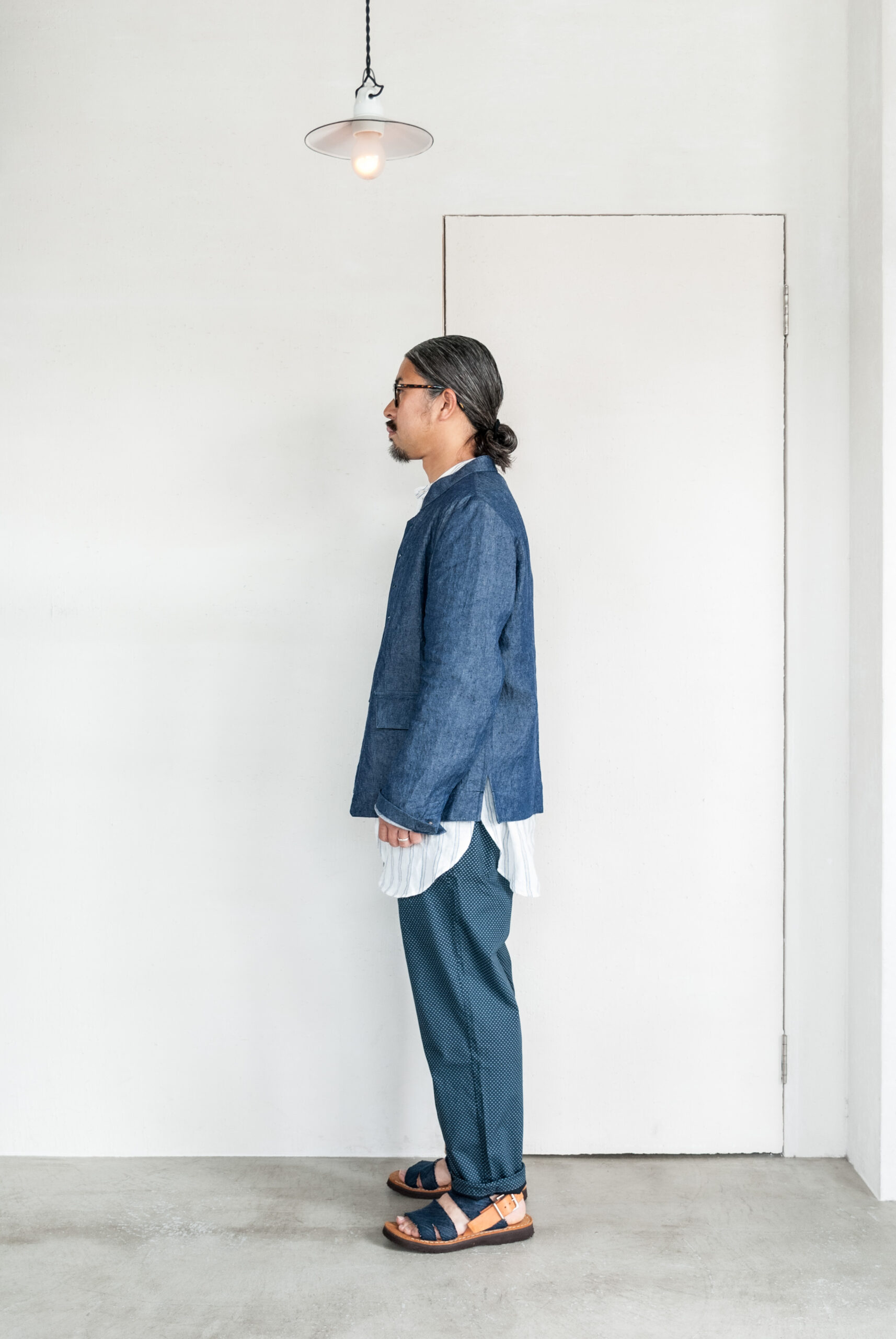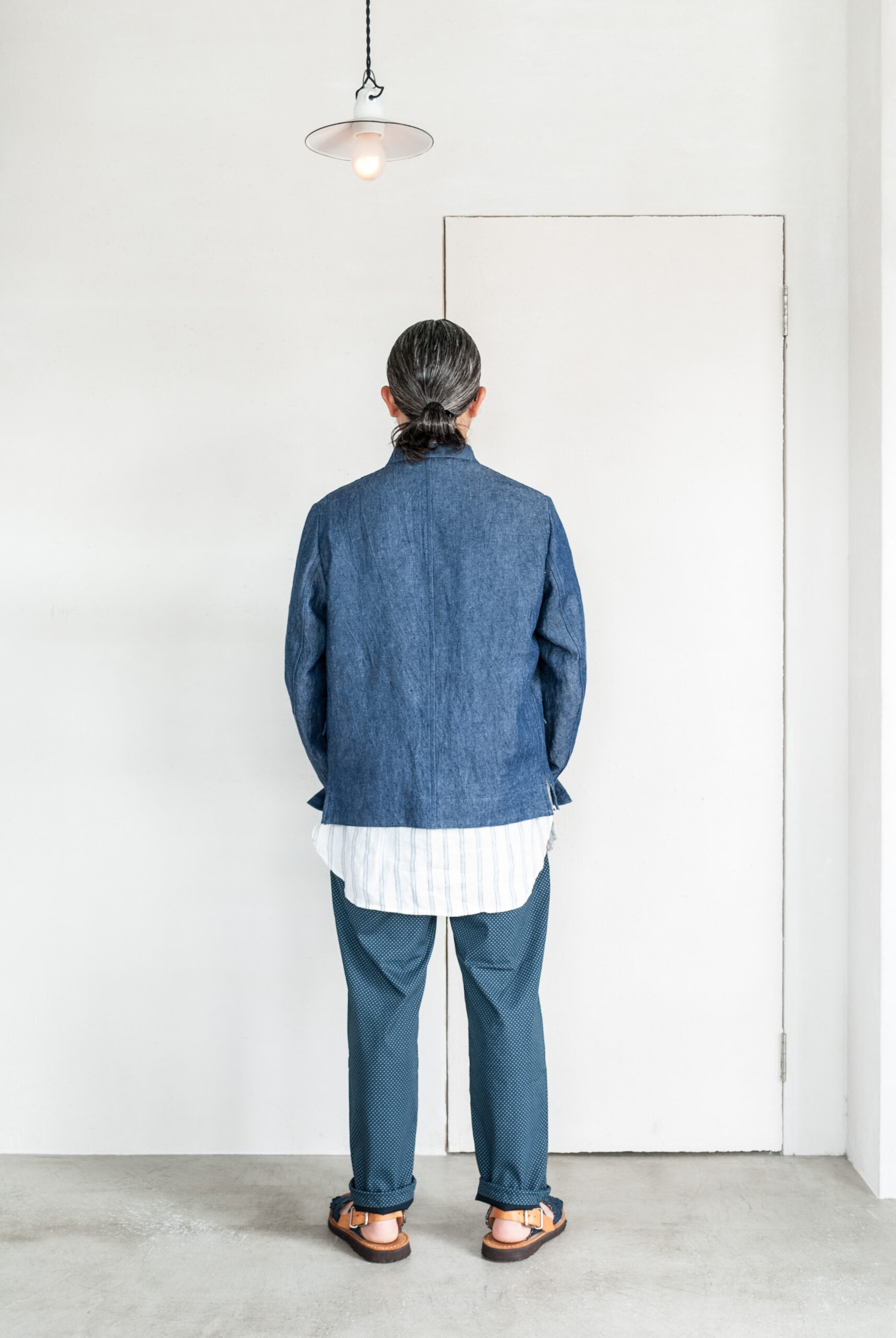 インディゴリネンデニムのPHILLIPSは裏地の付かない一枚仕立て、リネン特有の凹凸感と横糸の白さがいい塩梅に効いています。
