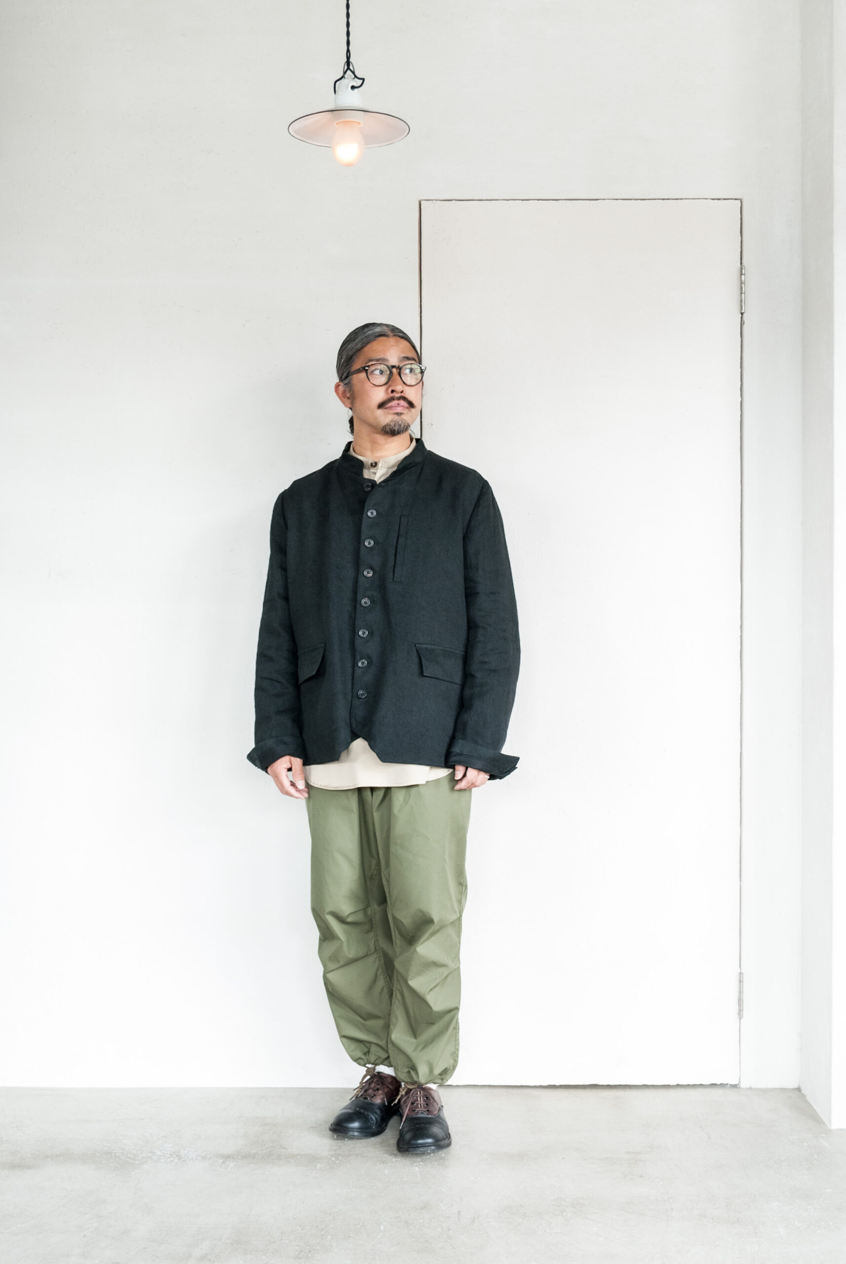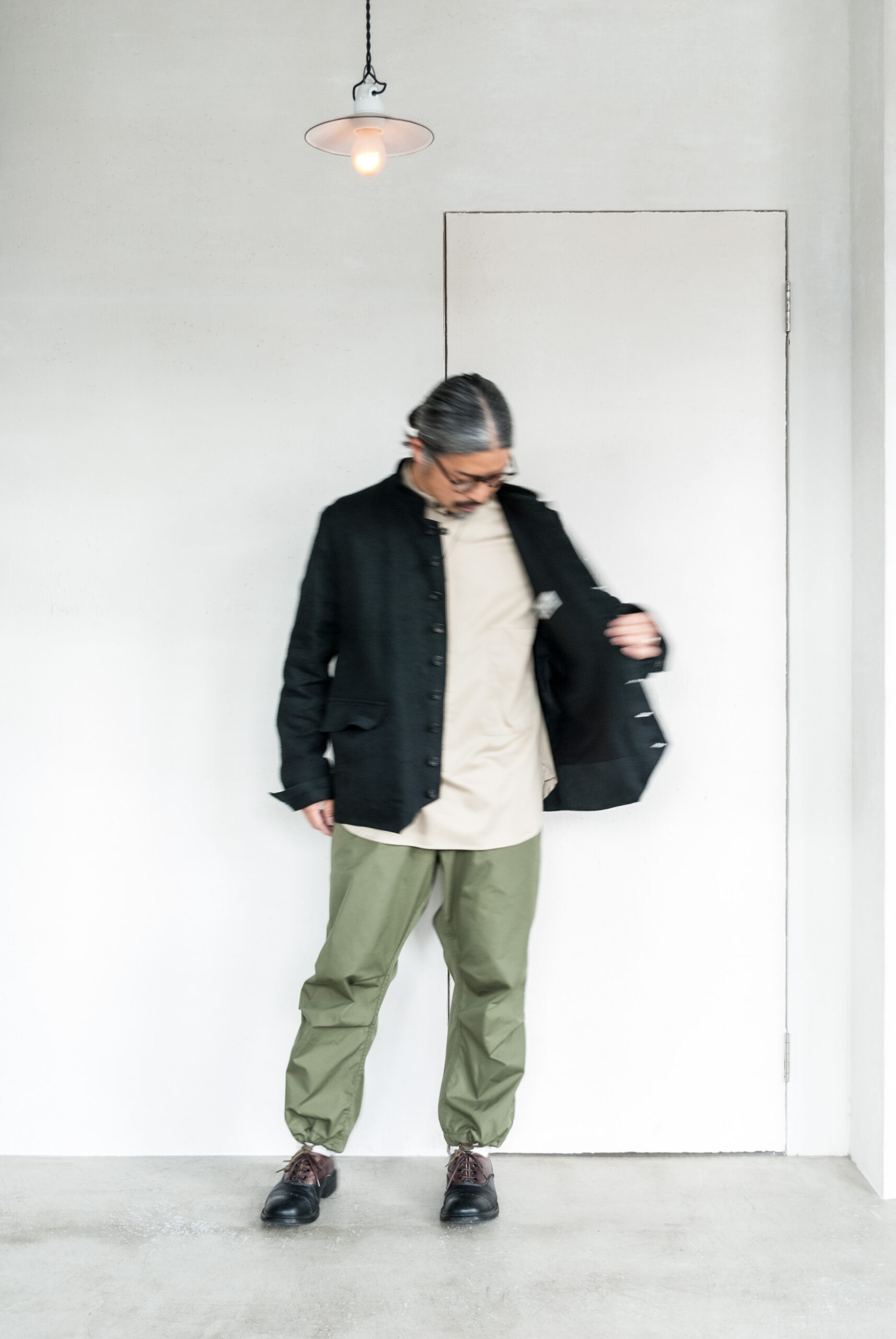 整然と並んだ9つのボタン、ジレのような身頃と、たっぷりと取られた身幅、象徴的な要素を残しながら現代的に仕上げられたジャケットは、ビンテージのそれよりも格段に着やすく、既視感のないスタイルが気分を上げてくれる。