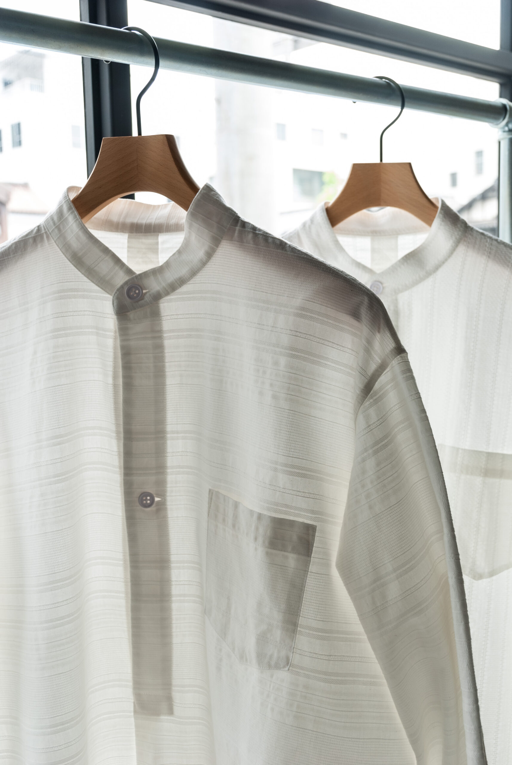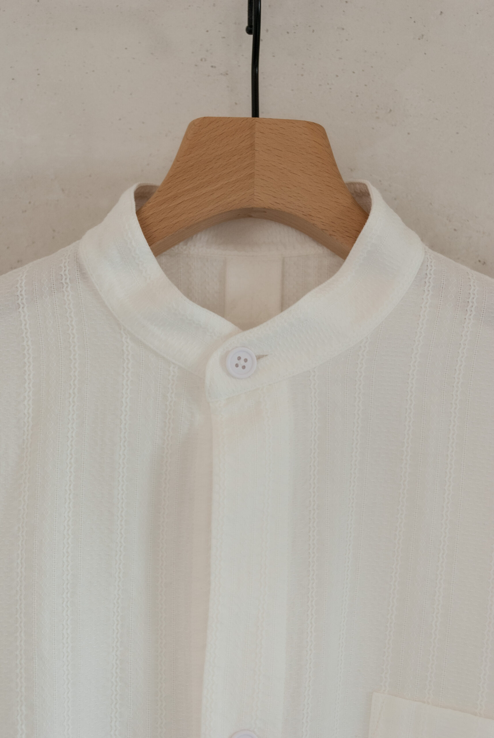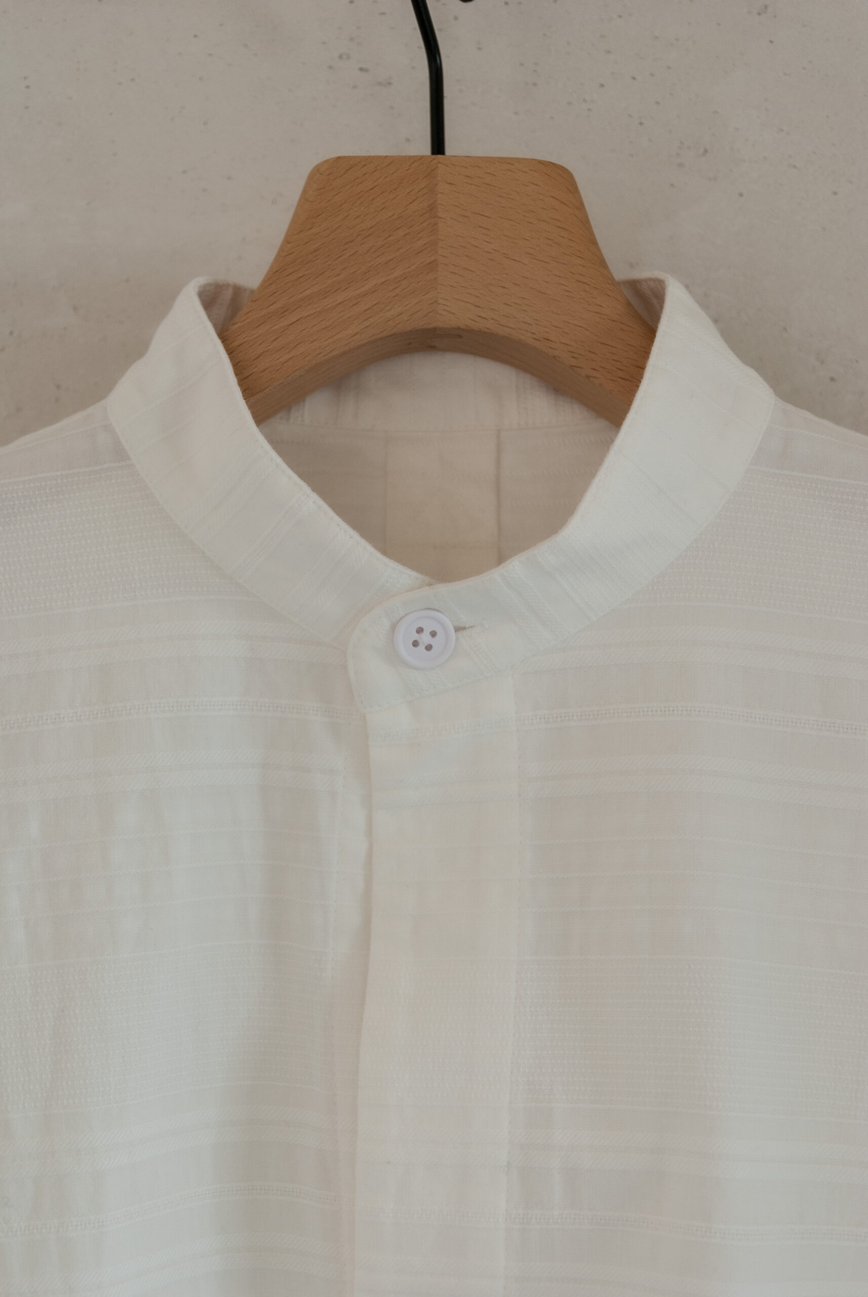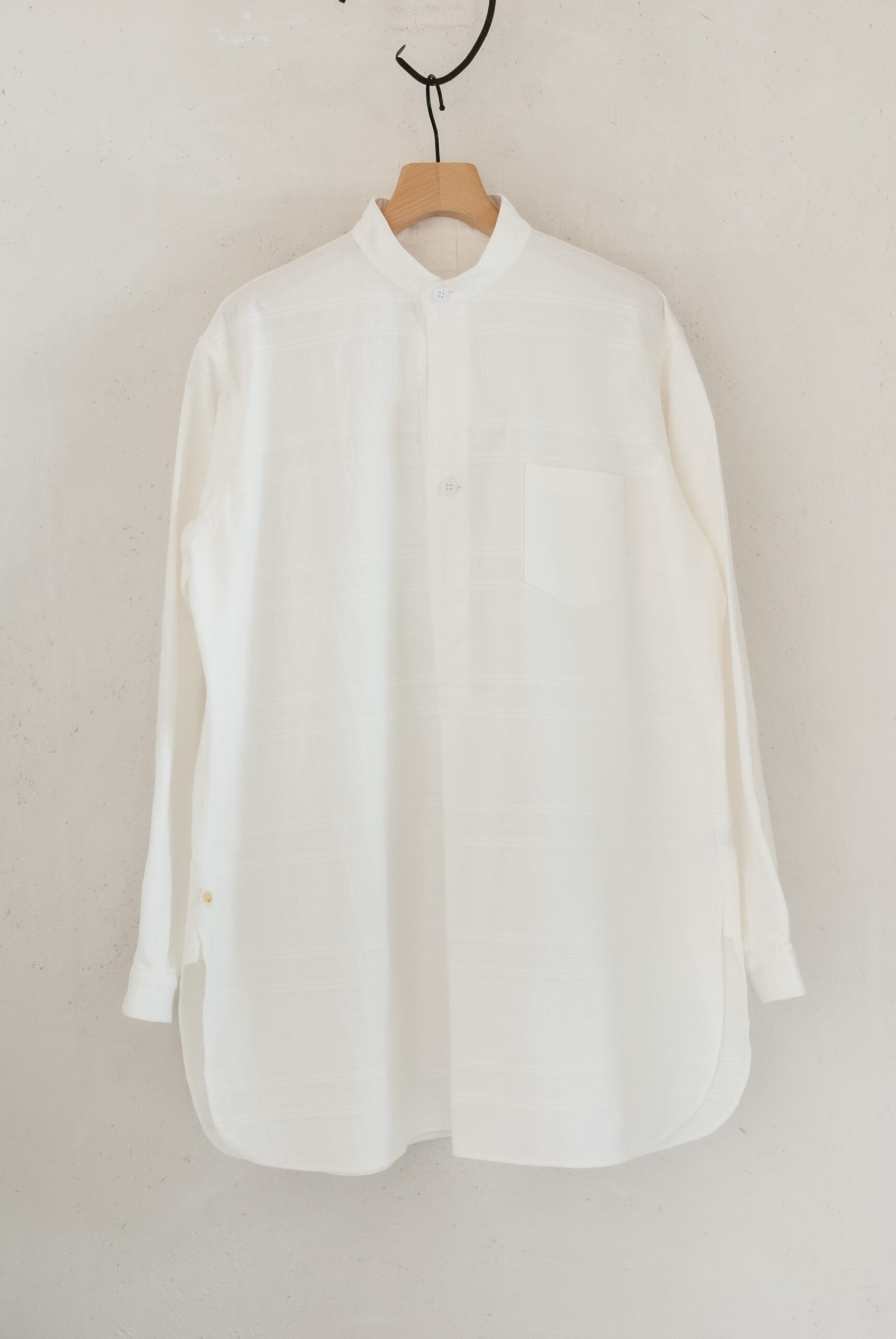 織り方で柄を出す、ドビー織りで表現されたリズミカルな生地は、暑い時期でも肌離れが良く、ゆったりとしたシルエットなので女性が着るとワンピースっぽく、男性が着るとグランパシャツのような感じで着て頂けます。