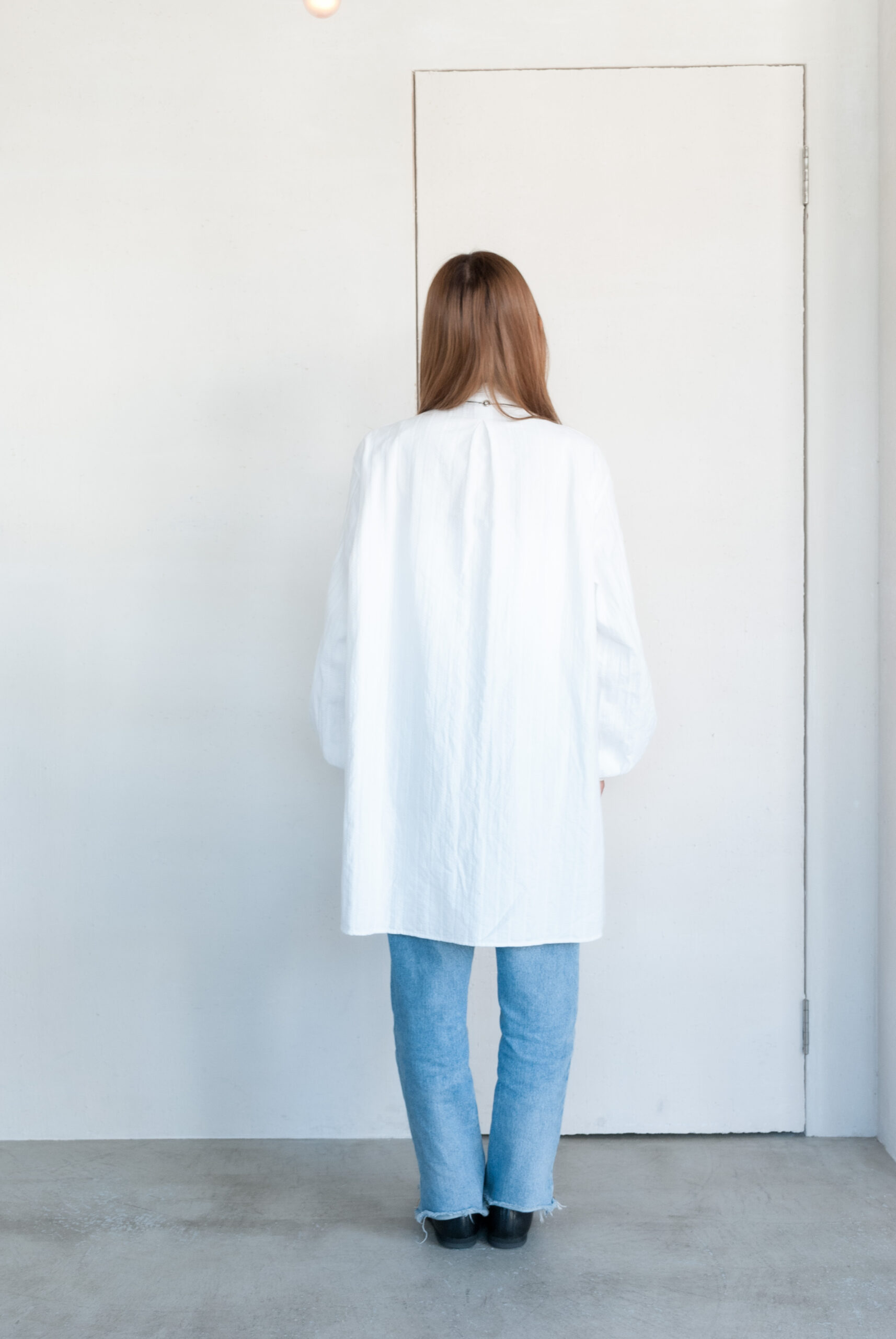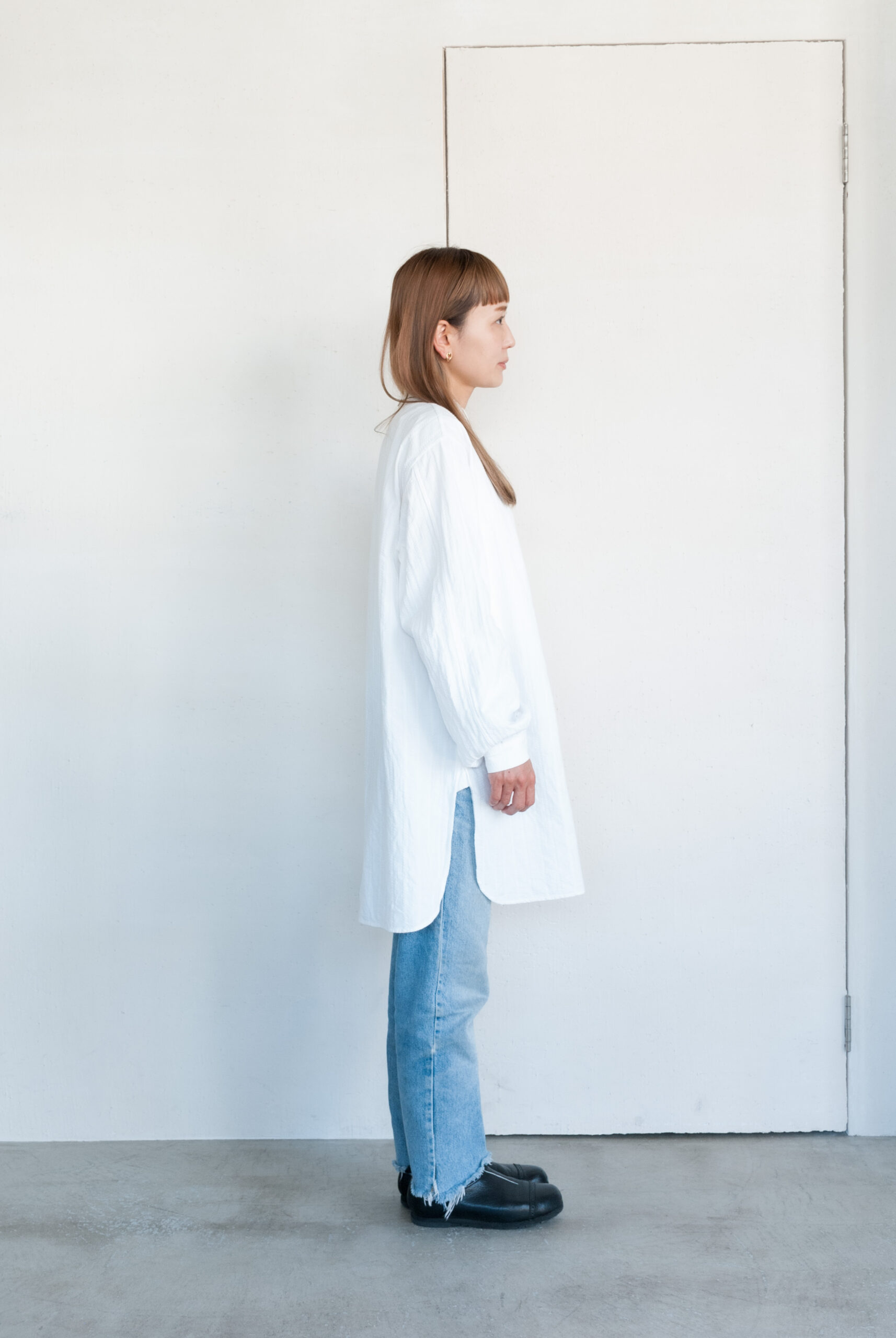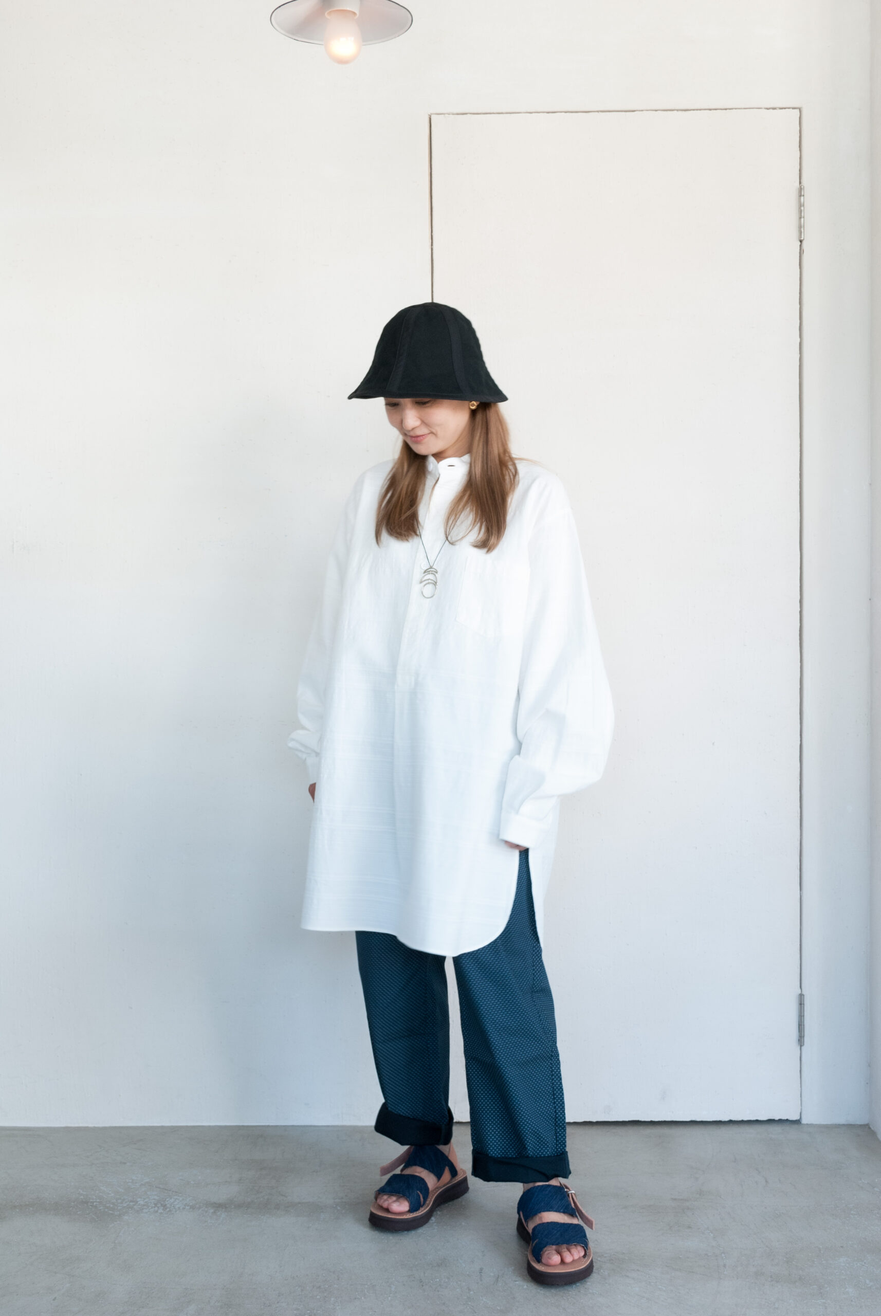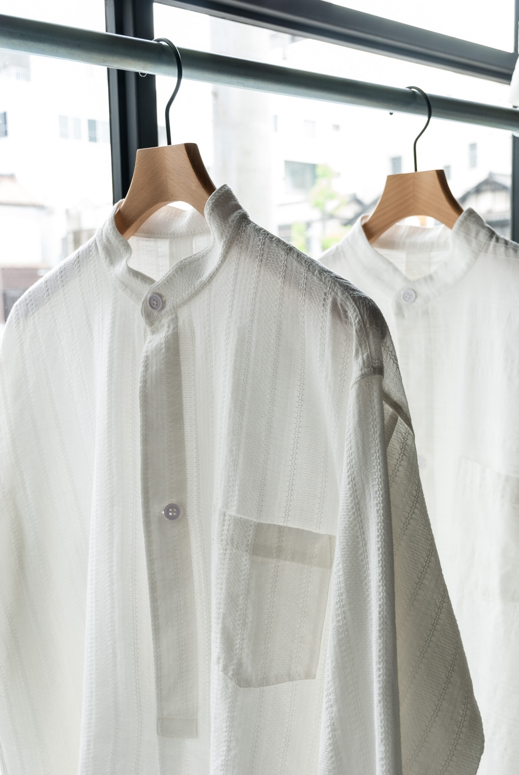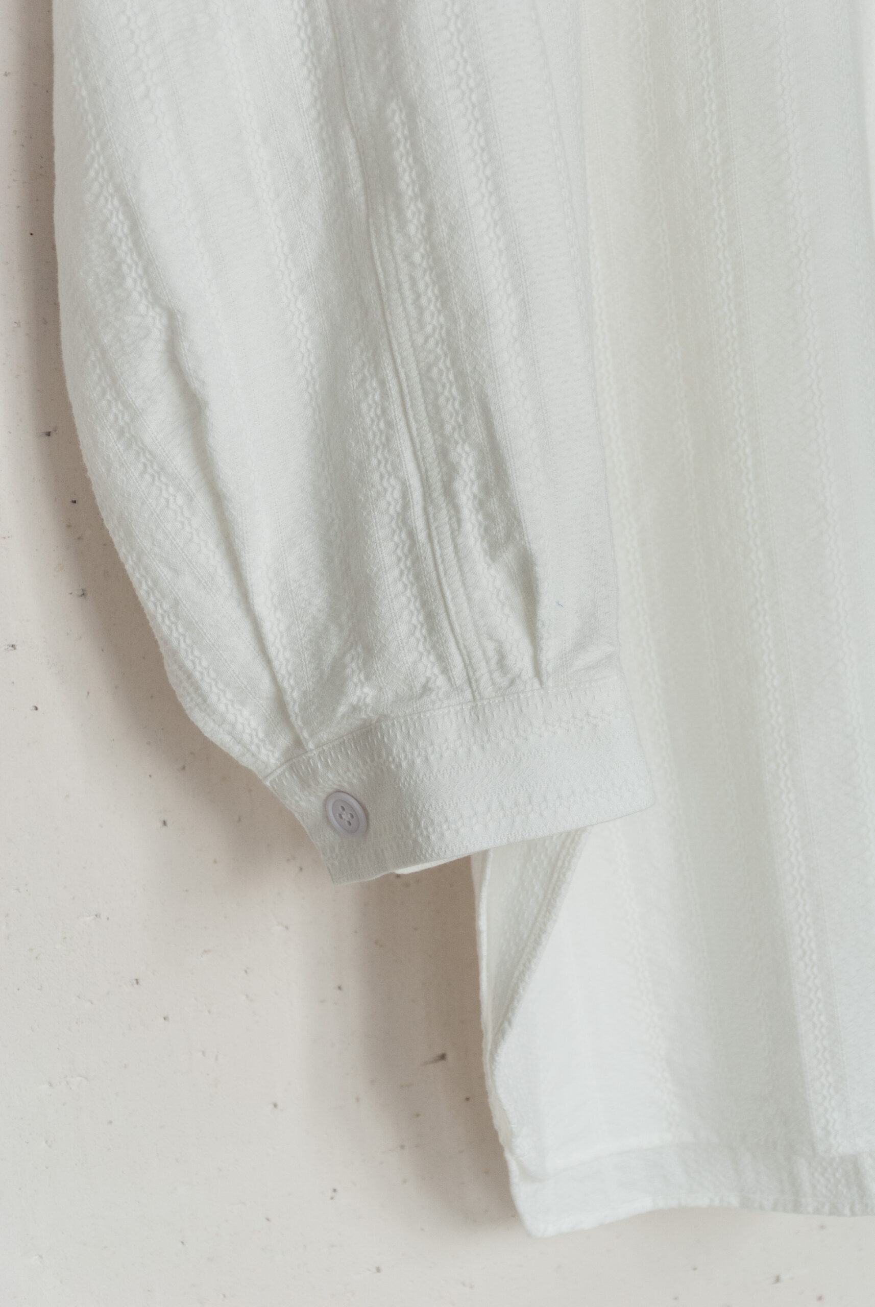 織り方で柄を出す、ドビー織りで表現されたリズミカルな生地は、暑い時期でも肌離れが良く、ゆったりとしたシルエットなので女性が着るとワンピースっぽく、男性が着るとグランパシャツのような感じで着て頂けます。