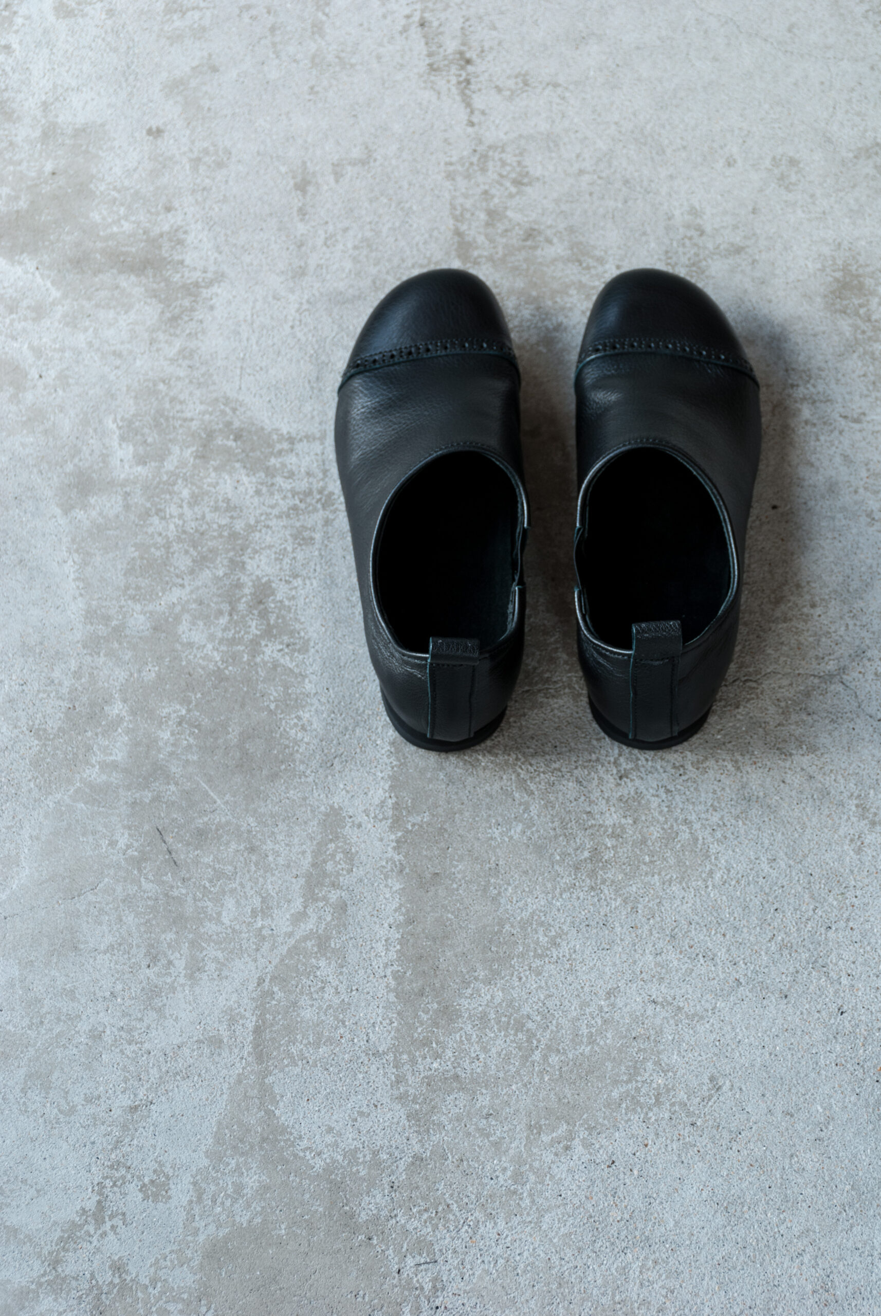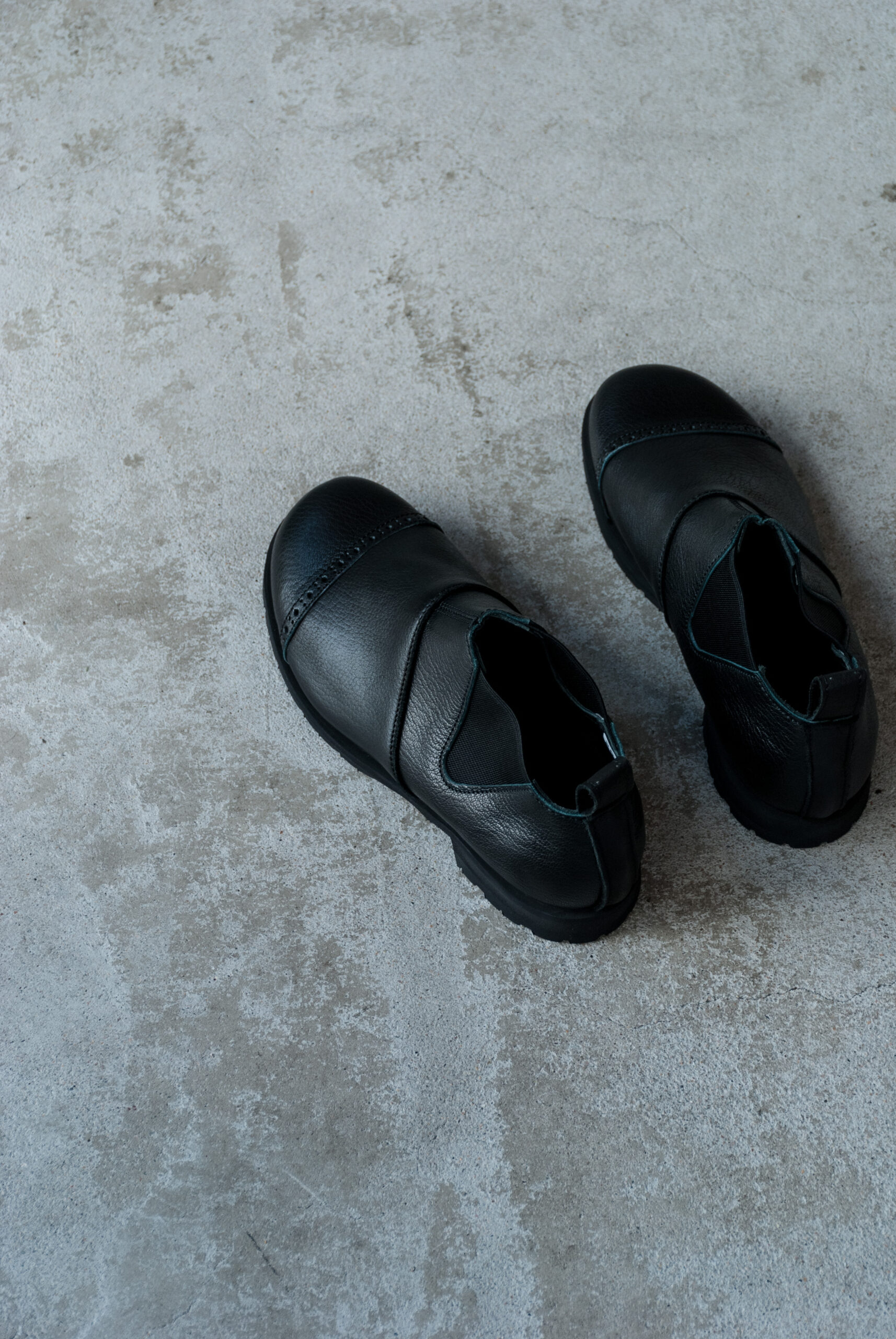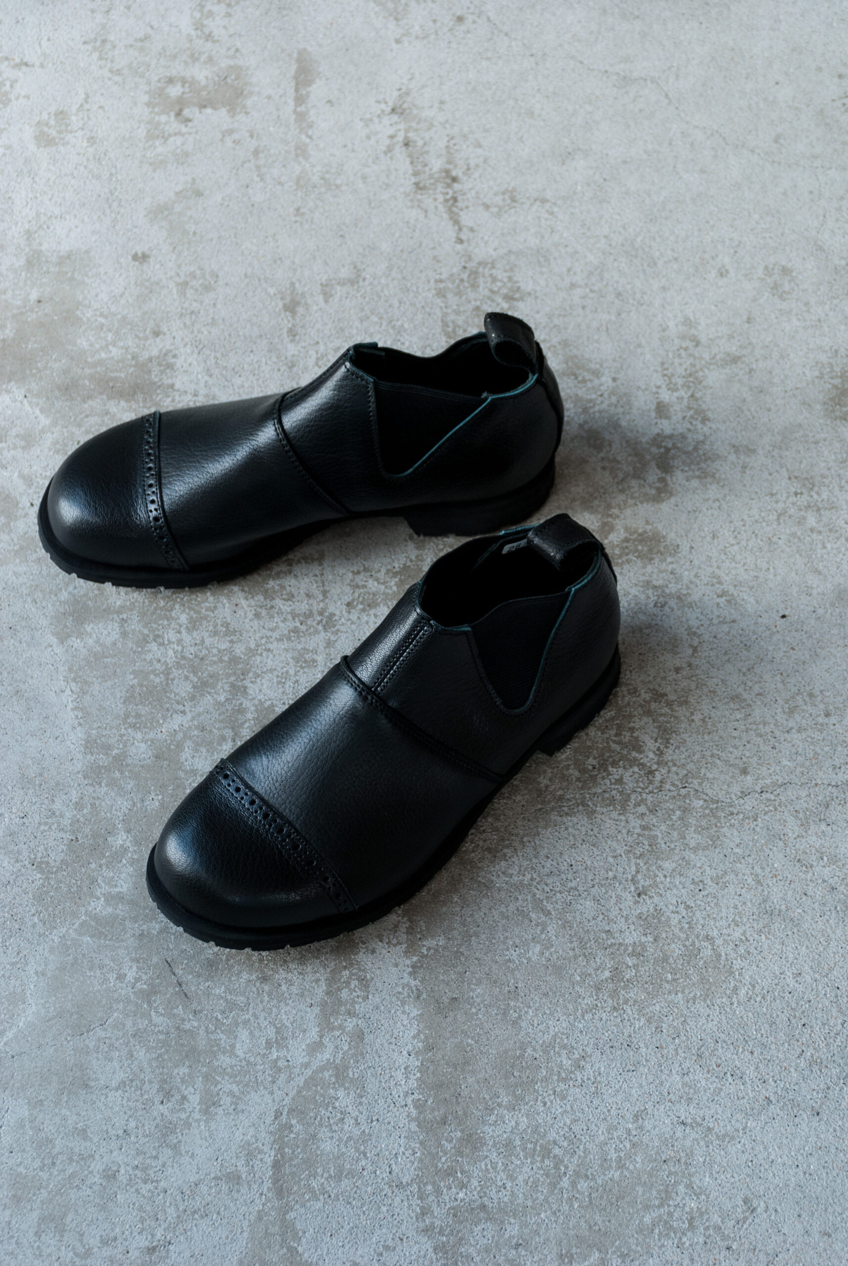 定番のスリッポン型ローカットCG-02をベースに、つま先を親子穴付きキャップトゥーに変更、革をシボ感のあるGOAT(山羊)にしたので、少々の傷は目立たないガンガン履ける靴になりました。