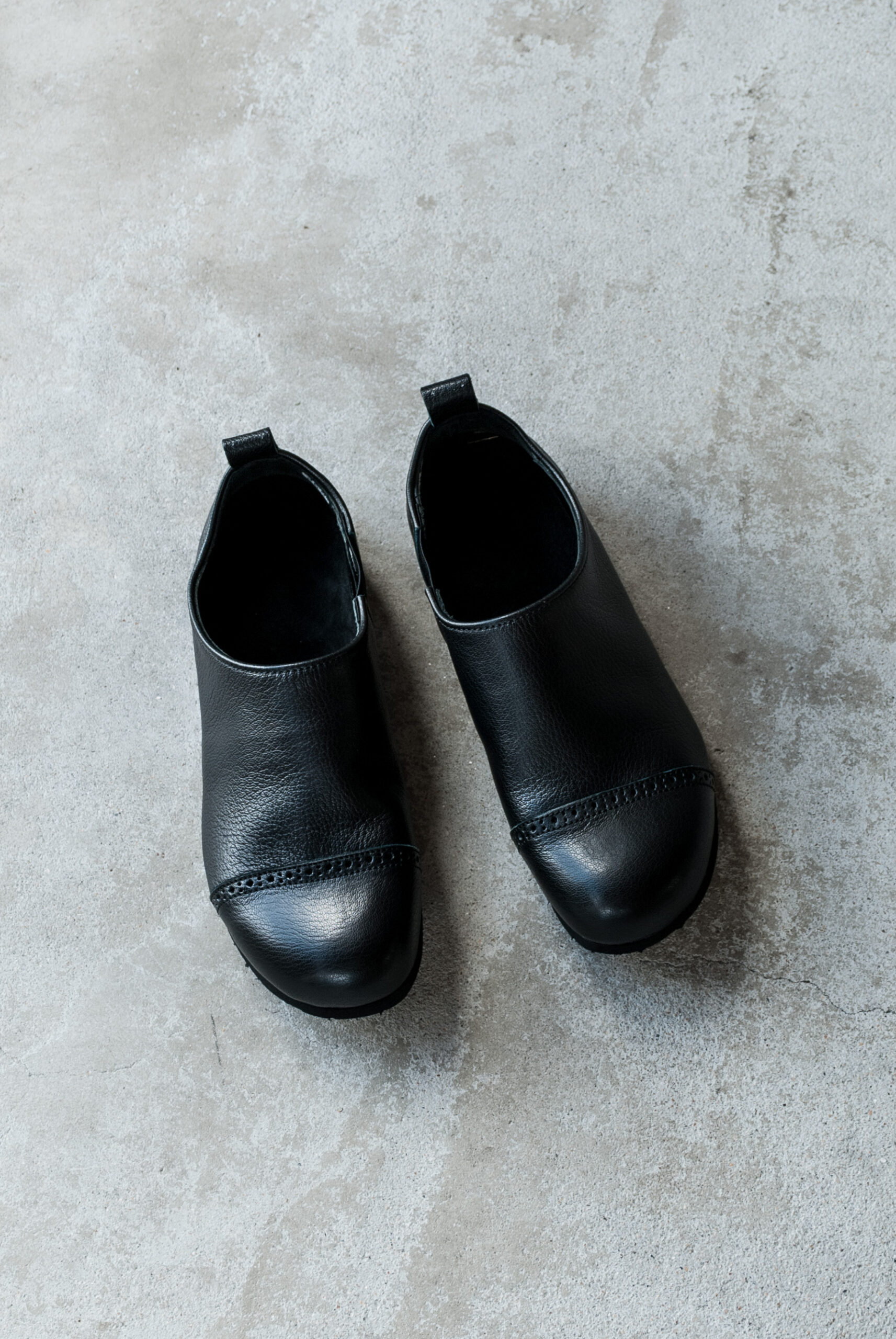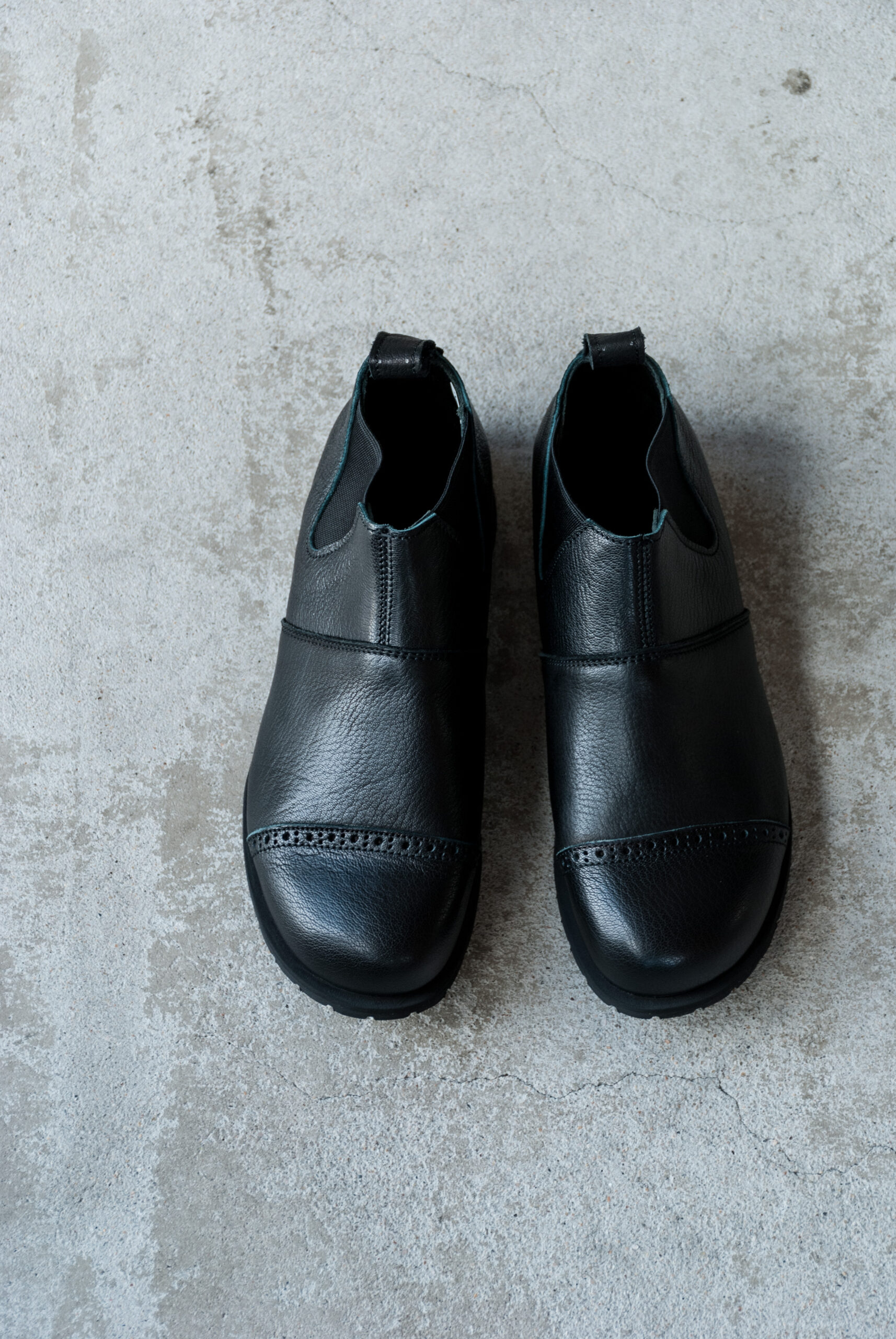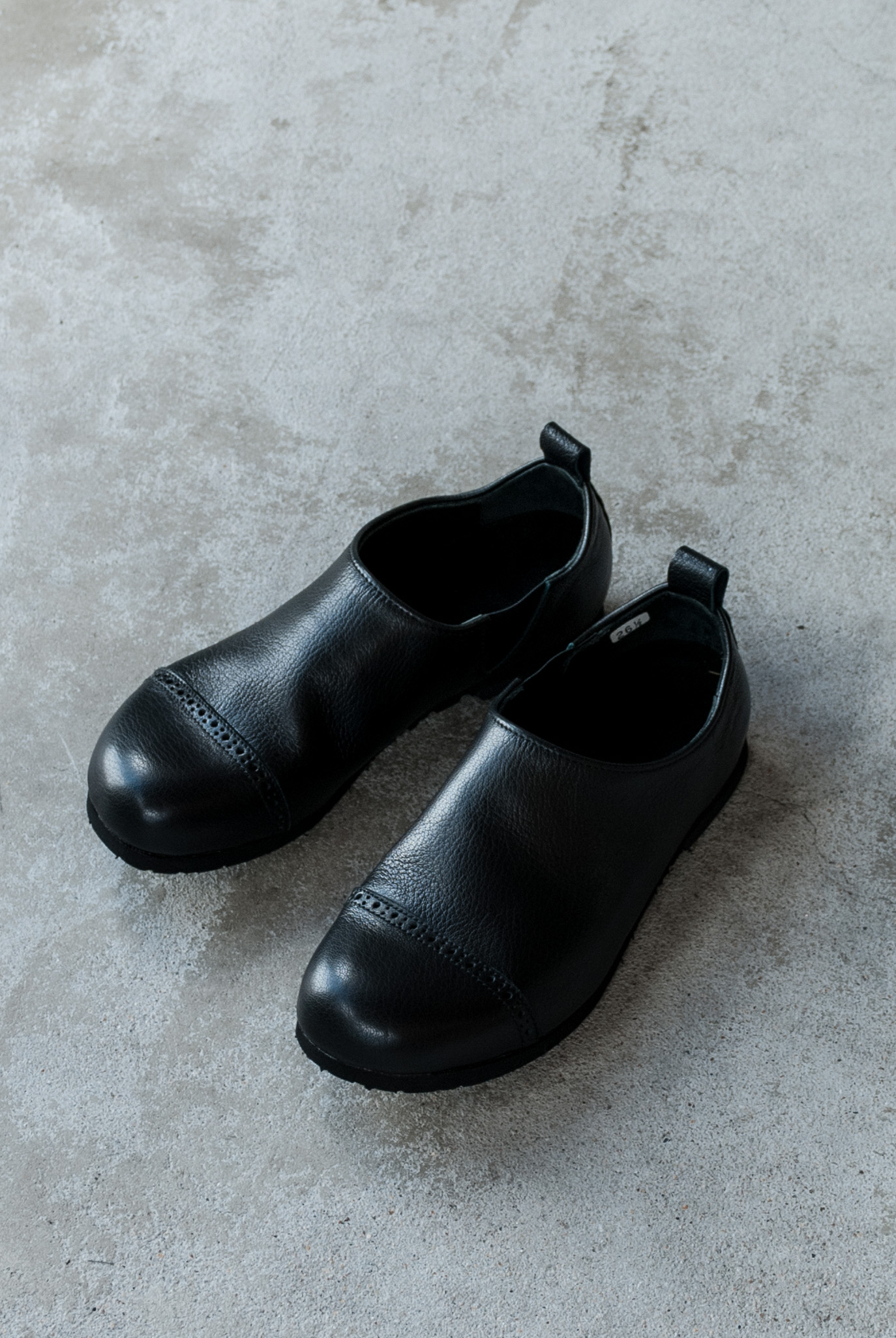 定番のスリッポン型ローカットCG-02をベースに、つま先を親子穴付きキャップトゥーに変更、革をシボ感のあるGOAT(山羊)にしたので、少々の傷は目立たないガンガン履ける靴になりました。