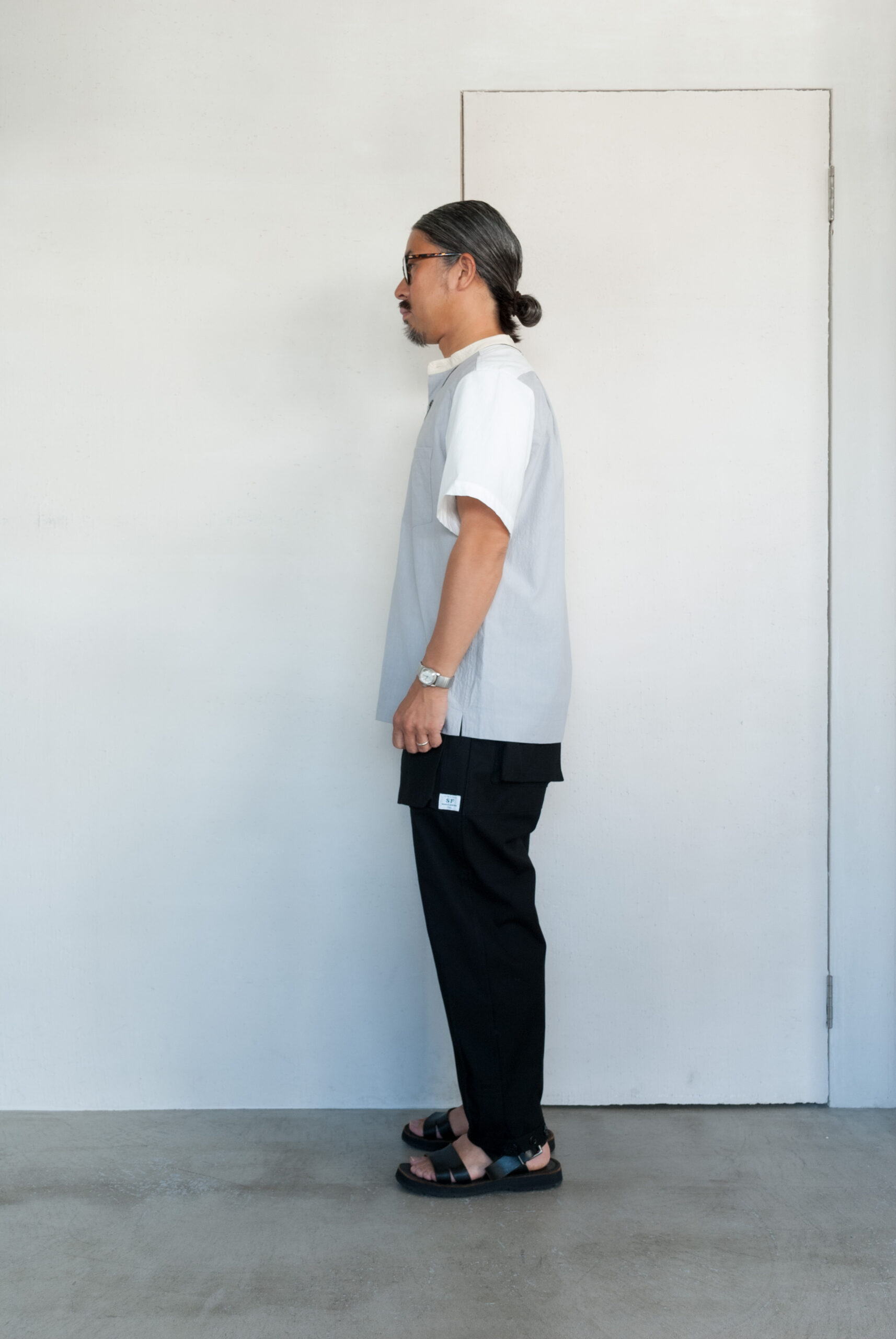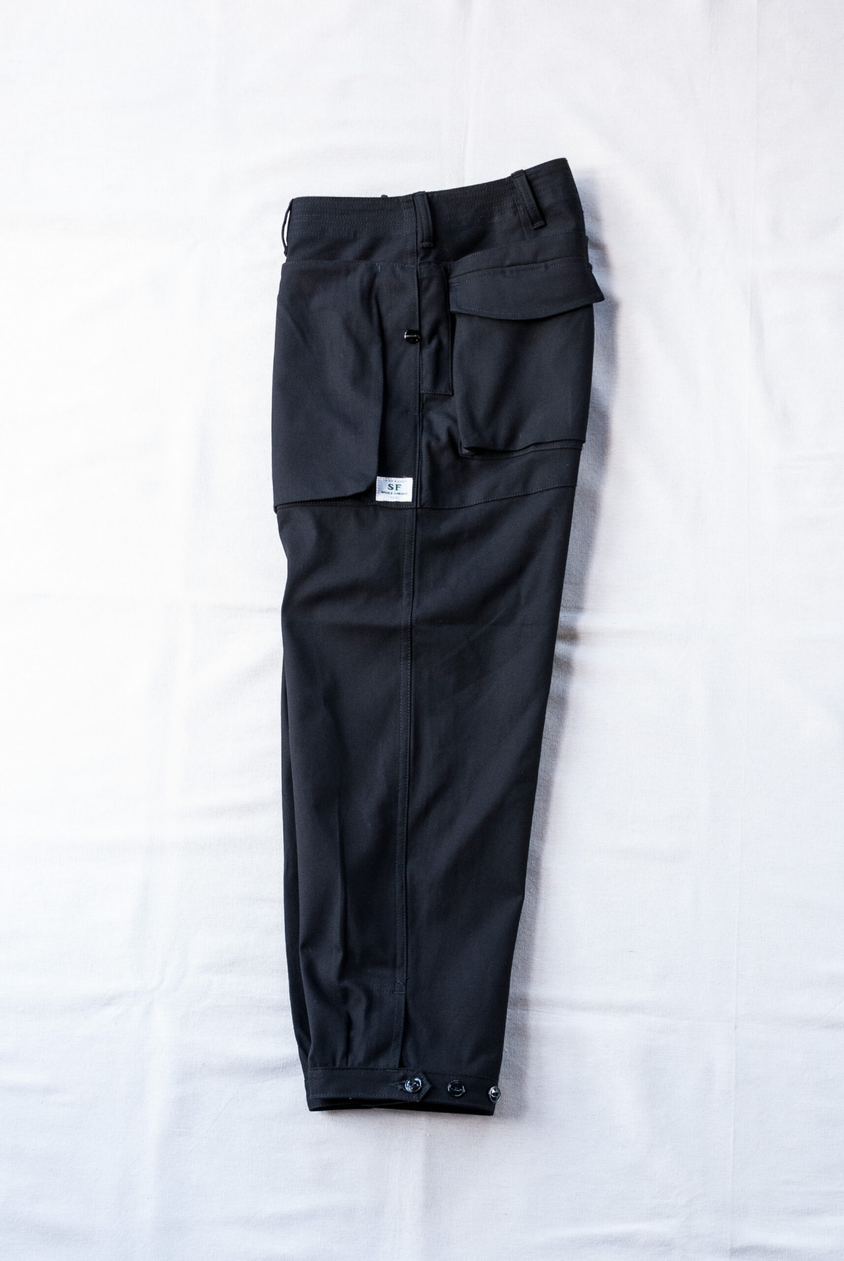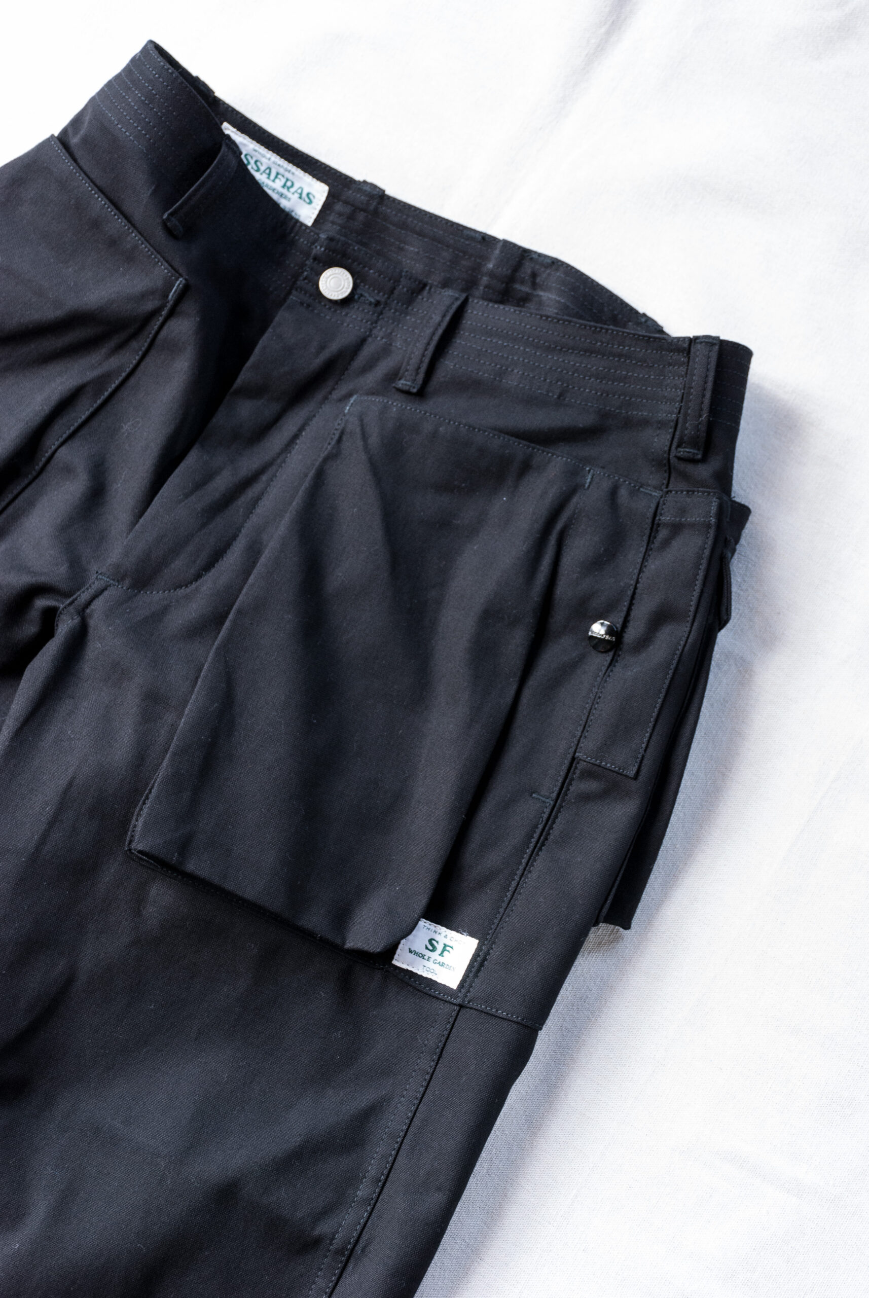 股にはササフラスお馴染みの180度開脚できるガゼットクロッチが付き、裾に設けられたボタン留めストラップによって、ワイドストレートから強烈なテーパードまで、3段階に調節可能。