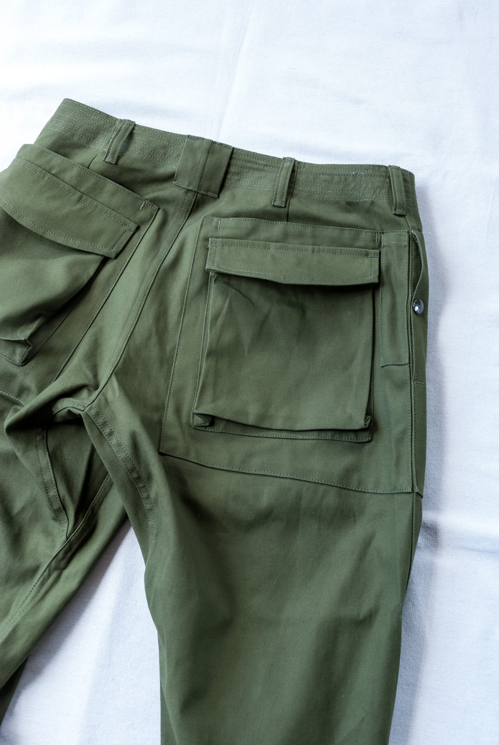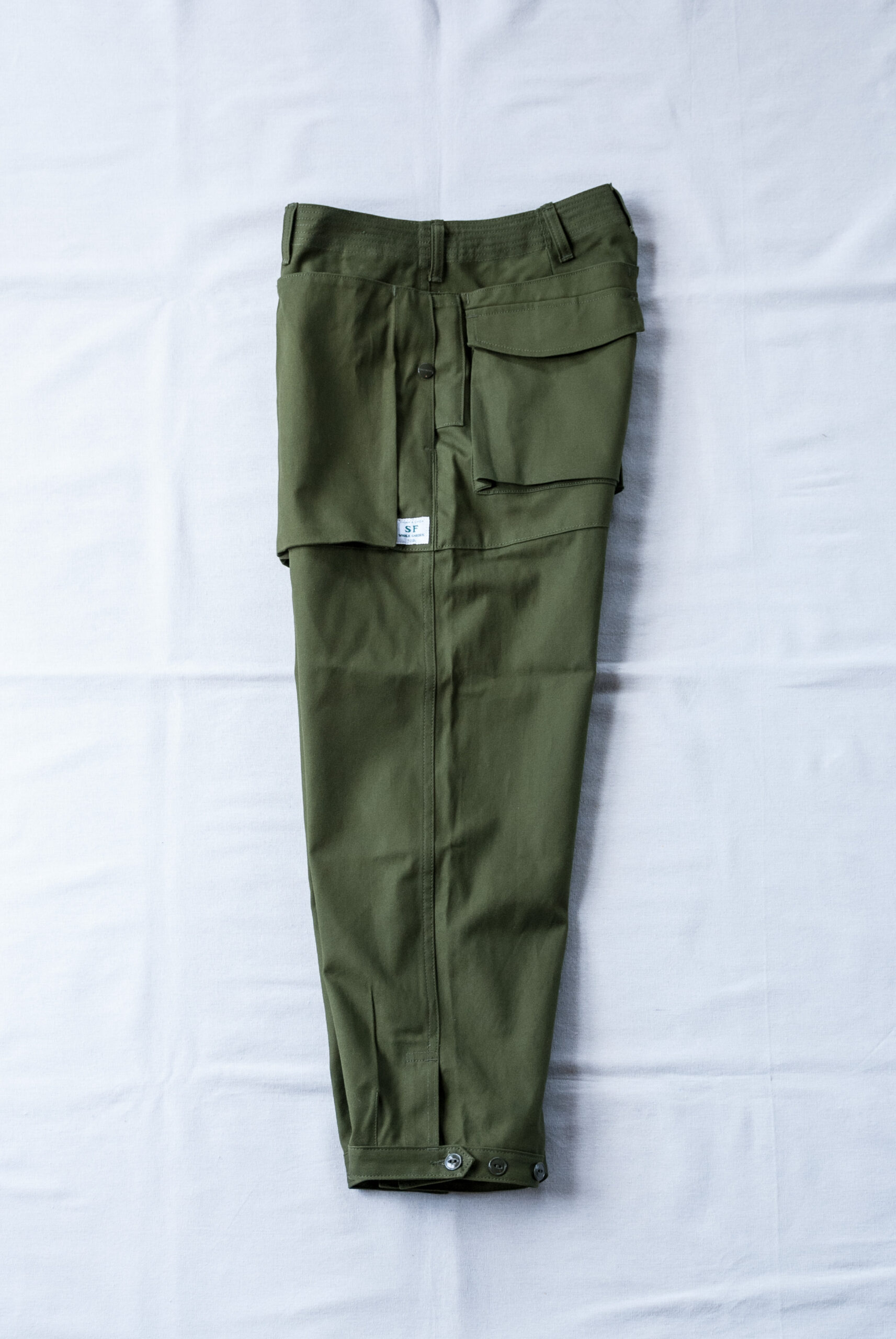 いろいろな要素を足して足して足しまくるのがササフラスですが、このパンツは米軍ヘリクルーパンツと、クライミングウエアのグラミチ(昔の)を足して、2で割らずに、仕上がりの丈感がパラシュート部隊のパンツっぽいなという、ササフラスらしいディテール満載のパンツです。
