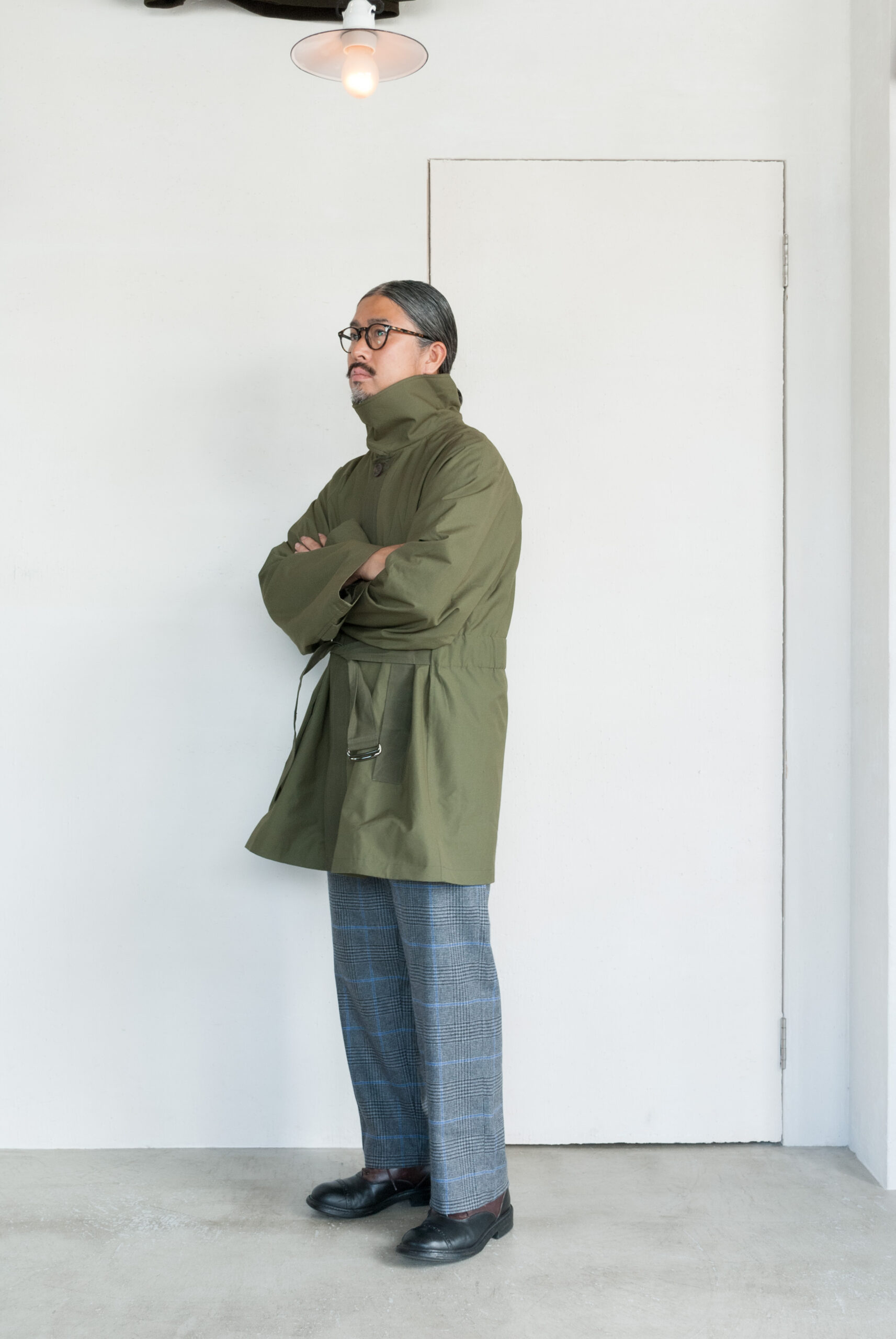 シャリっとしたマットな生地感と落ち着いた品のある色、飽きのこない汎用性の高いコートに仕上がっています。が、さらっと終わらないのがQUILP。