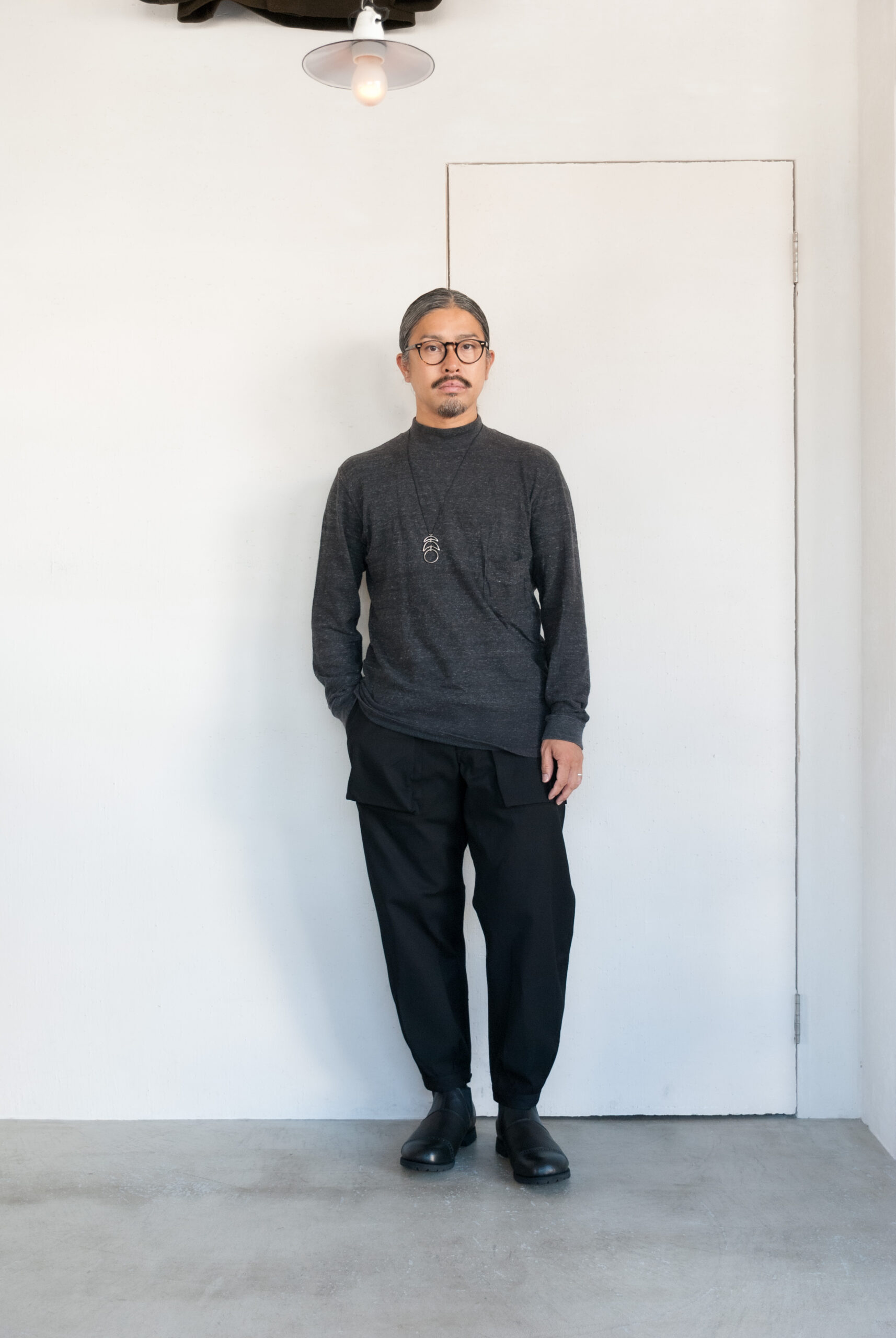 今季から出たとかではなく定番商品なので、フィルメランジェを知ってる人にはお馴染みの形ですが、何か今年はネックの高いものが気になって、CABOTというSWEATも、フードではなくハイネックの形だったりと、首元のニュアンスを変えてくれるアイテムが今季のお勧めです。