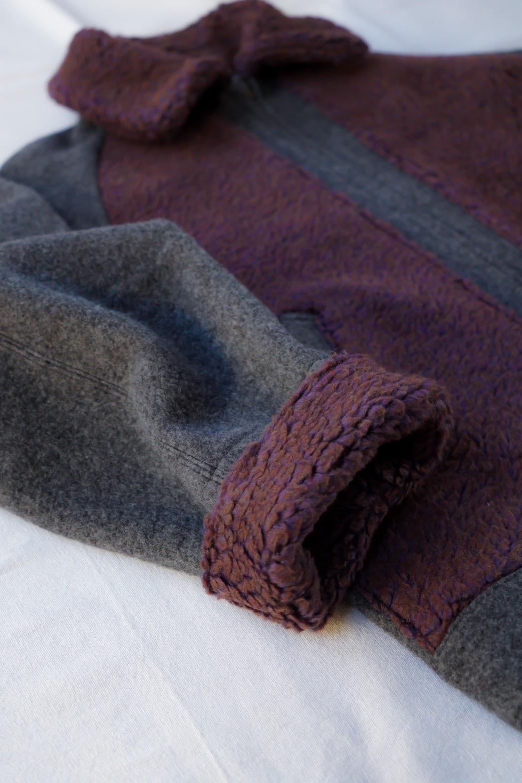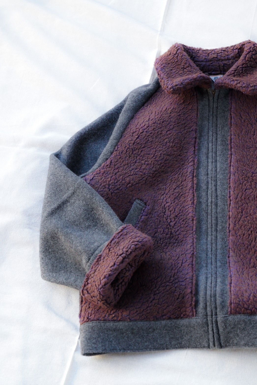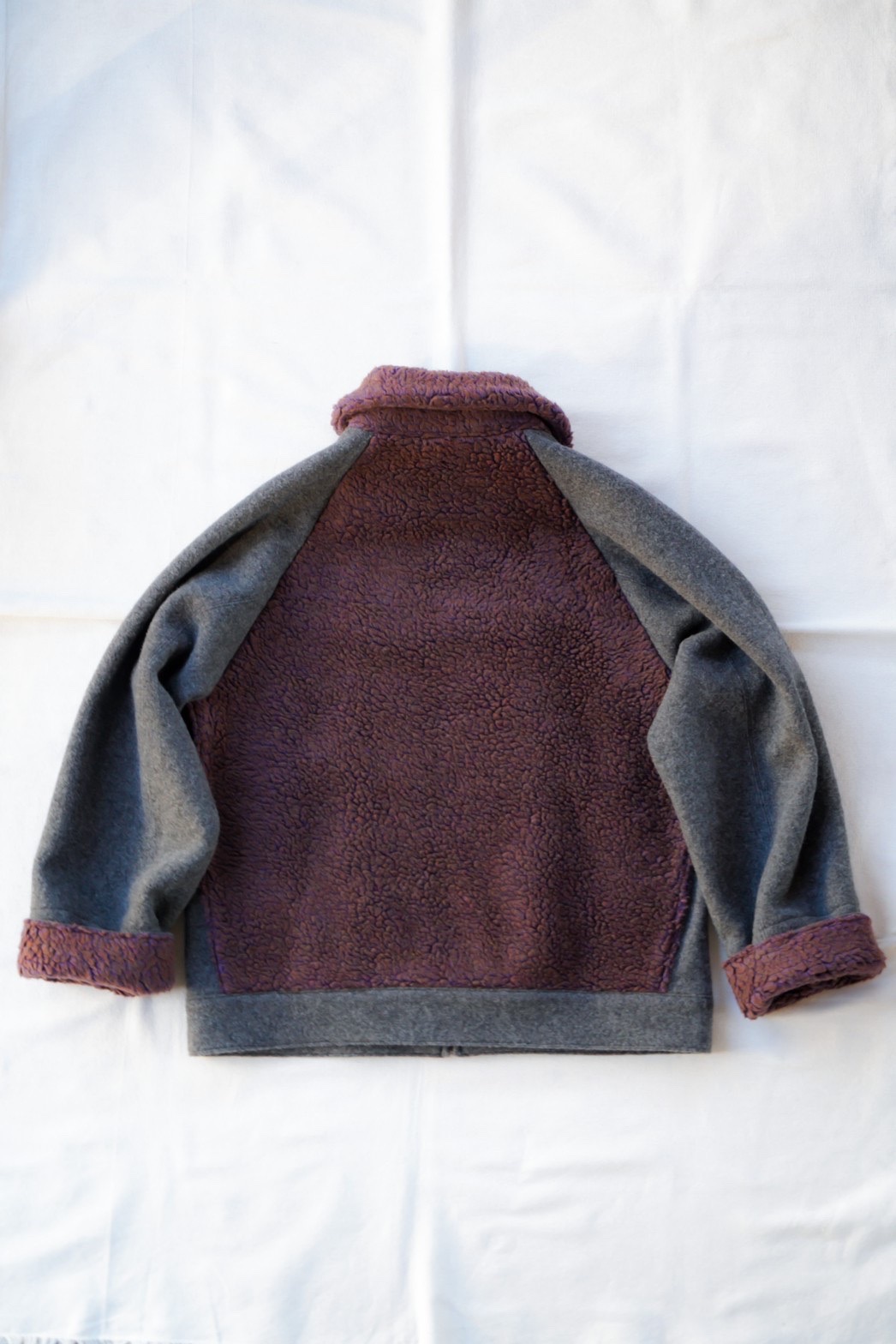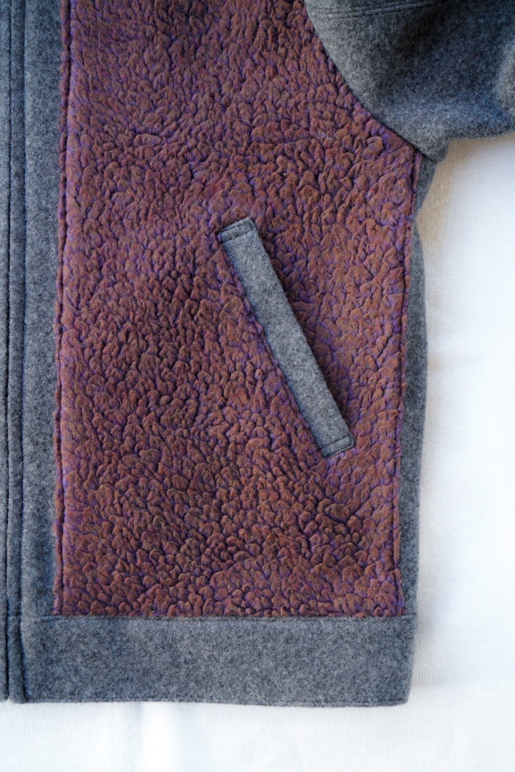 ムートンの部分には、1950〜60年代の古い編み機でゆっくり時間をかけて編み上げたフィルメランジェオリジナルの毛足の長いボアを配置することによって、熊ジャンの見た目とオリジナルではあり得ない軽さと着心地を達成しました。