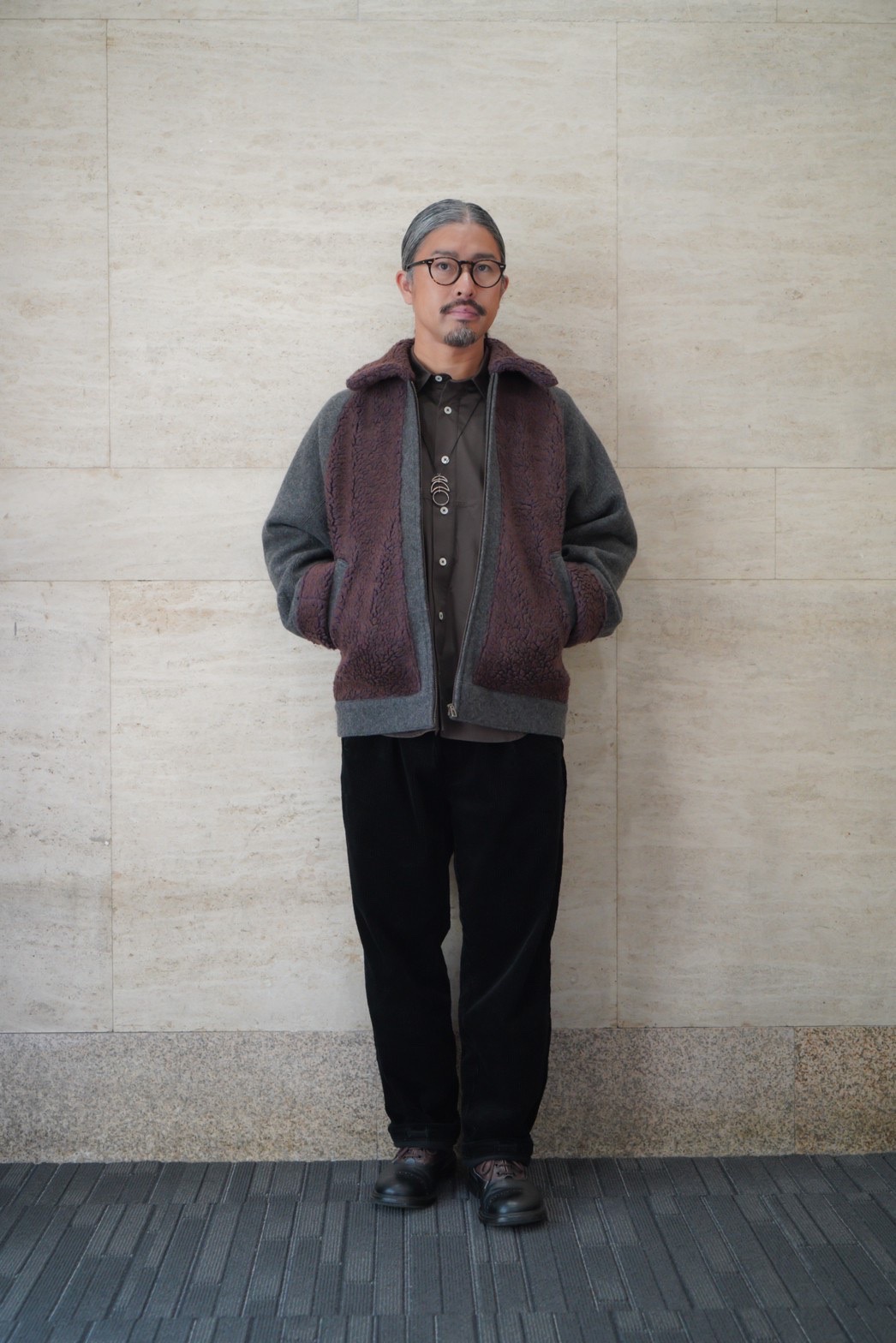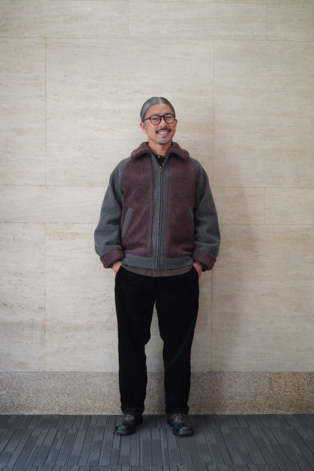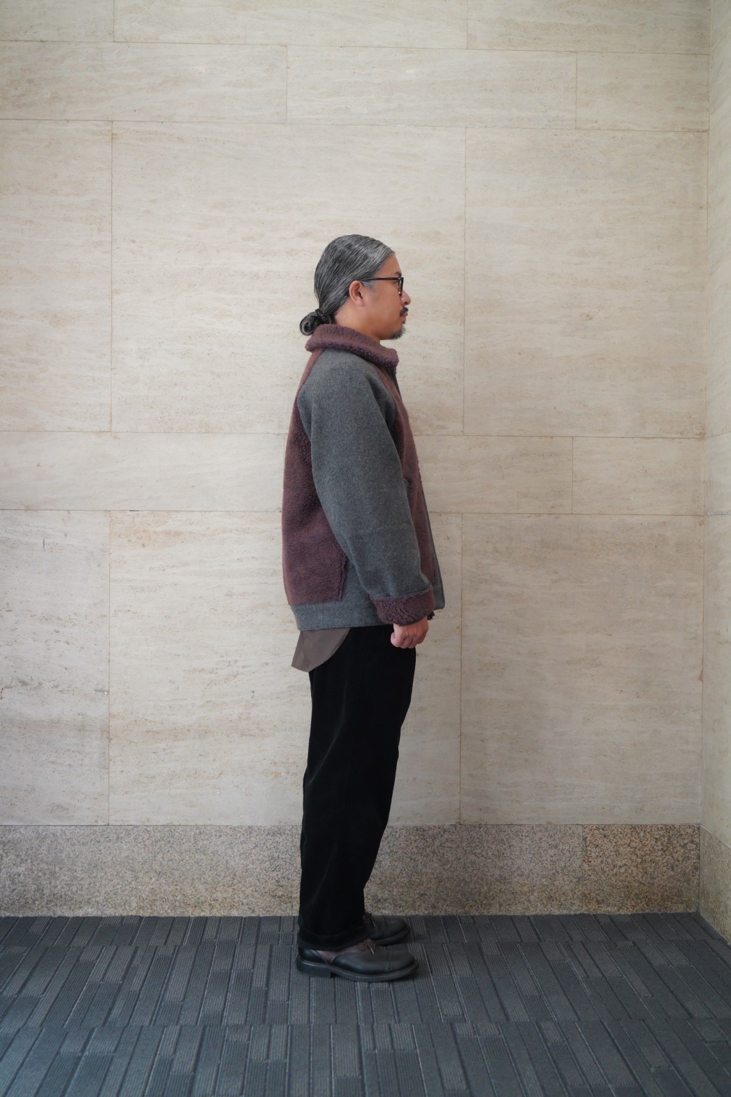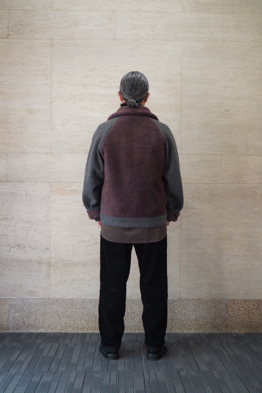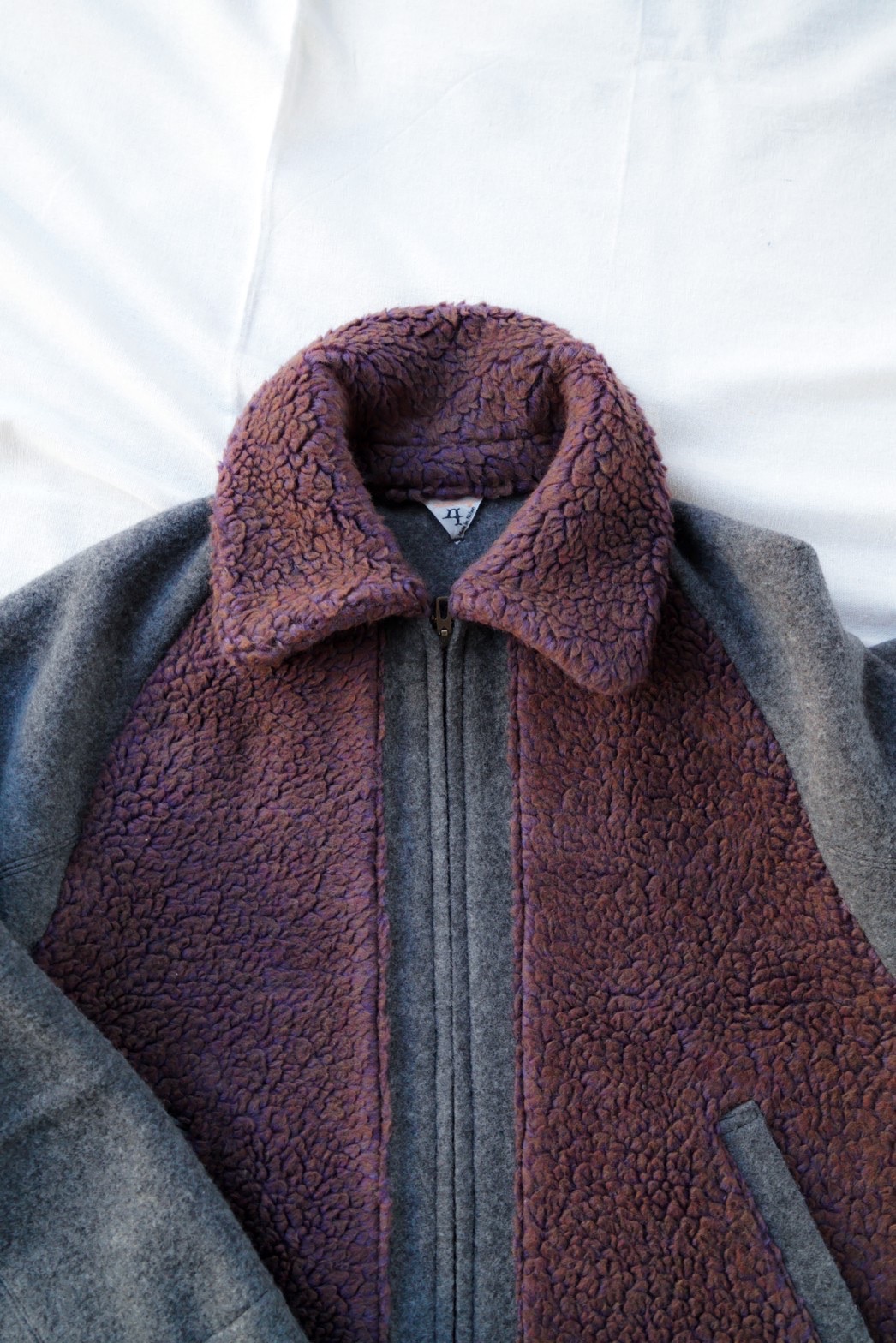 ムートンの部分には、1950〜60年代の古い編み機でゆっくり時間をかけて編み上げたフィルメランジェオリジナルの毛足の長いボアを配置することによって、熊ジャンの見た目とオリジナルではあり得ない軽さと着心地を達成しました。