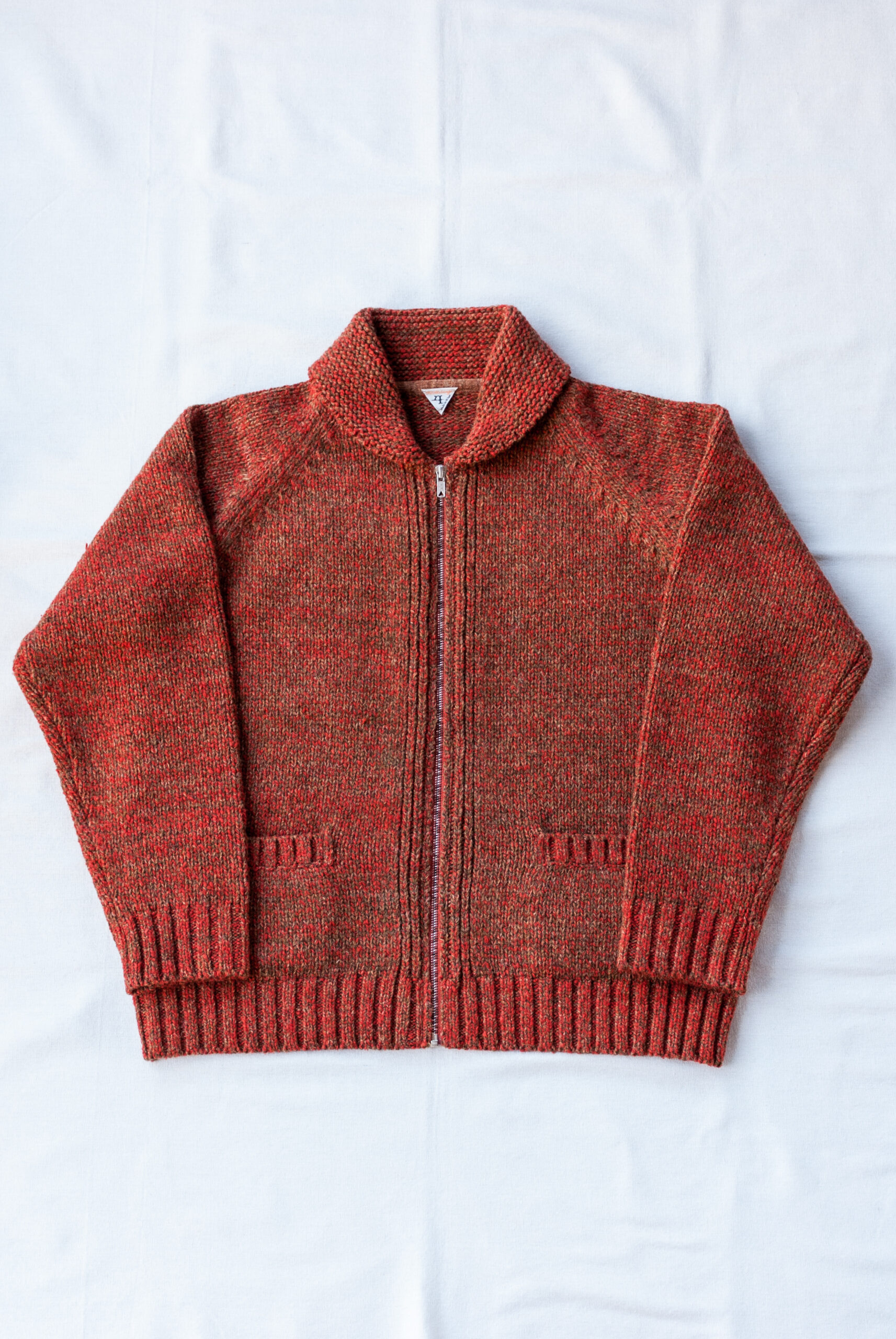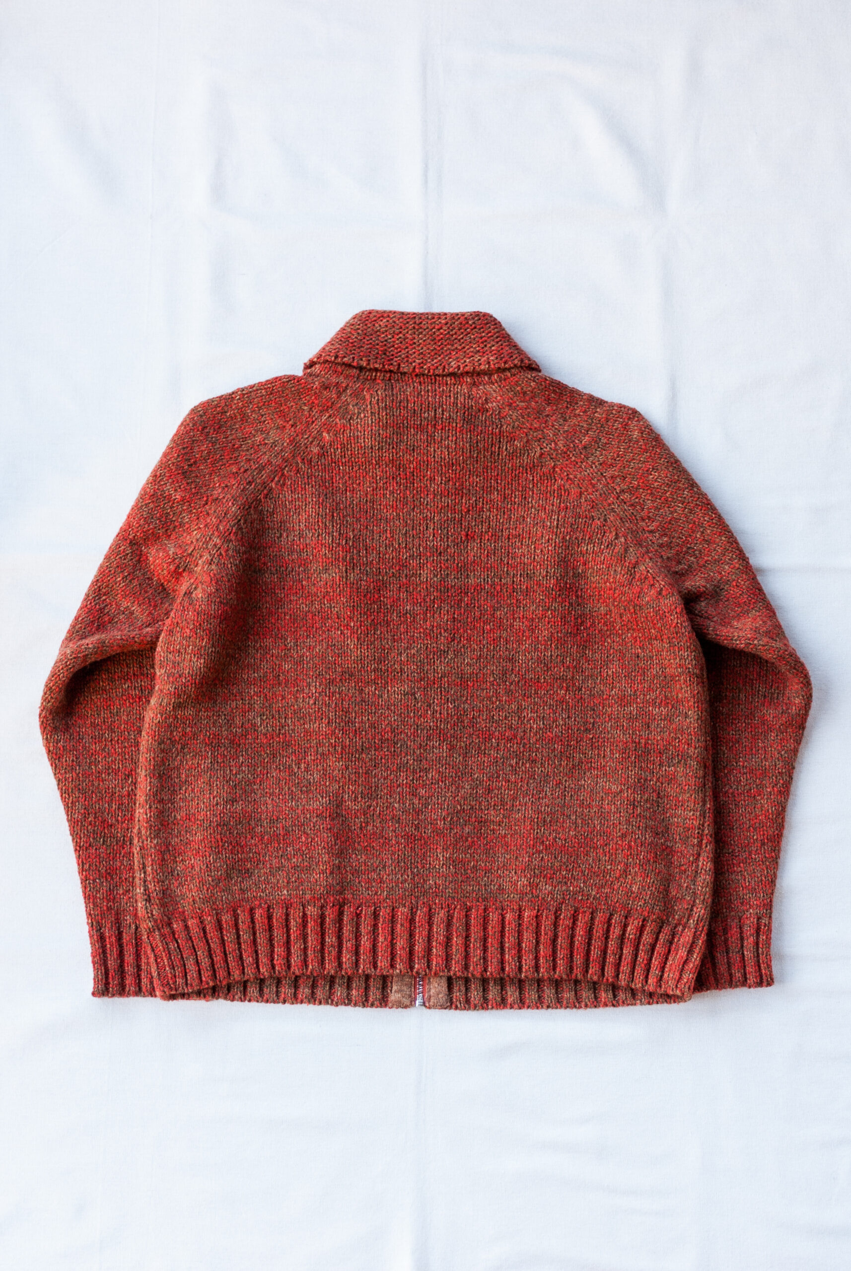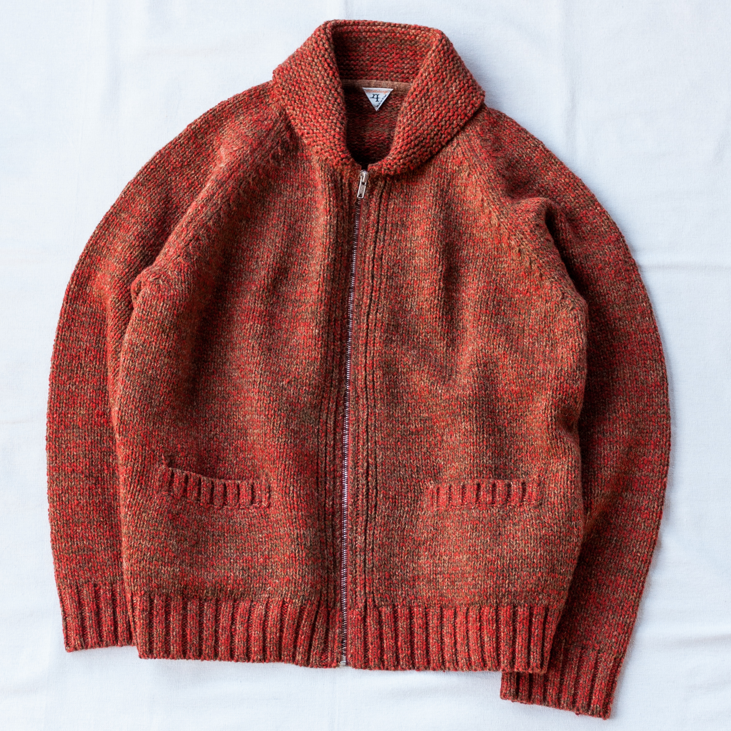 オリジナルのメランジジッパー(ジッパーの歯の色が杢のように変えてある)と、柔らかい印象のショールカラー、ポケット二つのシンプルなディテール配置ですが、フィットもゆる過ぎず着丈のバランスもいいので、とっても着やすい合わせやすい。