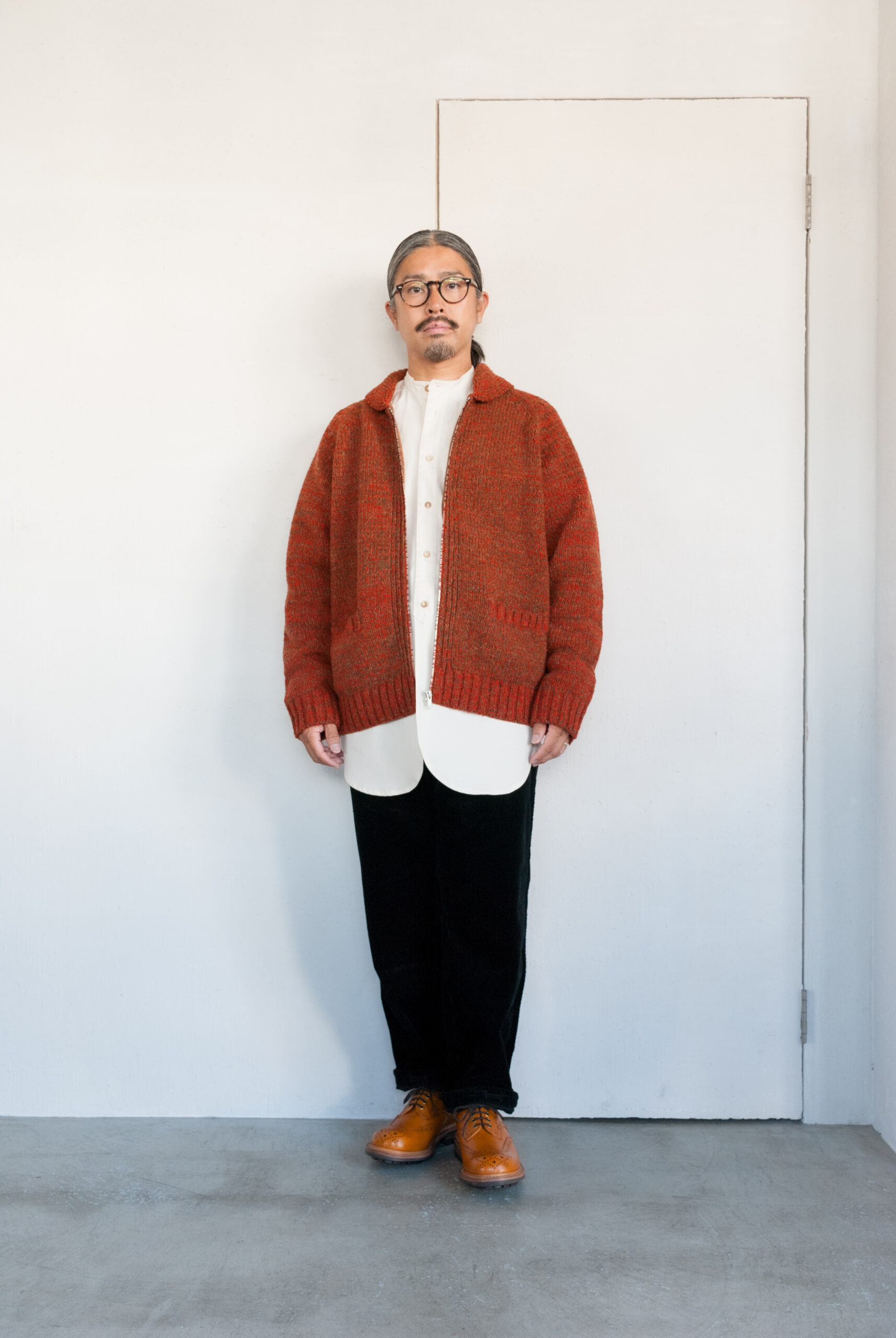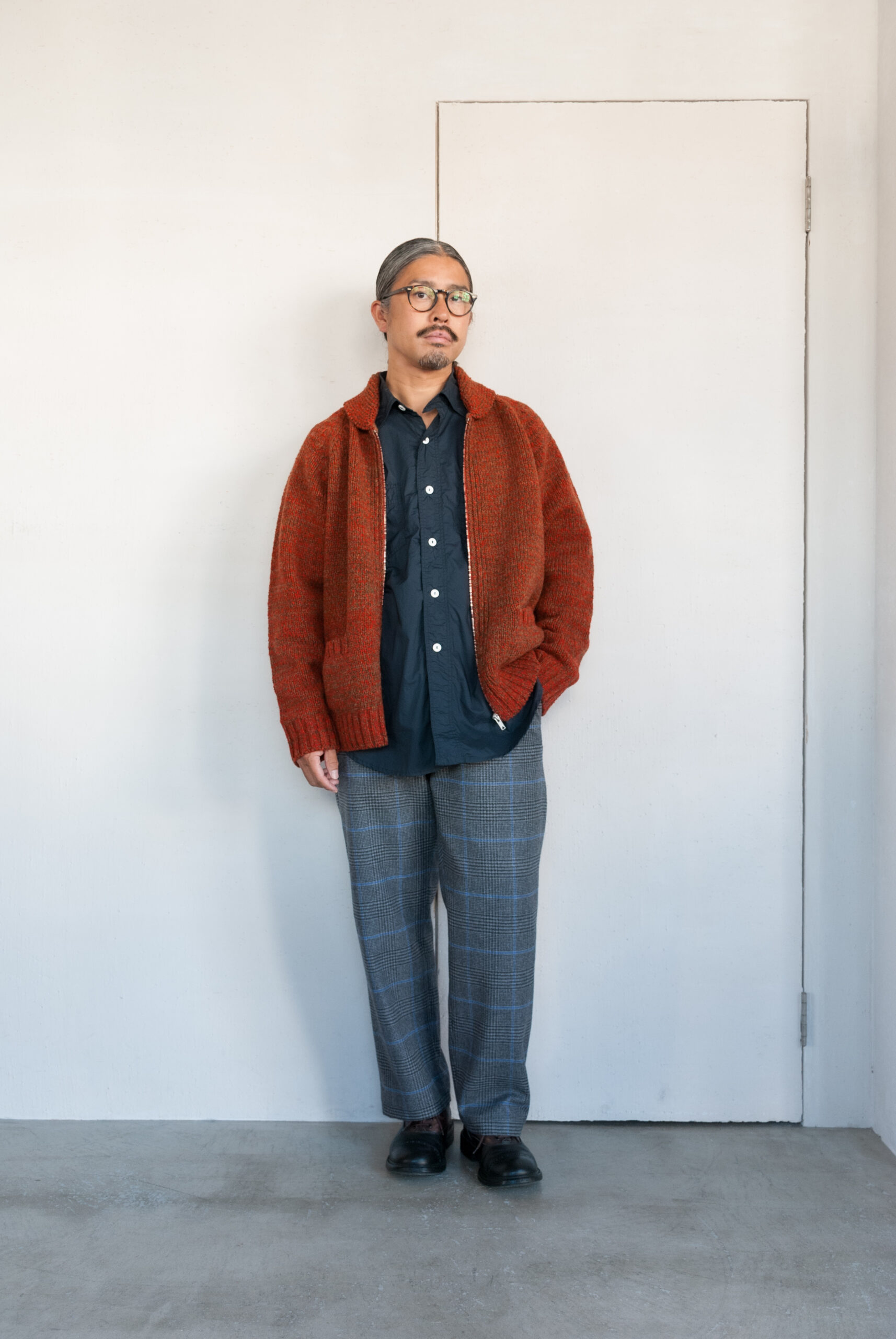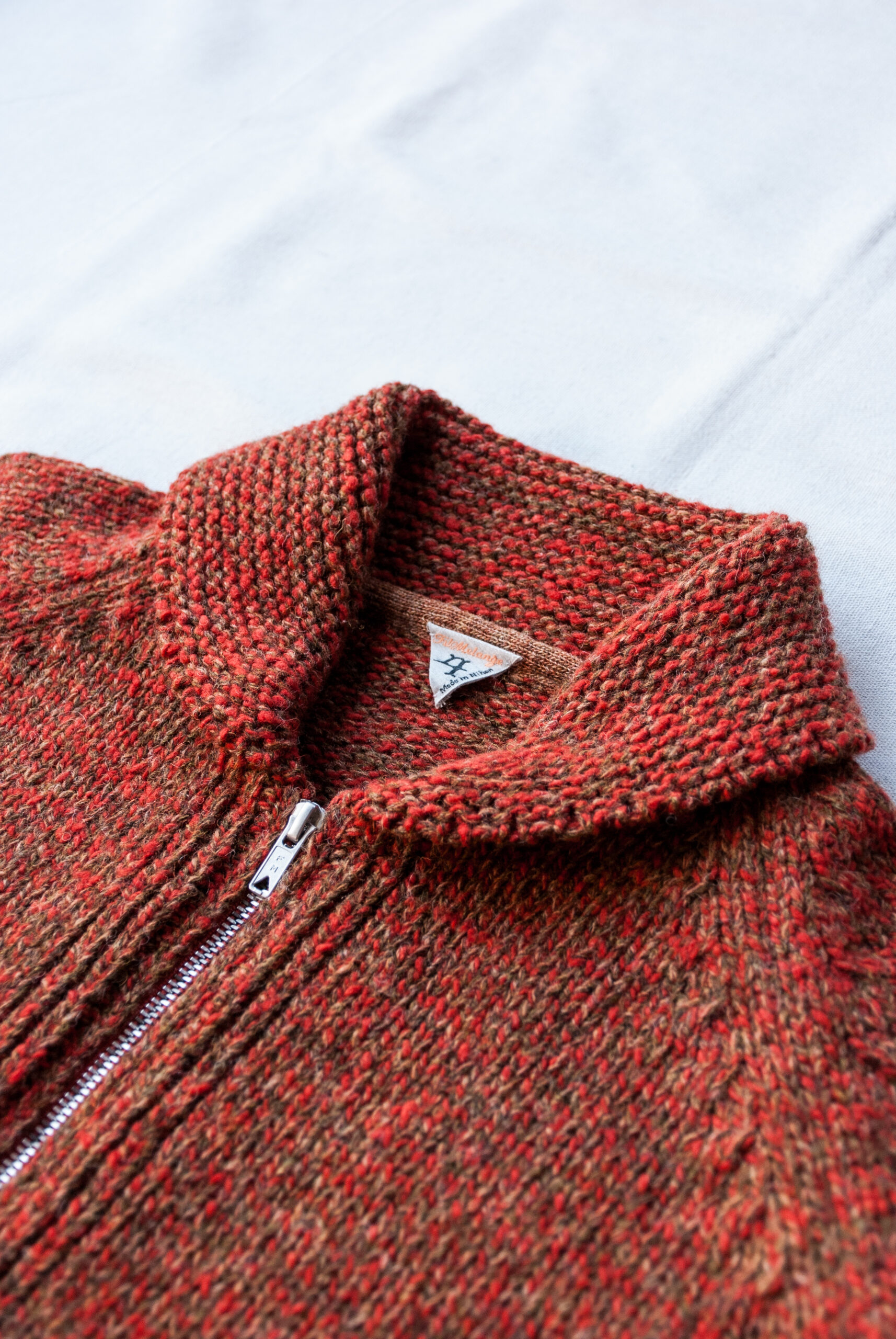 オリジナルのメランジジッパー(ジッパーの歯の色が杢のように変えてある)と、柔らかい印象のショールカラー、ポケット二つのシンプルなディテール配置ですが、フィットもゆる過ぎず着丈のバランスもいいので、とっても着やすい合わせやすい。