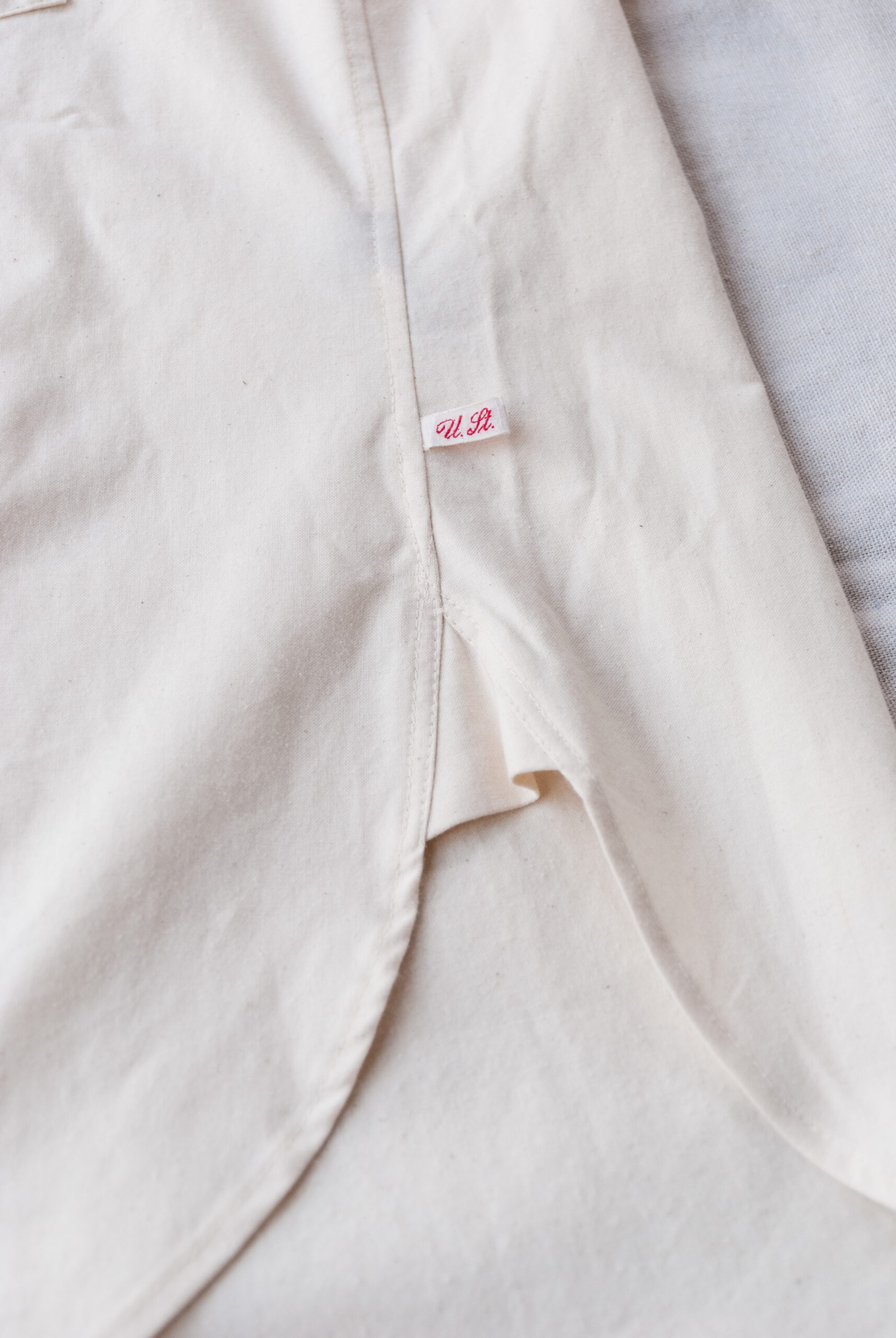 軍用のシーツは通常のシーツよりも幅が狭く作られている為、一枚のシーツからほぼ一枚のシャツしか作れないそうです。
