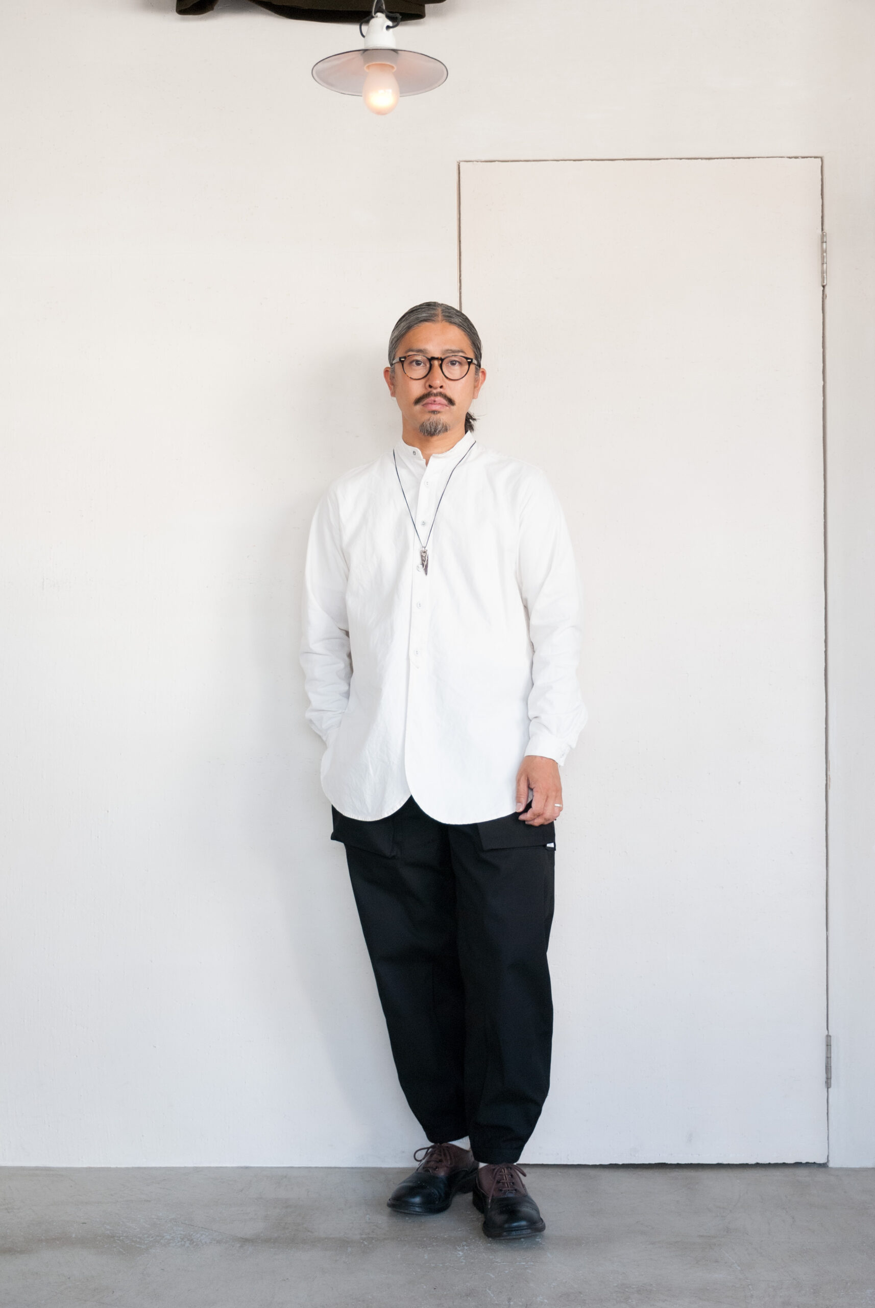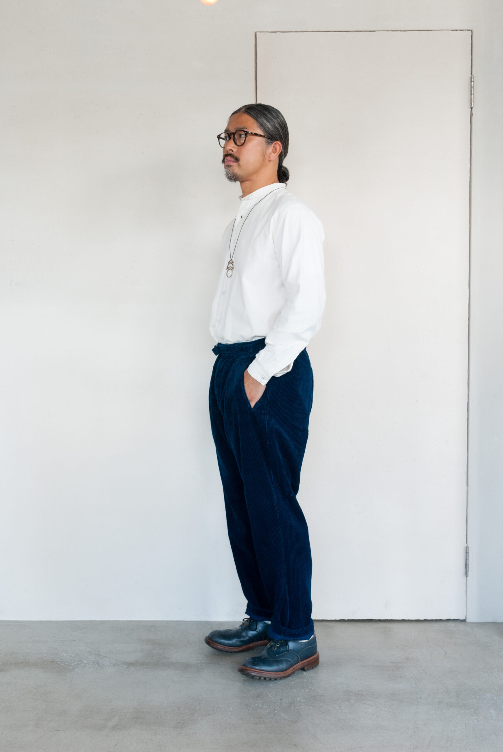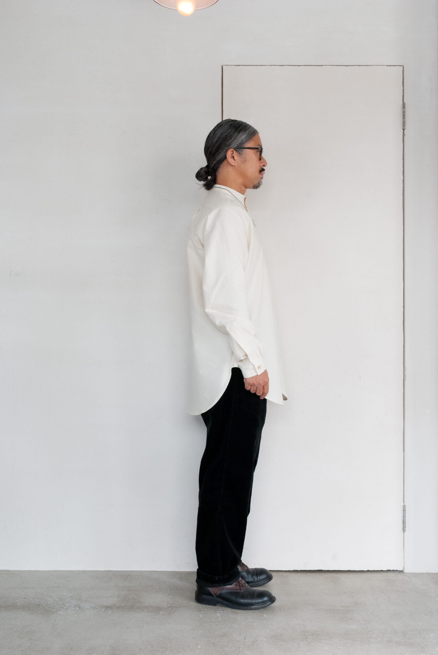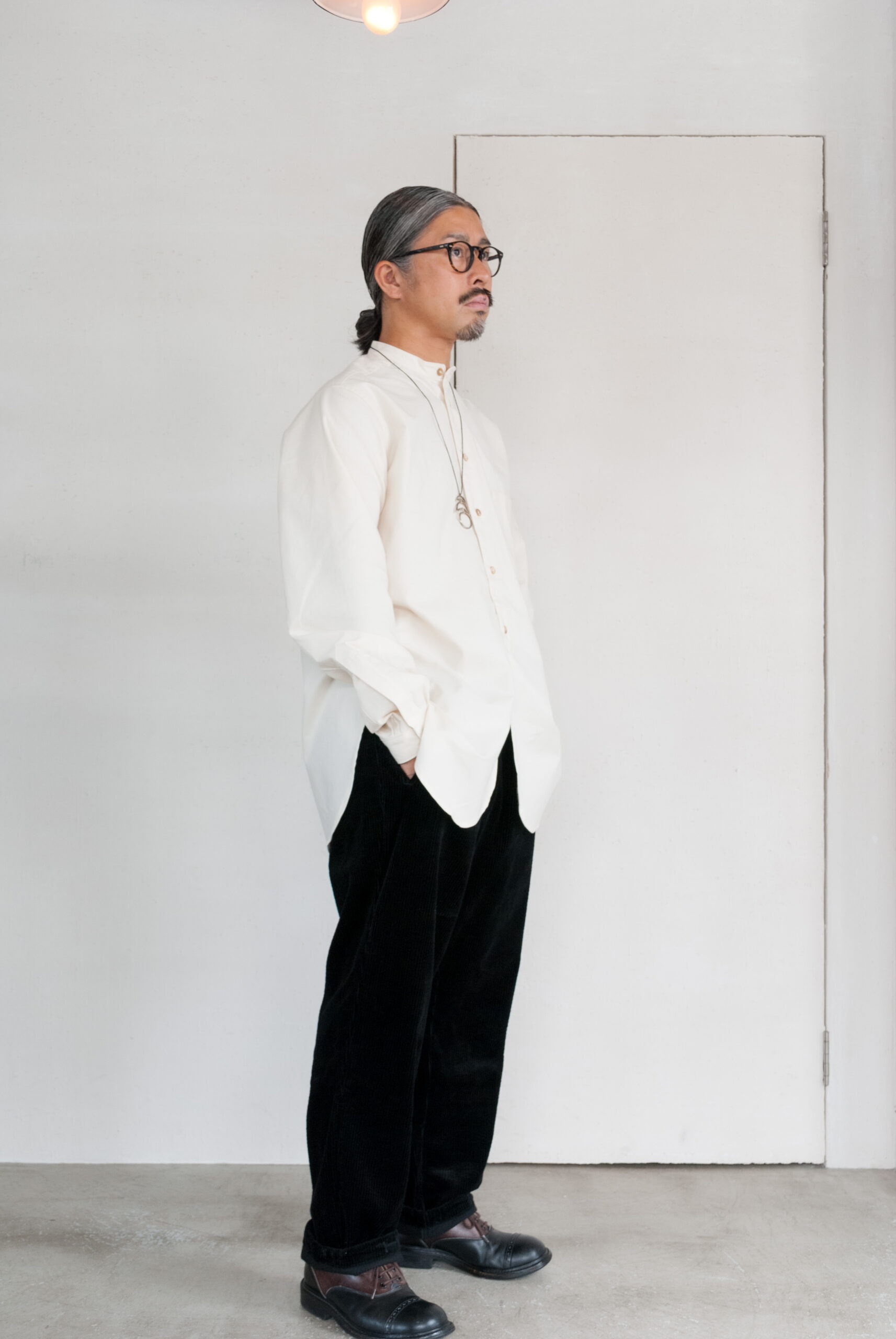 襟のないゆったりとしたシルエットは、太めのパンツにもすっきりとしたパンツにも合います。