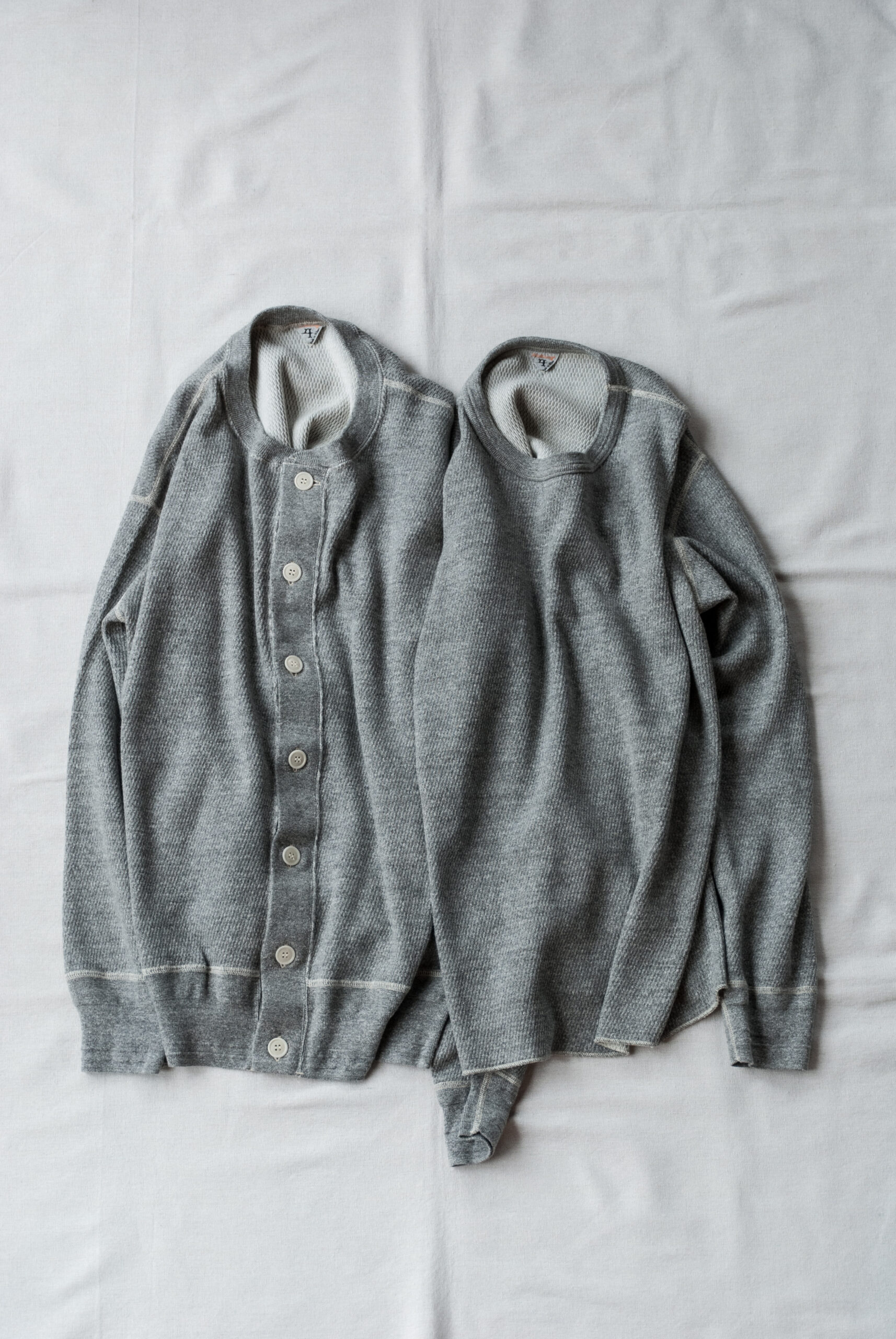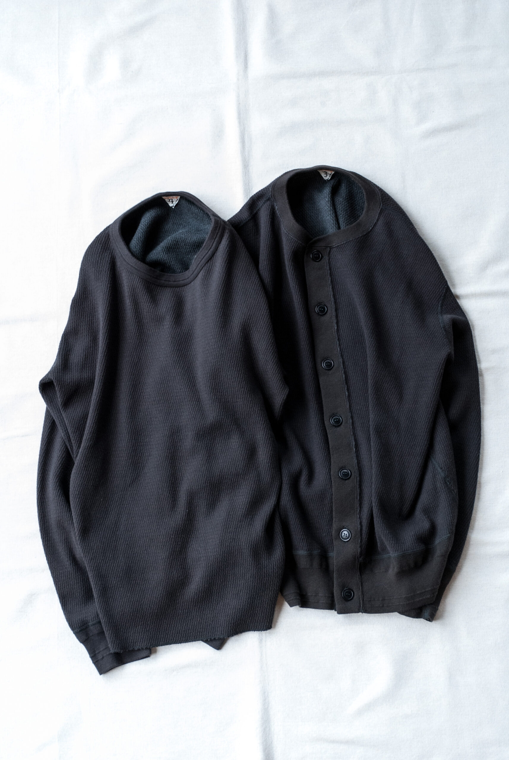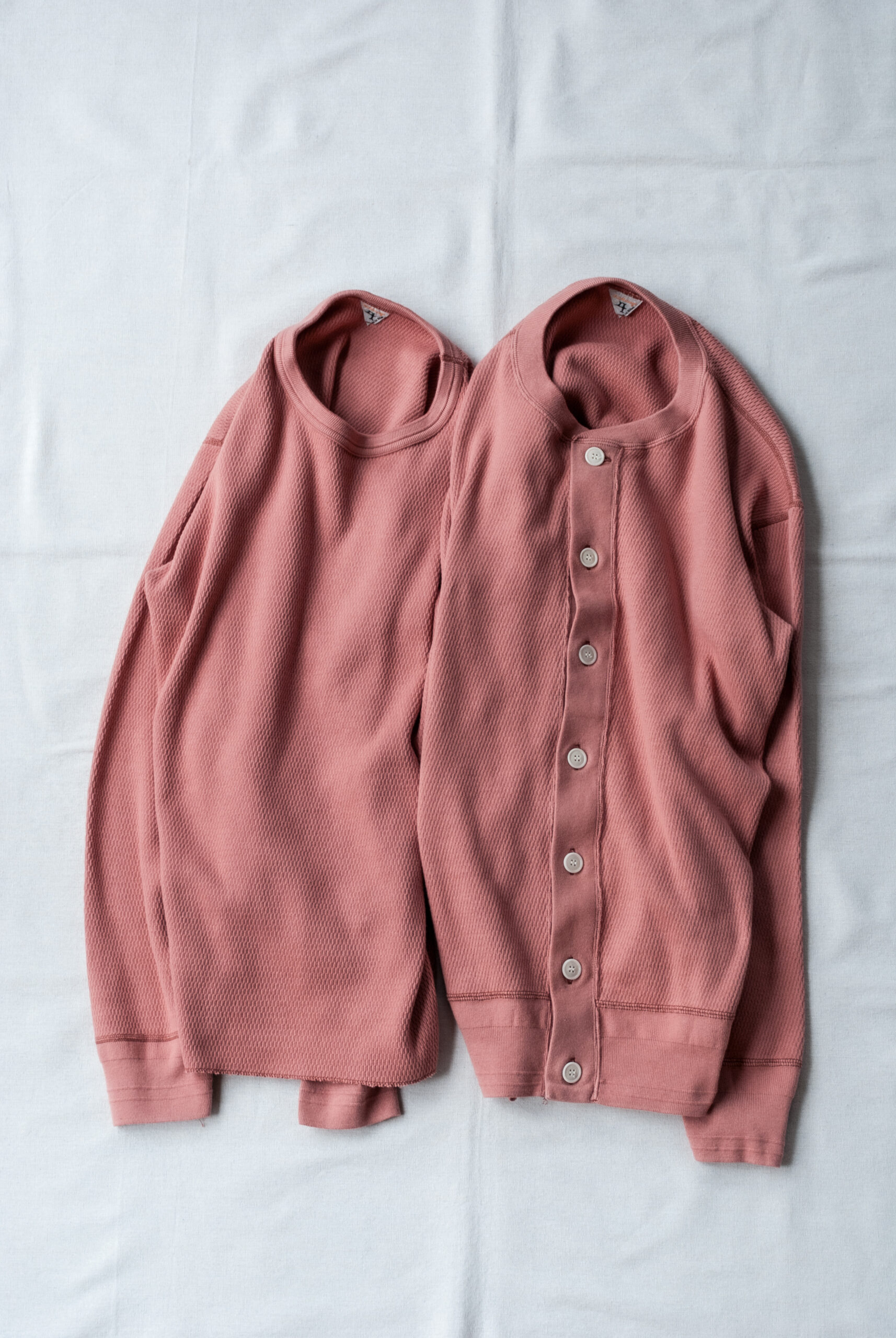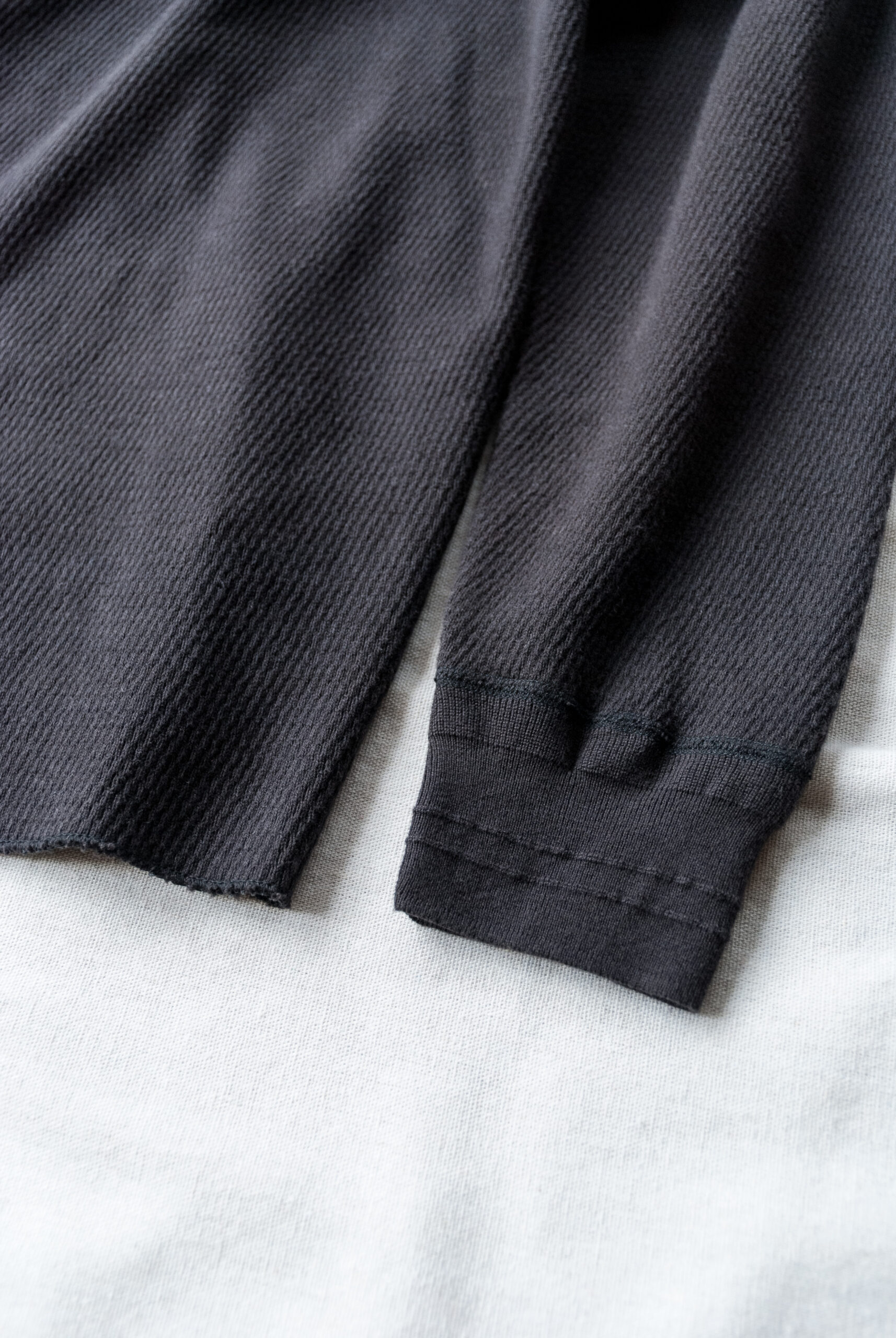 通常のサーマルよりもムラ感たっぷりの糸は、番手を太くして、編み目も大きめに仕上げてあるので、ハニカムの柄もしっかりと立って、古着のような柔らかで優しい表情になってます。