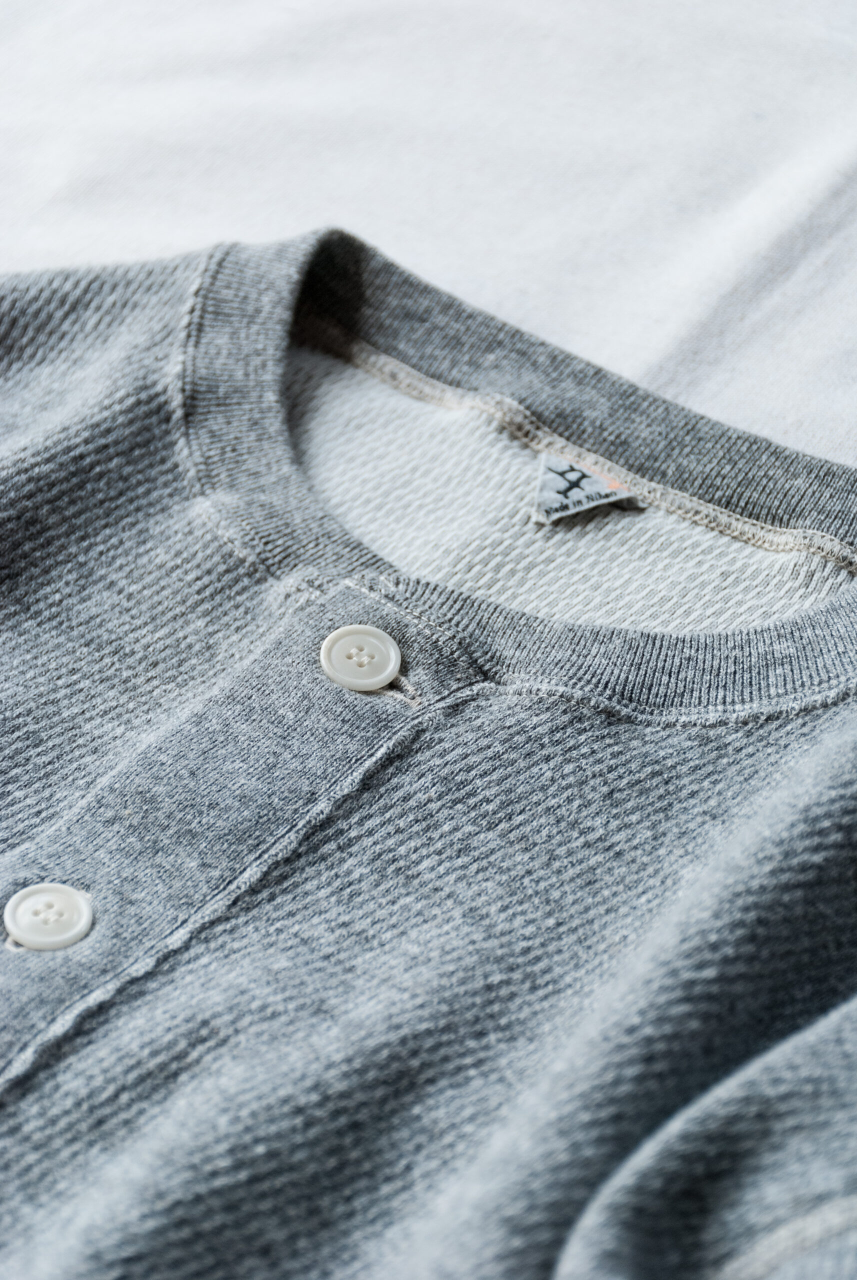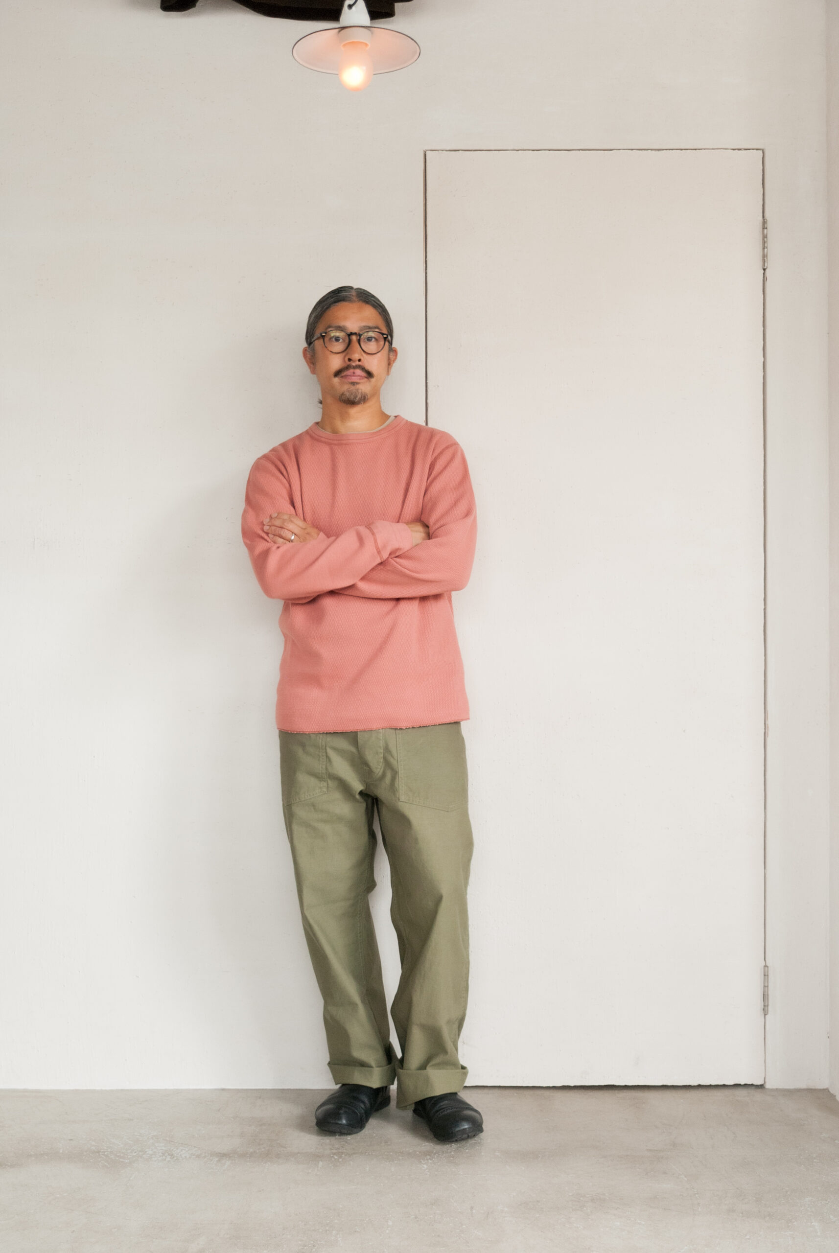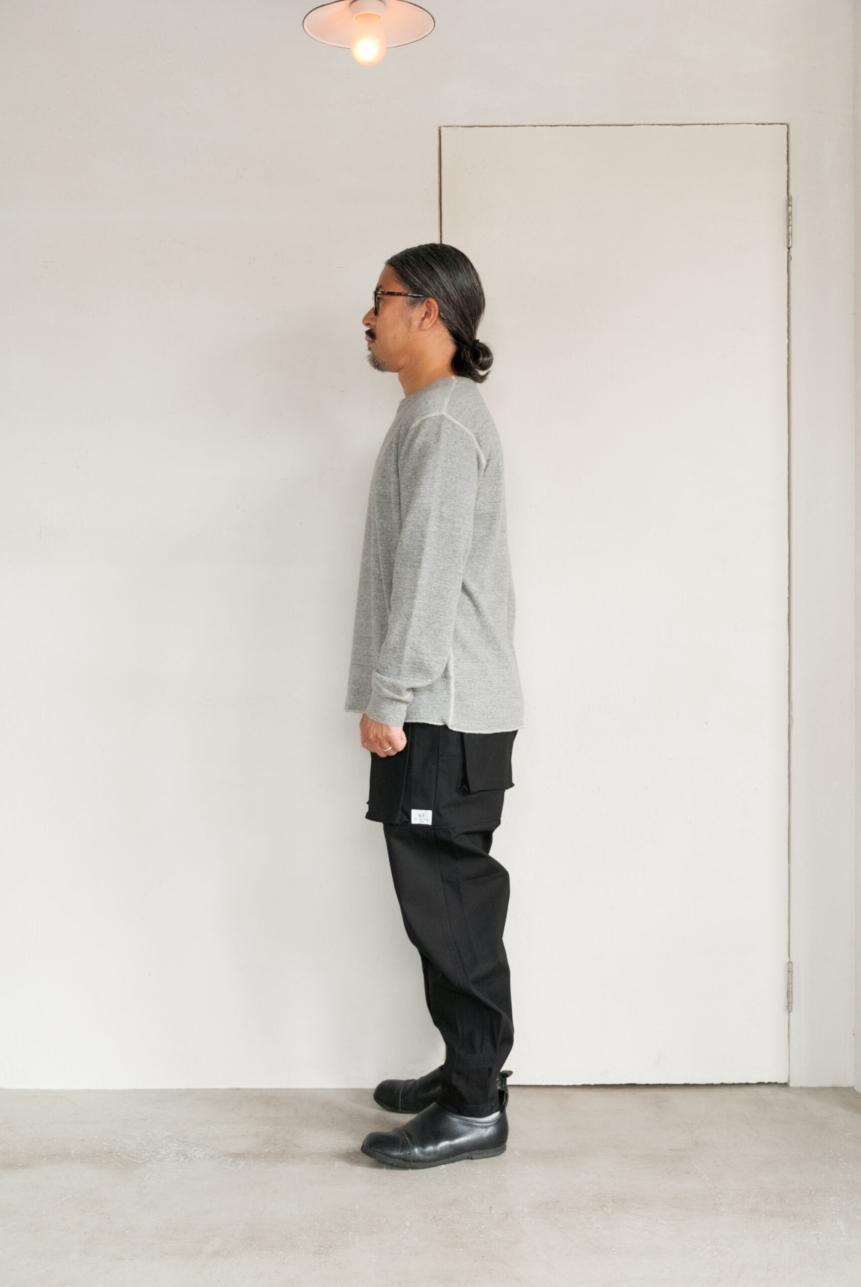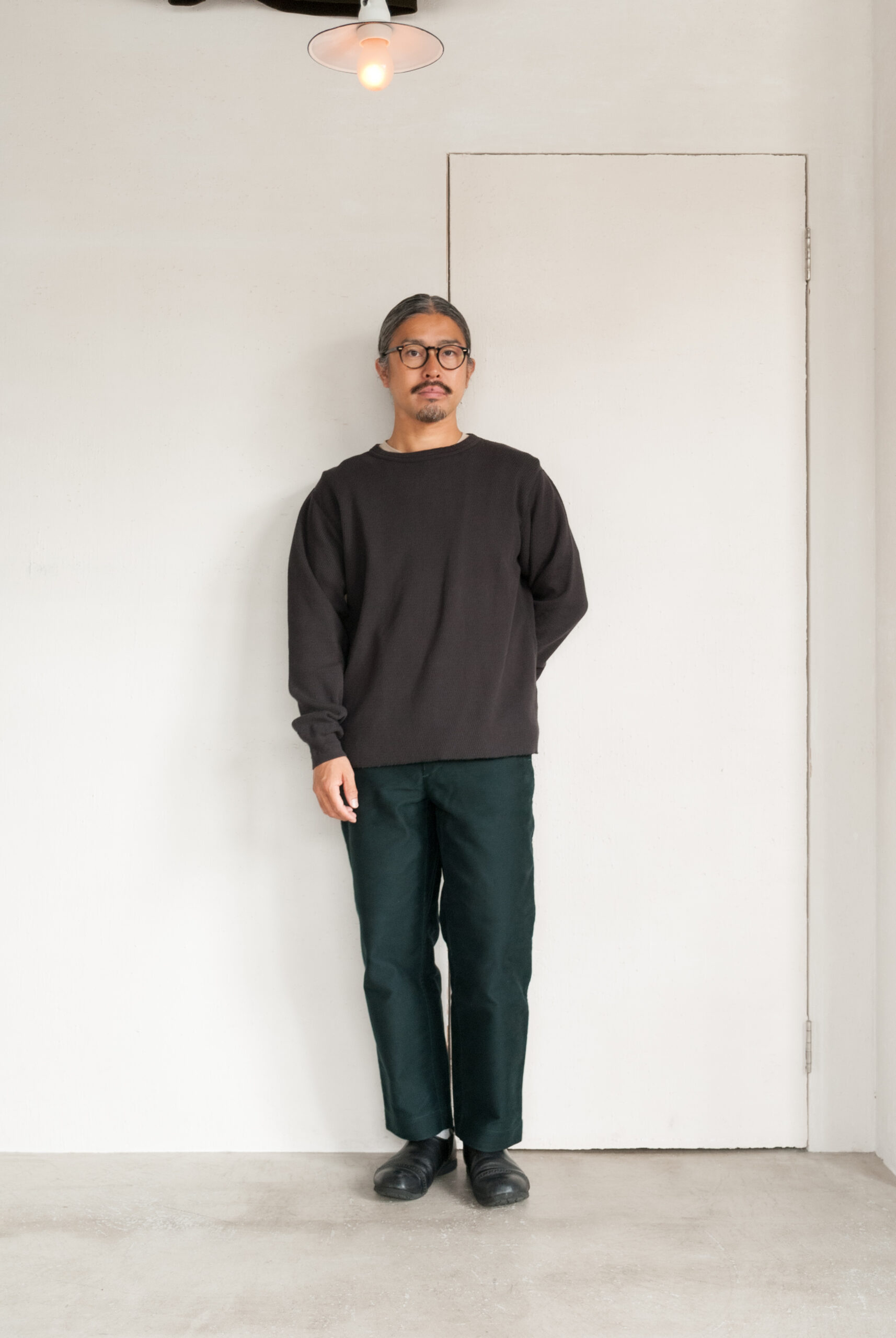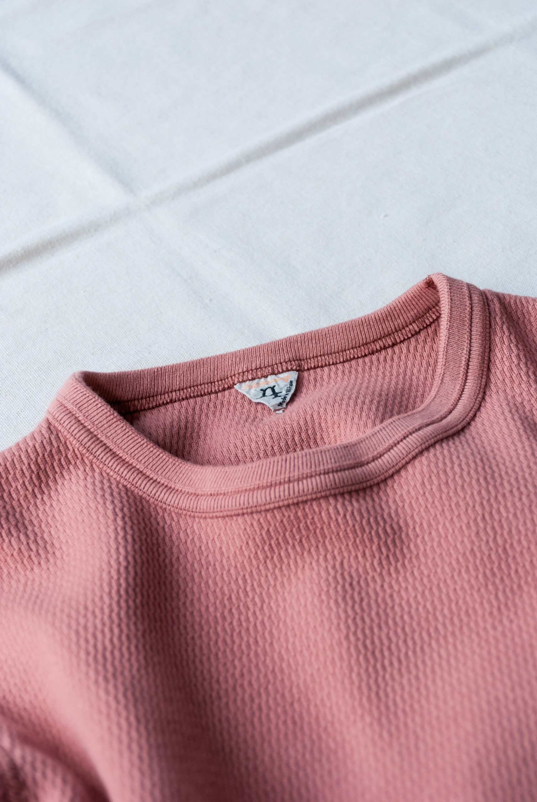 通常のサーマルよりもムラ感たっぷりの糸は、番手を太くして、編み目も大きめに仕上げてあるので、ハニカムの柄もしっかりと立って、古着のような柔らかで優しい表情になってます。