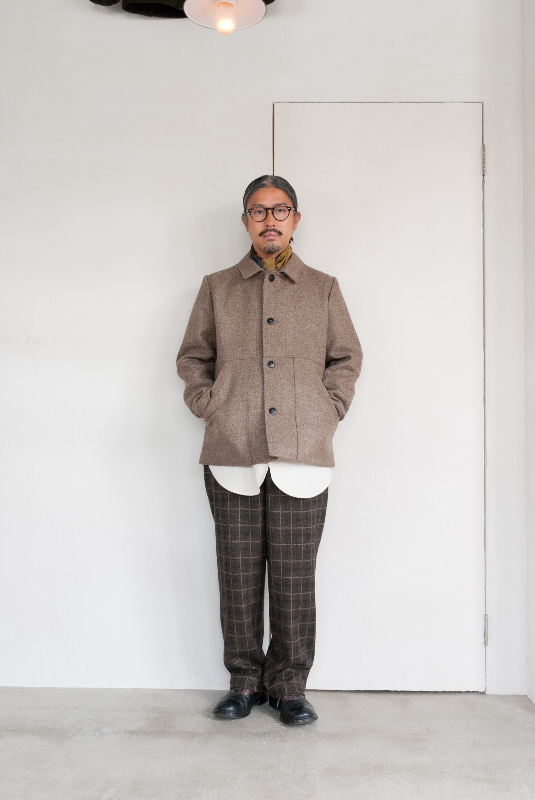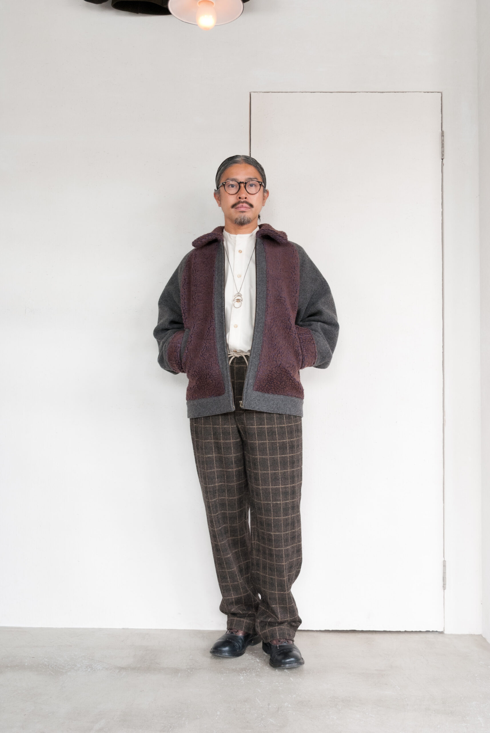 上下ともに近い色味で揃えてクラシックなムードを楽しむのも良いですが、フィルメランジェの変化球ジャケットのような、ちょっとポップな物ともすんなり同居できるので、かなり懐が深いパンツです。
