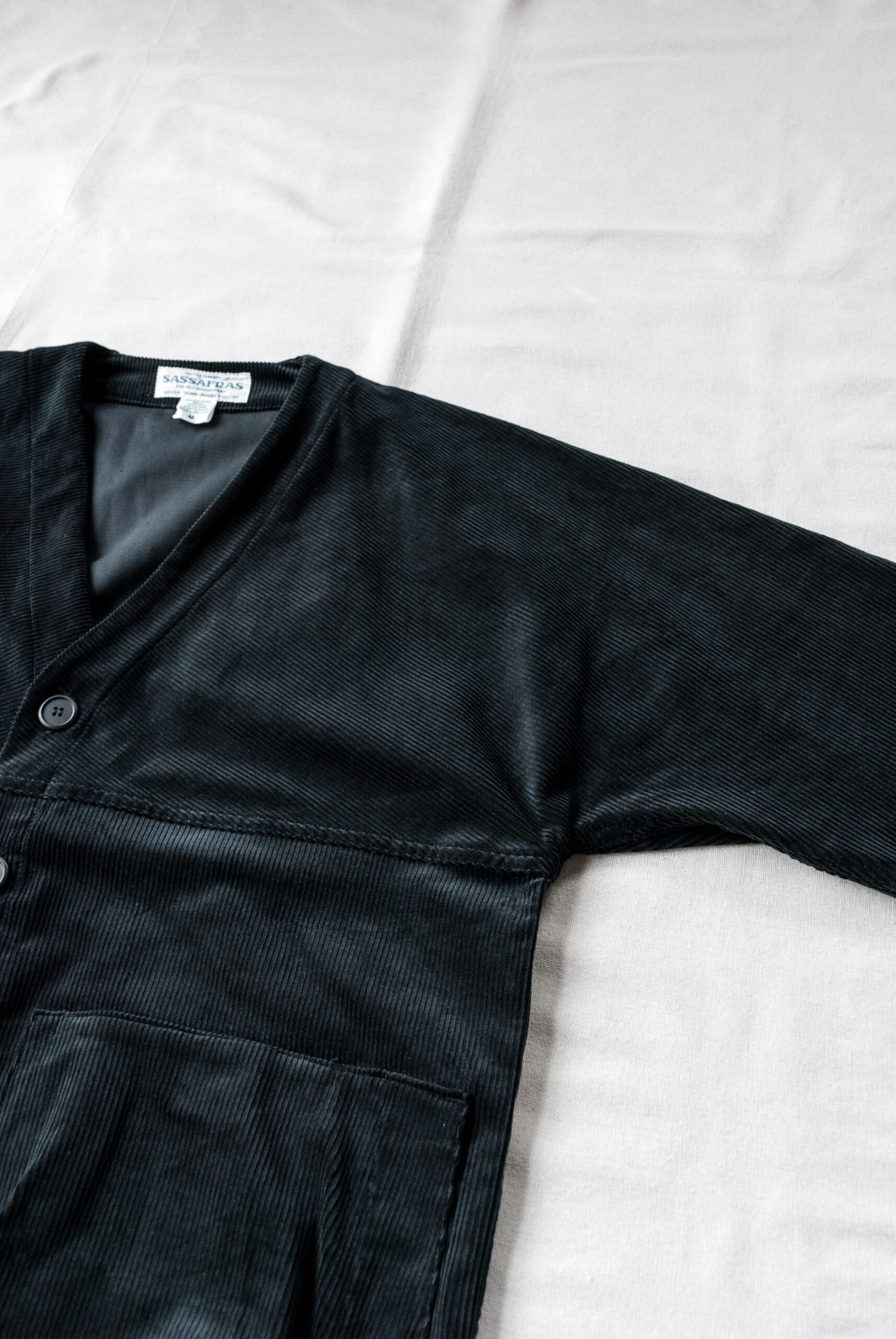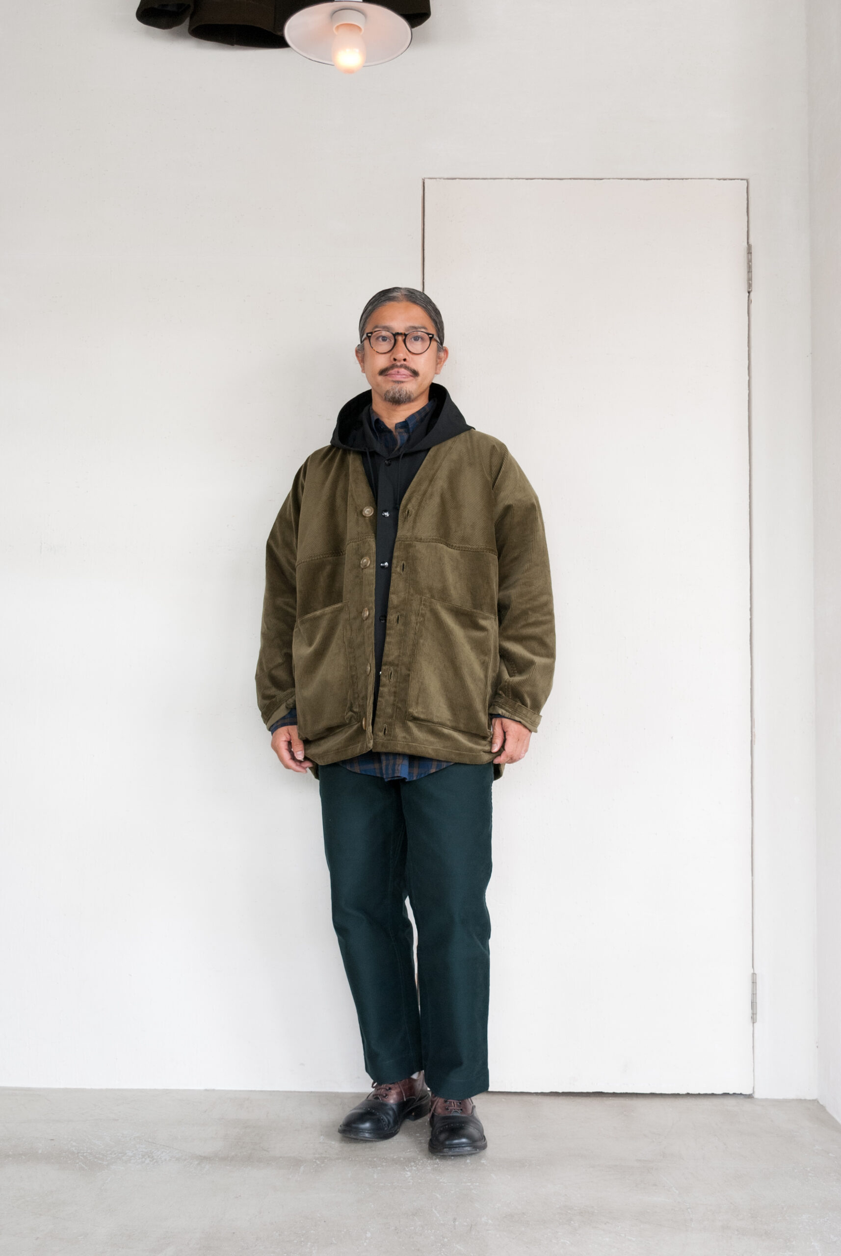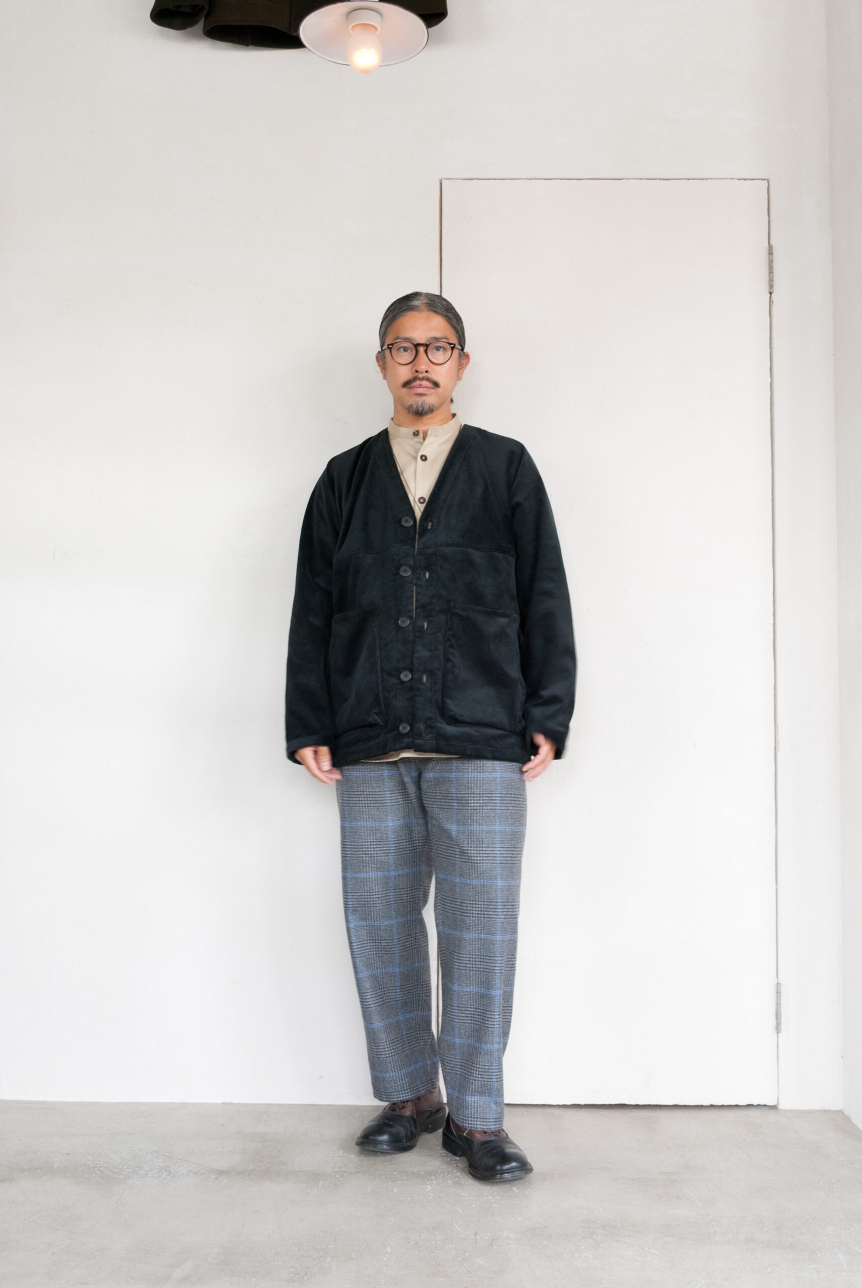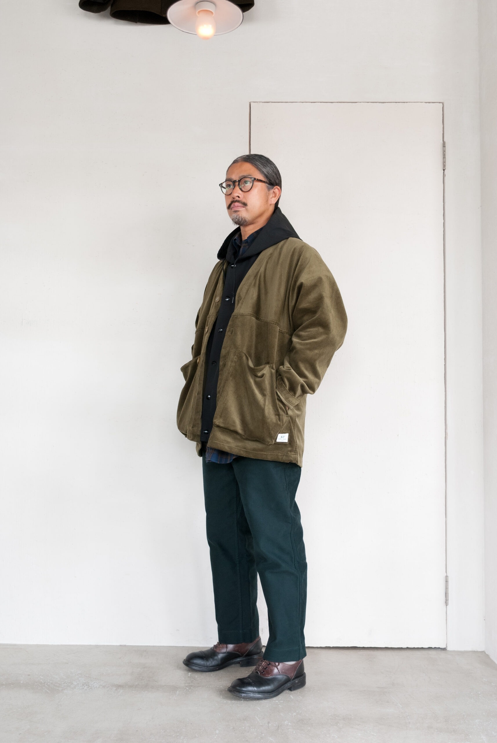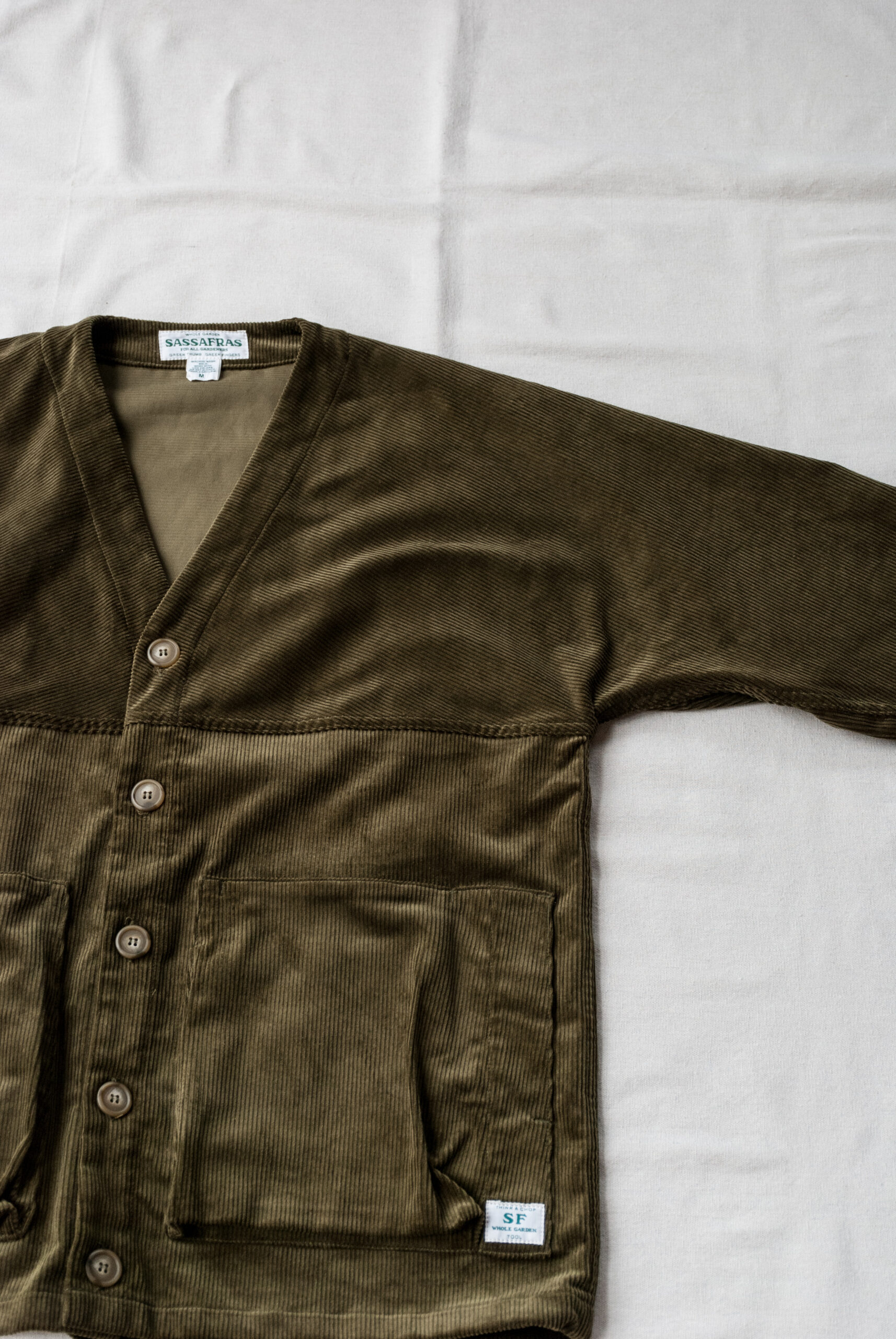 コーデュロイだからこその身頃のコントラストが、視覚的に新鮮な違和感と、肩周りの独特なドレープを生み出し、良い塩梅の深さのVネックと大きめな五つのボタンが、カーディガンジャケットとして、どうやって着てやろうかと想像力をかき立てます。