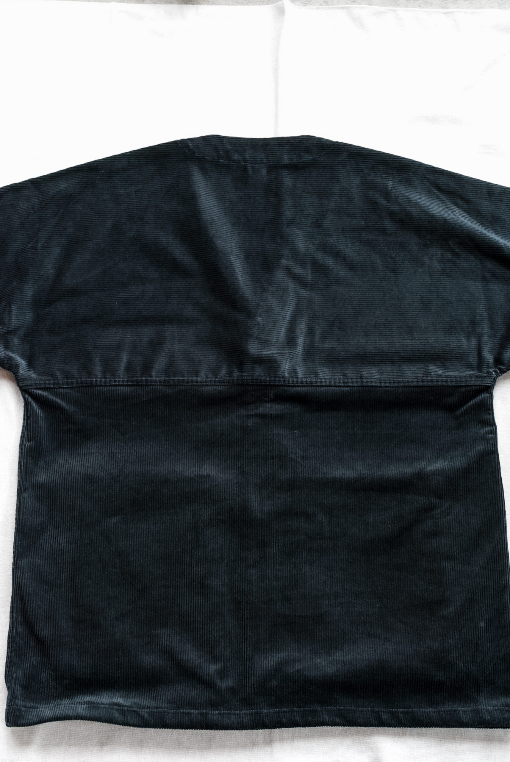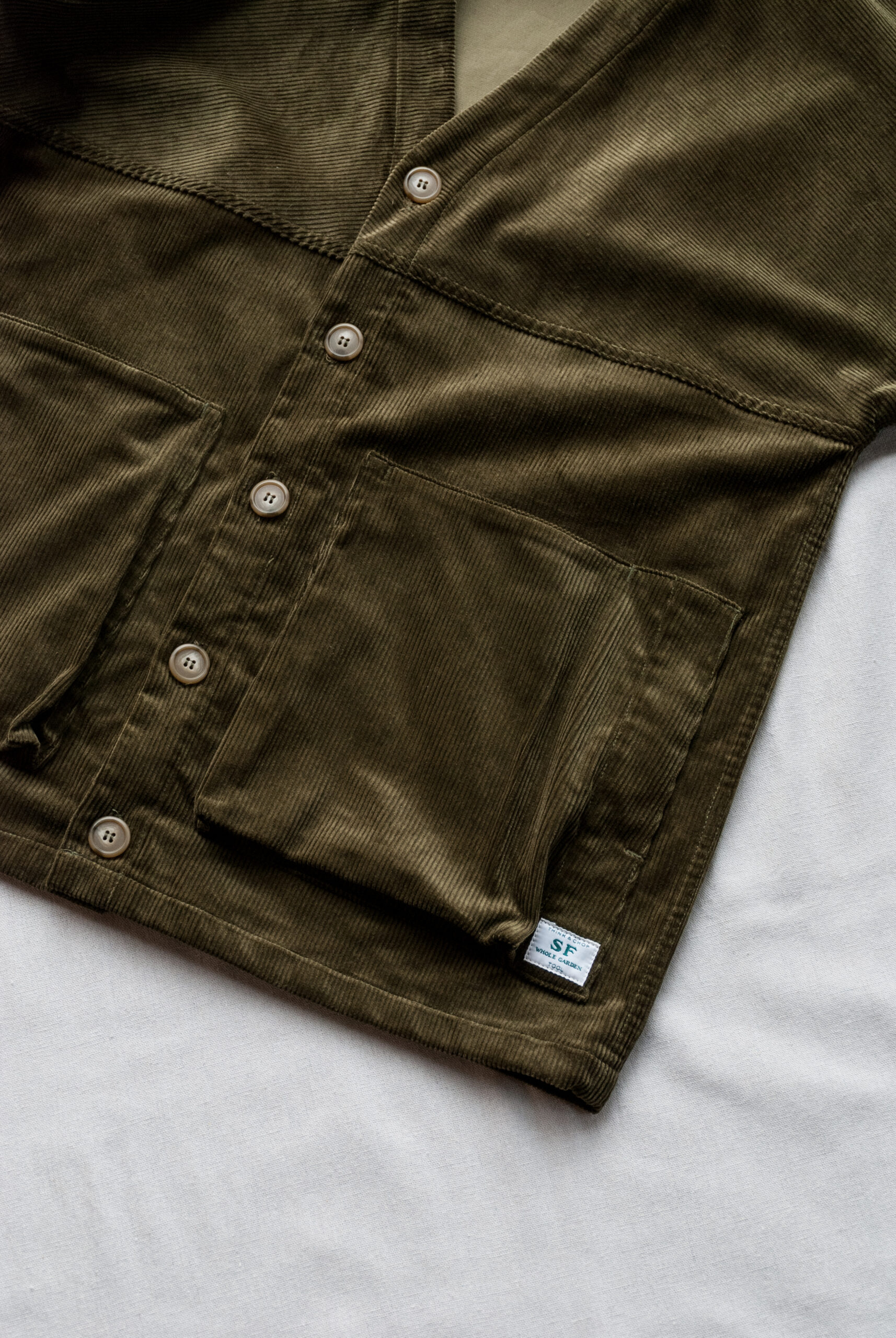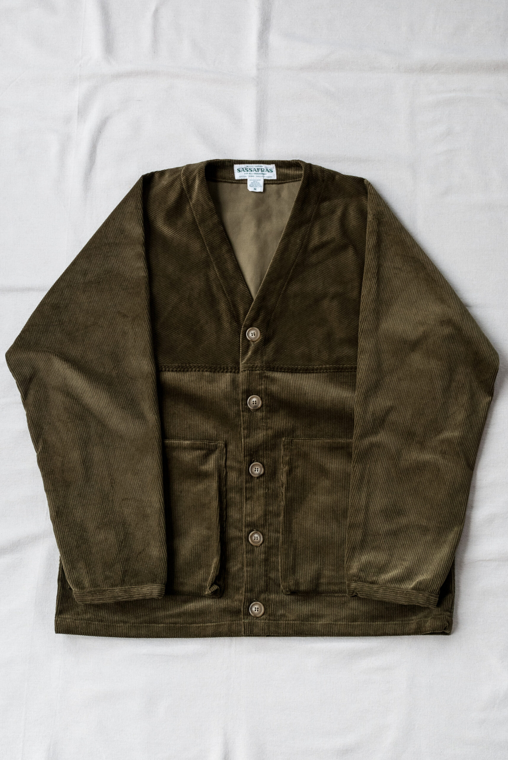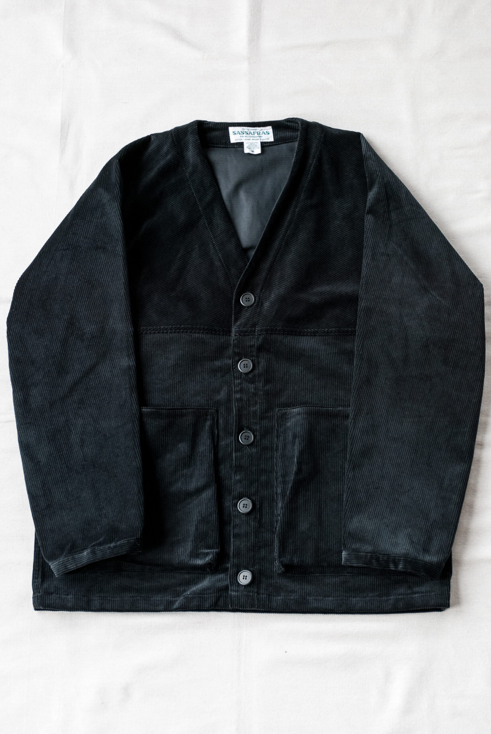 コーデュロイだからこその身頃のコントラストが、視覚的に新鮮な違和感と、肩周りの独特なドレープを生み出し、良い塩梅の深さのVネックと大きめな五つのボタンが、カーディガンジャケットとして、どうやって着てやろうかと想像力をかき立てます。