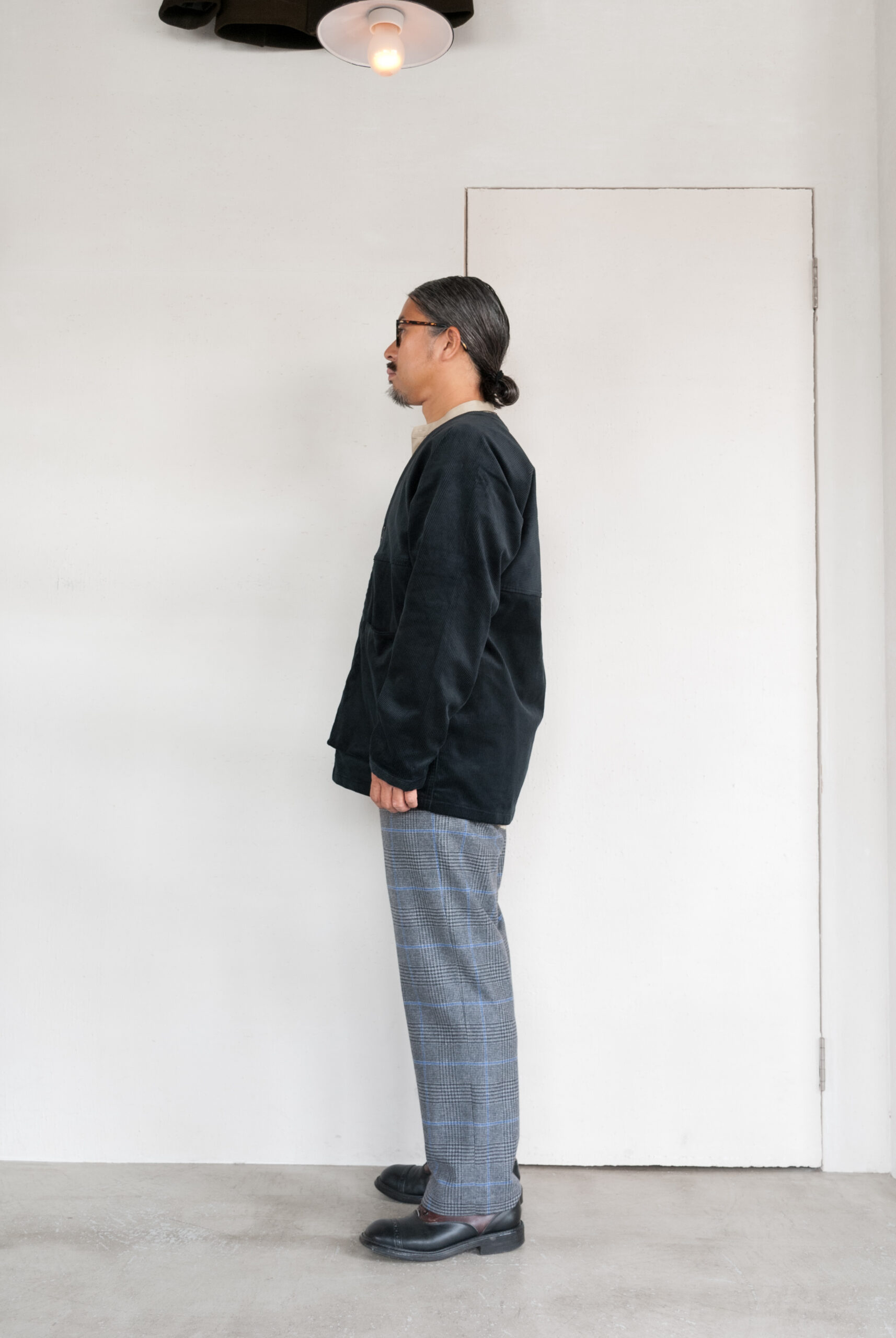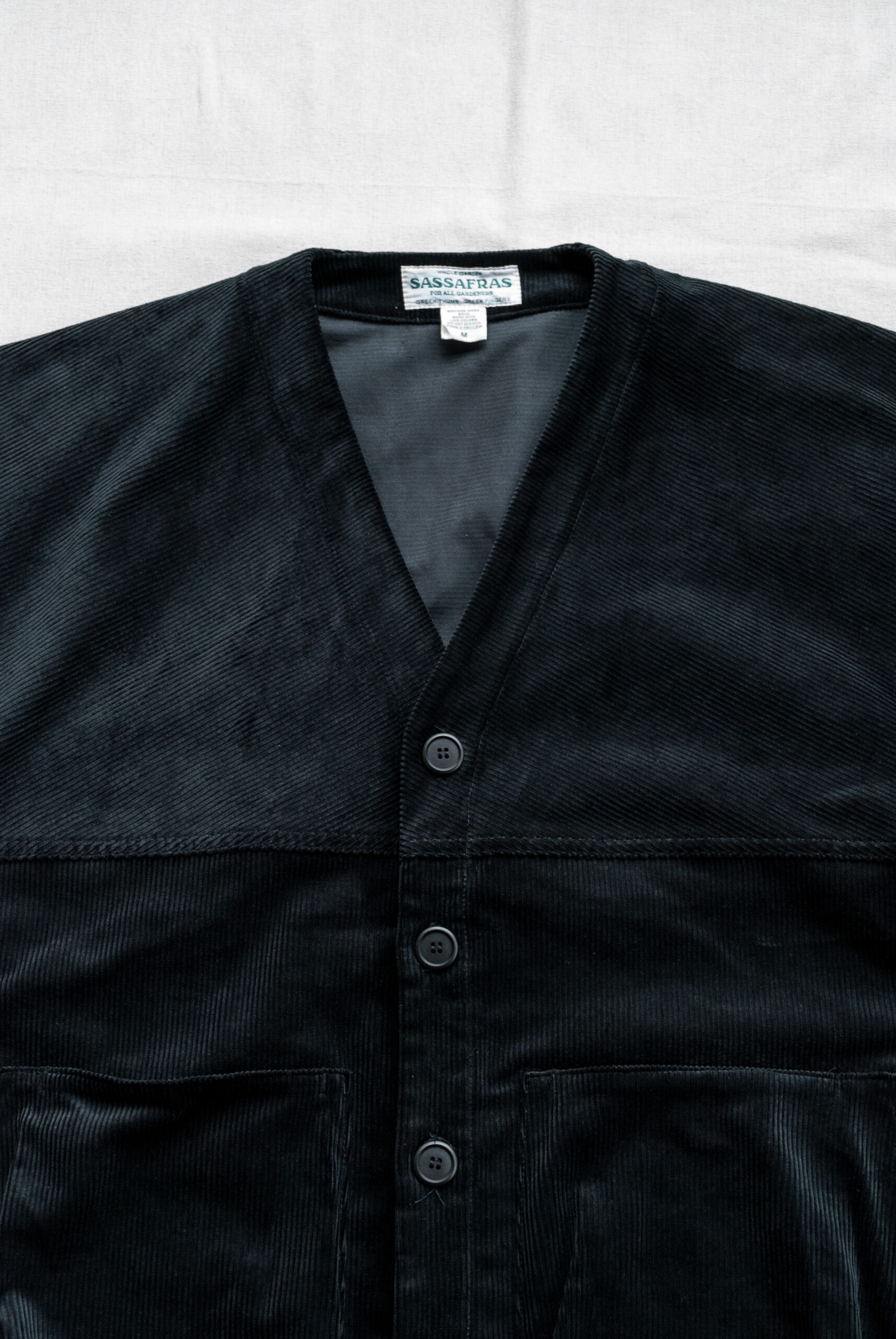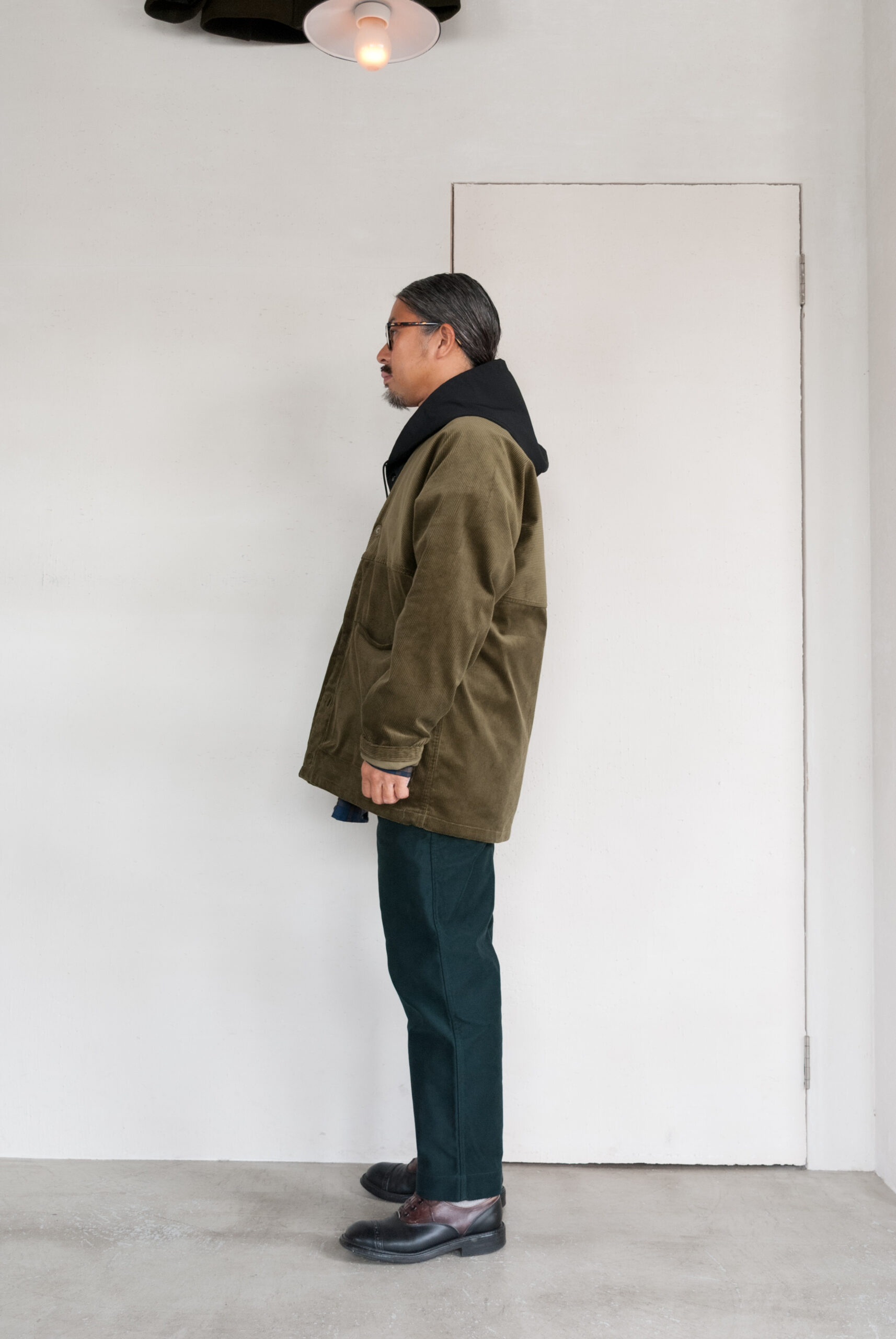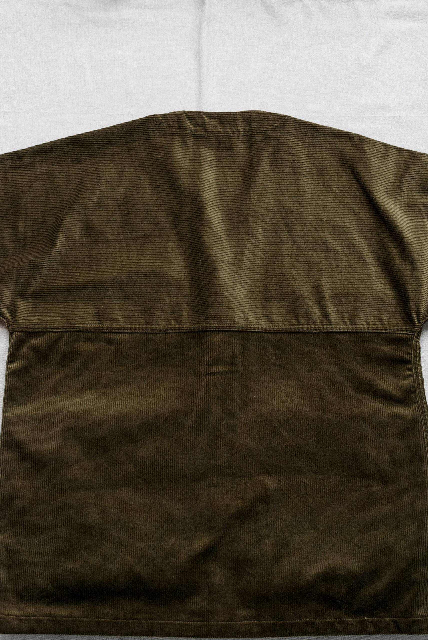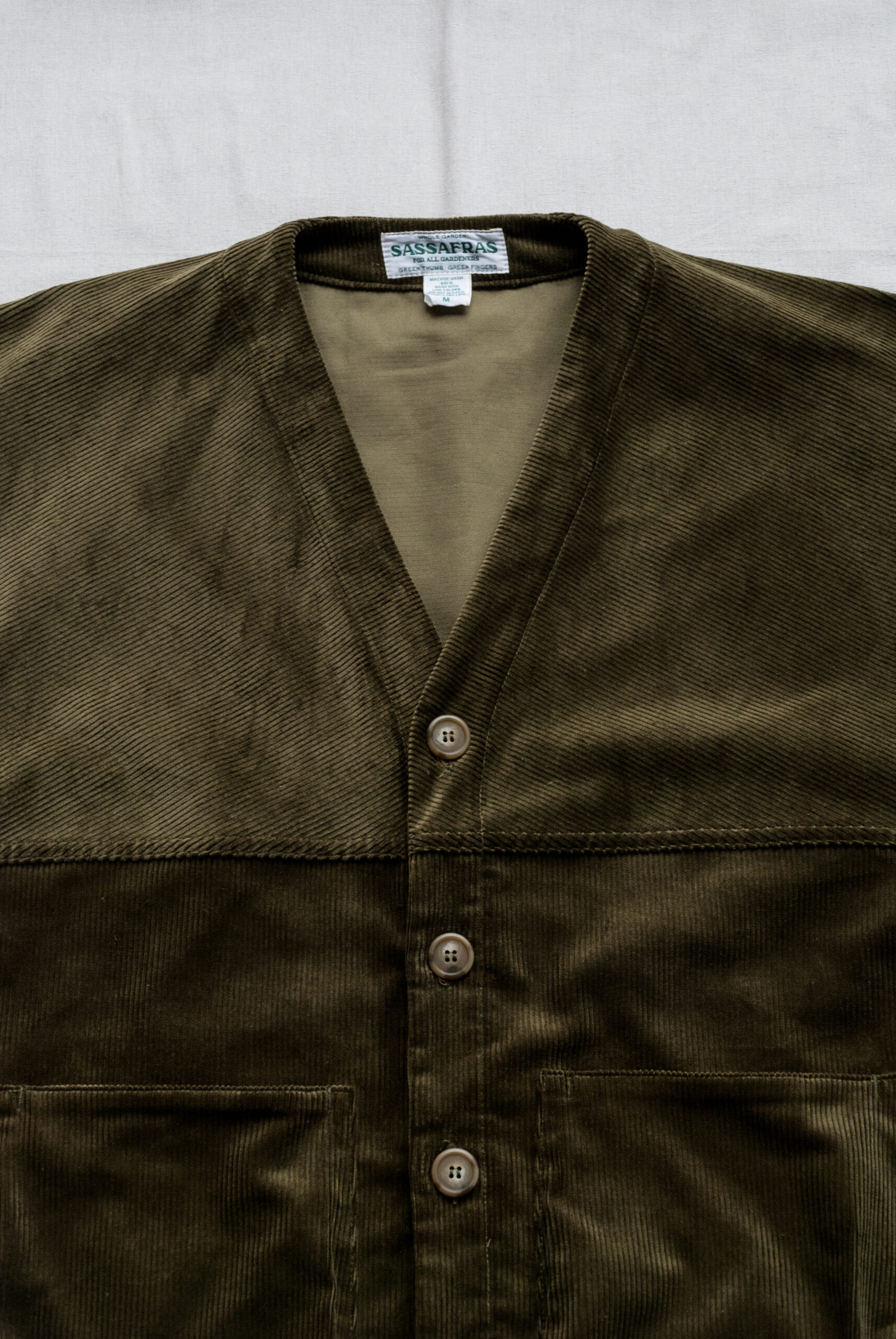 コーデュロイだからこその身頃のコントラストが、視覚的に新鮮な違和感と、肩周りの独特なドレープを生み出し、良い塩梅の深さのVネックと大きめな五つのボタンが、カーディガンジャケットとして、どうやって着てやろうかと想像力をかき立てます。