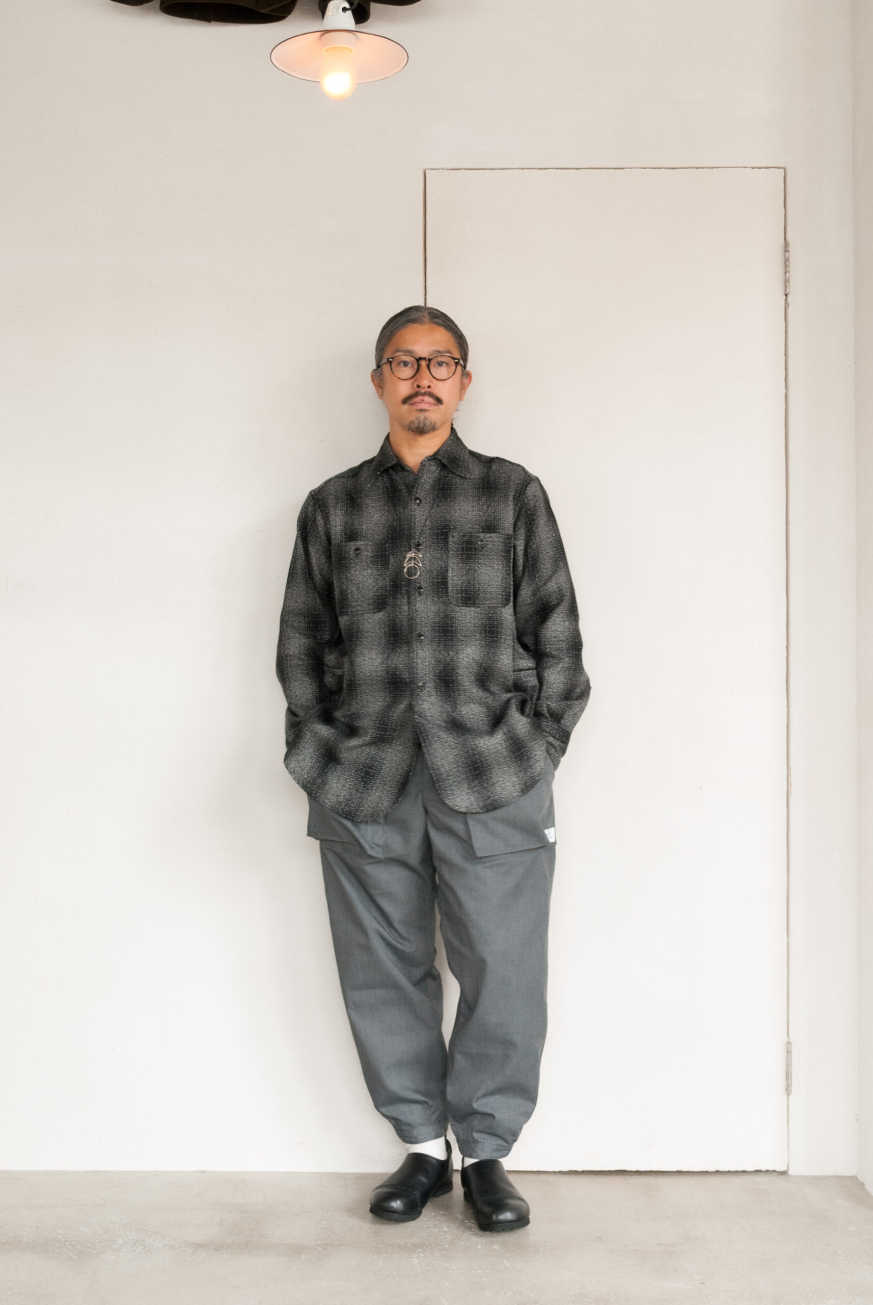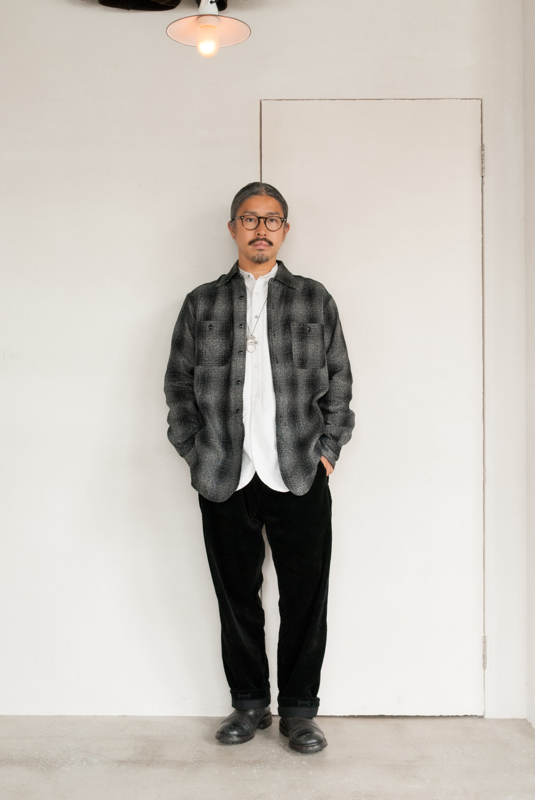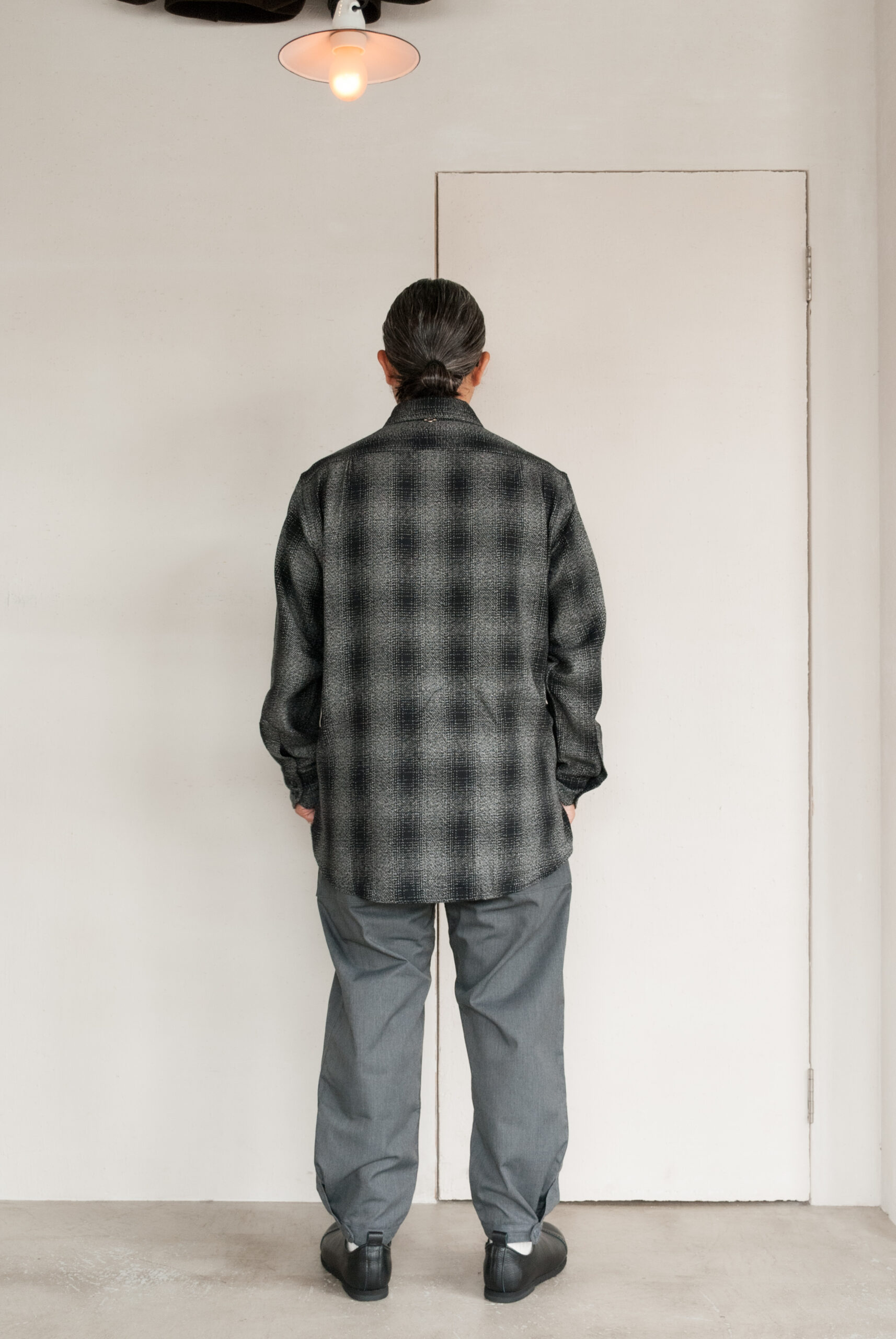 離れてみると確かにチェックなのですが、そんなに柄がはっきりしているタイプではないので、いろいろと合わせやすく、ちょっと長めの着丈も着てみると意外と着やすい。