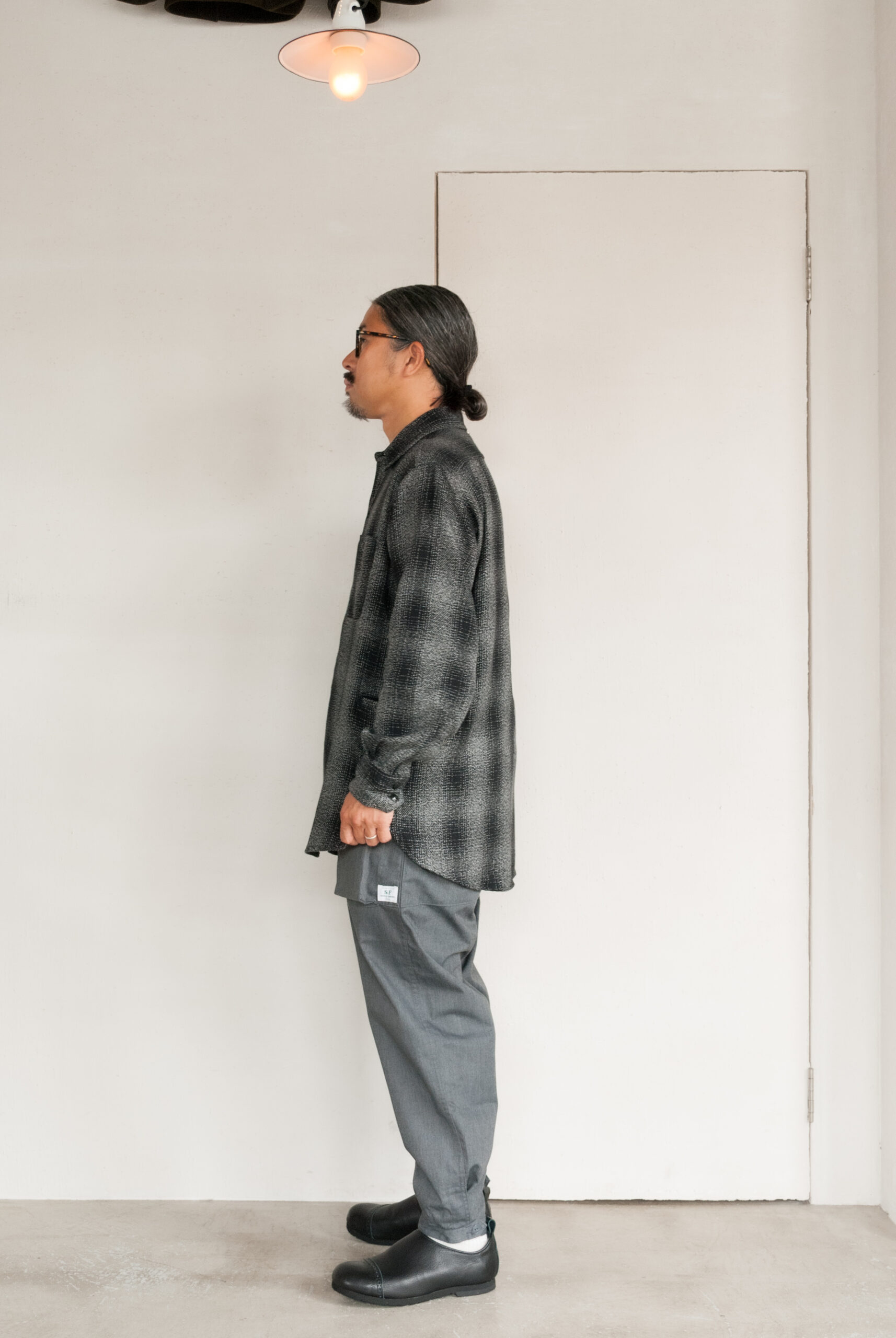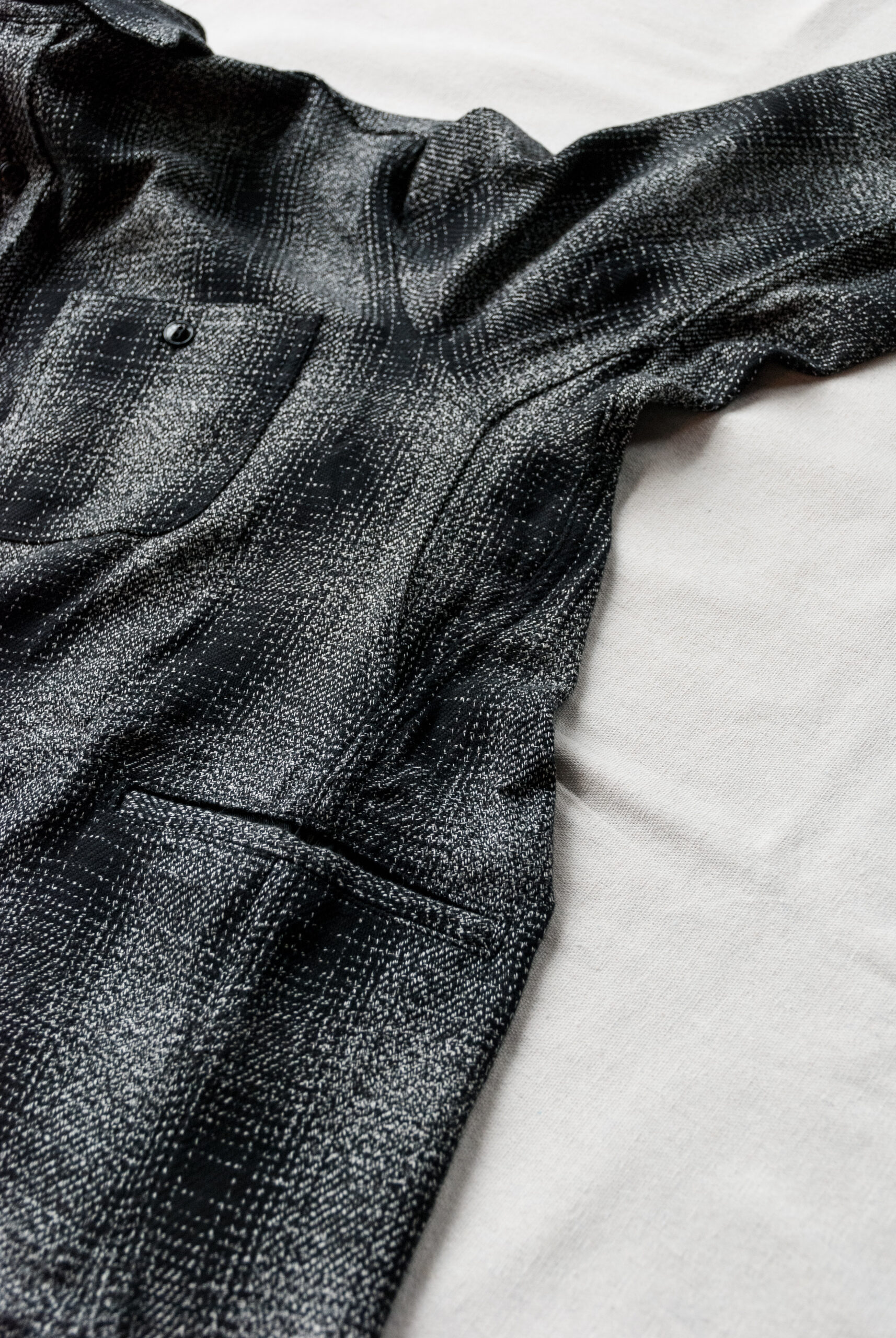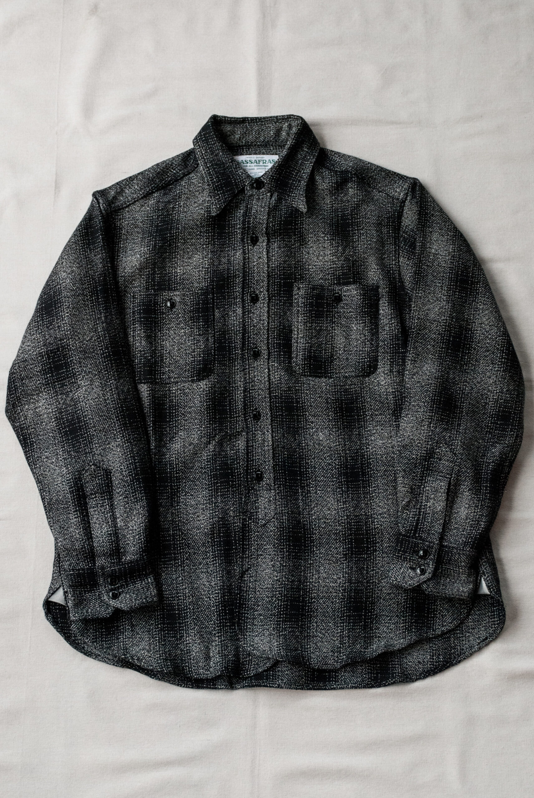 古いドレスシャツのような深い前立て、少し長めの着丈とゆったりとした身幅、ボタン付きの胸ポケットや、両サイドに付けられたポケット、脇の下に設けられたガゼットクロッチからはササフラスらしさが感じられるが、ワークテイスト溢れる分厚いヘビーフランネルの生地を使用しながらも、モノトーンのチェックが大人なムードを醸し出しています。