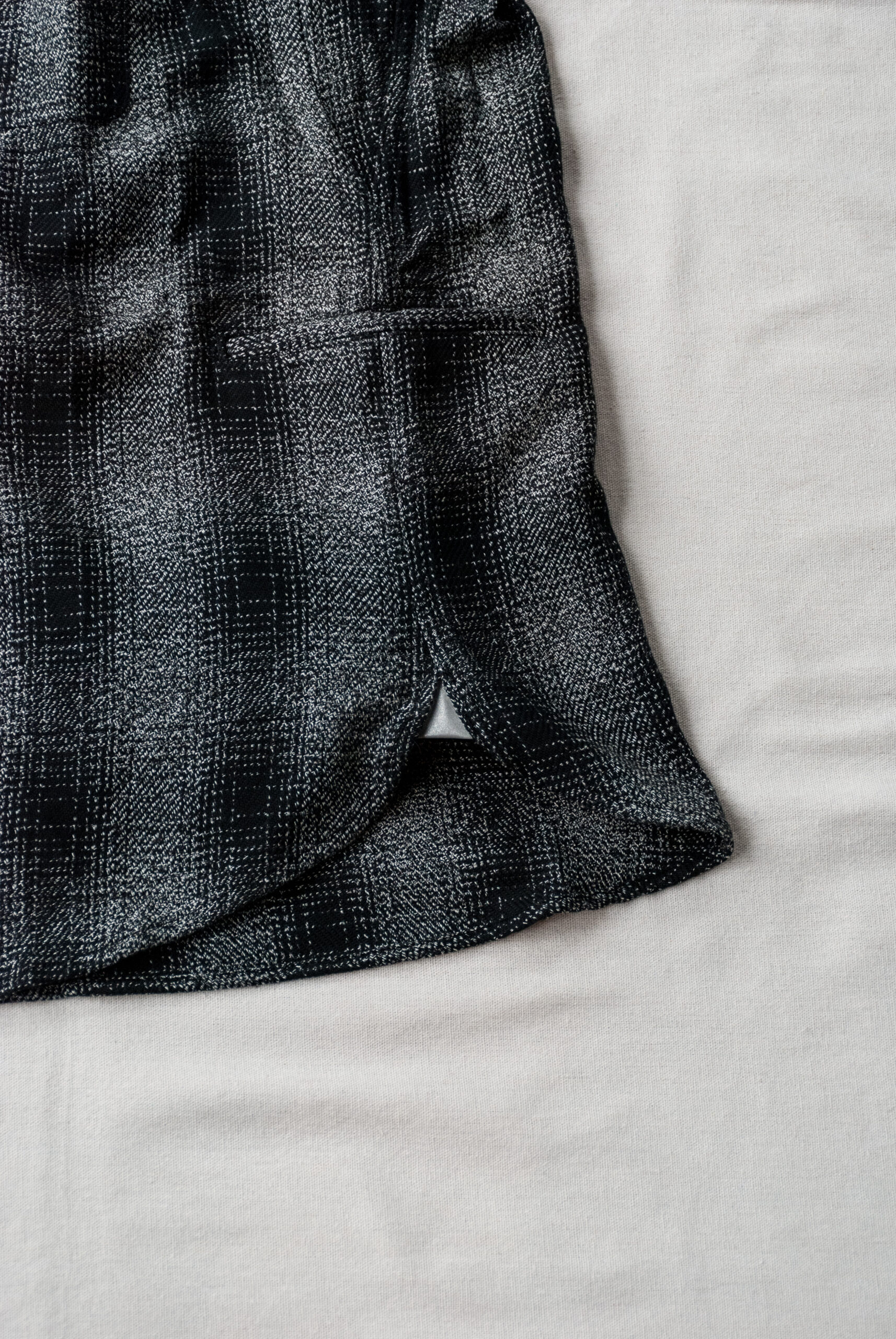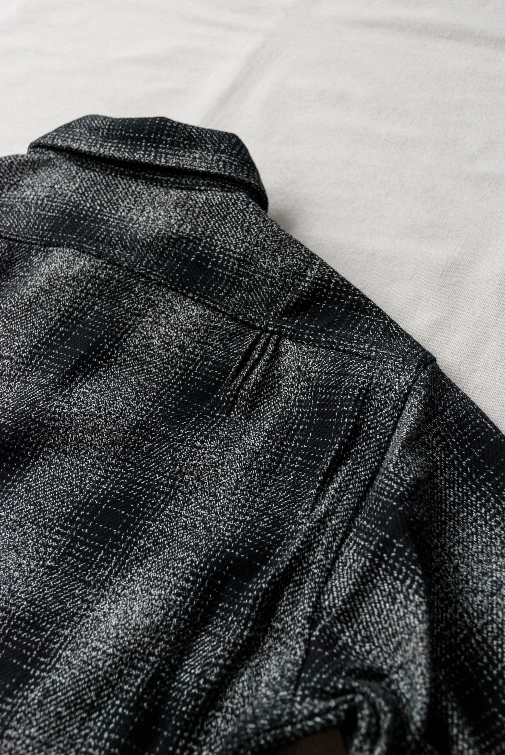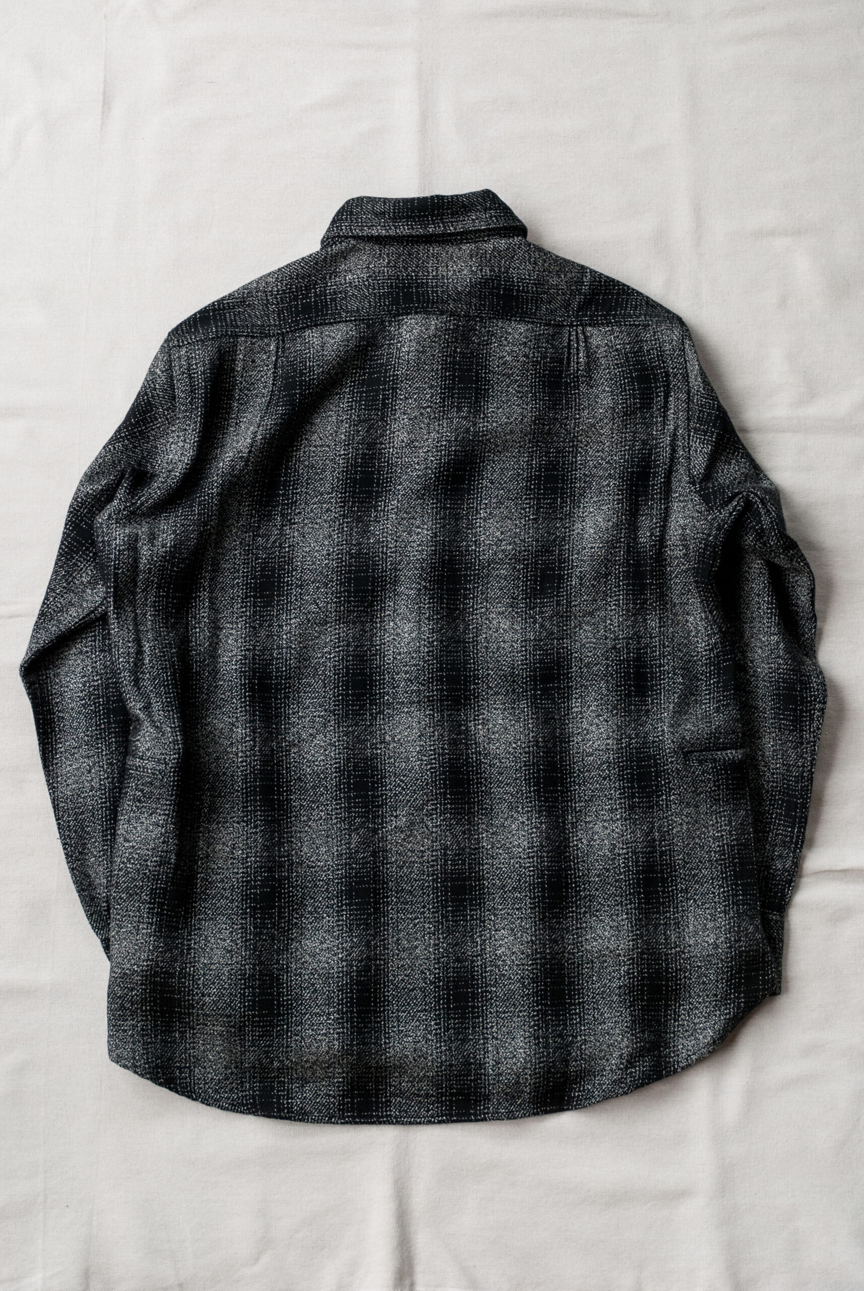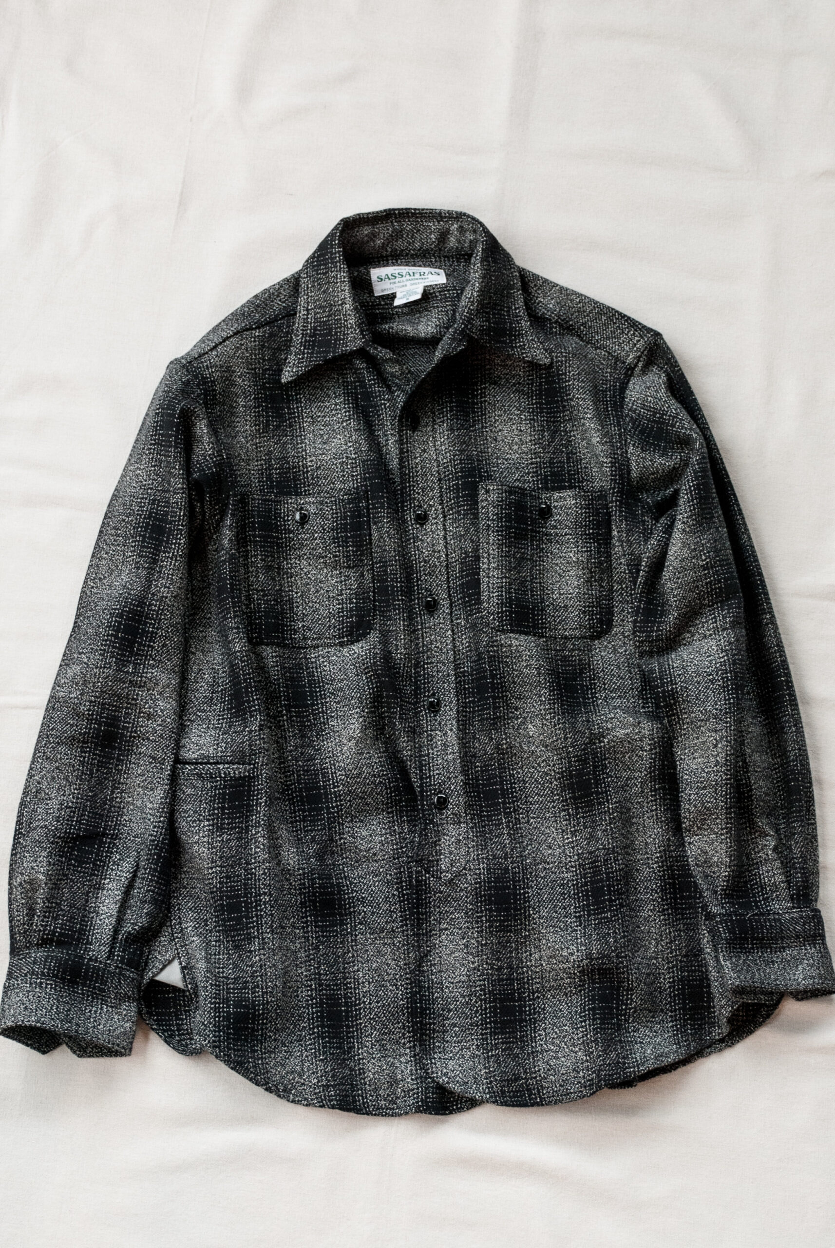古いドレスシャツのような深い前立て、少し長めの着丈とゆったりとした身幅、ボタン付きの胸ポケットや、両サイドに付けられたポケット、脇の下に設けられたガゼットクロッチからはササフラスらしさが感じられるが、ワークテイスト溢れる分厚いヘビーフランネルの生地を使用しながらも、モノトーンのチェックが大人なムードを醸し出しています。