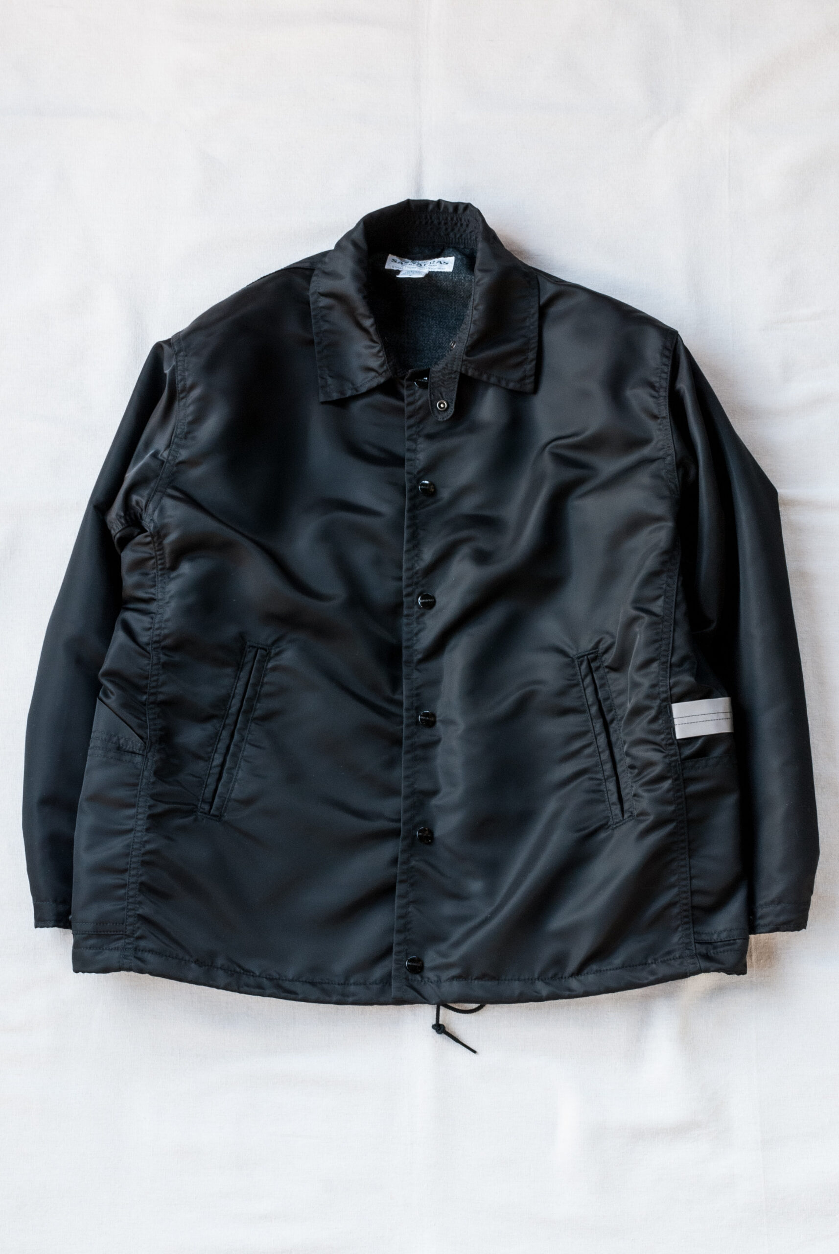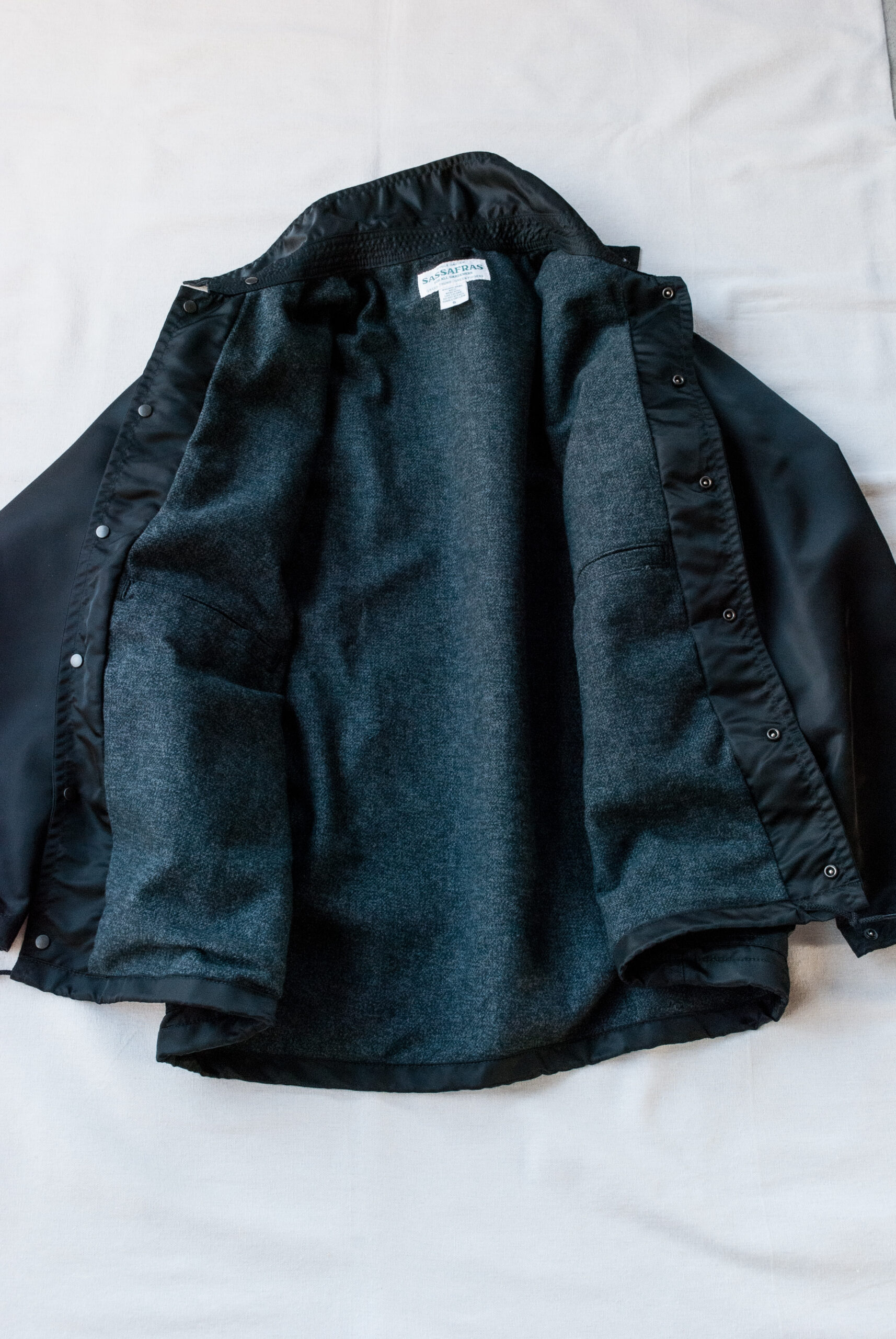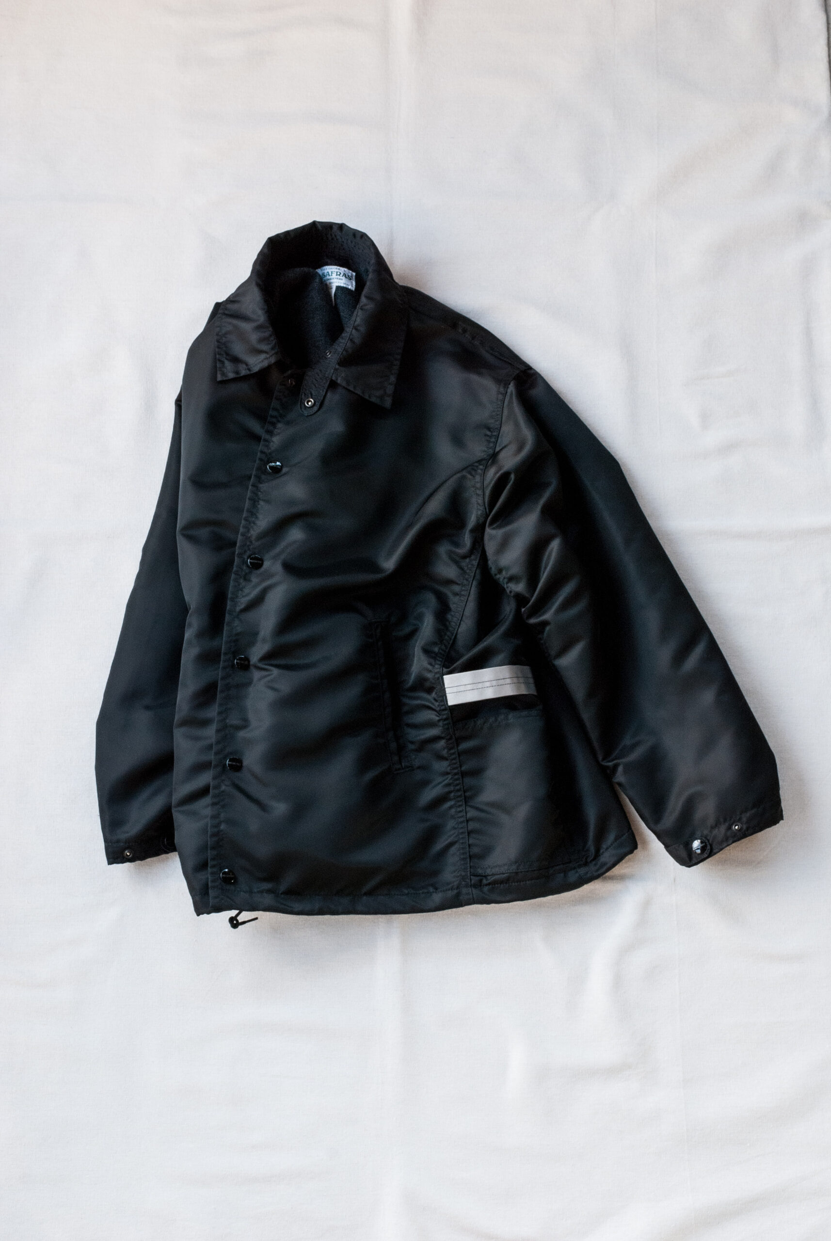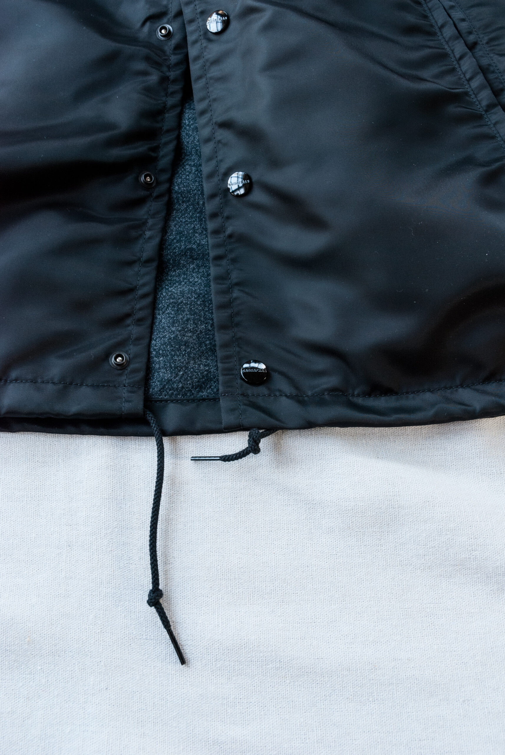 裾にはドローコードが付いているので、腰まわりのニュアンスが変えられ、フロントと袖口にはササフラスオリジナルのスナップボタンを採用。