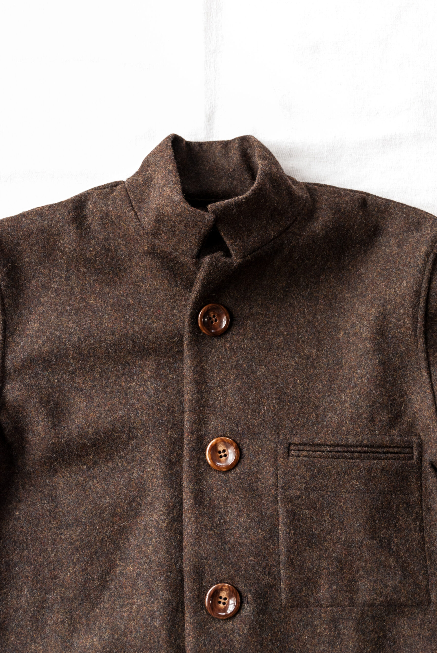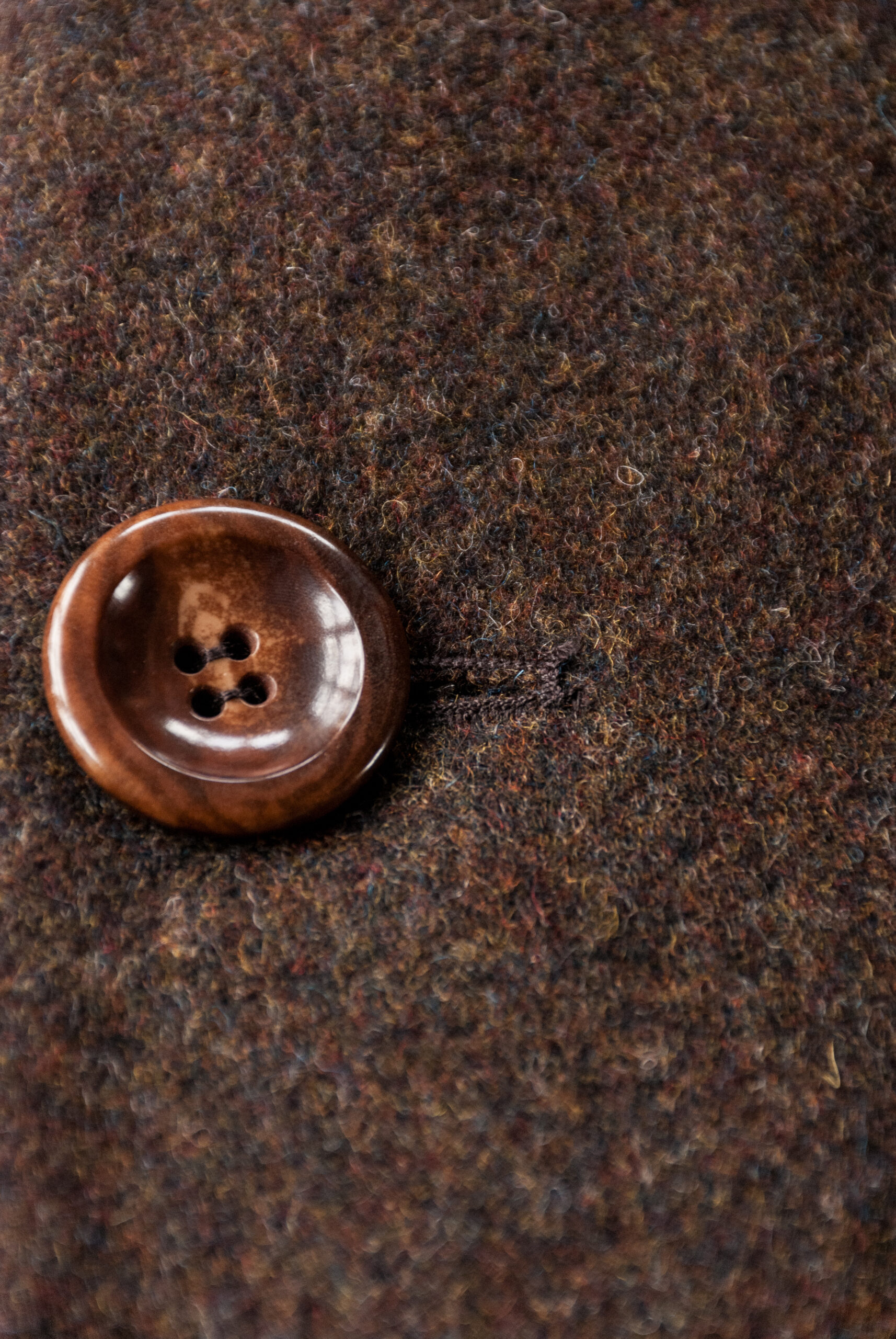 控えめに言っても大きい4つアンティークボタンと、パッチポケットではない両サイドポケット、襟を倒せば控えめなラペルができたり、挑戦的な厚い生地、等。