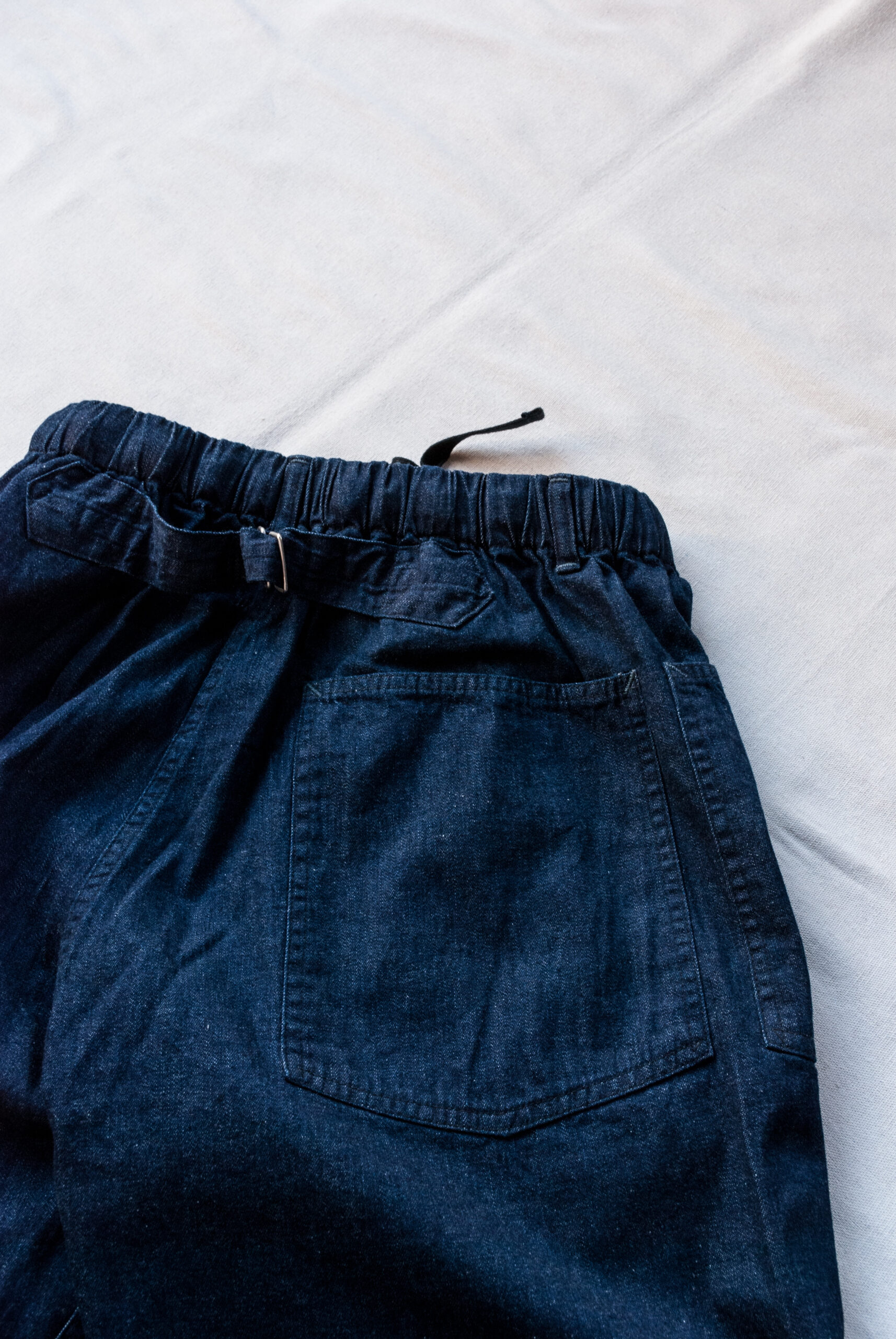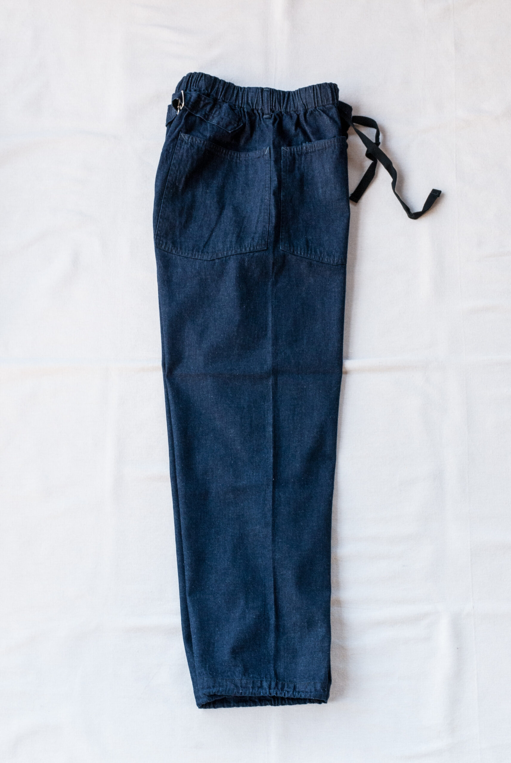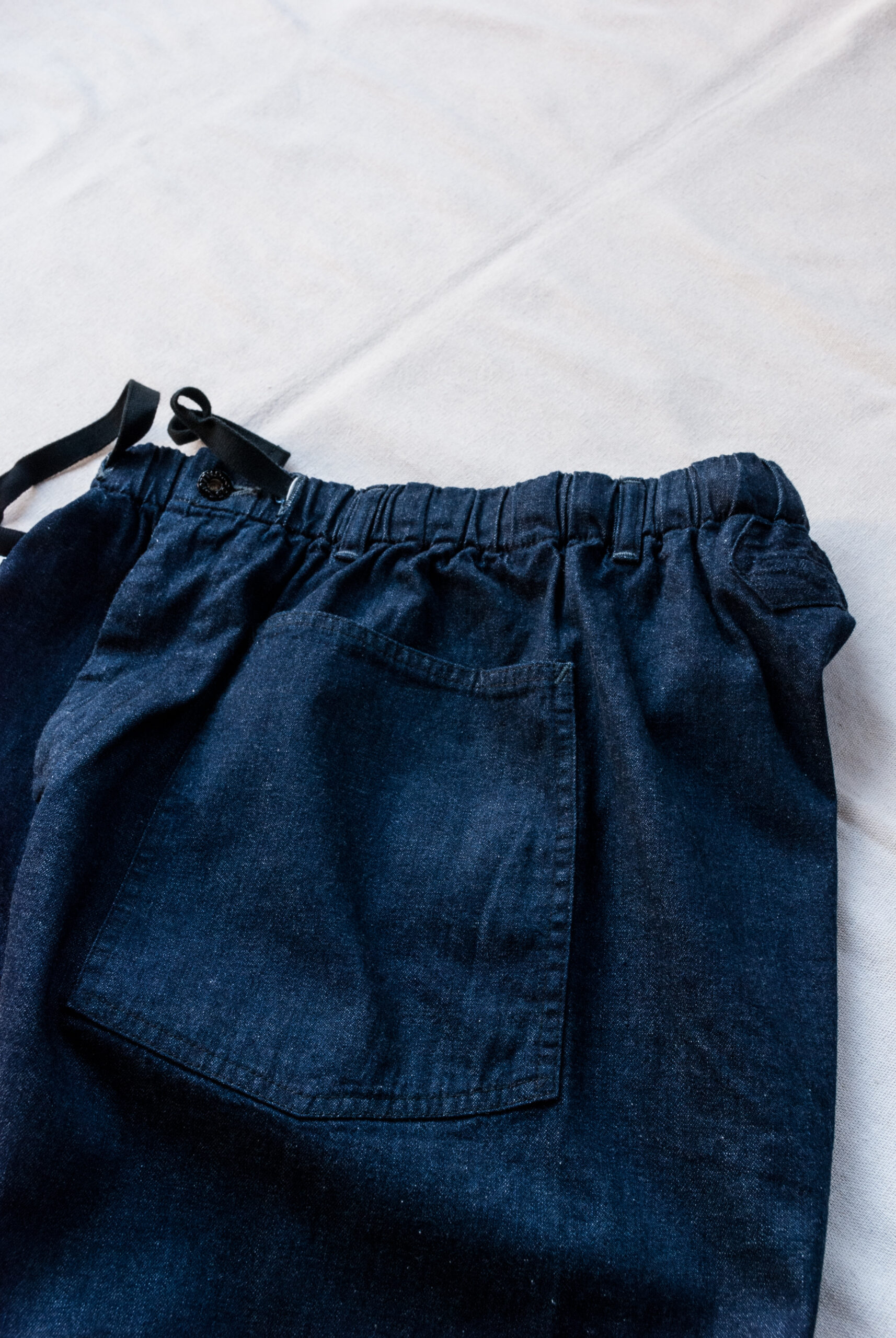 セレクトしたのが8ozのデニムなので、全体的な雰囲気はNAVY Pantsなのですが、ARMY Pantsのホームベース型パッチポケットとバックベルト、エラスティックウエスト、裾のドローコードといった、本来なかった仕様を追加し、歴史上有りそうで、無かった、ハイブリッドな軍パンに仕上がっております。