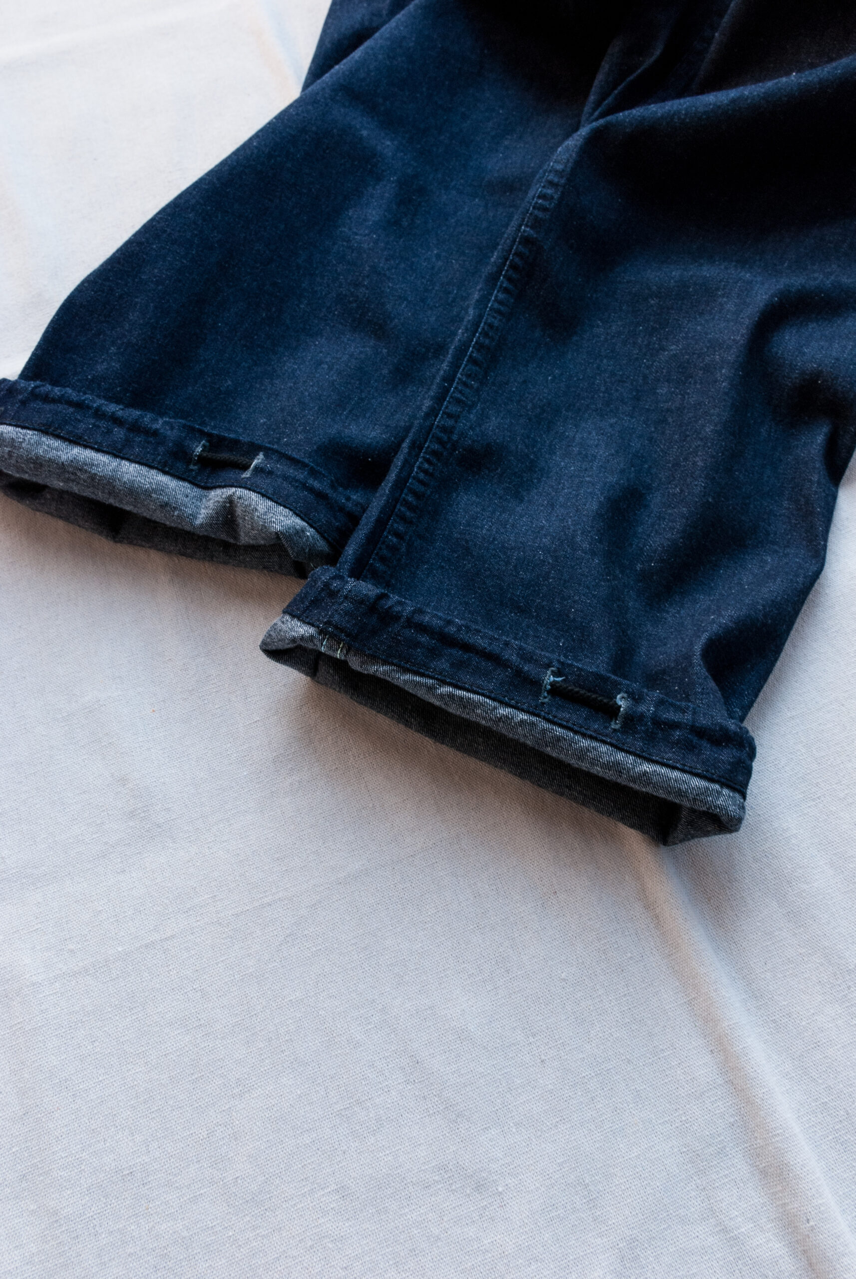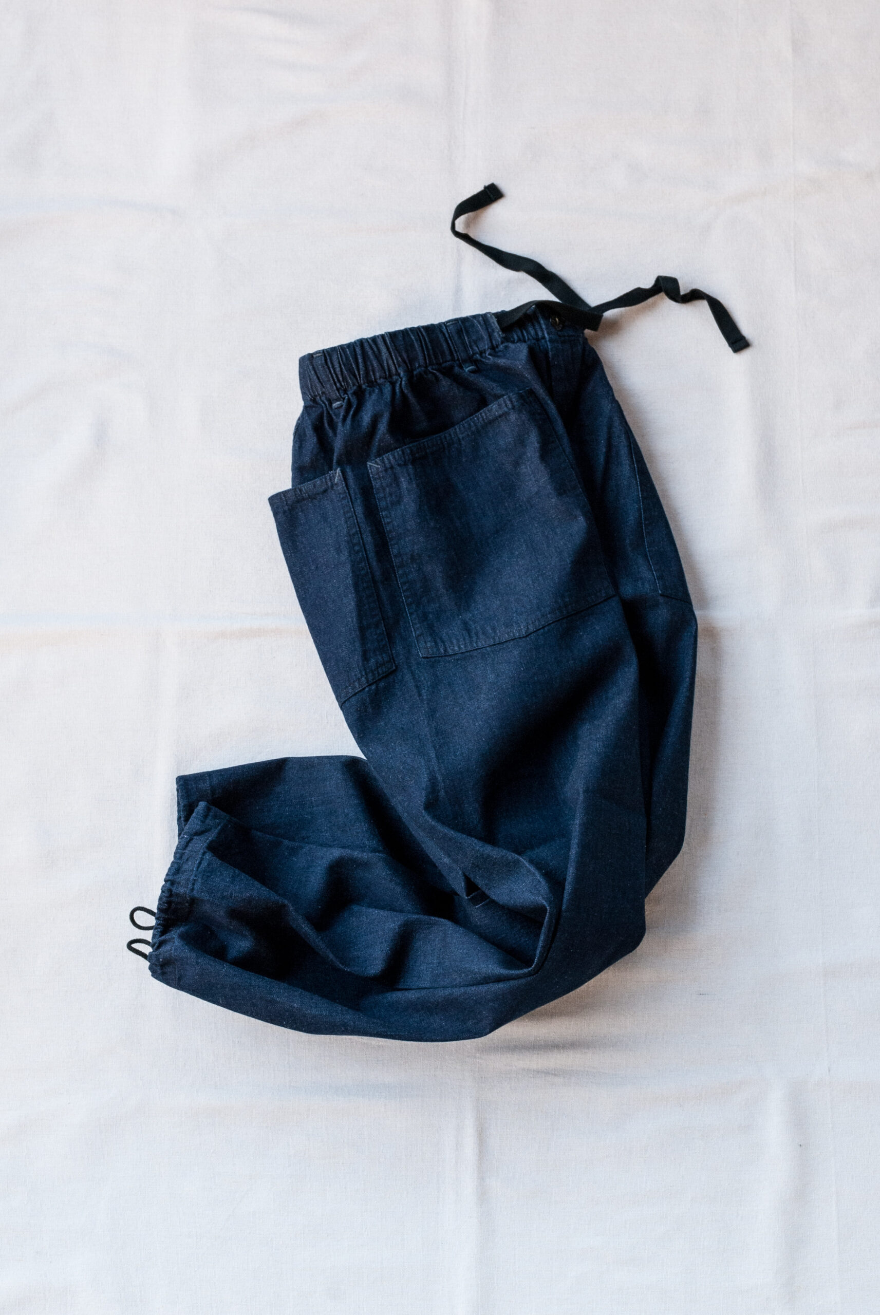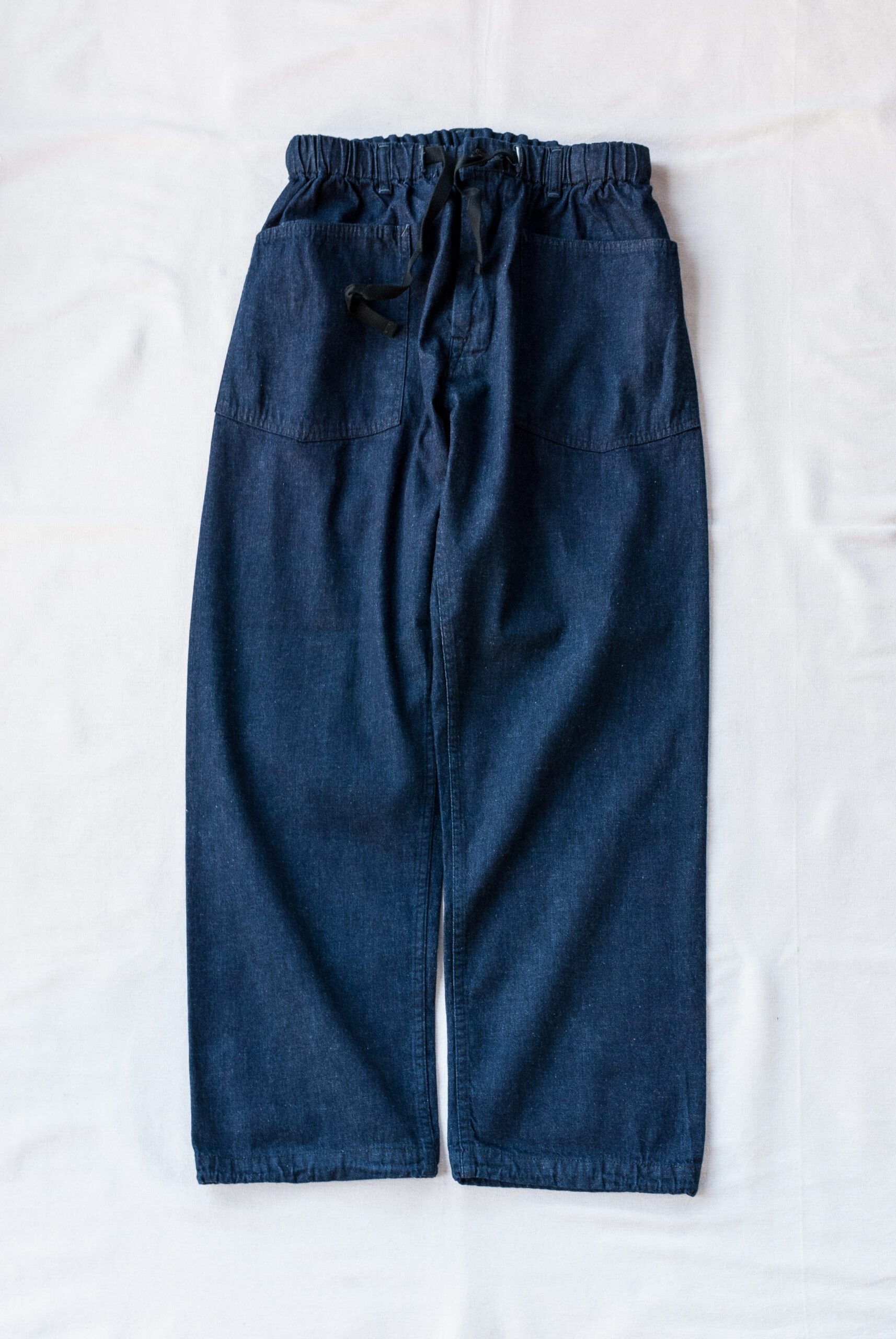 セレクトしたのが8ozのデニムなので、全体的な雰囲気はNAVY Pantsなのですが、ARMY Pantsのホームベース型パッチポケットとバックベルト、エラスティックウエスト、裾のドローコードといった、本来なかった仕様を追加し、歴史上有りそうで、無かった、ハイブリッドな軍パンに仕上がっております。