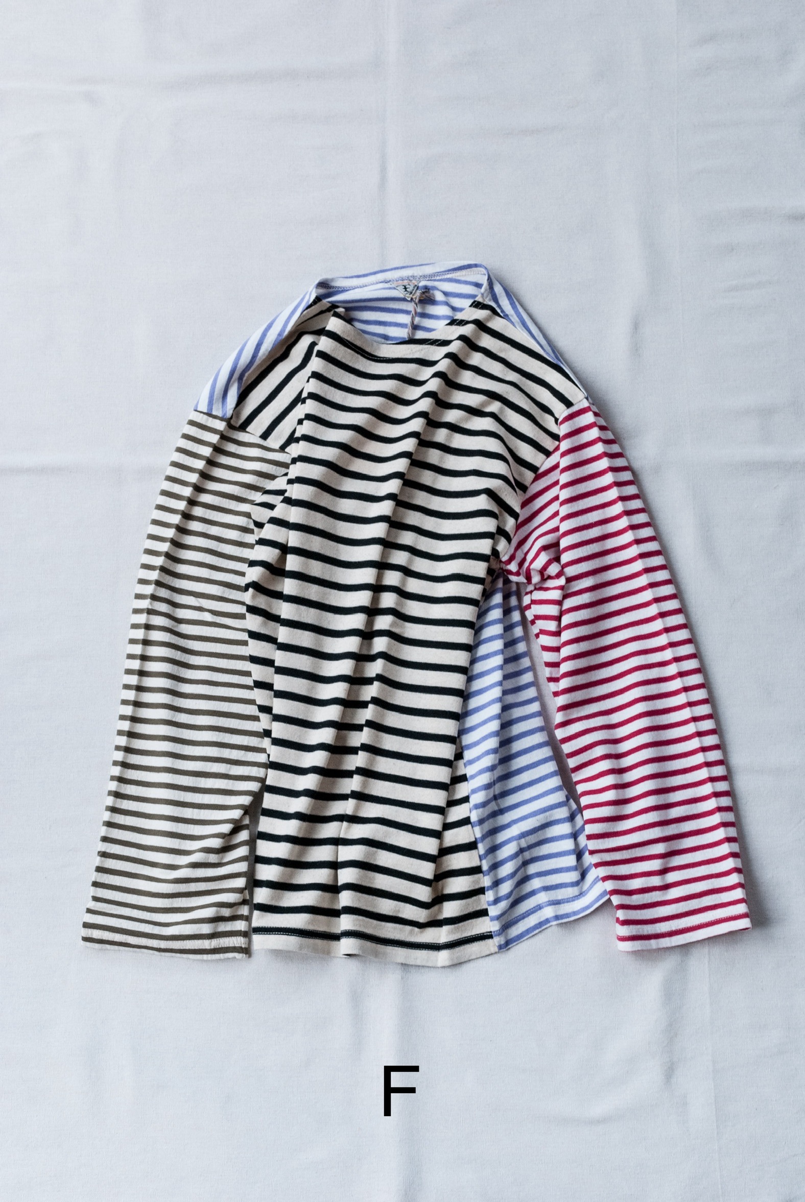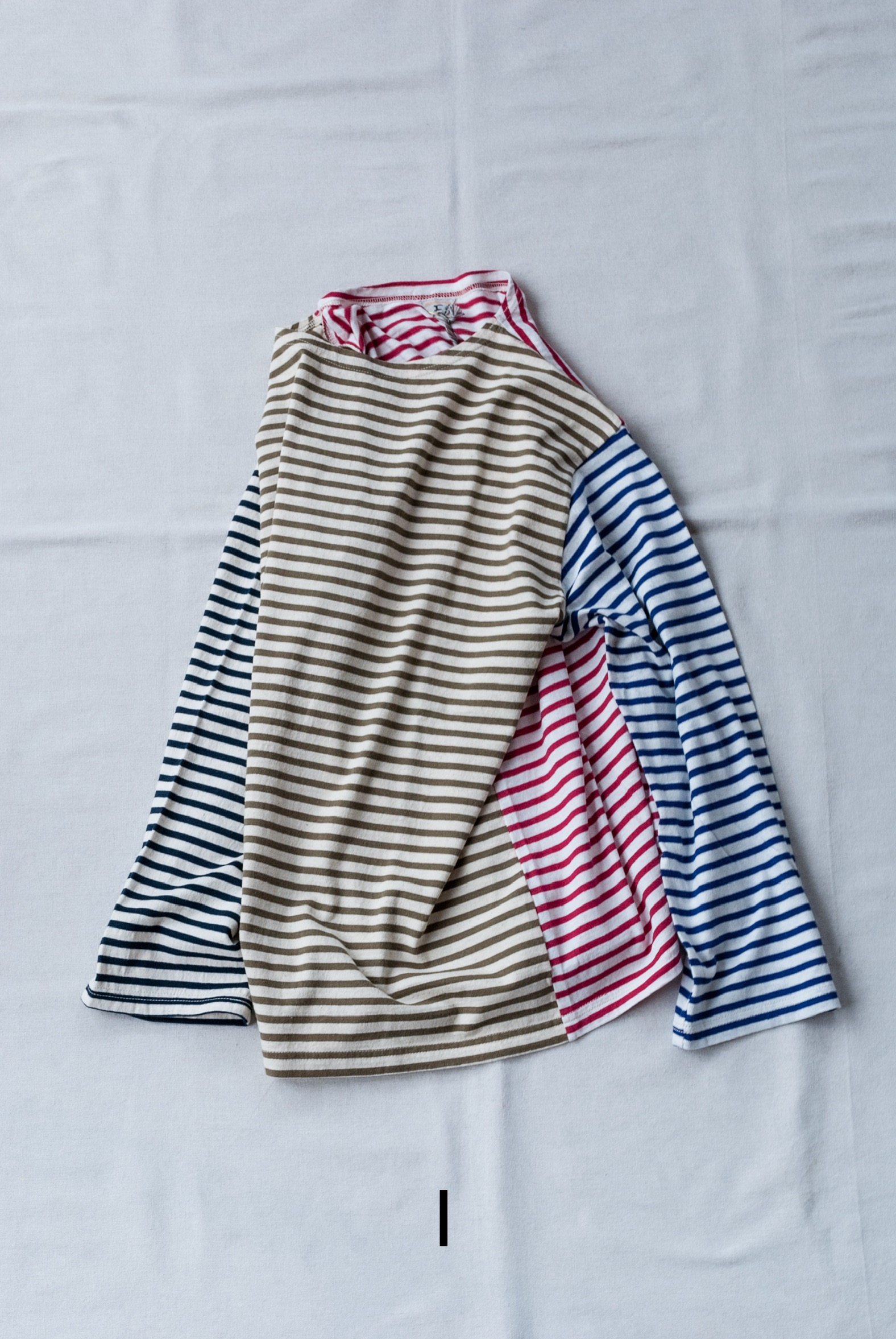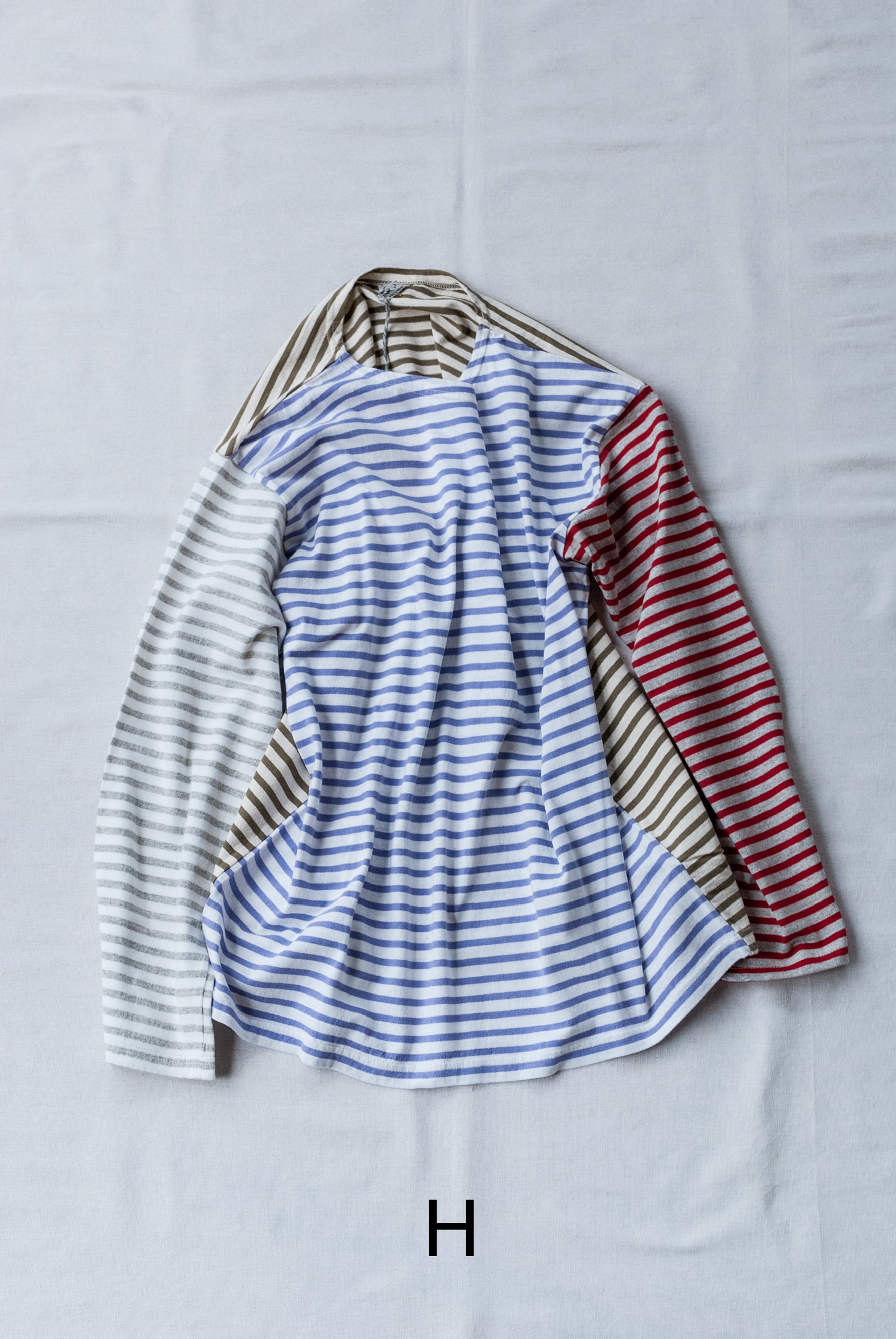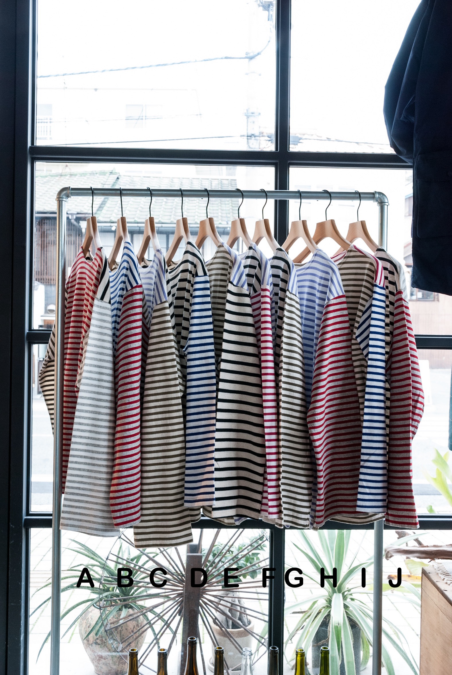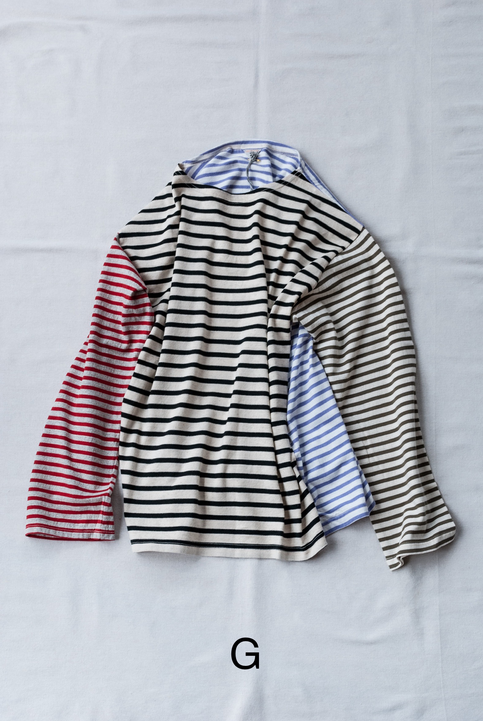 ボーダーの幅や、地の色が違う6種類の生地をアソートで組み立ててあるので、一着一着違った表情をしています。