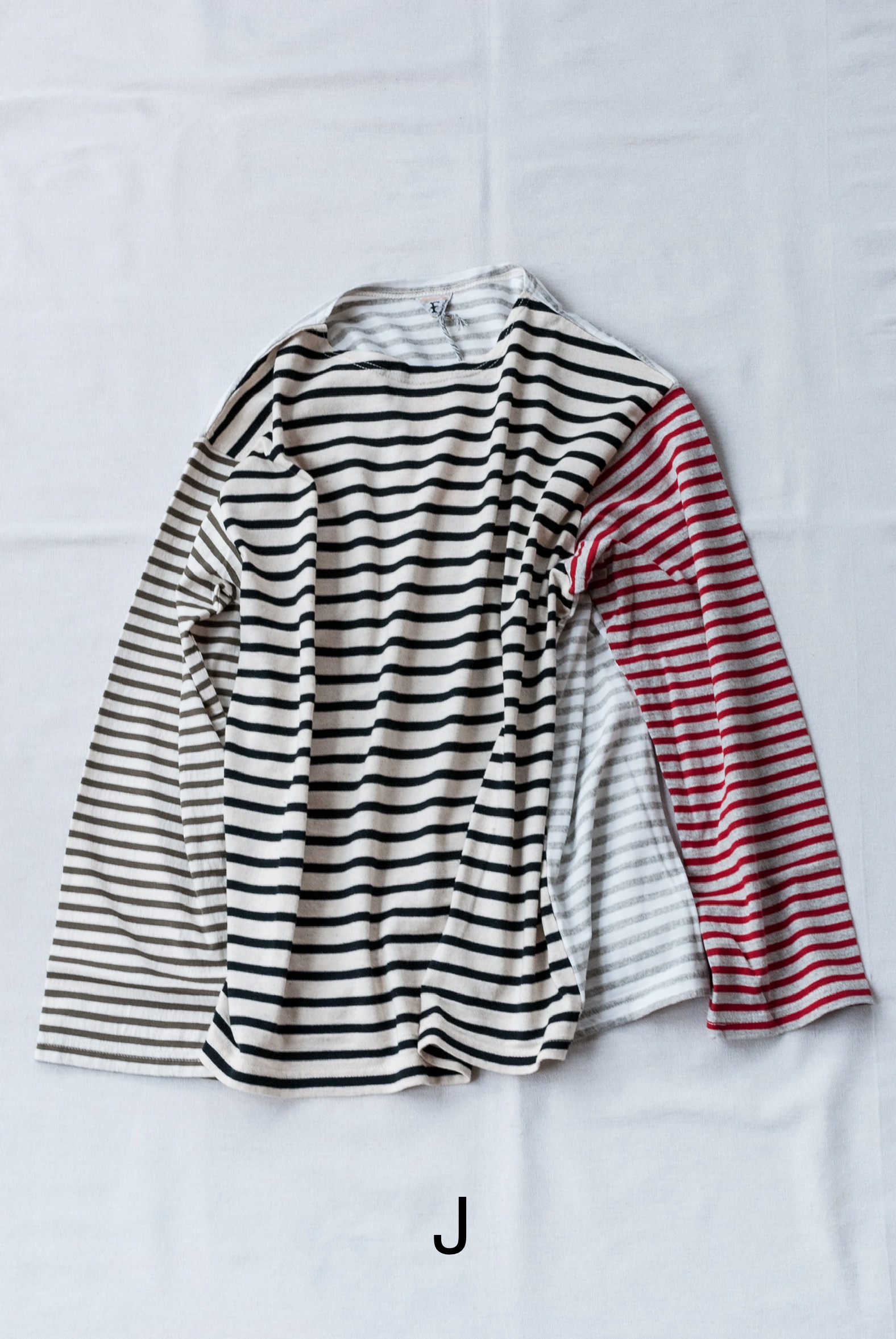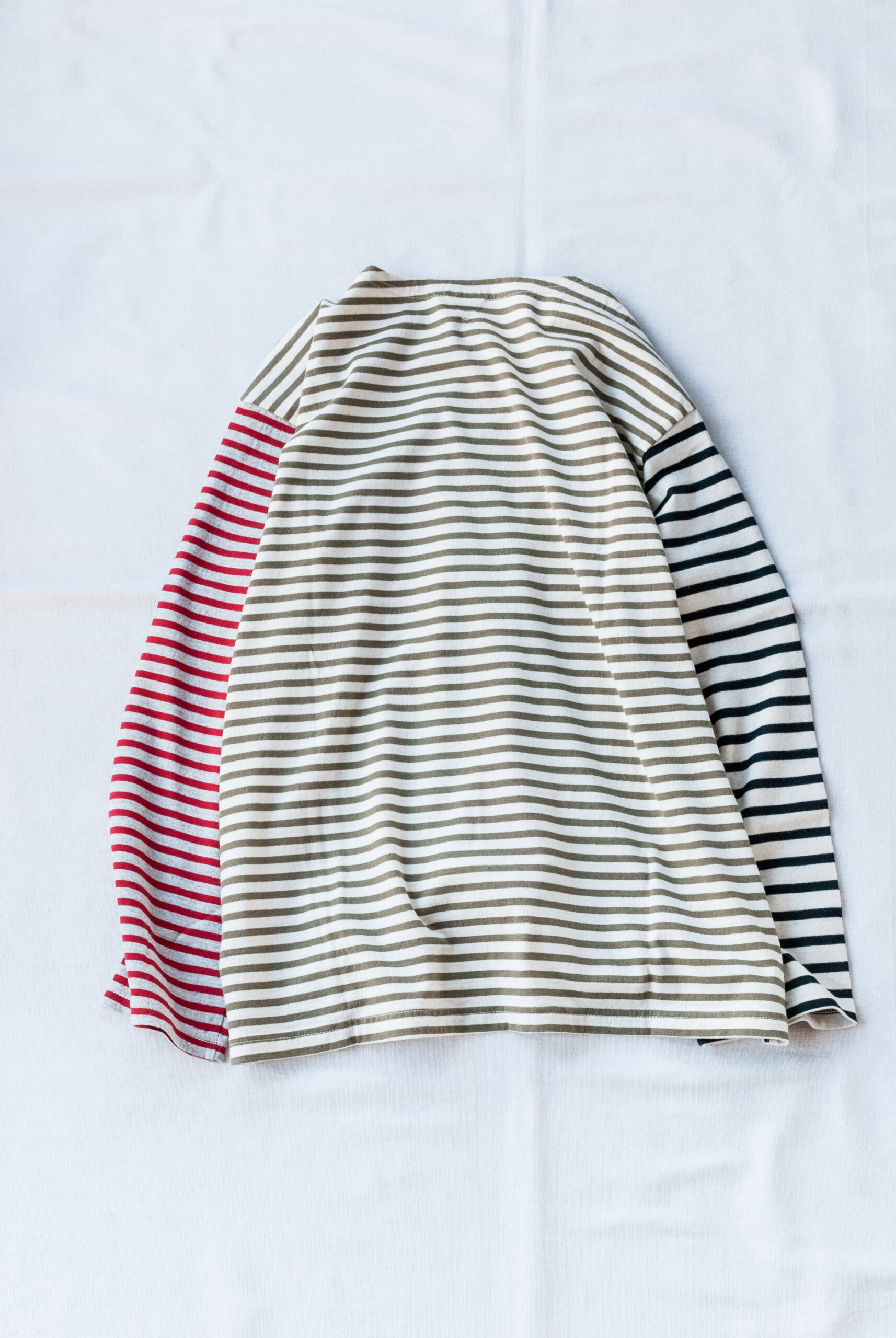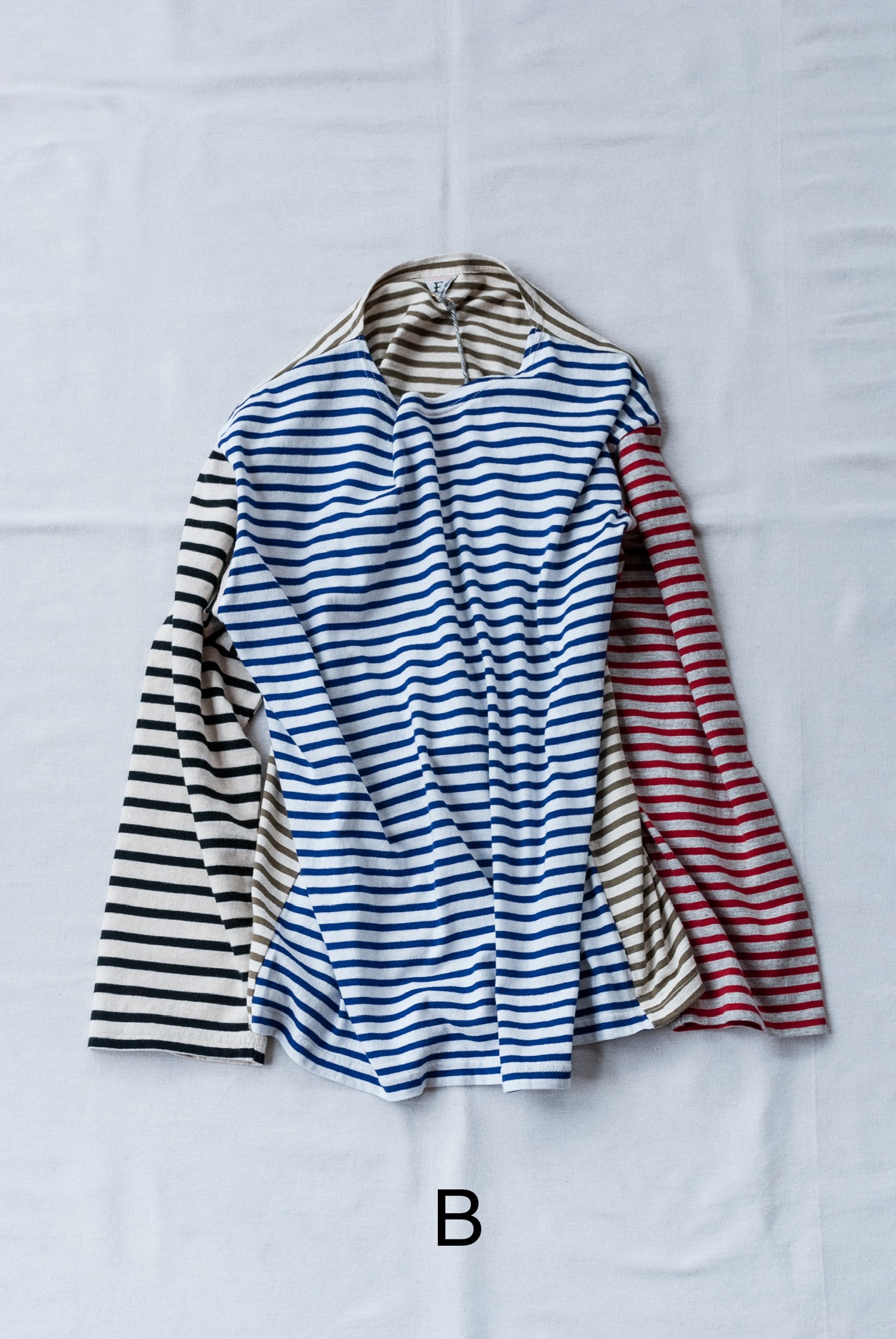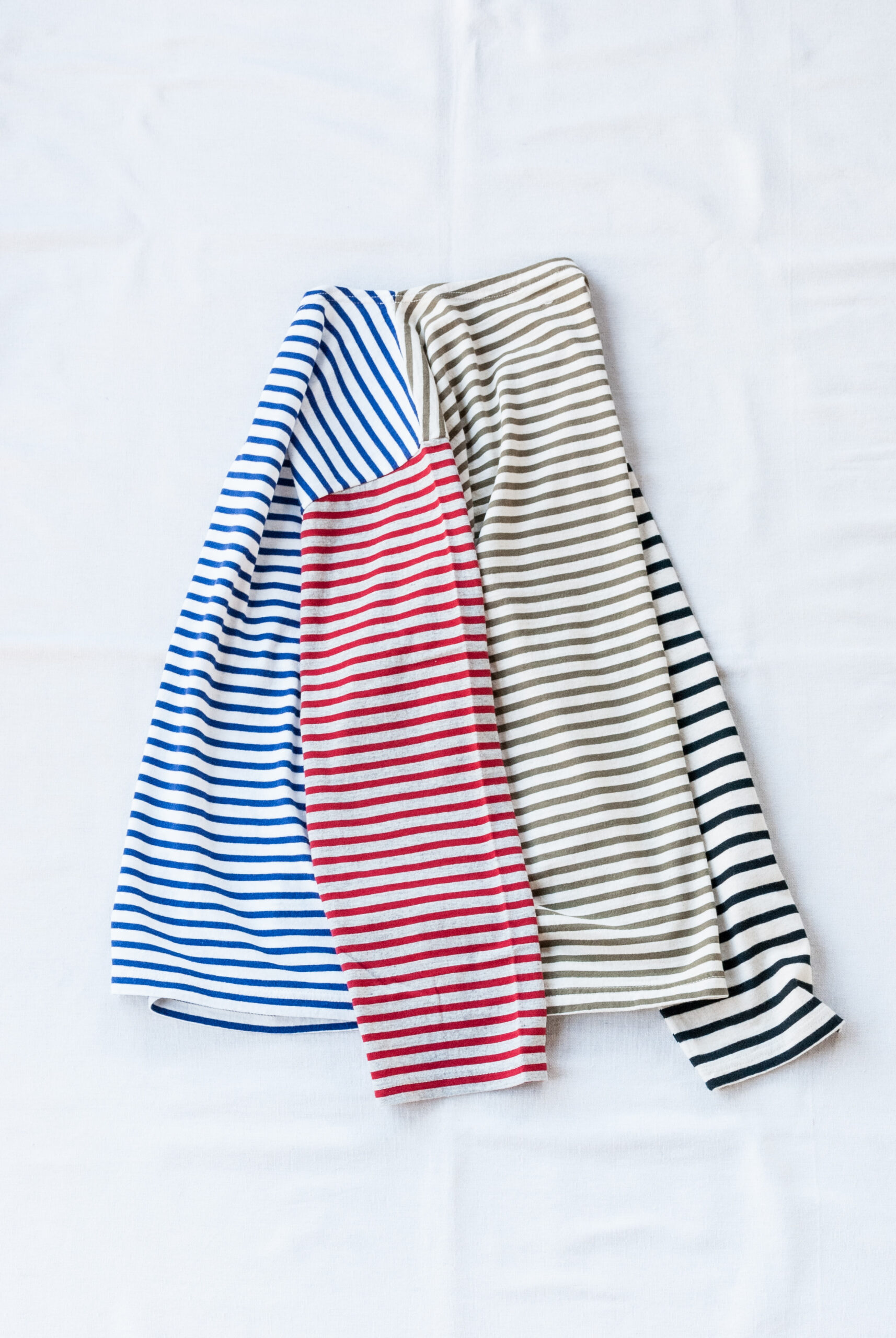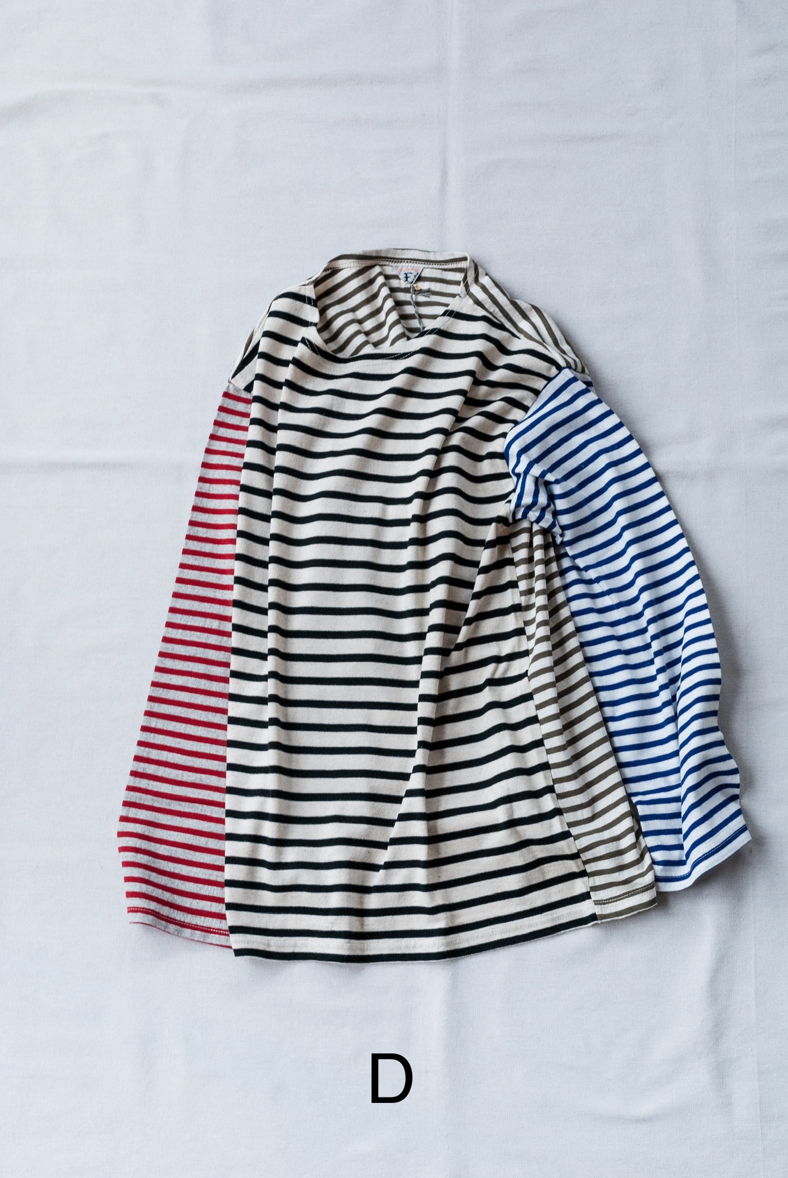 ボーダーの幅や、地の色が違う6種類の生地をアソートで組み立ててあるので、一着一着違った表情をしています。