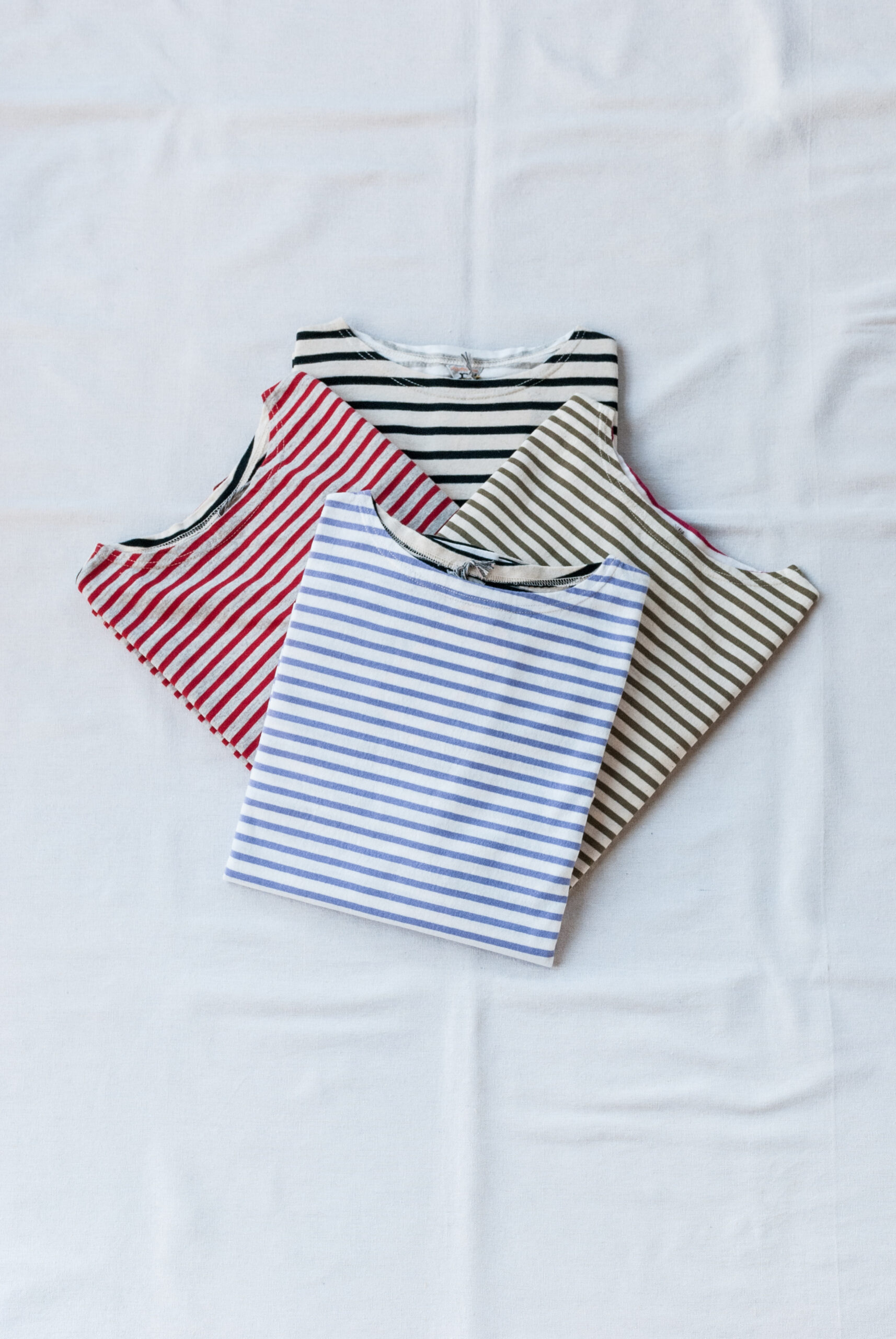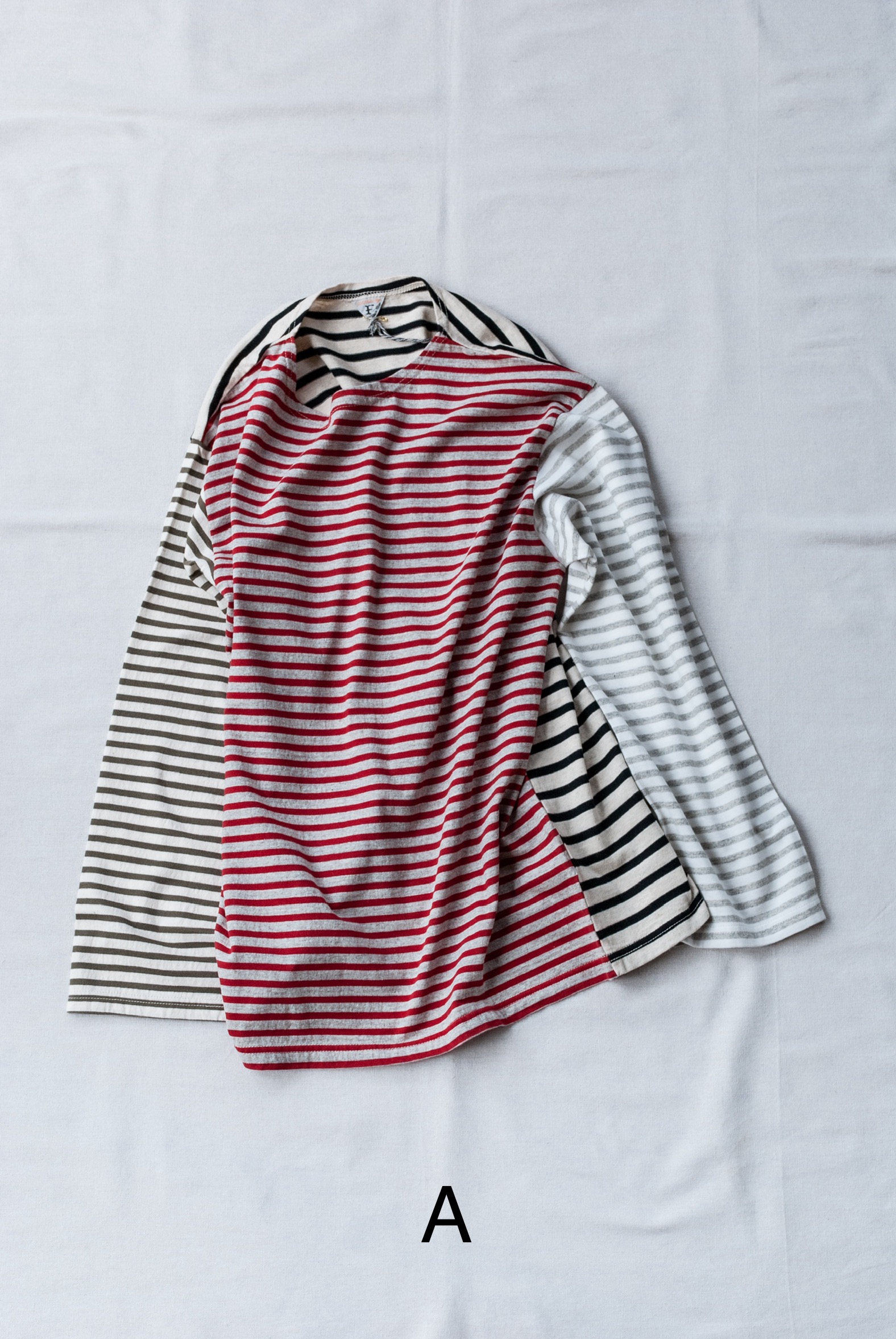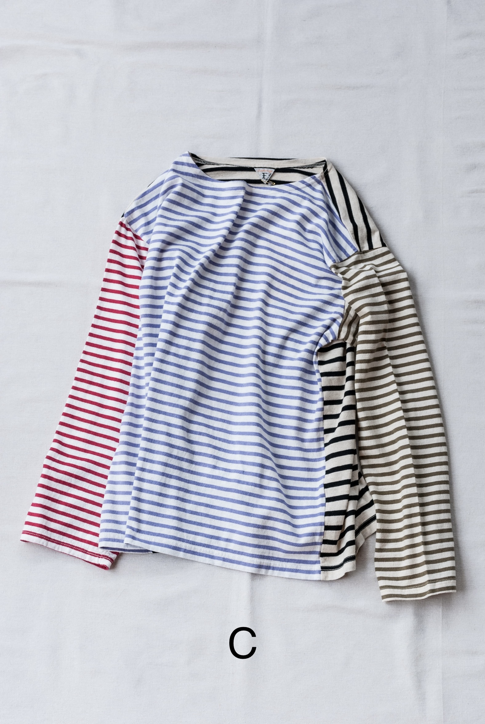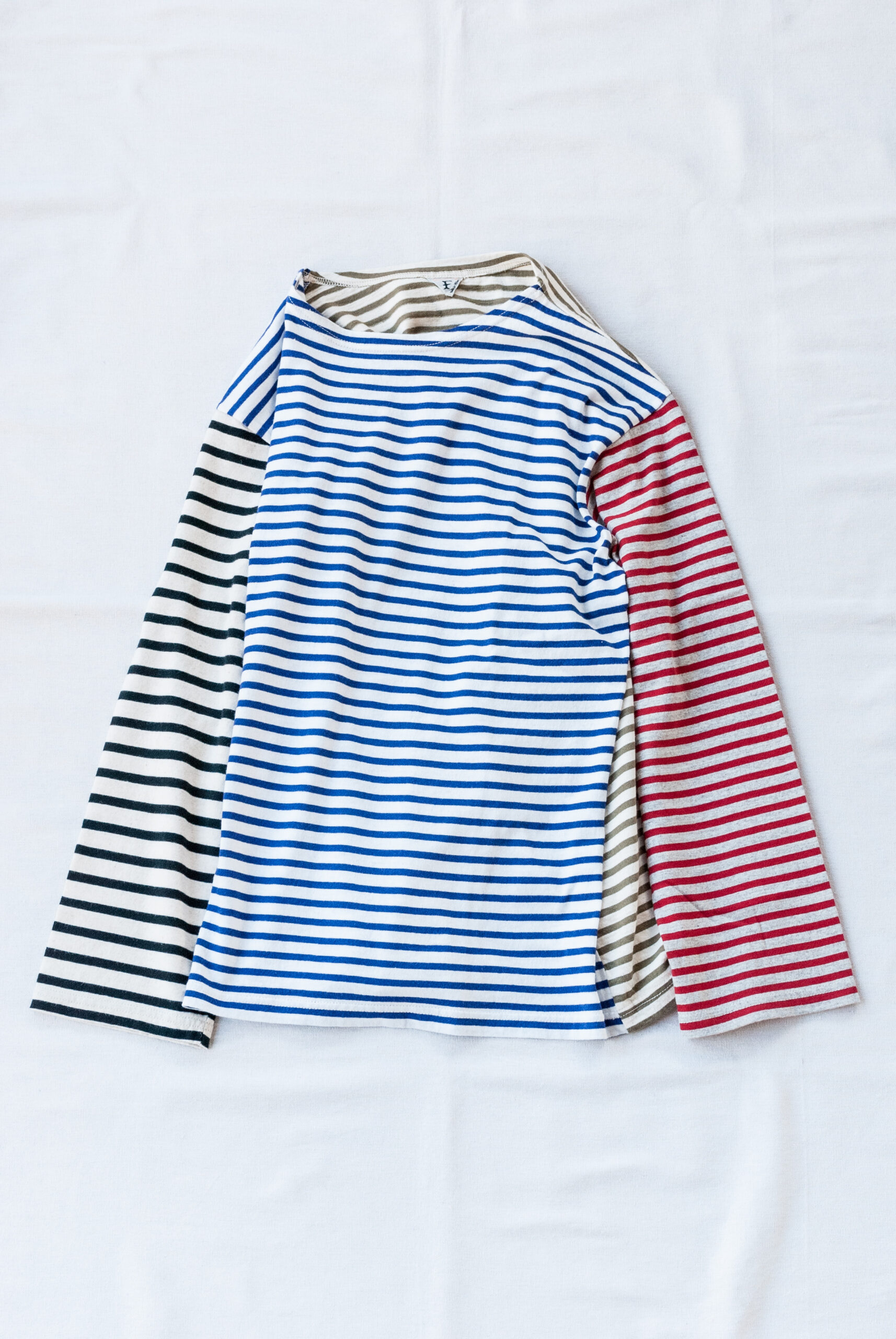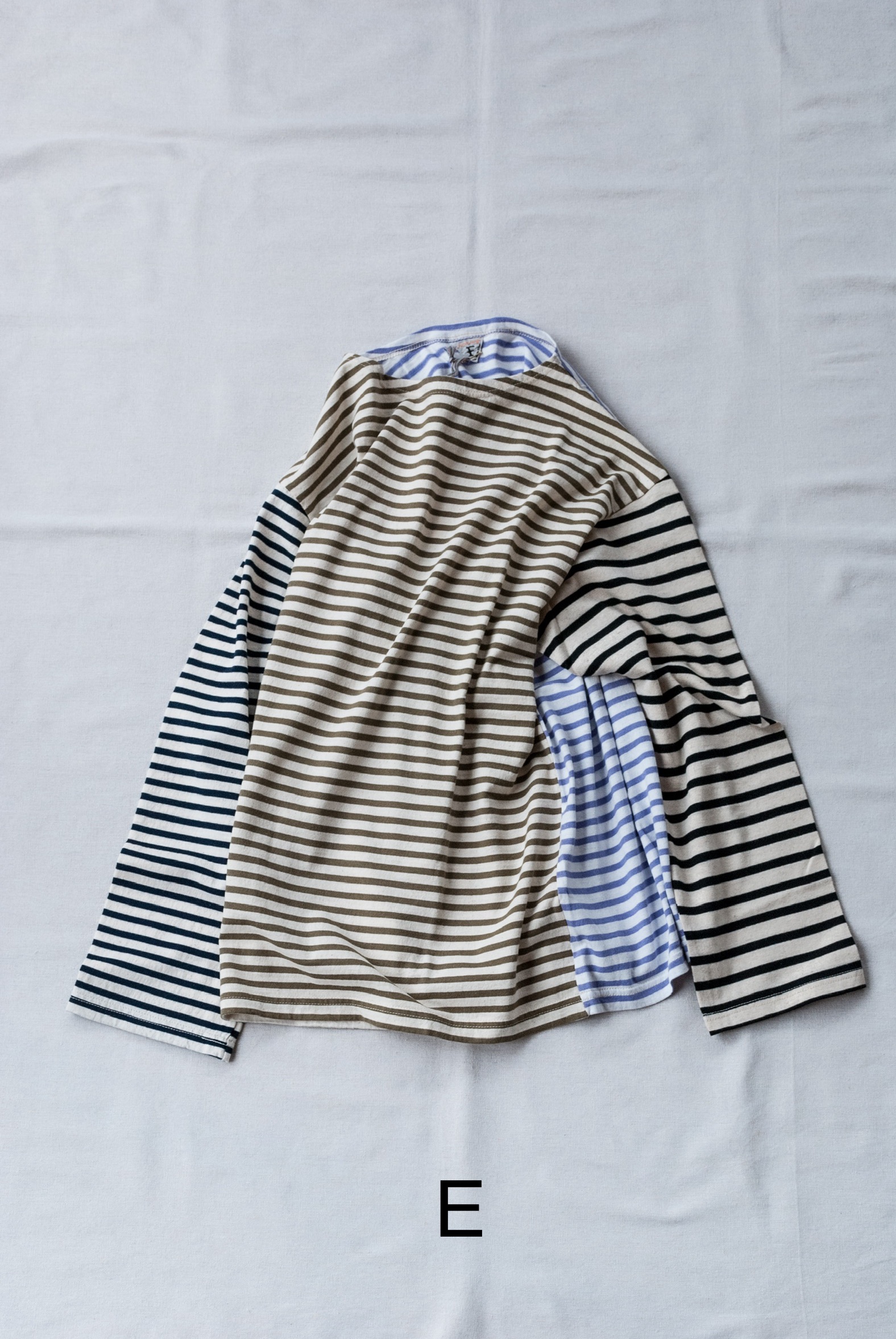 ボーダーの幅や、地の色が違う6種類の生地をアソートで組み立ててあるので、一着一着違った表情をしています。