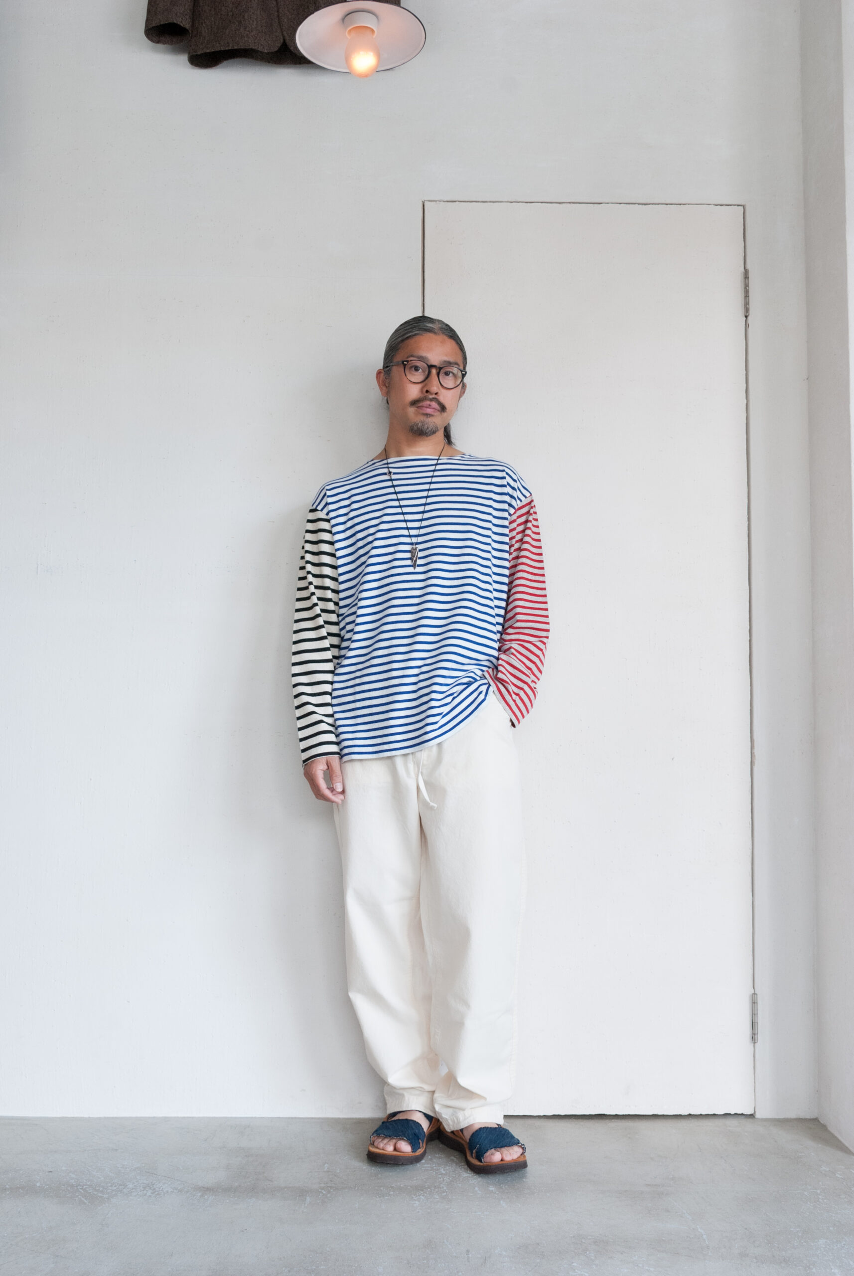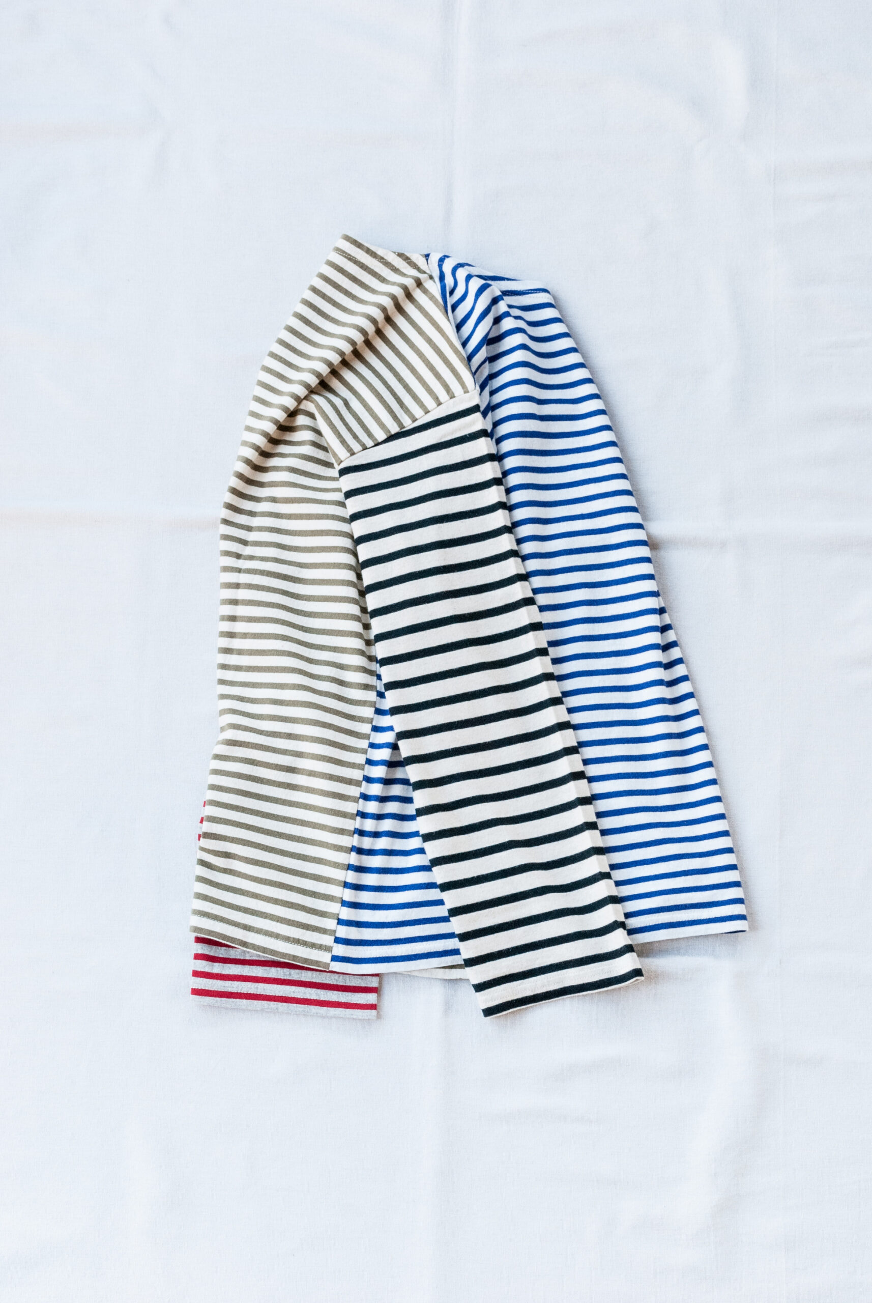 生地は厚くもなく薄すぎない、ちょうど良い塩梅の設定で、アフリカ東部のタンザニアで育まれたオーガニックコットンを空気の力で糸の紡績し、特殊な編み機で風合いよく編みたてたボーダー天竺を使っています。