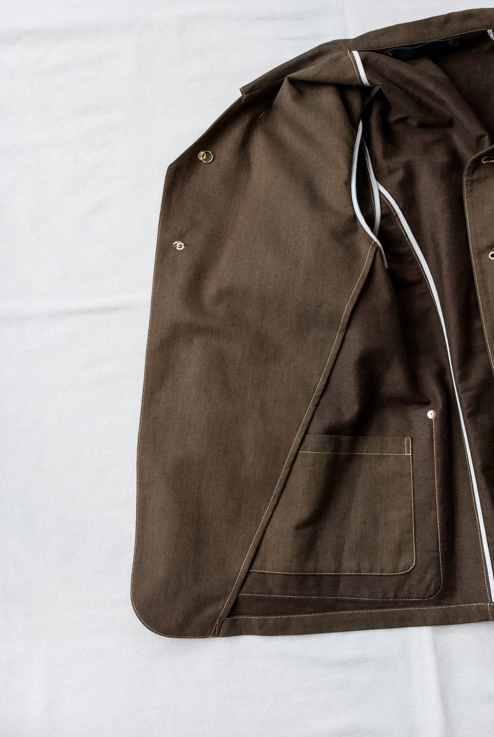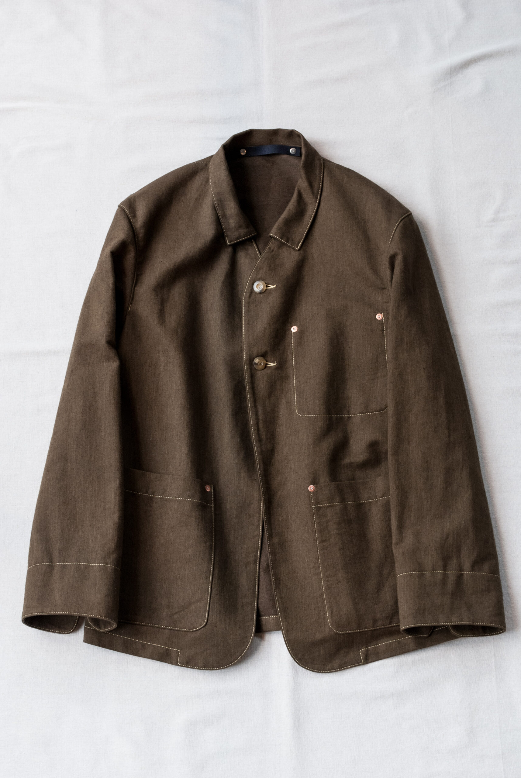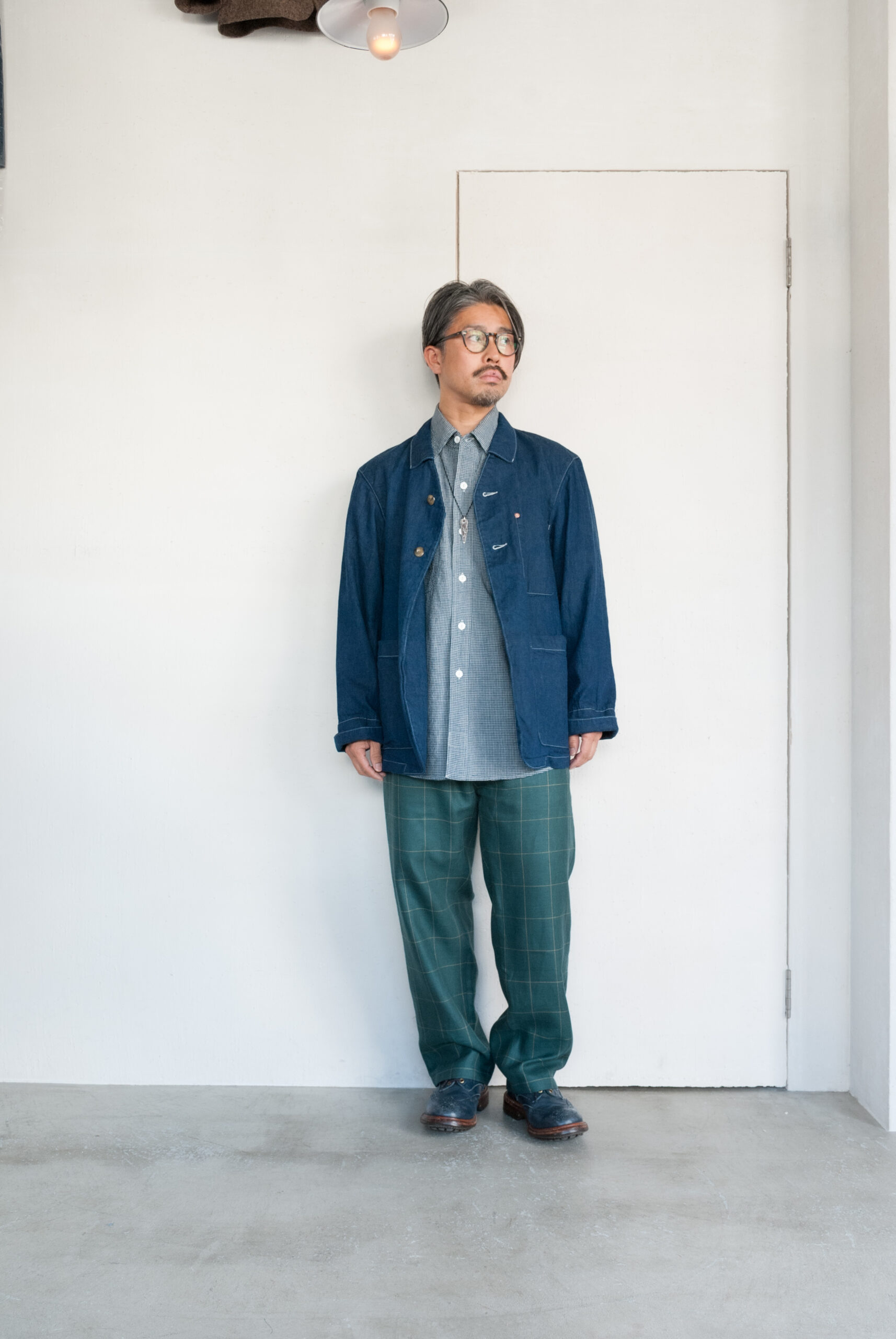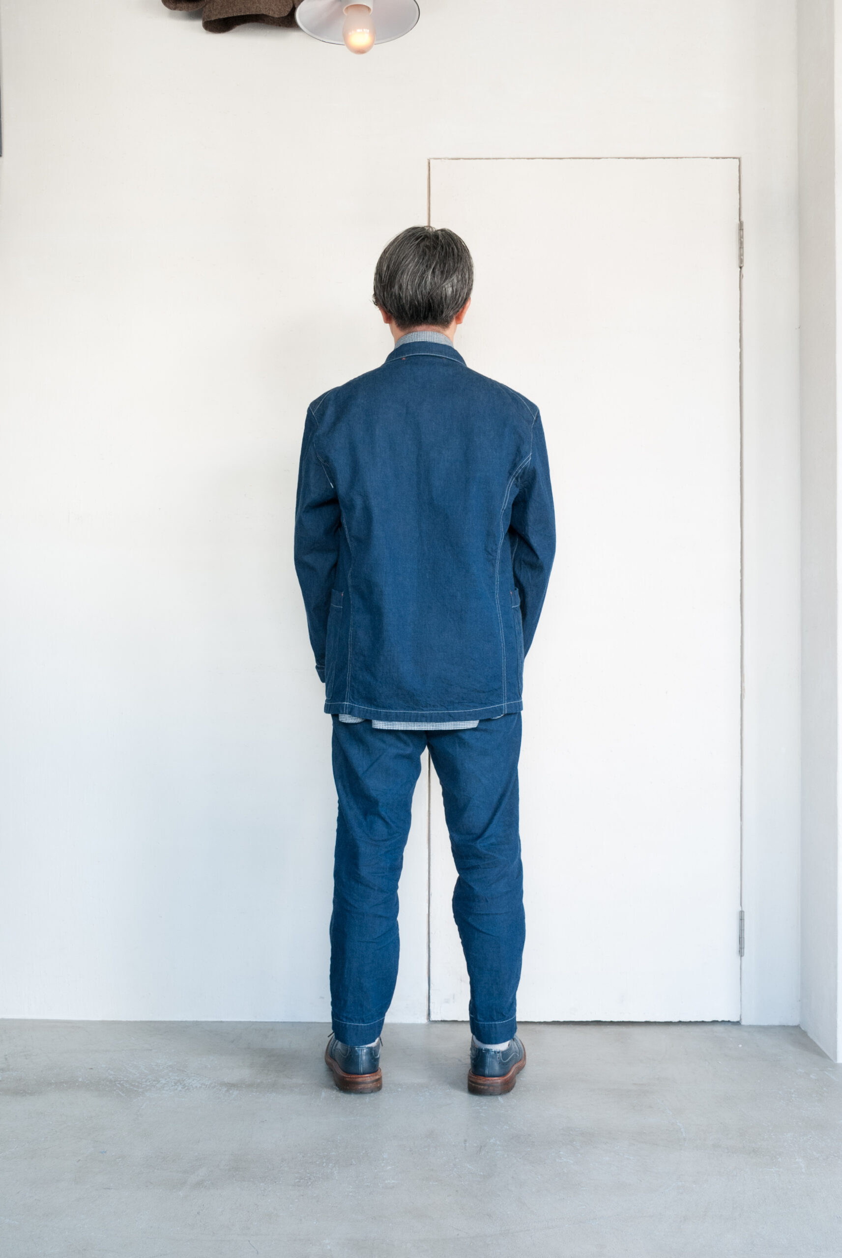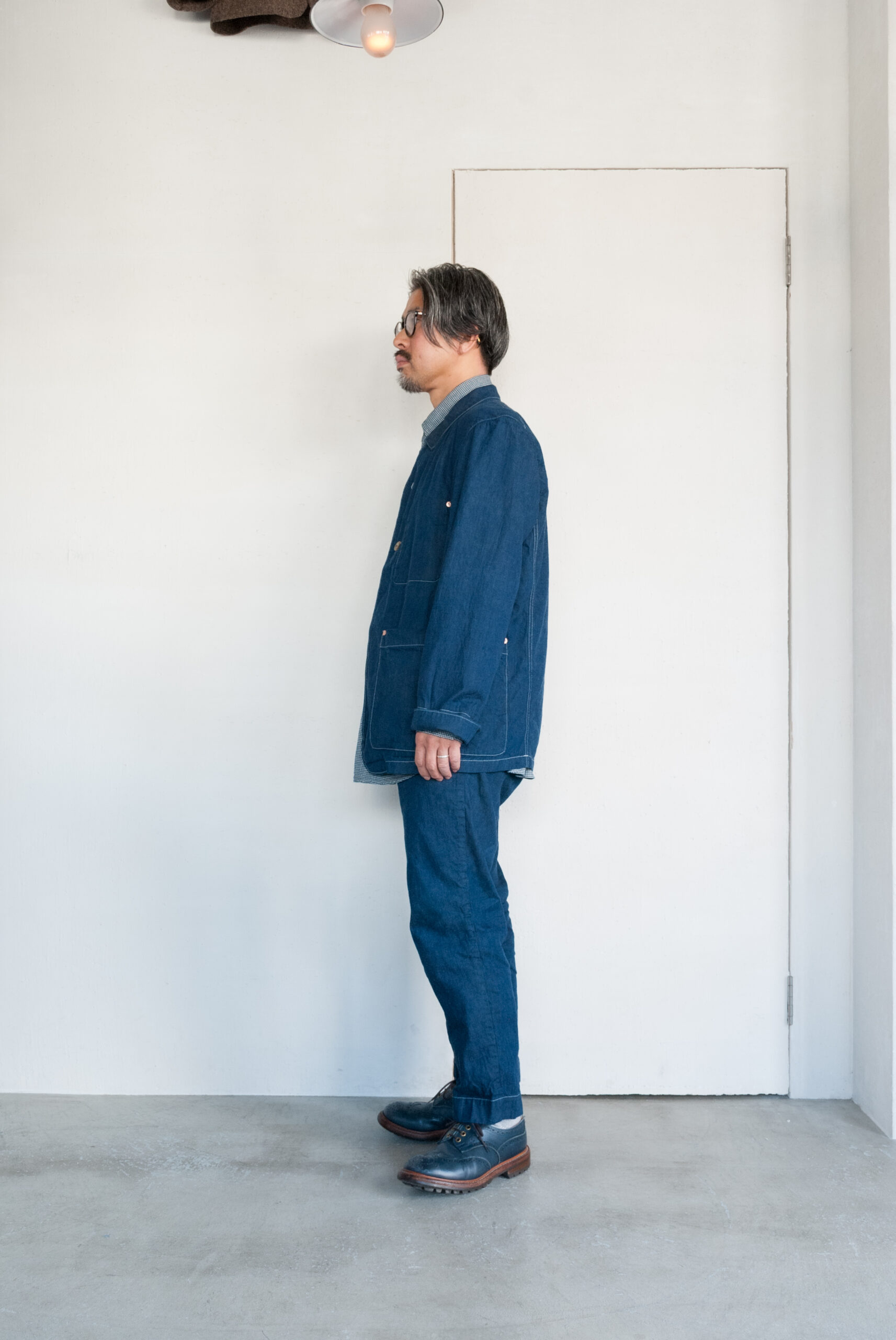 刻印の無いカッパーリベットや、ぐるっと腰を覆うように付いているポケットを機能的と捉えカバーオールととるか、腕のダーツや閂止めで縫い付けられた襟をラペルのイメージで捉えテーラードのデニムジャケットと捉えるかでも、楽しみ方は変わってきます。