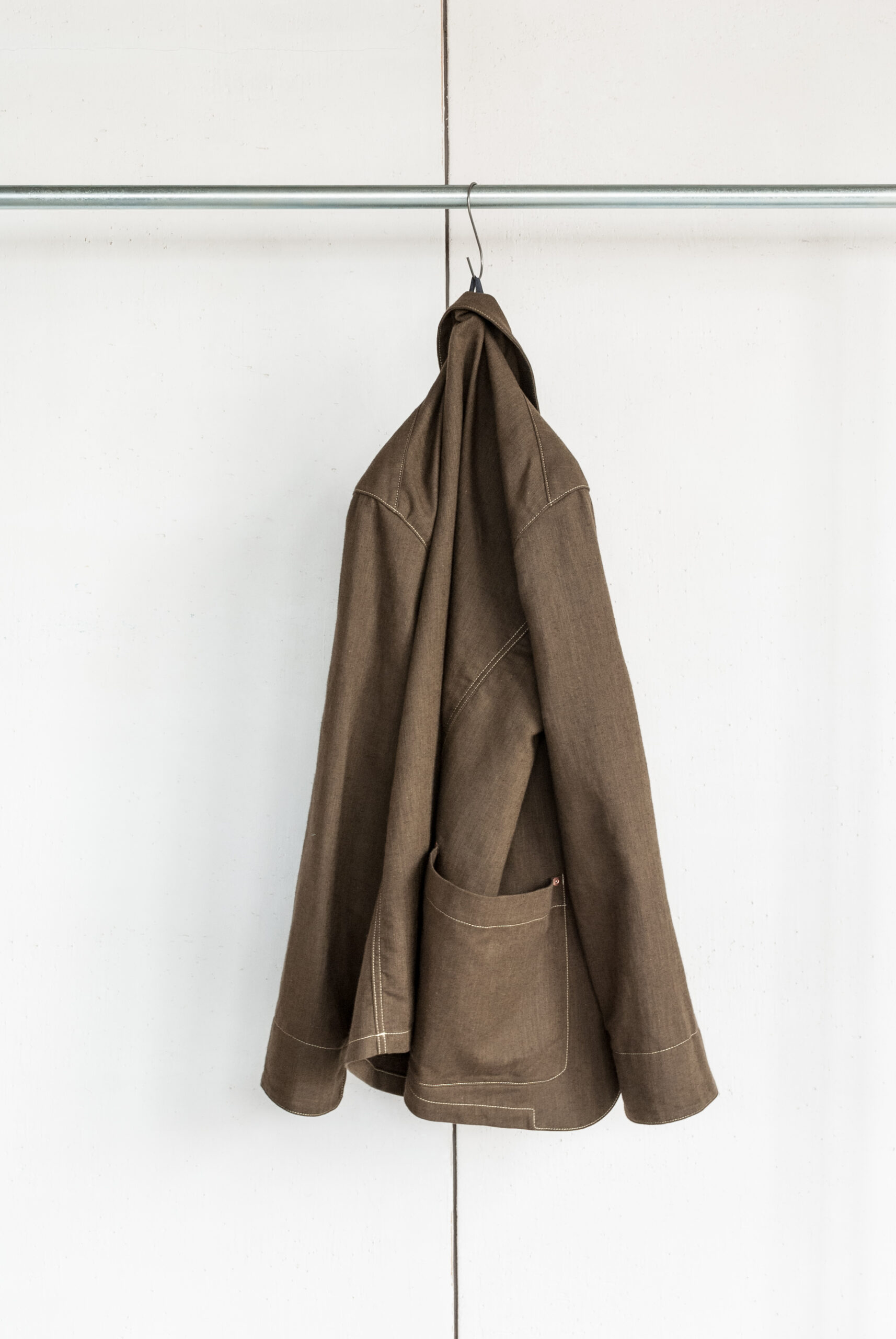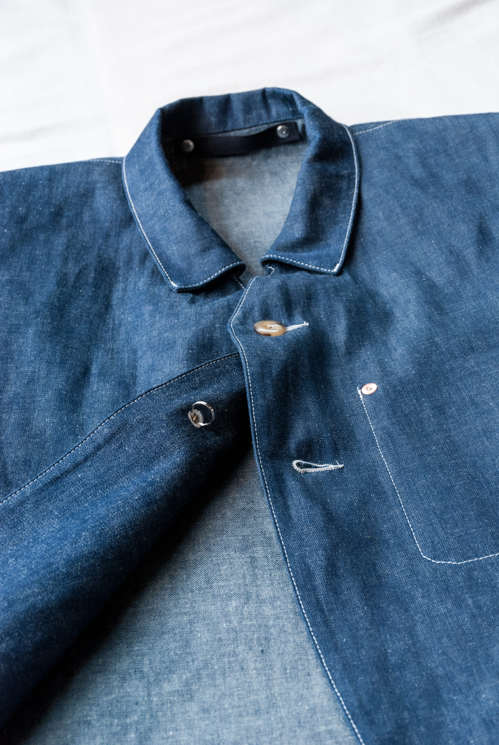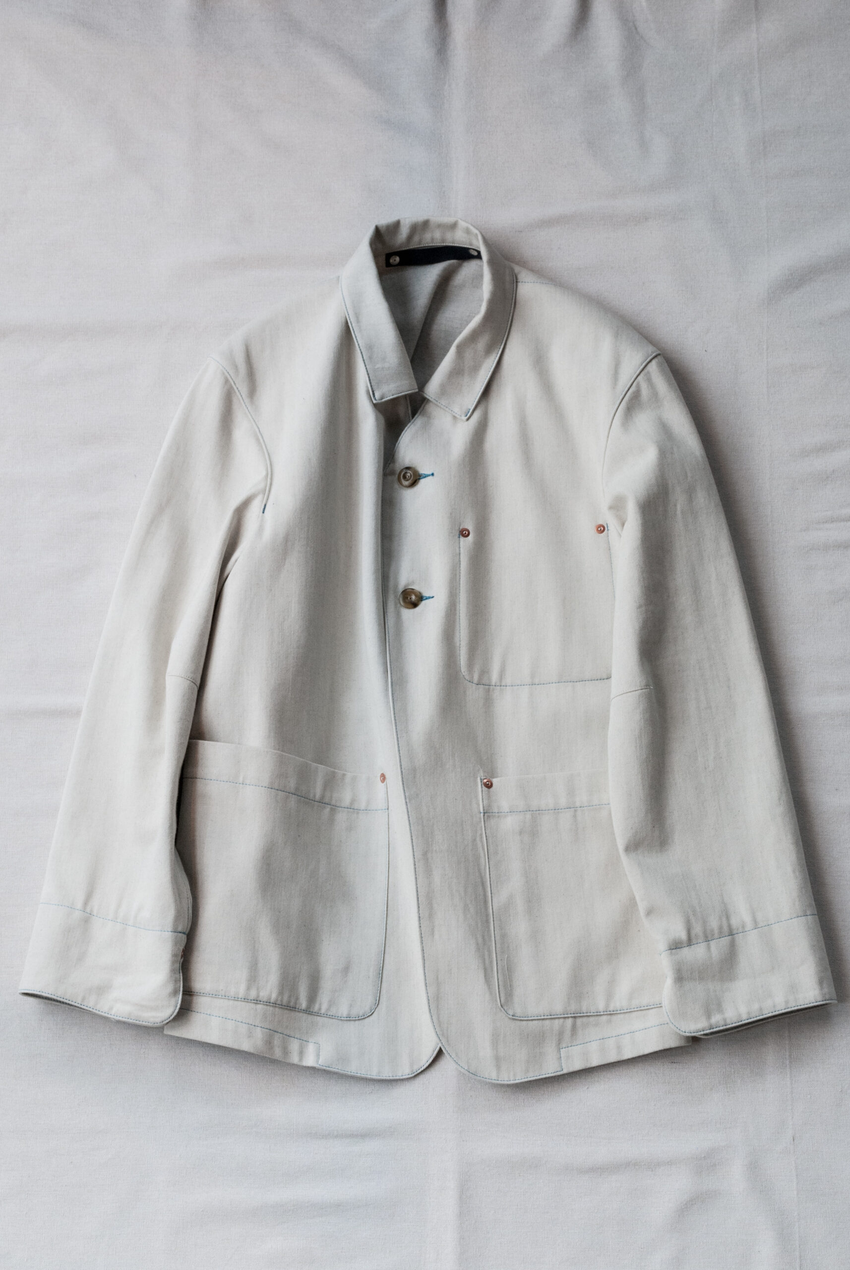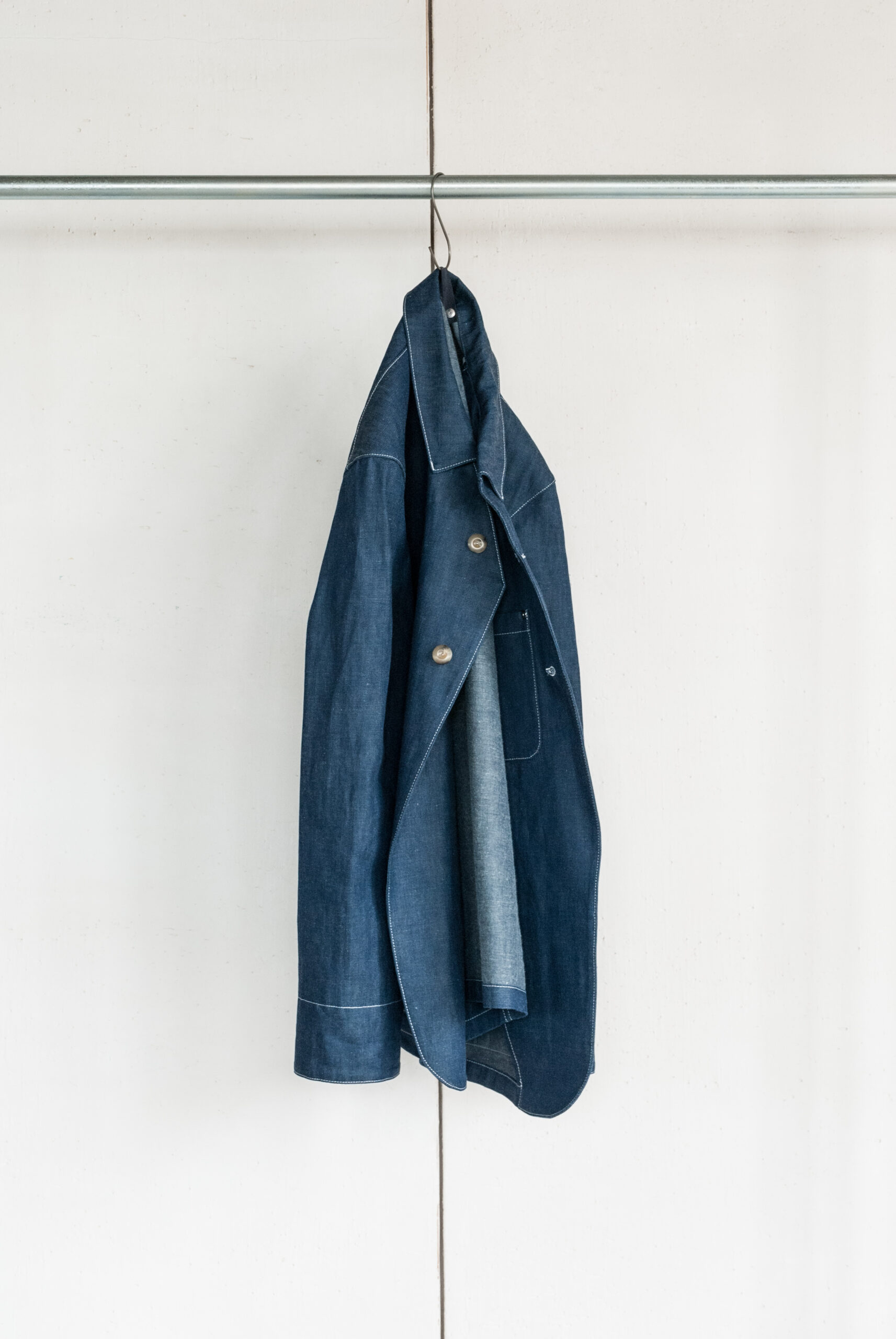 デニムは10オンスくらいの厚みですが、糊付けされているのでリジッド(未洗)では少し硬く、ハンガーに吊っていると肩まわりが妙に浮いてしまい、正直写真うつりもそんなに良くない(すみません)。ただ、一度袖を通してみると見え方が変わります。