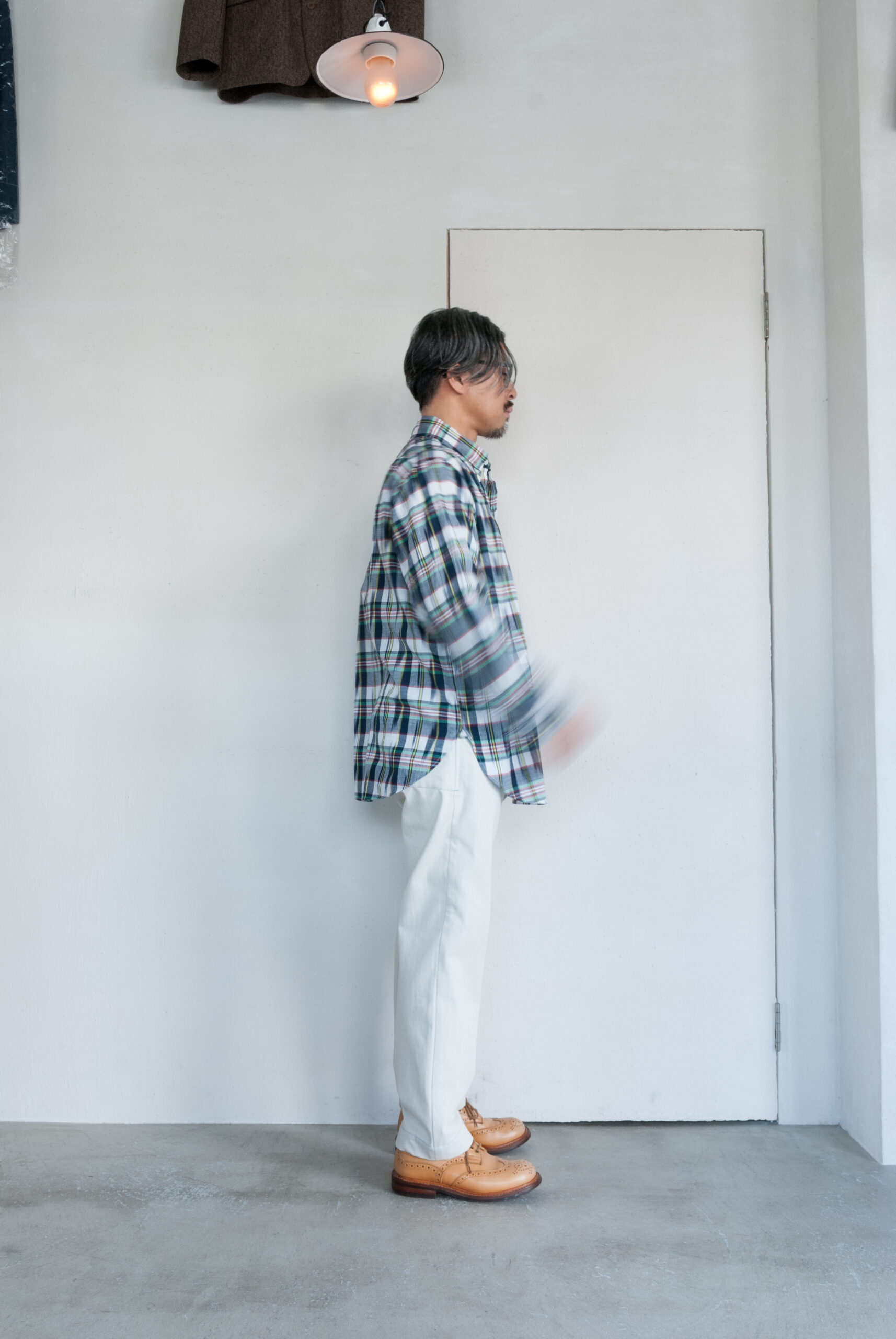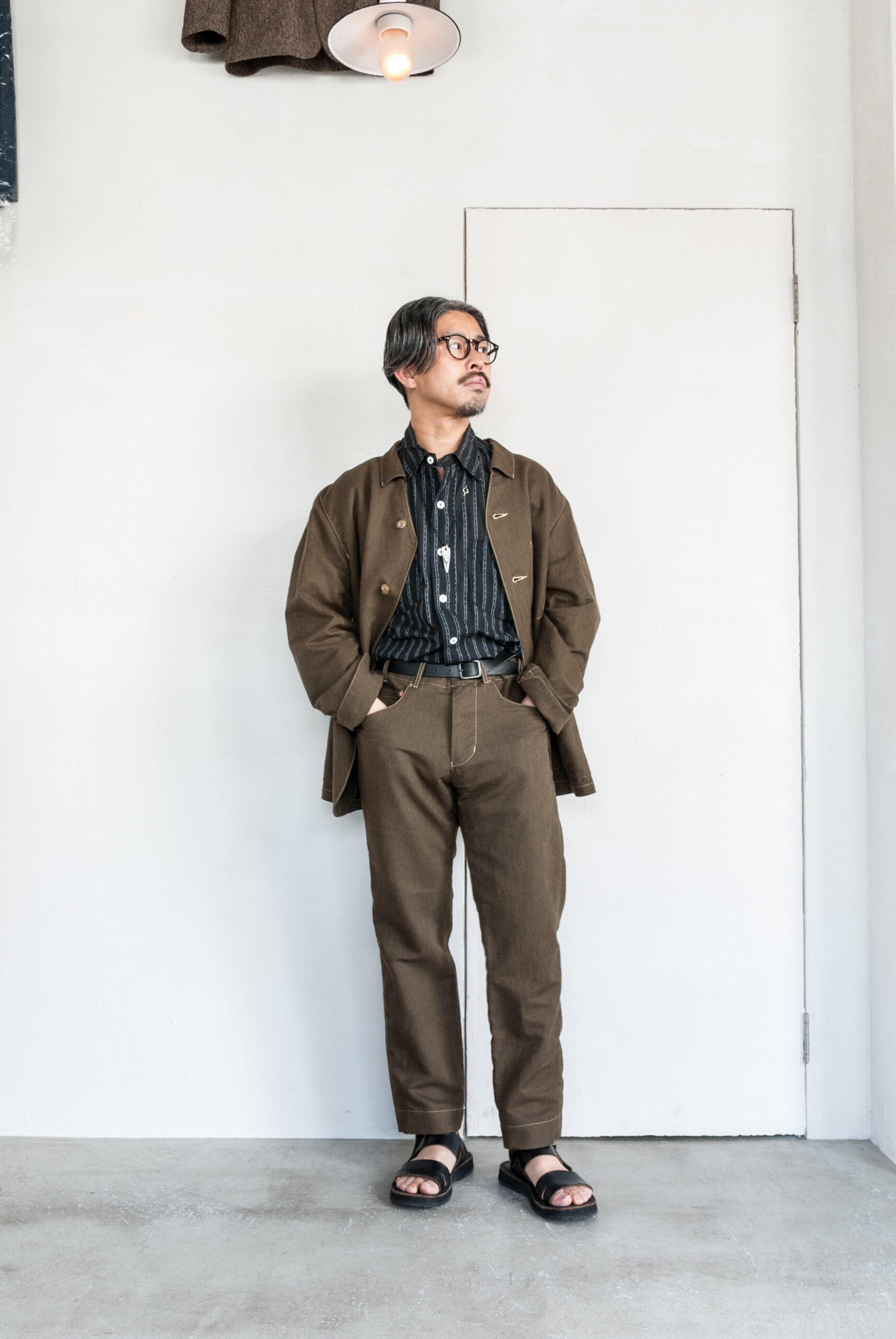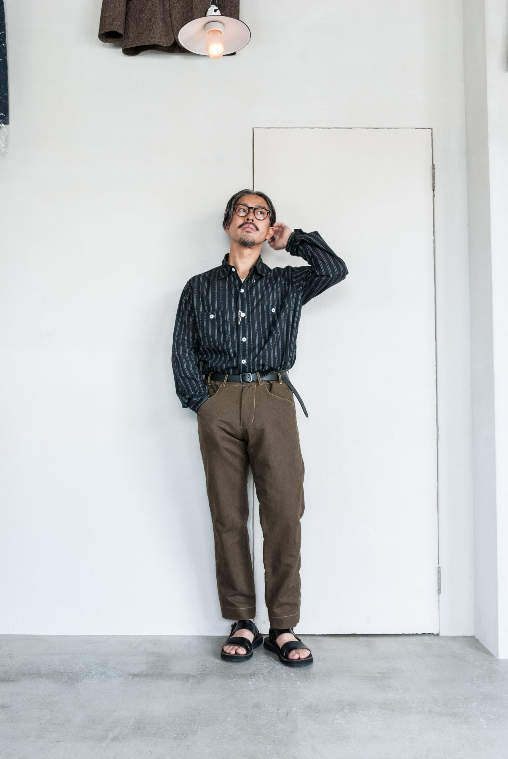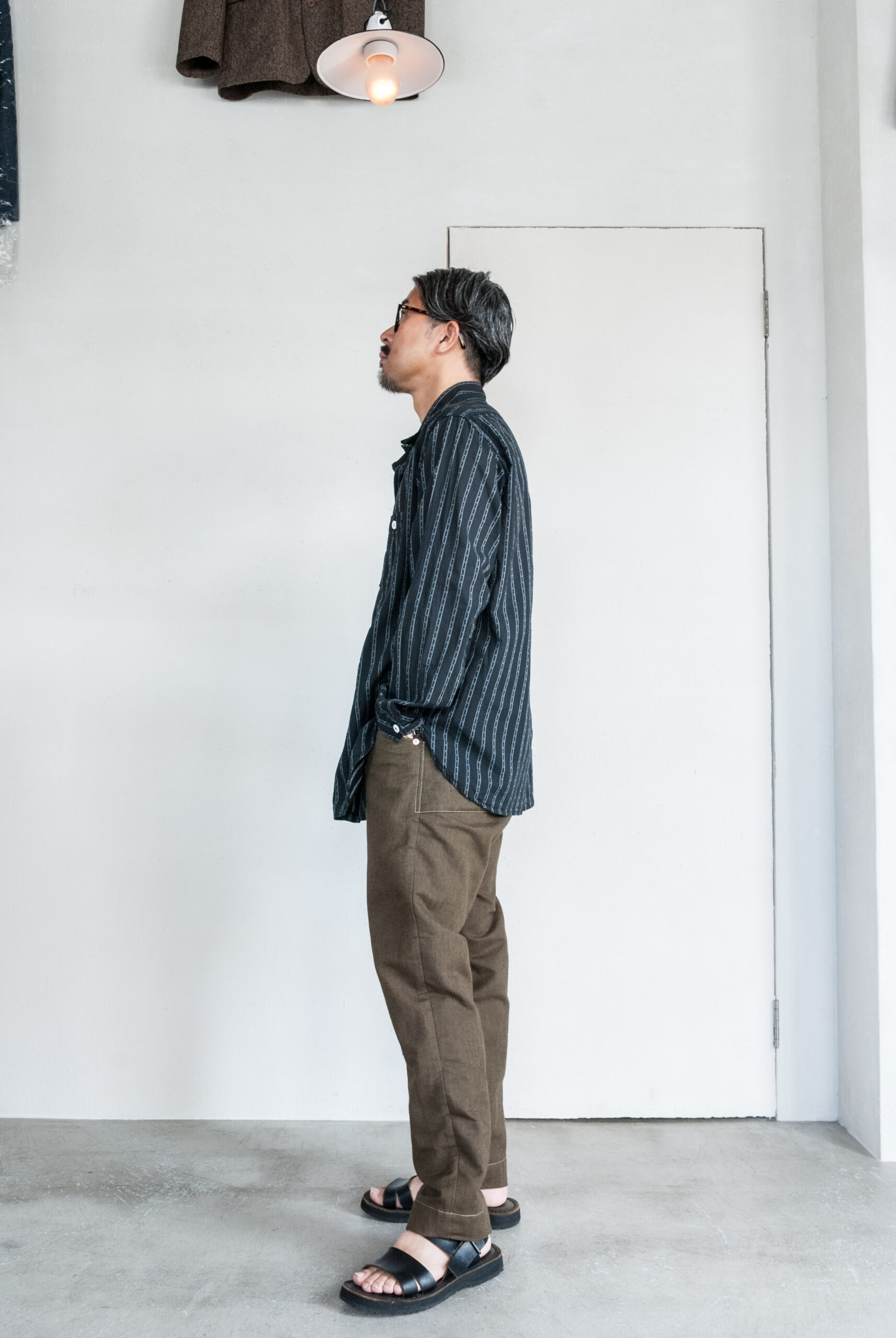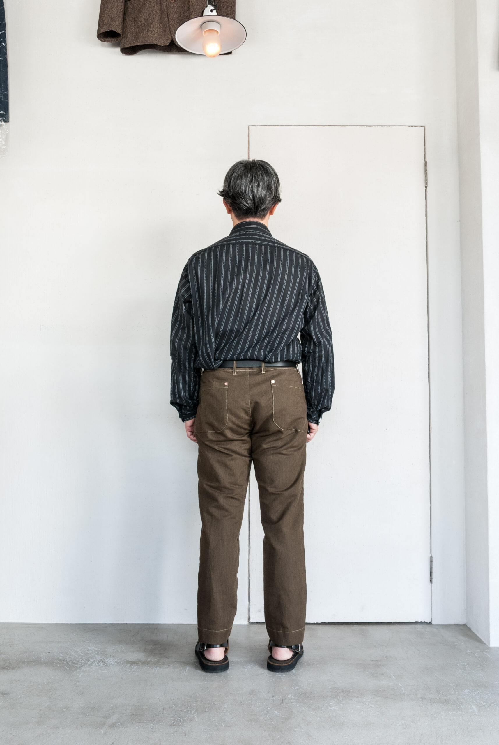 すっきりとしたテーパード感に対して腰まわりのゆとりを楽しむような穿き方がこのパンツにはあってる気がします。