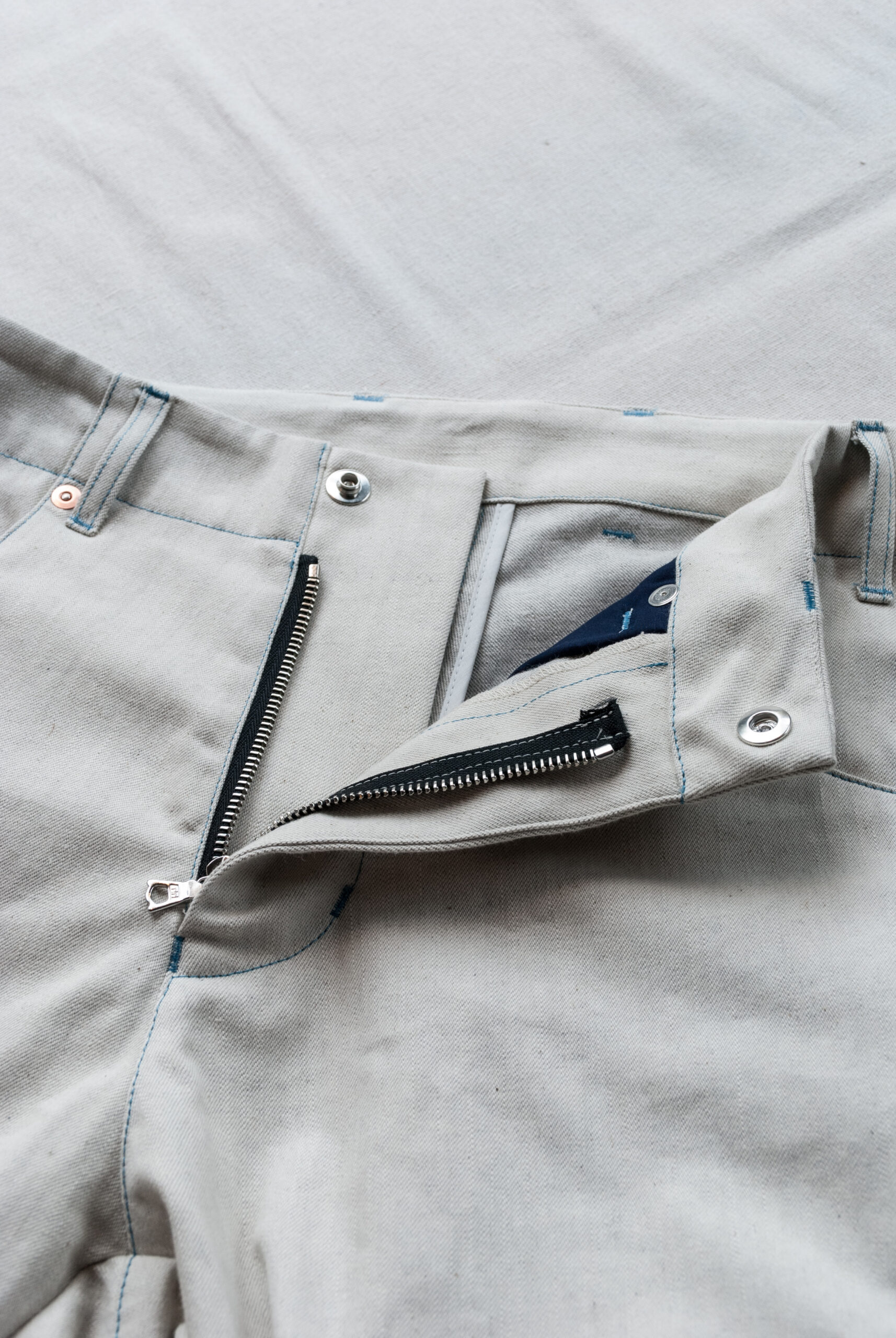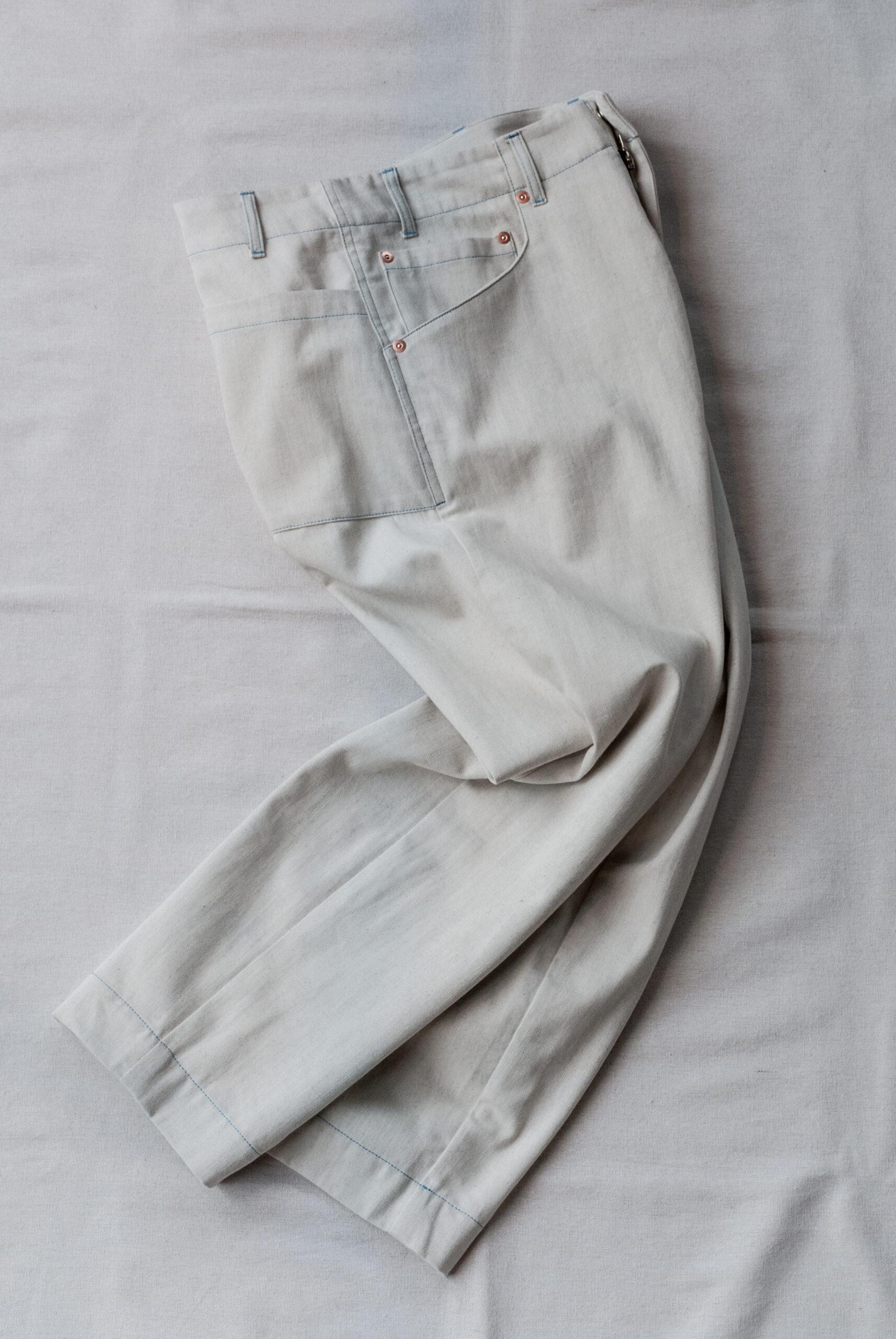 インディゴとスノーホワイトの生地は、10オンス位のデニムで、経糸に色糸、緯糸にグレーの糸を使っているので少し大人なムード。