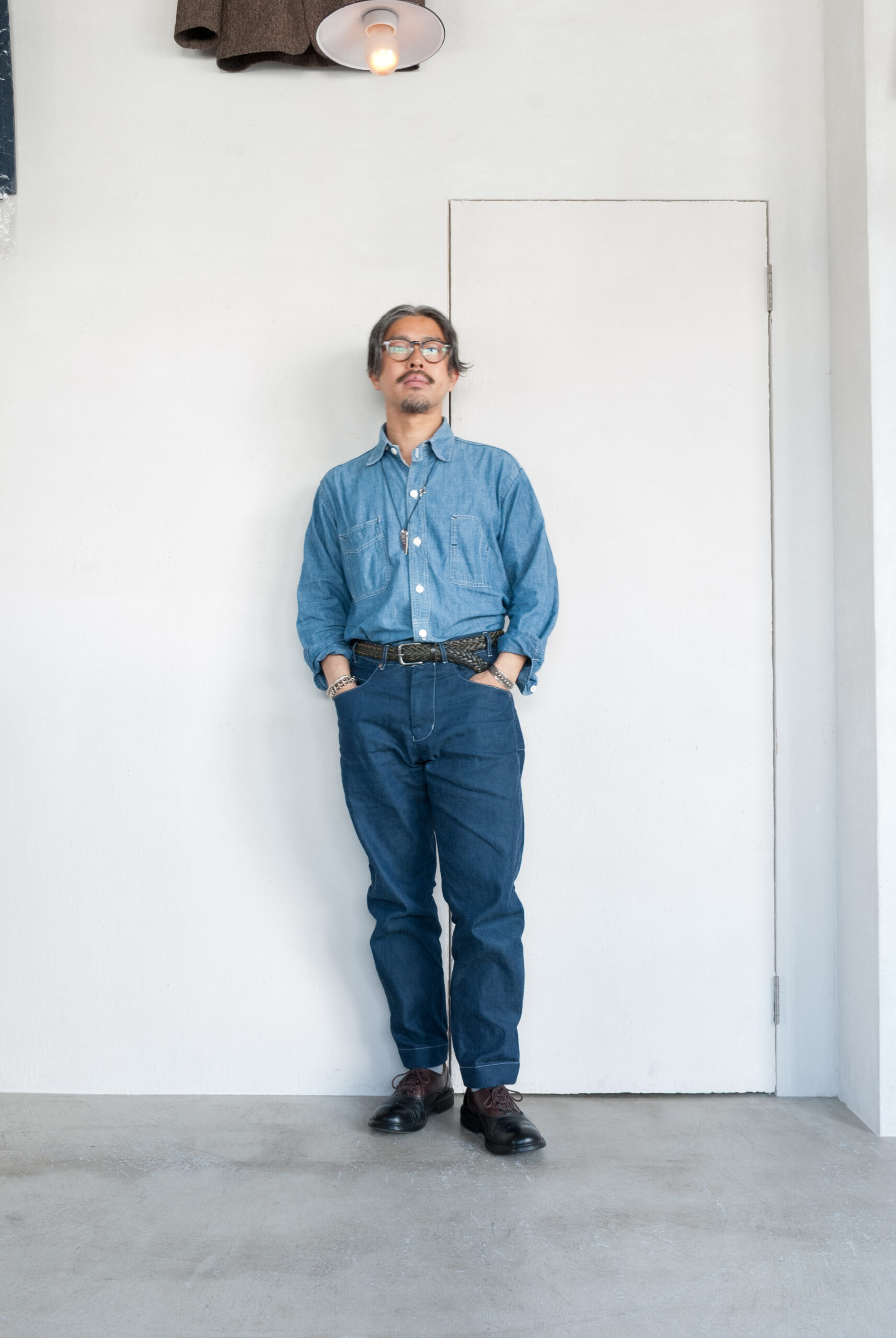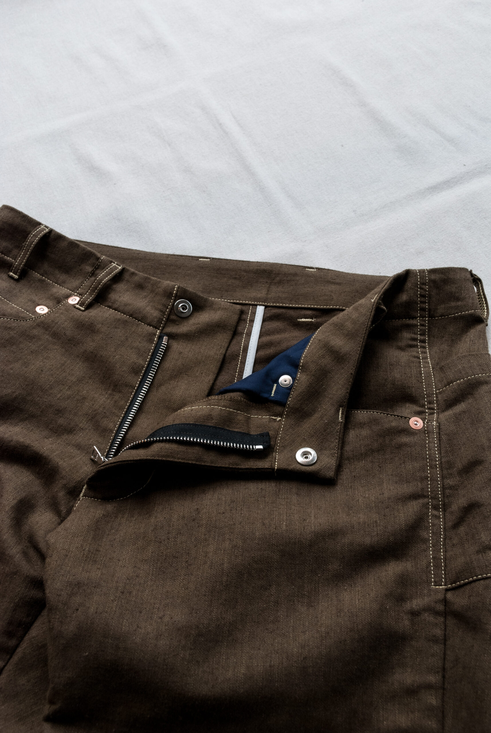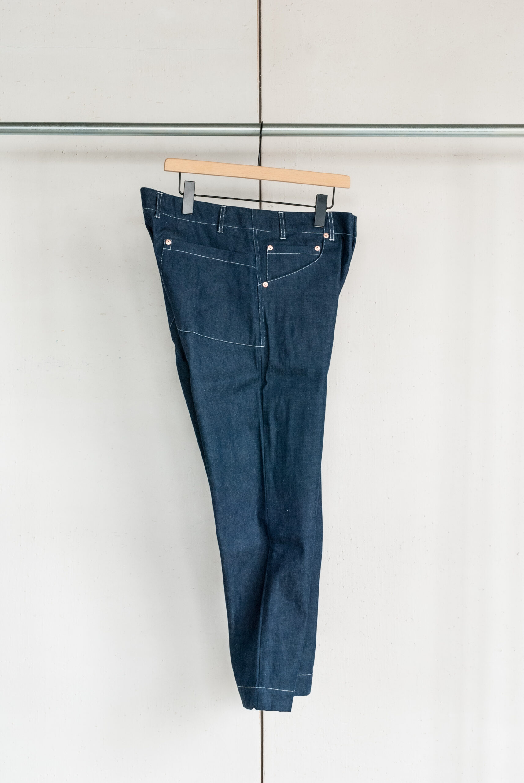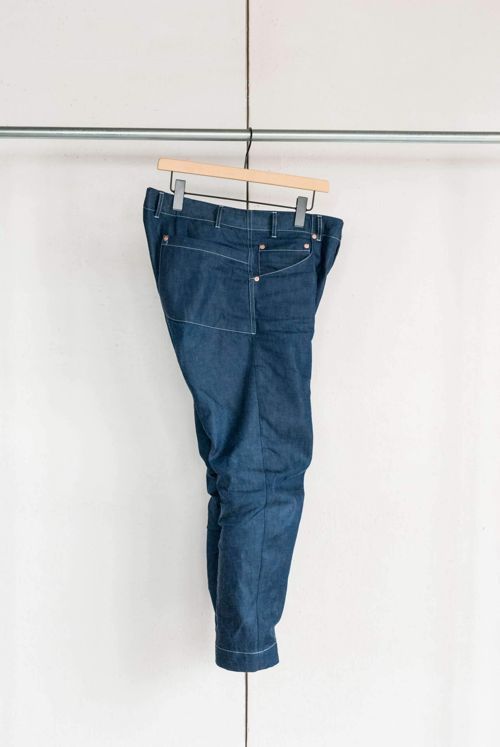 対照的にやや賑やかな腰回りは、浅めの股上に対して僕の大きめなお尻もすっぽり覆ってくれるヒップの包容力を横幅広めの大きなバックポケットが中和し、無機質なコッパーリベットに対してスイスのririジッパー、ウエストボタンはイタリアのCOBRAXといった丁寧なパーツ選びのバランス感が完璧です。