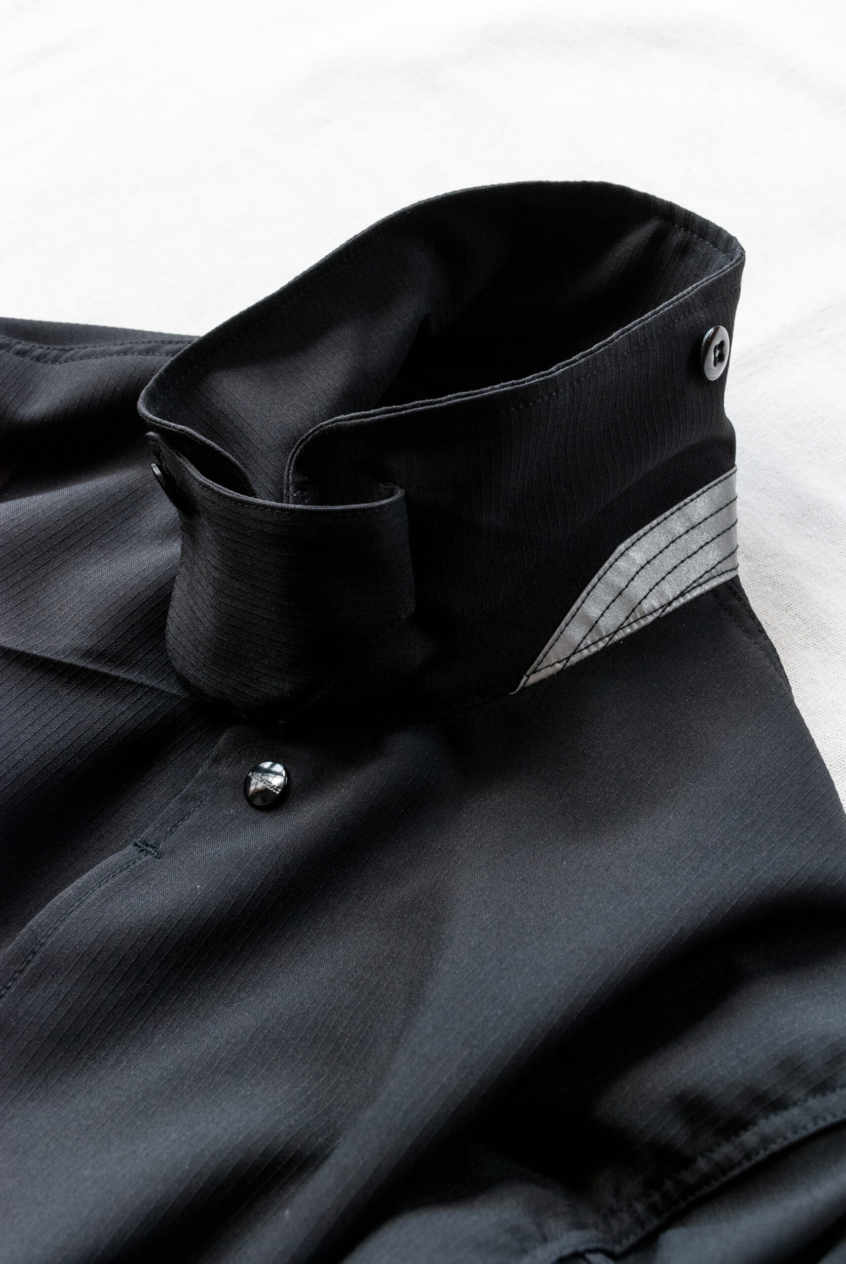 チンストラップ付きの襟は、立ててもねかせても良いのですが、台襟の裏に『京都レフライト社』の劣化しにくいリフレクターが付いているので、夜の散歩や、夜釣りの時は立てて着ると安全です。